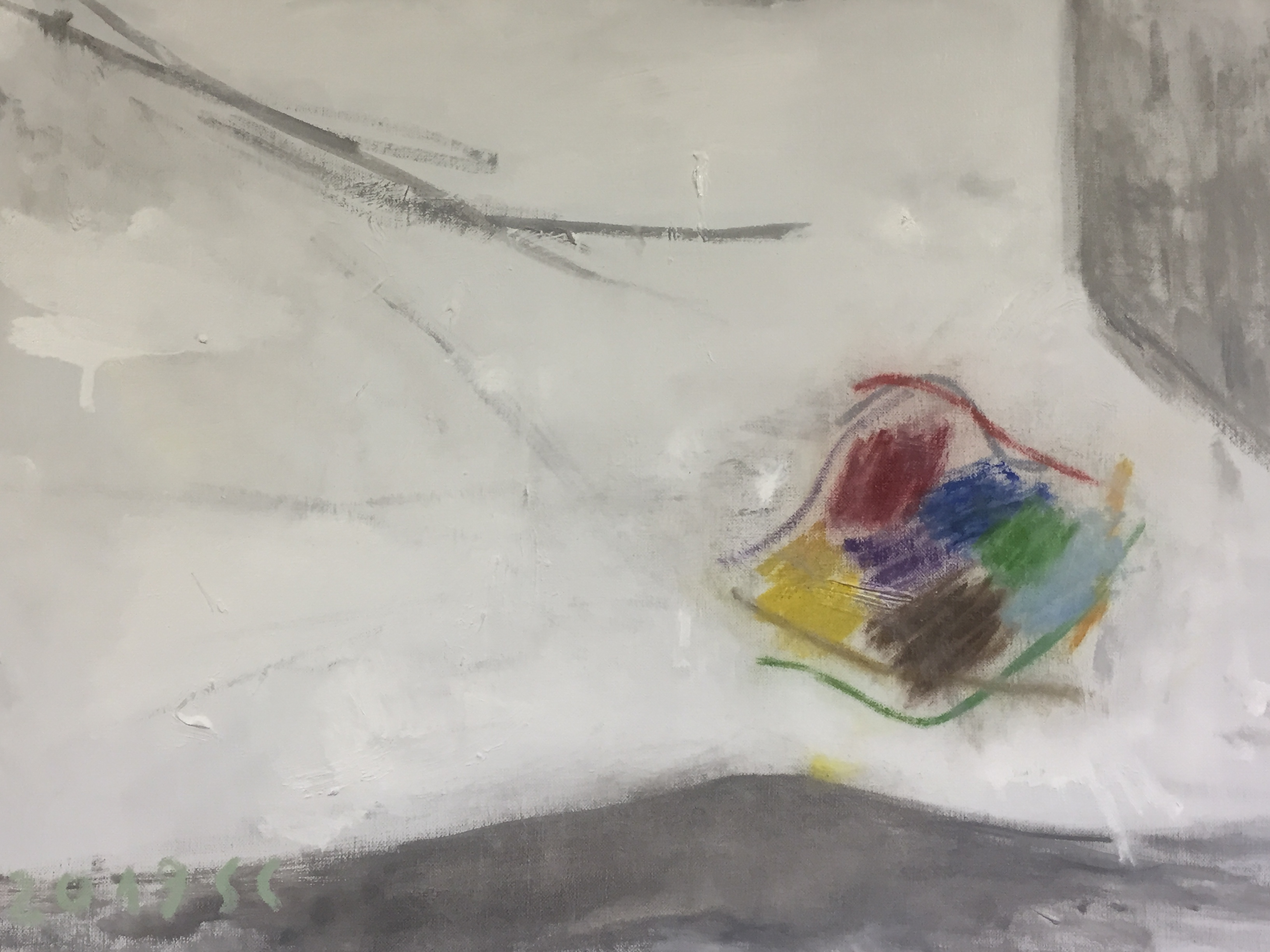 오히려 그의 회화에서 먼저 감지되는 것은 캔버스 표면의 붓질과 물감으로 이루어진 물질성이다. 붓을 든 작가의 제스처에 따라 표현되는 고유의 호흡은 화폭 위로 형상을 떠 오르게 하고, 또 깊숙이 가라앉게 한다. 샌정의 전작(前作)에서 이 형상들은 이국적인 여인상이나 들판 위의 백마처럼 몽환적인 모습을 지니고 있었다면, 이 형상은 점차 반추상에서 기하학적 추상으로, 그리고 이번 전시에서는 몇 가닥의 선으로까지 응축된다. 형상의 기화(氣化)라고도 할 수 있는 이 과정에서 작가의 회화-밖-경험은 회화-안-형태로 나타나기까지 무수한 정보의 생략과 함축, 감성의 증폭과 절제가 포개어지고 가다듬어진다. 그 결과, ‘이것은 OO을 뜻한다.’라는 정의 대신 아무것도 확인되지 않는 무심한 바닥으로 작품을 이끈다.