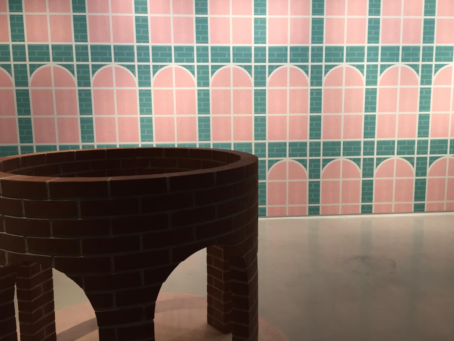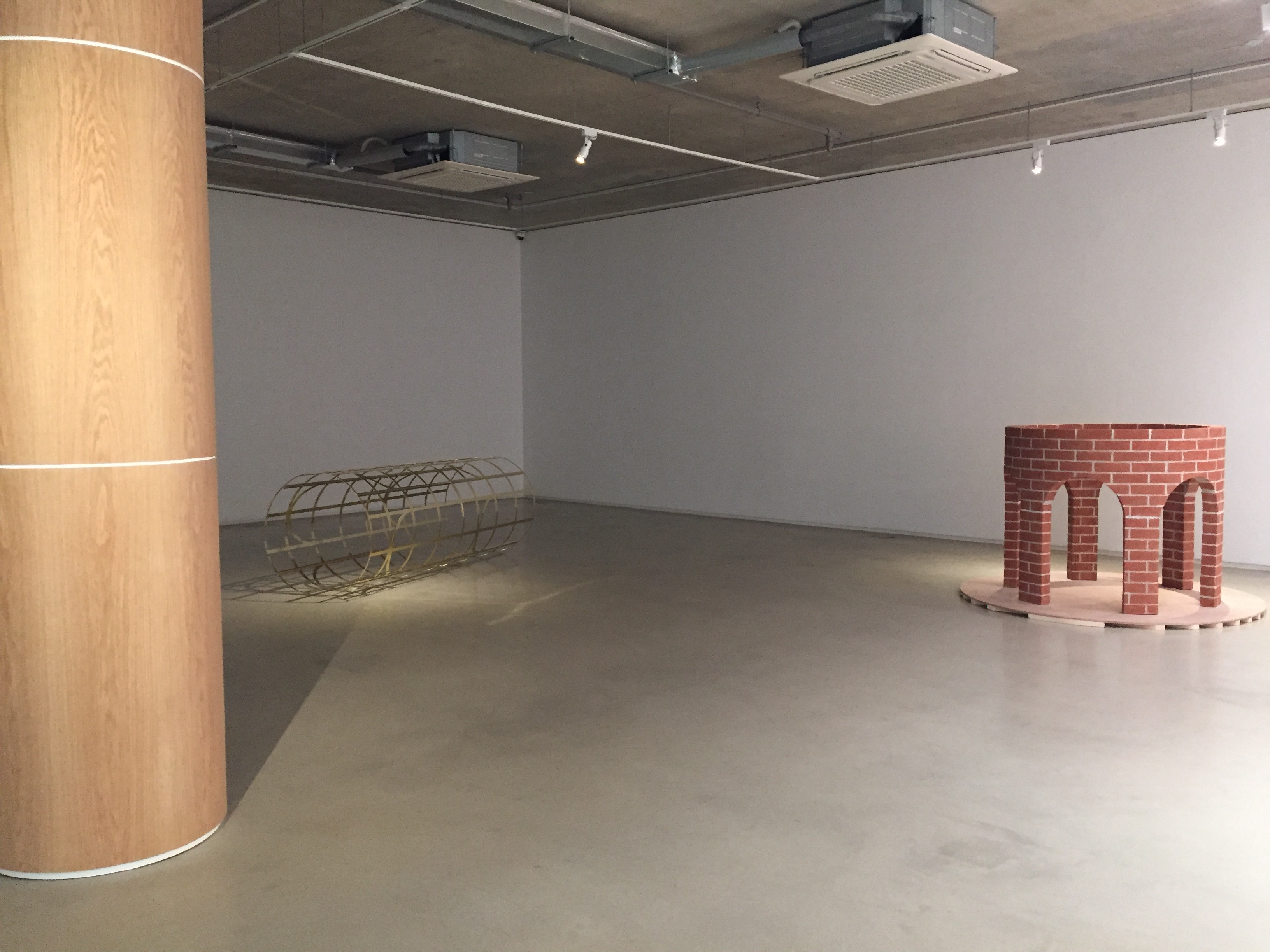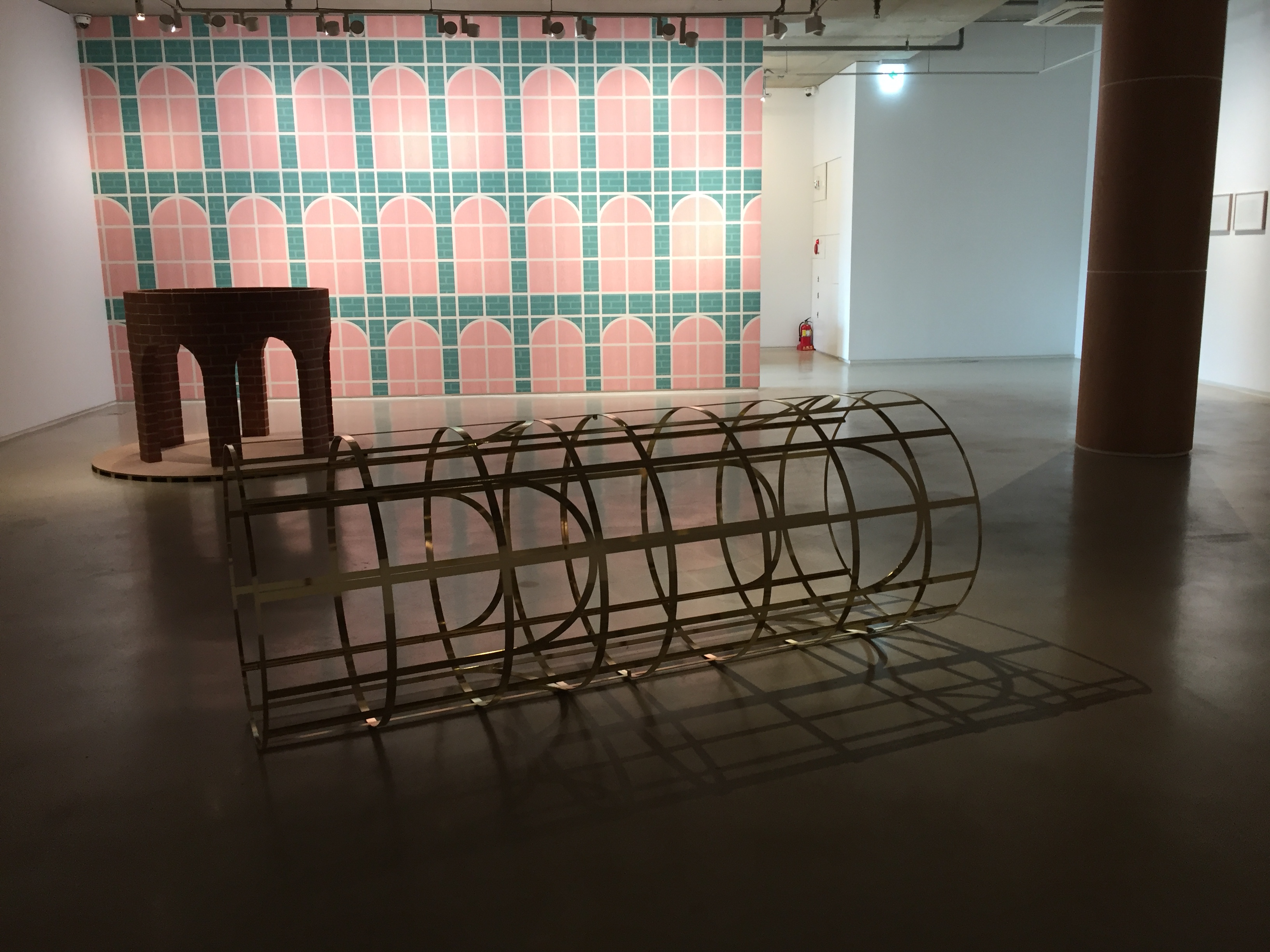 나무, 벽돌, 금속으로 만들어진 작품들은 재료가 달라 공통점이 없어 보이는데요. 재료는 다르지만 크기에 대한 공통점이 있습니다. 벽지의 아치형 창문의 높이는 갤러리 내부 기둥을 세 개로 나눈 높이, 벽돌 기둥, 금속 기둥의 높이와 같습니다. 이렇게 서로 다른 듯 하지만 연결되어 있습니다.