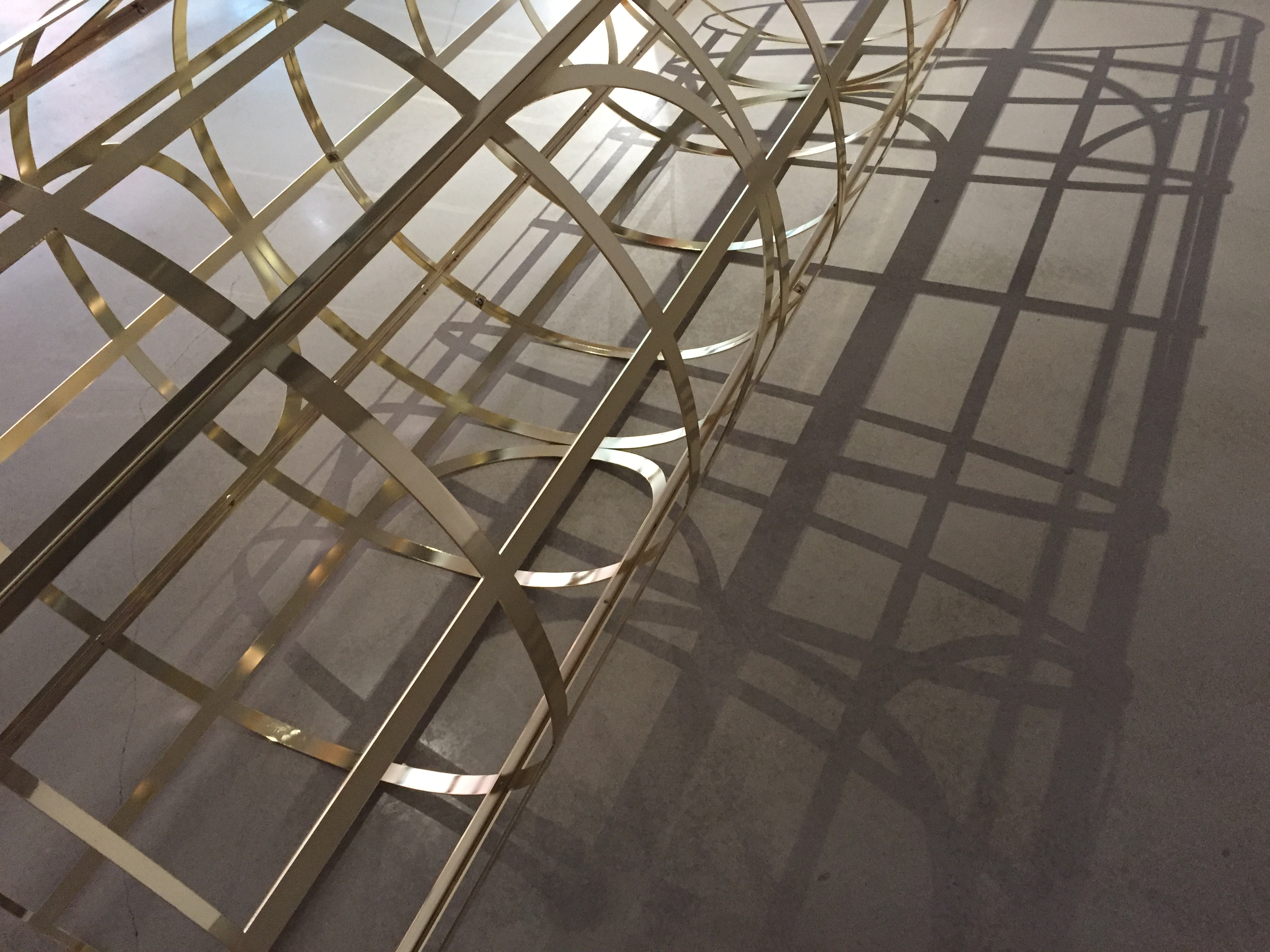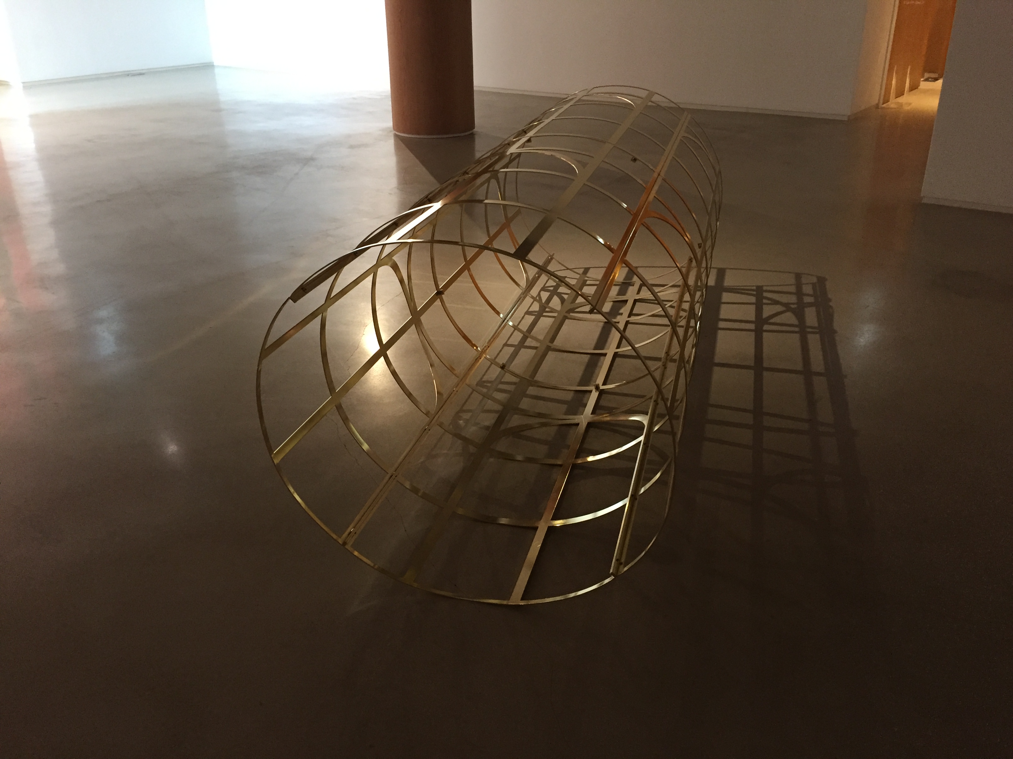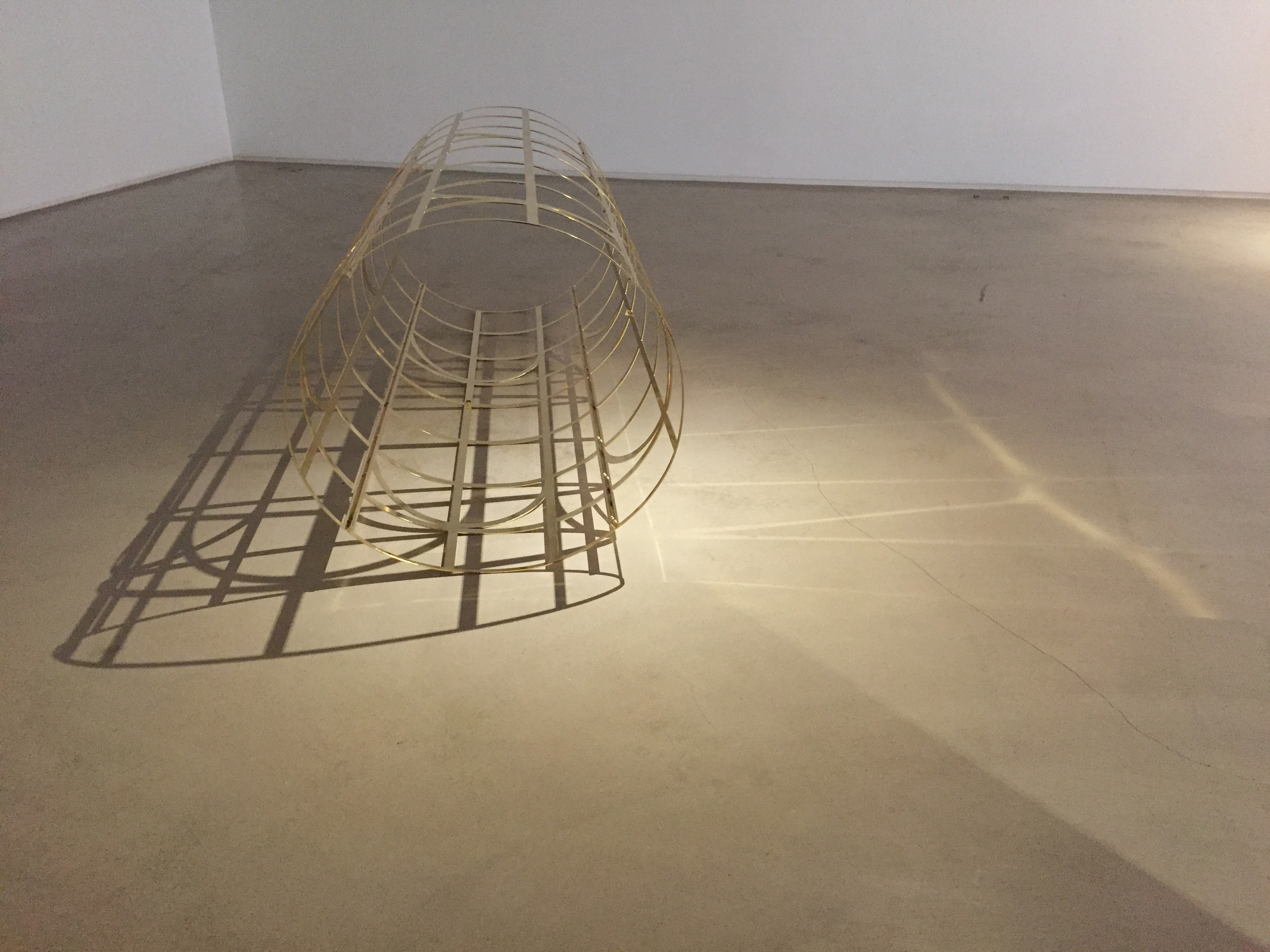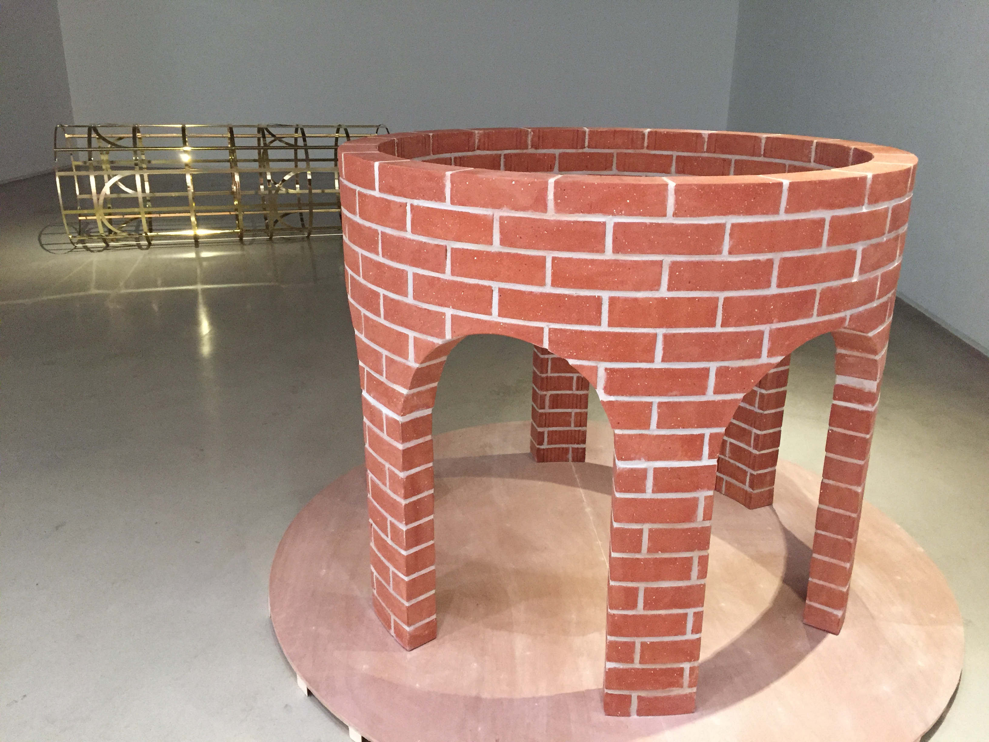 나무, 벽돌, 금속으로 만들어진 작품들은 재료가 달라 공통점이 없어 보이는데요. 재료는 다르지만 크기에 대한 공통점이 있습니다. 벽지의 아치형 창문의 높이는 갤러리 내부 기둥을 세 개로 나눈 높이, 벽돌 기둥, 금속 기둥의 높이와 같습니다. 이렇게 서로 다른 듯 하지만 연결되어 있습니다.