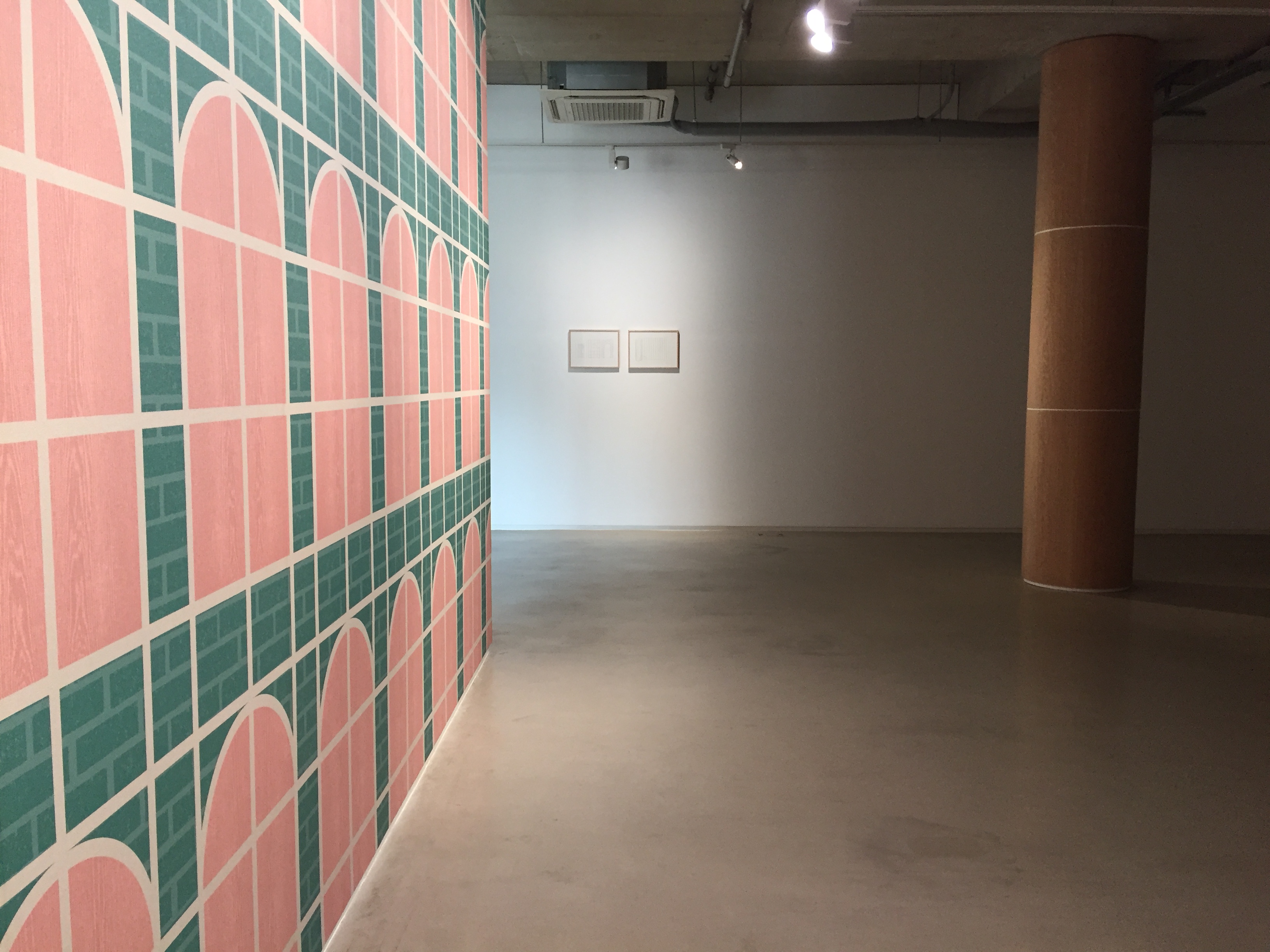 2017년 개인전 이후 피비갤러리에서 두 번째 개인전인 이번 전시에서 이종건은 벽과 기둥이라는 건축의 기본적 요소에 초점을 맞추고 그가 지속적으로 관심을 가져왔던 ‘가변하는 공간의 속성’을 보여주고자 한다. 작가는 갤러리 내에 위치한 기둥을 모티프로 벽, 아치, 원통형 기둥과 같은 건축적 요소로 치환한 작품을 ‘세 개의 기둥과 하나의 벽’ 이라는 제목으로 선보인다. 건축의 구조를 상기시키는 작품들은 갤러리 공간을 기존의 화이트 큐브가 아닌 이 공간의 특수한 건축적 특성을 유추하게 하는데 여기서 흥미로운 점은 전시작품이 실제 건축의 구조적 기능이나 재료와 일치하지 않는다는 것이다. 건축의 구성요소인 벽은 본래 내부와 외부를 단절하거나 연결시키고 기둥은 하중을 지탱하는 동시에 공간에 중심을 만들기도 하는데, 전시장에 설치된 벽은 세 개의 기둥을 펼치고 반복적으로 배치한 벽지로 되어 있으며, 벽지 표면에는 건물 외벽(벽돌), 창살(금속), 문짝(나무)의 재료적 속성과 질감이 시각적으로 남아 있으나 그 반복적인 배치로 인해 단순한 기하학적 구성으로 보이기도 한다. 또한 갤러리의 실제 구조인 기둥은 무늬목으로 덮여있어 특유의 견고함이 사라졌고 아치형태의 벽돌 기둥은 구조적 기능과 상관없이 문이 잘려져 있으며 옆으로 누워있는 원통형의 기둥은 금속의 뼈대만 남아있어 기둥의 본래적 기능과는 거리가 있다. 반면에 각각의 작품은 형태적으로 유사한 지점이 있는데, 벽지에 있는 아치형의 창문의 높이는 갤러리 내부 기둥을 세 개로 나눈 높이와 동일하고, 벽돌기둥, 금속기둥의 높이와도 같다. 벽지에 있는 아치형의 창문은 이번 전시 작품들의 기본 단위가 되며, 개별 작품의 높이뿐 만 아니라 창문 네 개의 폭과 금속기둥의 둘레가 동일하고 벽돌기둥은 같은 높이의 기둥 여섯 개로 구성되는 등 서로 미묘하게 연결되어 있다. 또한 각각의 작품은 건축의 구조를 세우는데 중요한 재료인 나무와 벽돌, 금속으로 제작되었지만 벽지와 무늬목 같이 얇고 일정한 패턴으로 존재해 건축과 그 표면의 모호한 지점에 위치하는 등 각 요소가 서로 연결되면서도 분리되어 있다.
