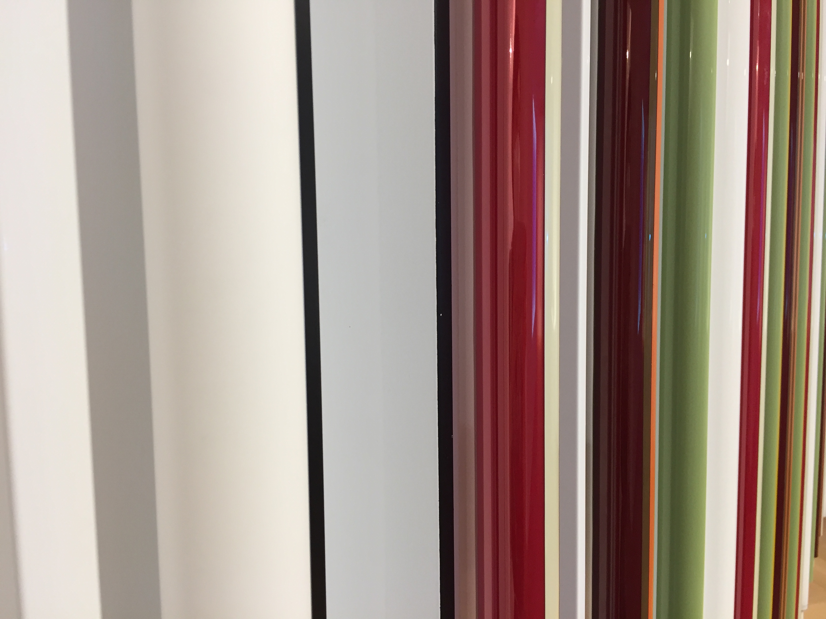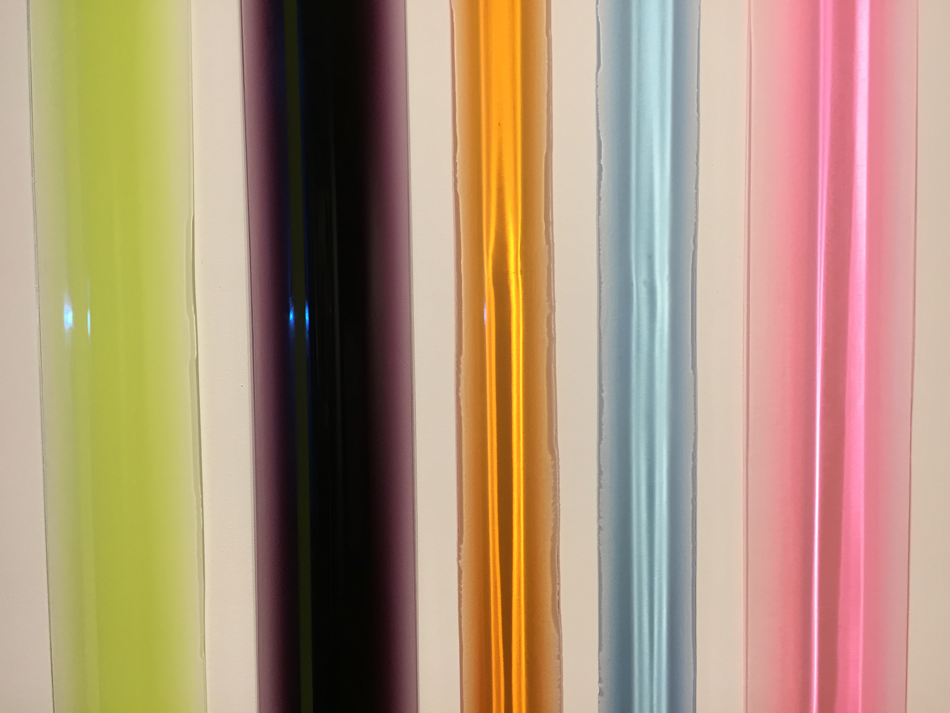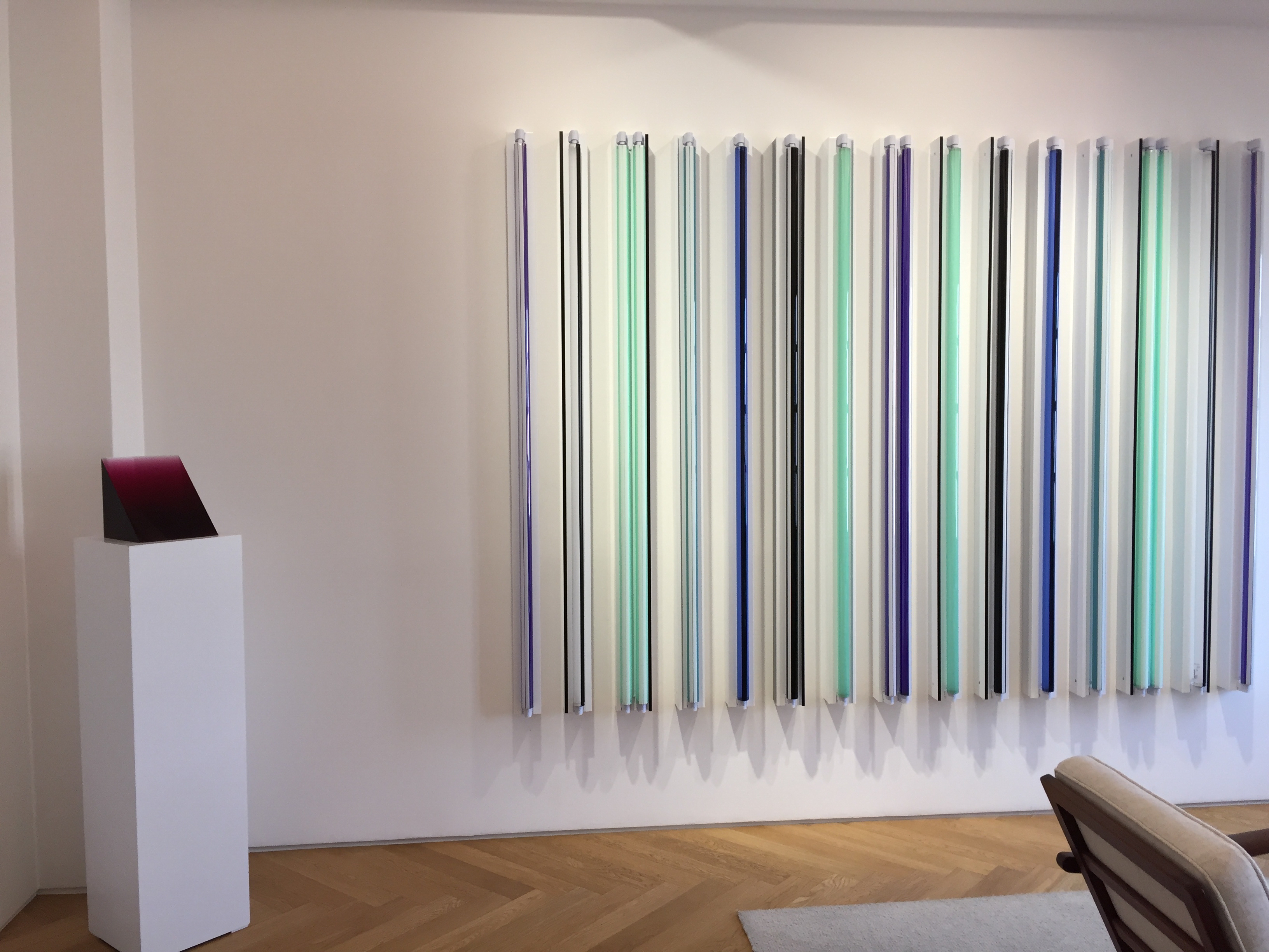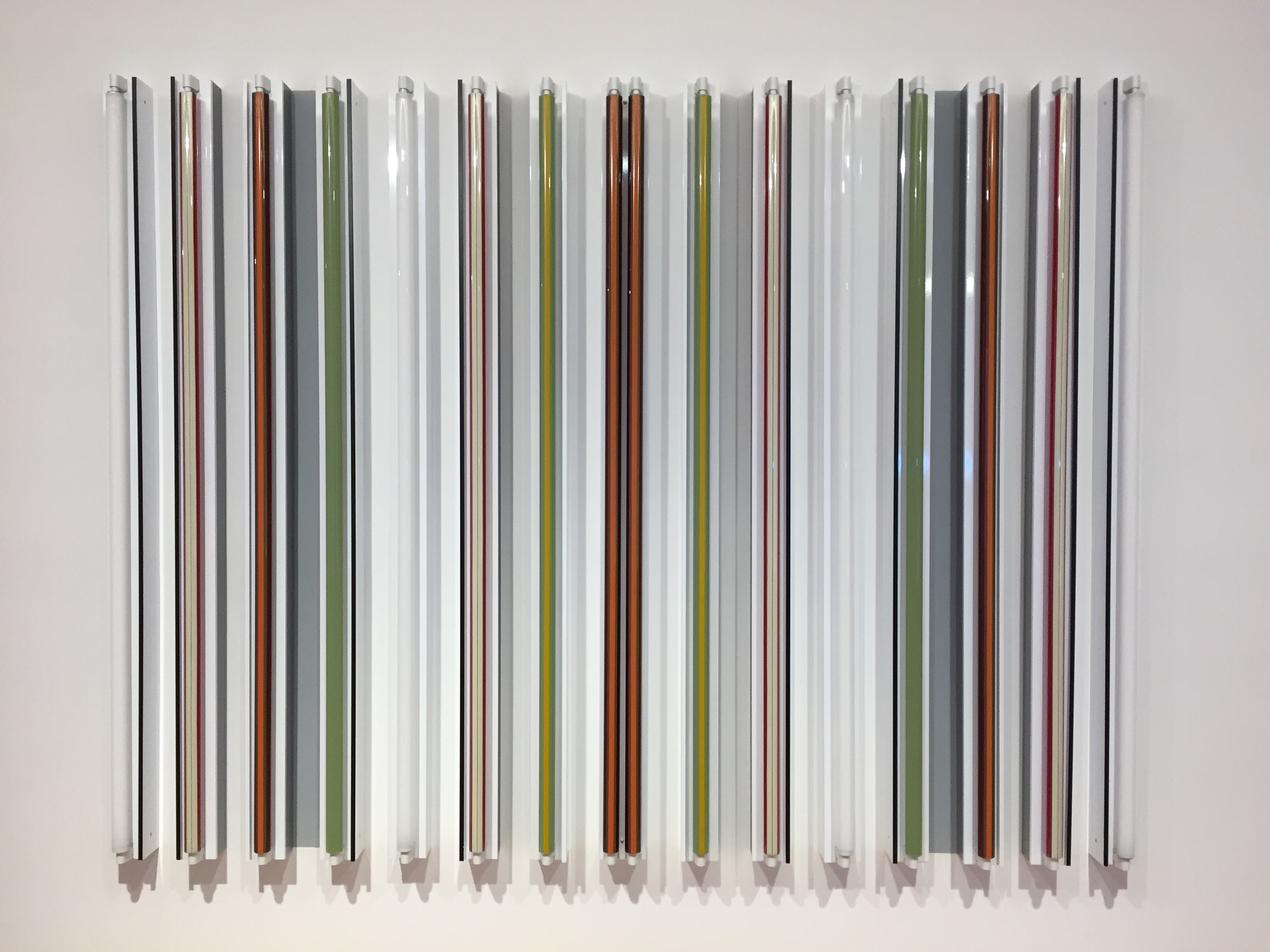로버트 어윈은 불이 꺼진 형광등을 세로로 나란히 배치한 'Belmont Shore'를 선보입니다. 긴 전구는 갖가지 투명한 색 젤로 덮여 있고, 일부는 연한 회색빛입니다.