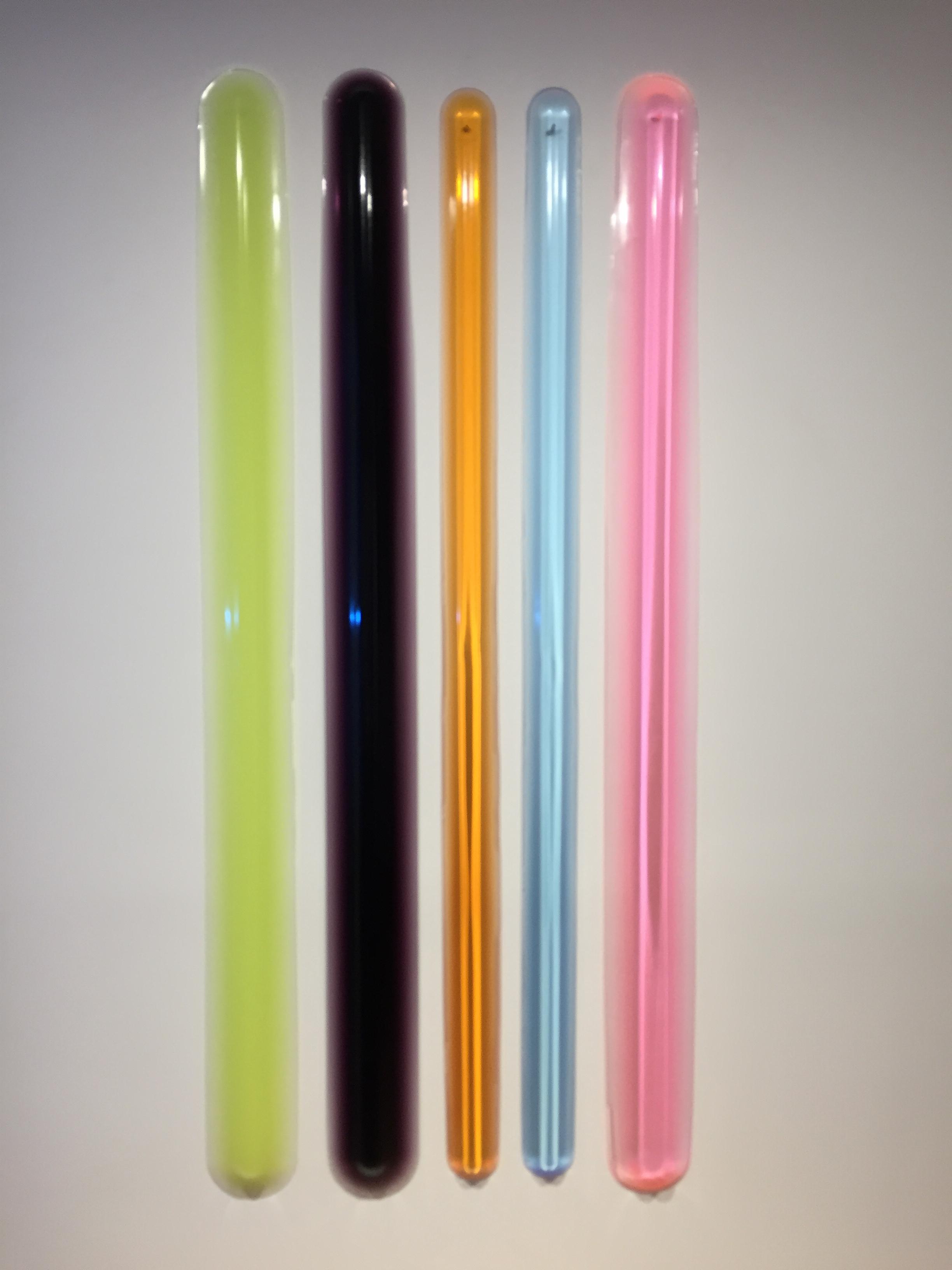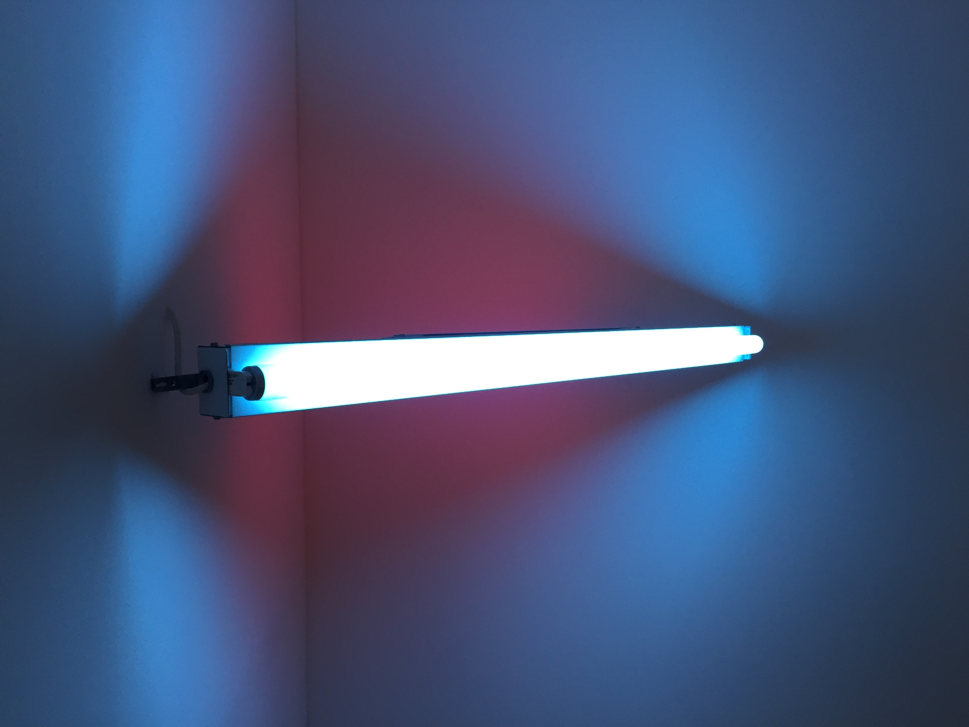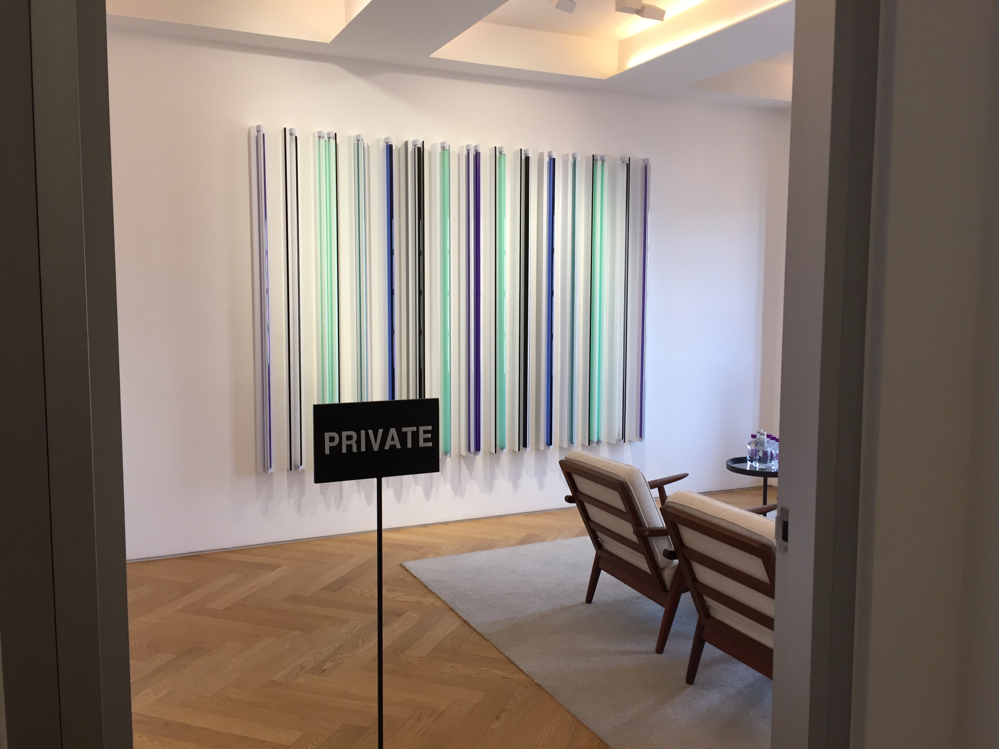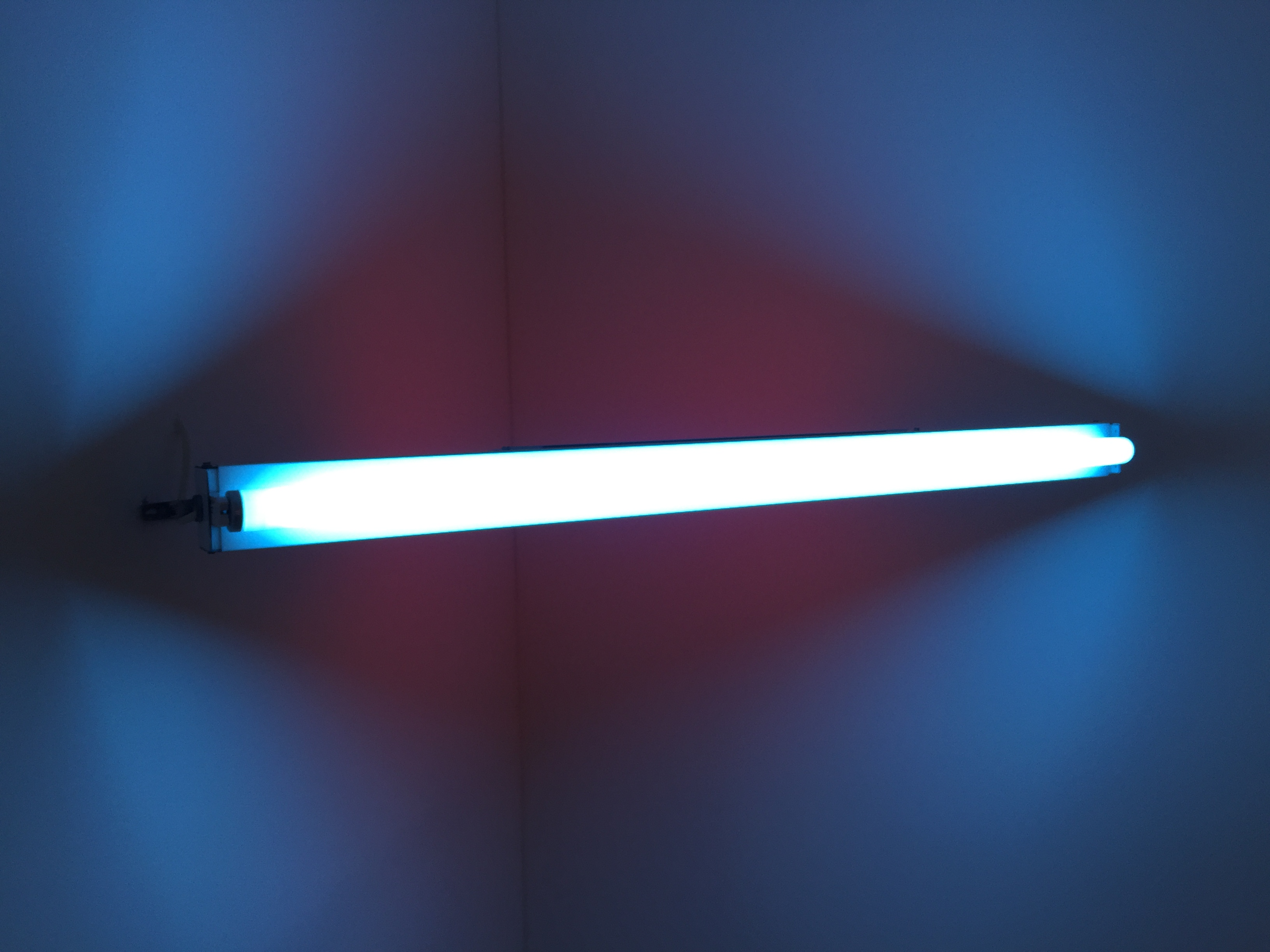 로버트 어윈은 불이 꺼진 형광등을 세로로 나란히 배치한 'Belmont Shore'를 선보입니다. 긴 전구는 갖가지 투명한 색 젤로 덮여 있고, 일부는 연한 회색빛입니다.