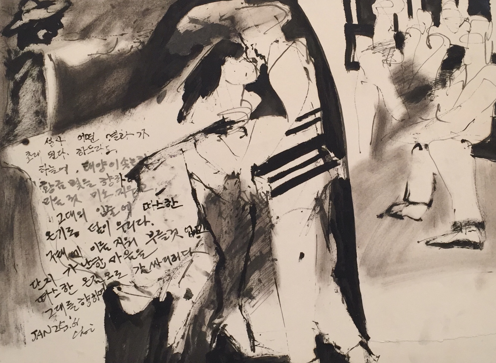 두 번째 전시공간에는 추상적인 선과 문구로 구성된 잉크, 목탄, 콩테를 이용한 드로잉과 판화를 선보인다. 그 중 잉크 드로잉은 검은 선과 흰 배경이 동일하게 추상적인 의미를 지닌 또 다른 추상표현주의 작가 프란츠 클라인의 작업뿐 아니라 둘의 역할이 글자와 바탕(여백)으로 보다 명확하게 구분되어 다양한 의미들로 가득 찬 동양의 서예를 동시에 연상시킨다.