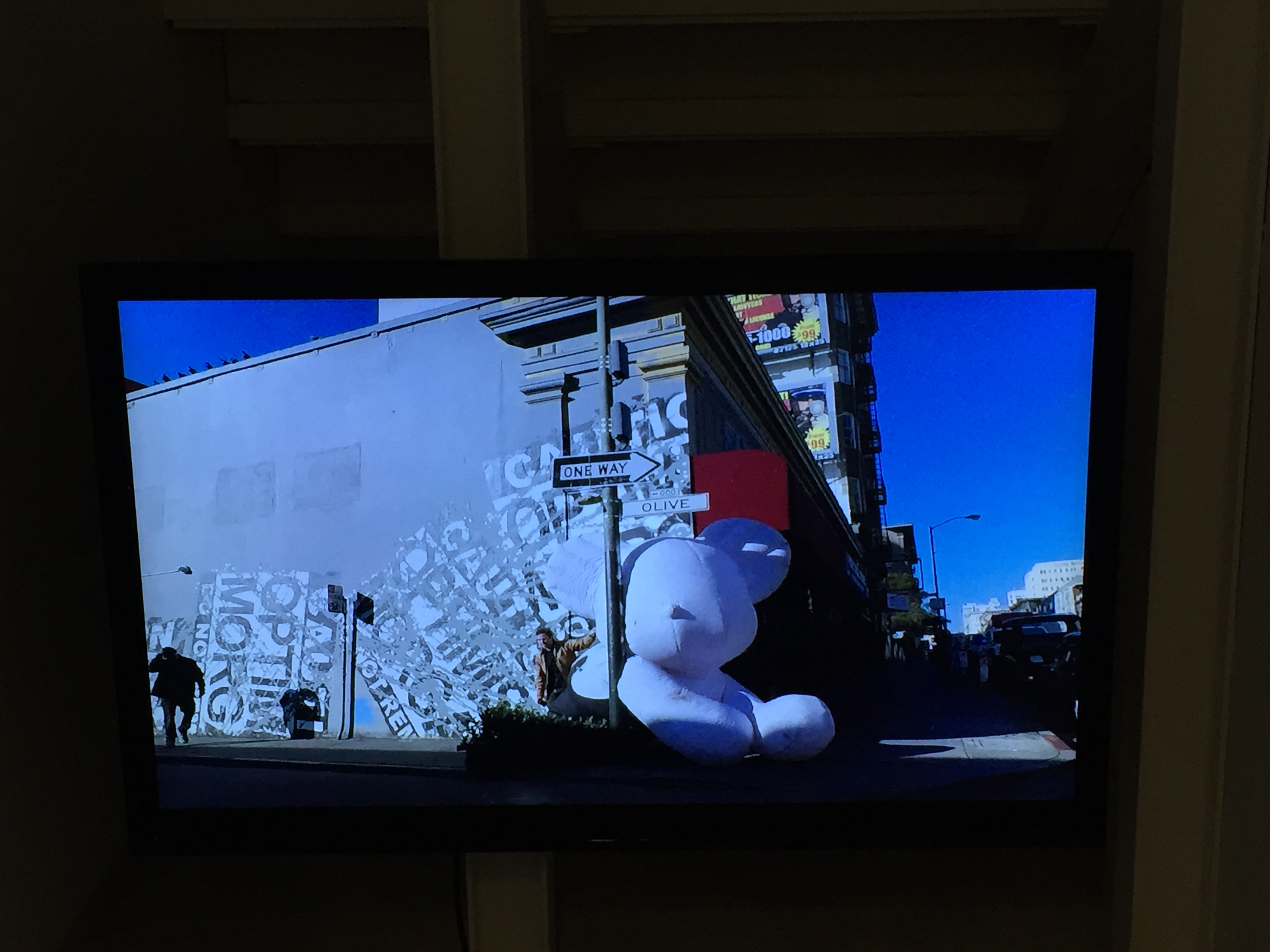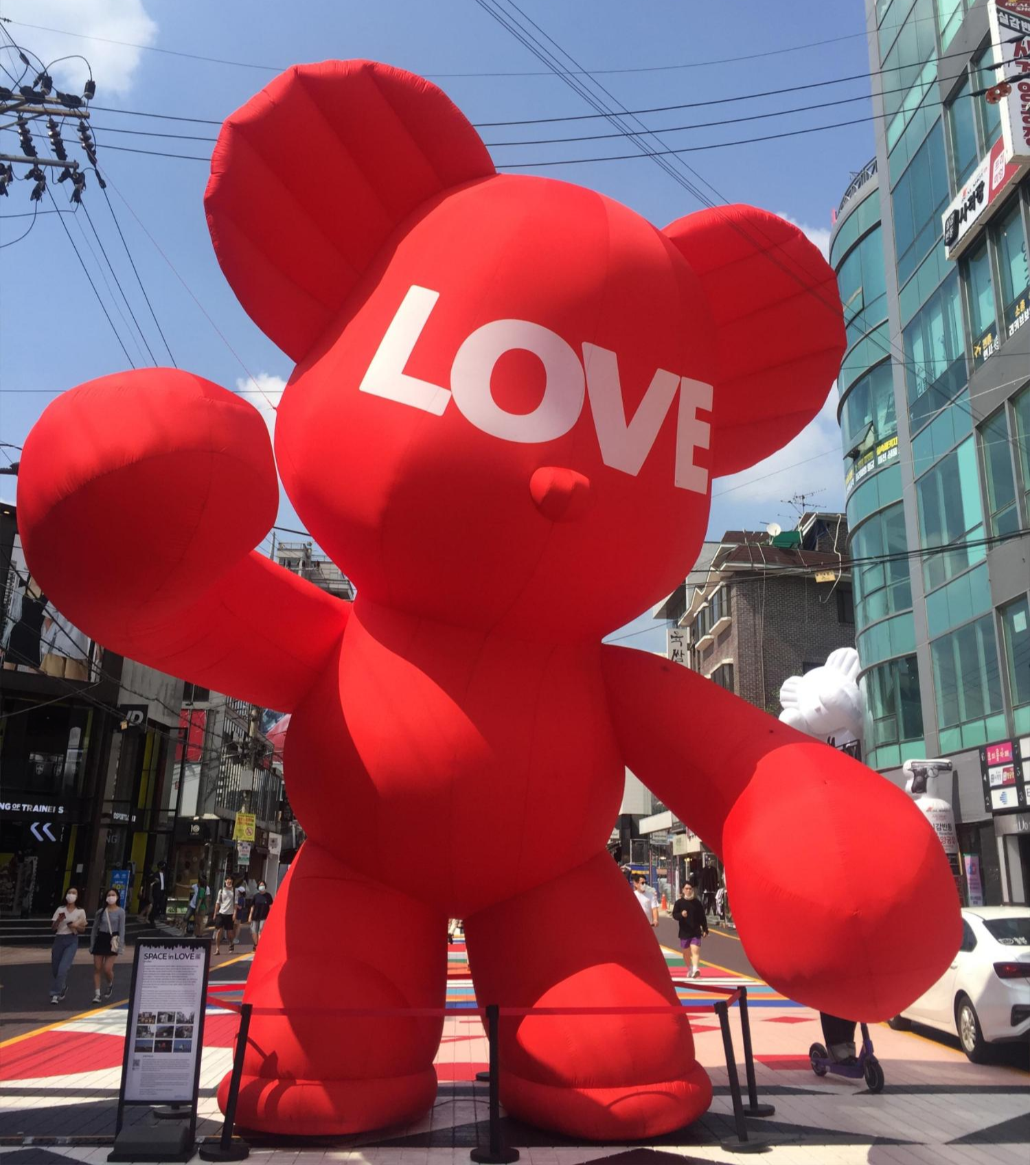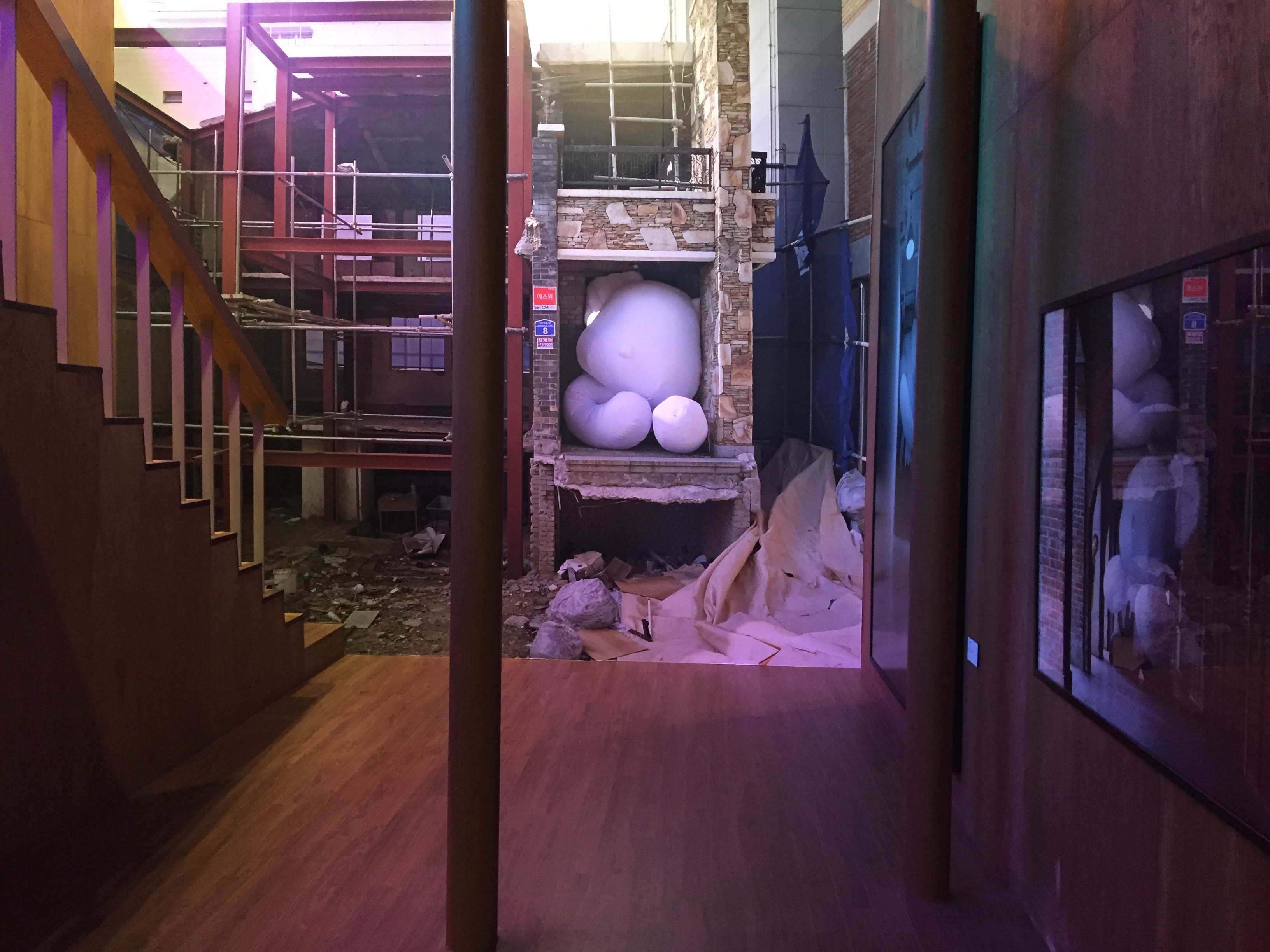 홍대의 공사 중인 건물 사이에 끼여 있는 풍선 곰 사진입니다.
