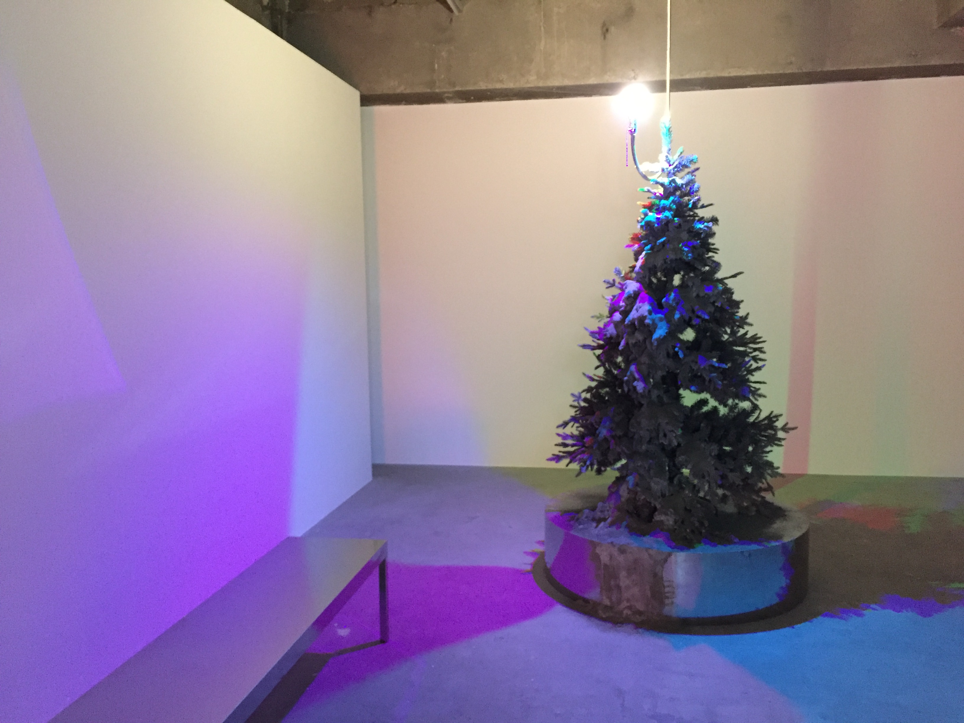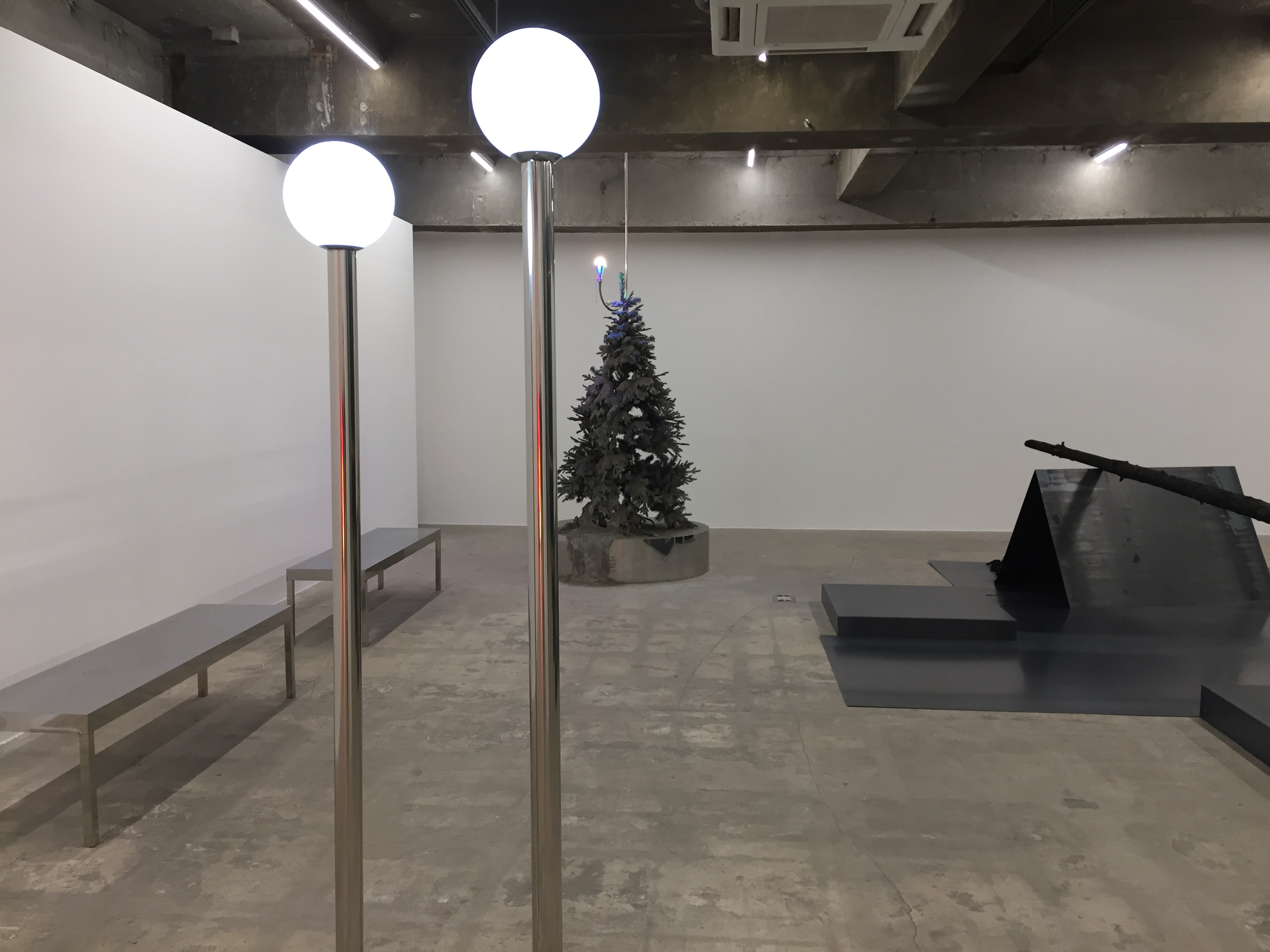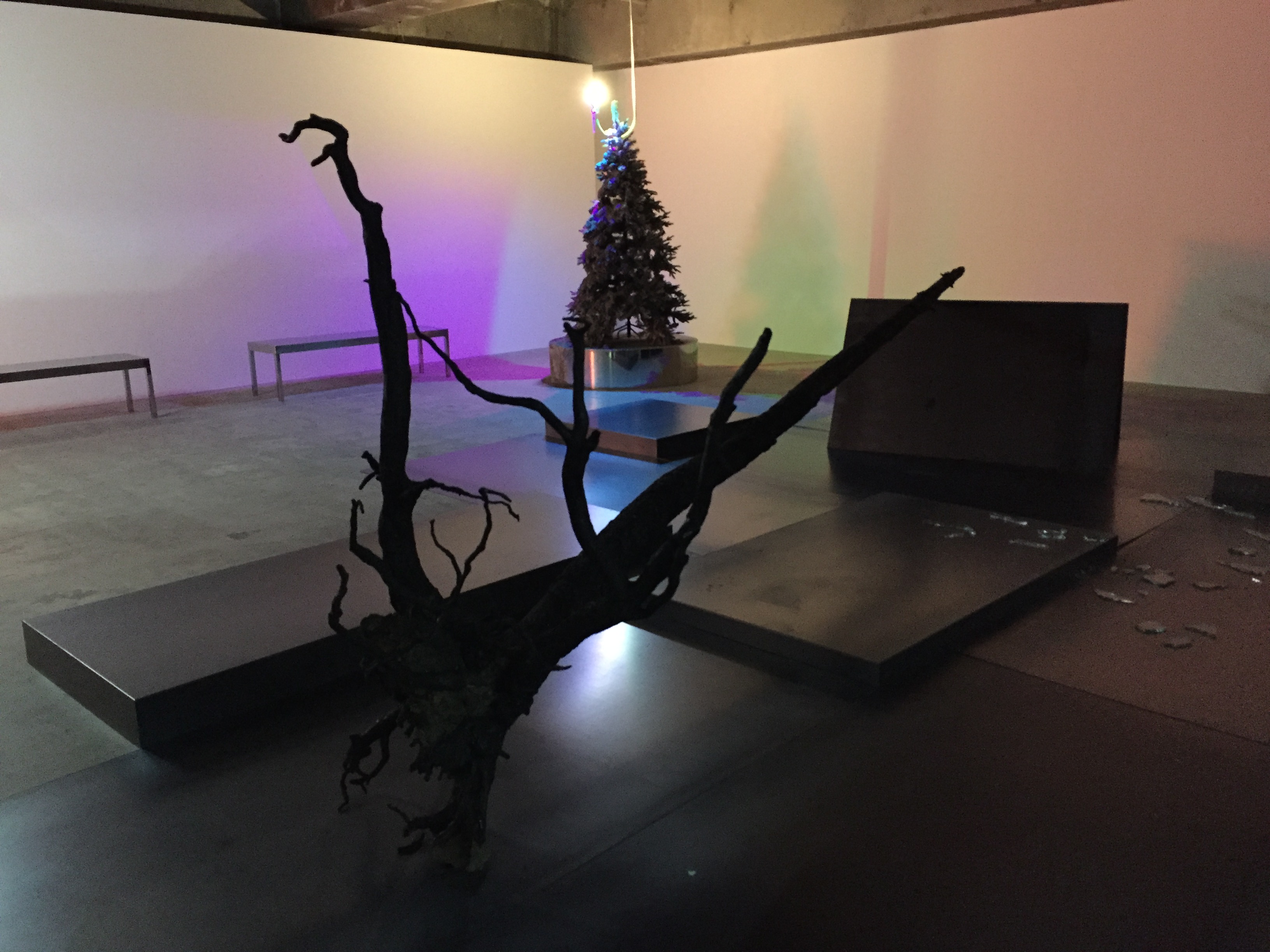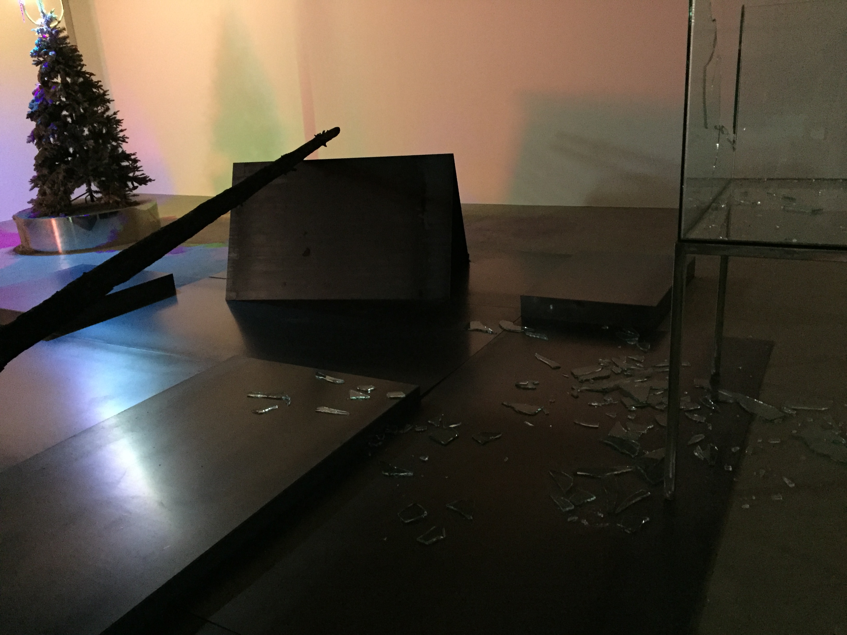 갤러리 곳곳에 나무, 가로등, 유리파편 등 오브제들이 설치되어 있습니다. 그리고 나레이션이 나오면서 갤러리의 불이 켜졌다 꺼졌다 하는데요. 빛이 있고 없음에 따라 분위기가 바뀌면서 다른 공간에 온 듯한 느낌이 들었어요.