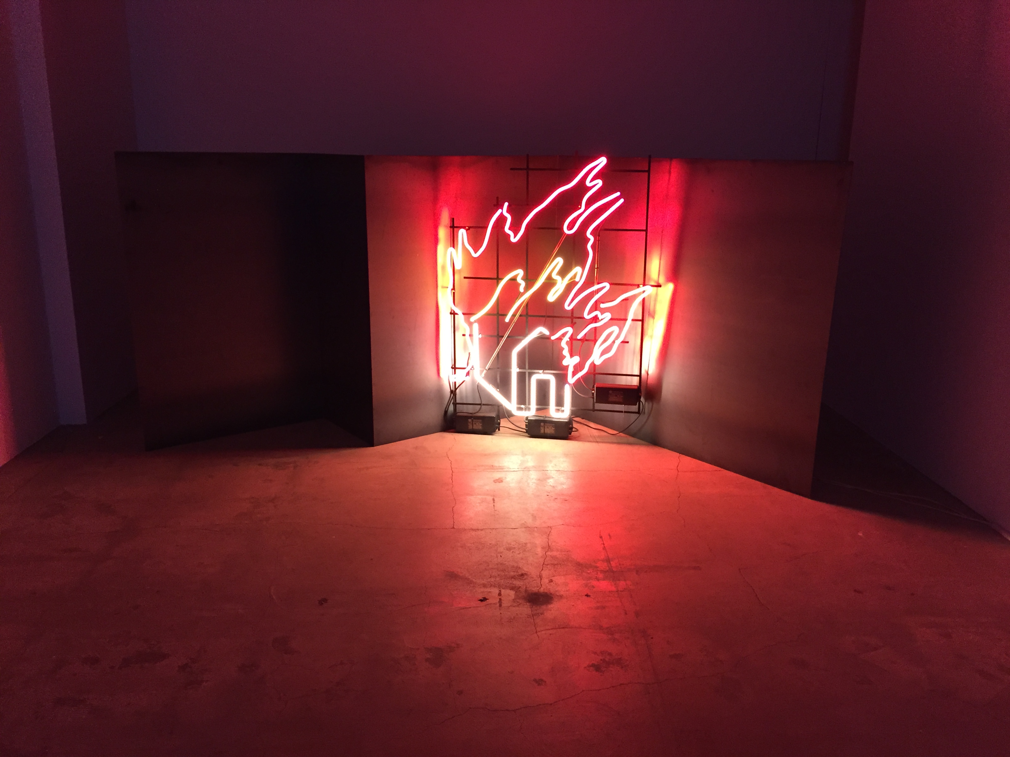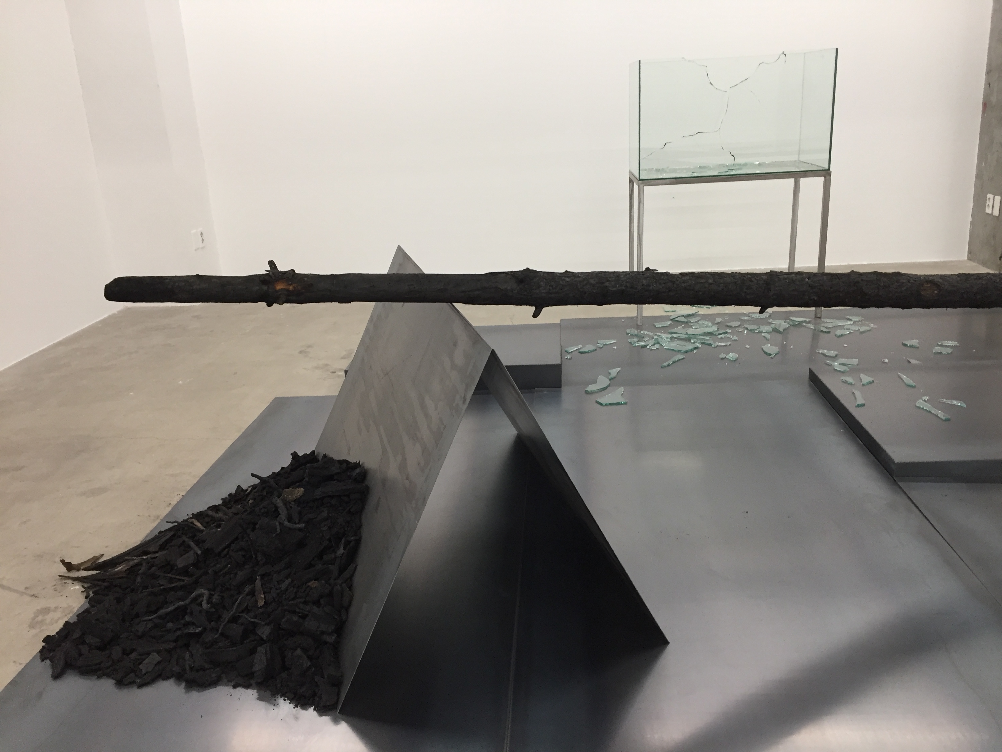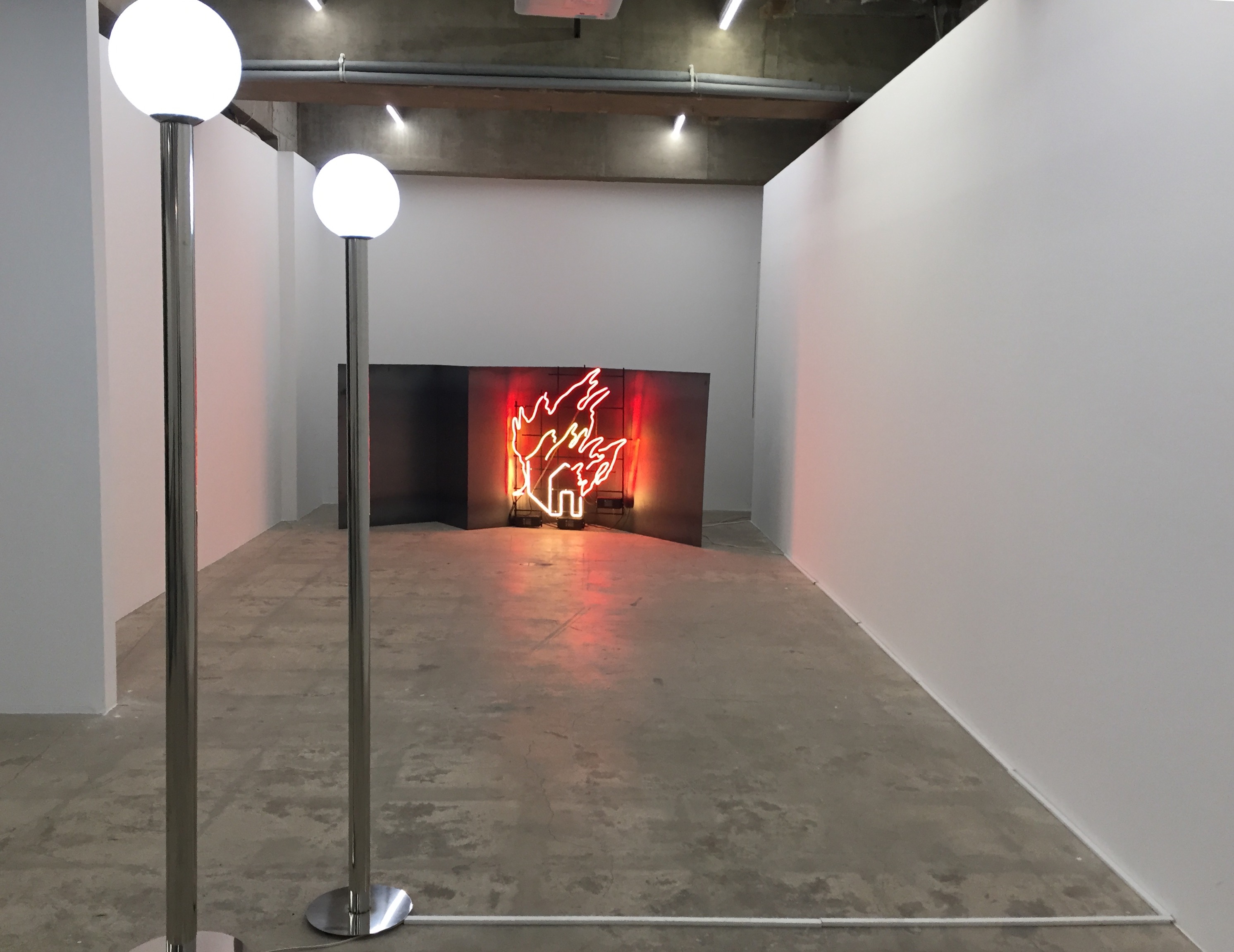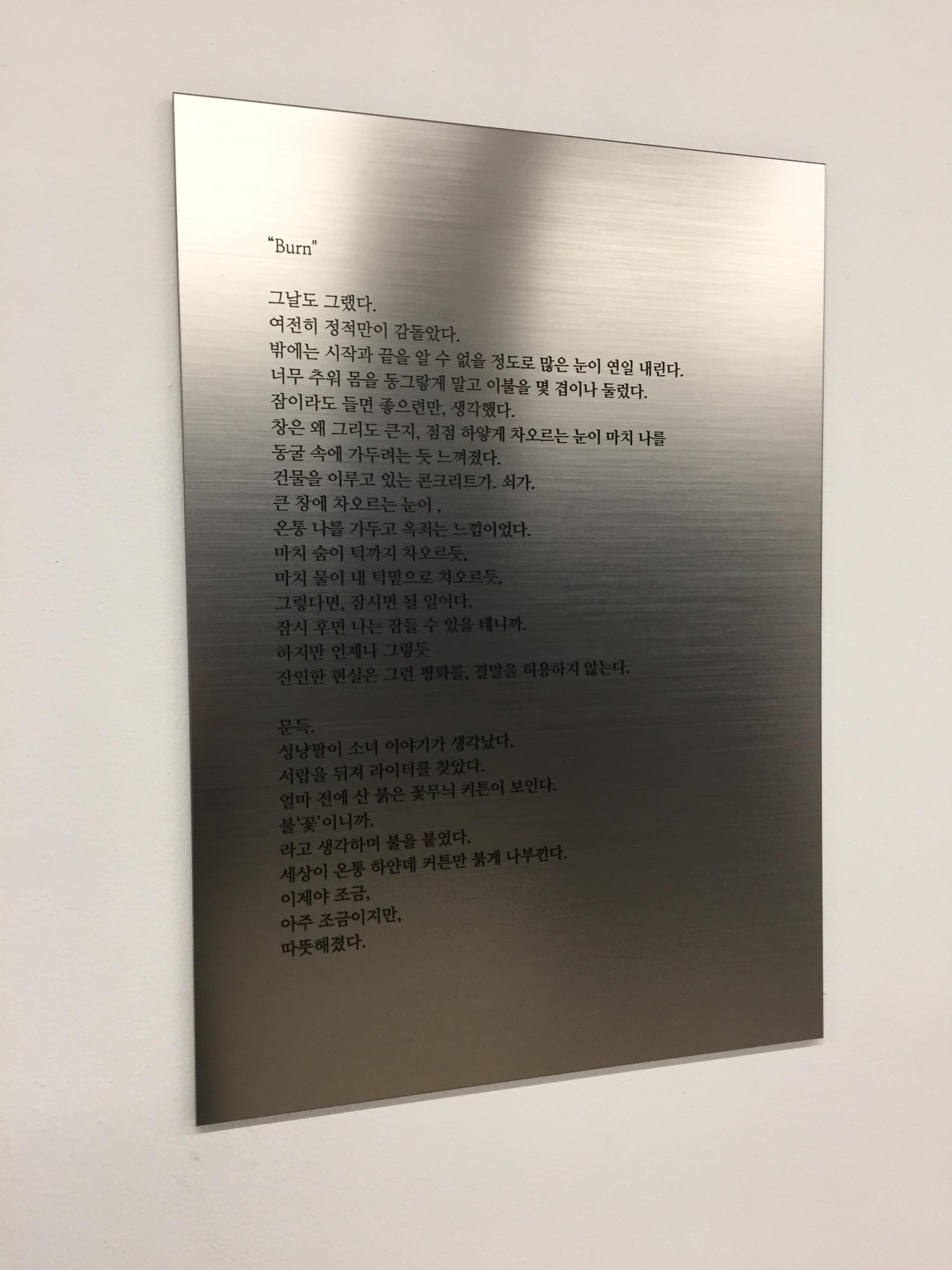 김시하 개인전, 《BURN》은 사회 속에서 개인이 경험한 심리적 불안과 분열의 간극을 스토리와 함께 시각화 한 것이다. 다 타버린 집과 나무로 제시되는 잿빛 폐허의 공간은 진보 역사를 상실한 동시대인들이 겪고 있는 무력감과 함께 그들의 내재된 분노가 반영된 “무대-시적 풍경(작가는 본인의 작업을 이렇게 부른다)”으로 전환된다. 무채색의 풍경, 나지막이 읊조리는 목소리, 중앙에 다 타고 남은 잿빛 철판과 새까맣게 타버린 나무 그루터기, 깨져버린 유리와 잿더미를 뒤집어쓴 크리스마스트리, 그리고 가로등이 있는 텅 빈 공원 풍경은 회색의 어둡고 쓸쓸하면서도 대립과 혼재의 묘한 긴장감을 불러일으킨다. 특히, 인간의 온기로 전시장을 가득 채우는 작가의 목소리, 전시의 한 부분이 되는 시 낭송과 텍스트는 폭력적 상황에서 개개인이 느끼는 감정을 몽환적으로 제시한 것으로 그 누구의 목소리일 수도 있다. 그리고는 갑자기 조명이 켜진다. 마치 브레히트의 연극처럼 감정적 몰입 및 현실도피를 허용하지 않으려는 것처럼. 그리고 관람자들은 지금, 여기를 인지하게 된다. 그리고 다시 조명이 꺼지고, 관람자들은 해체된 서사극 속으로 빨려 들어간다.