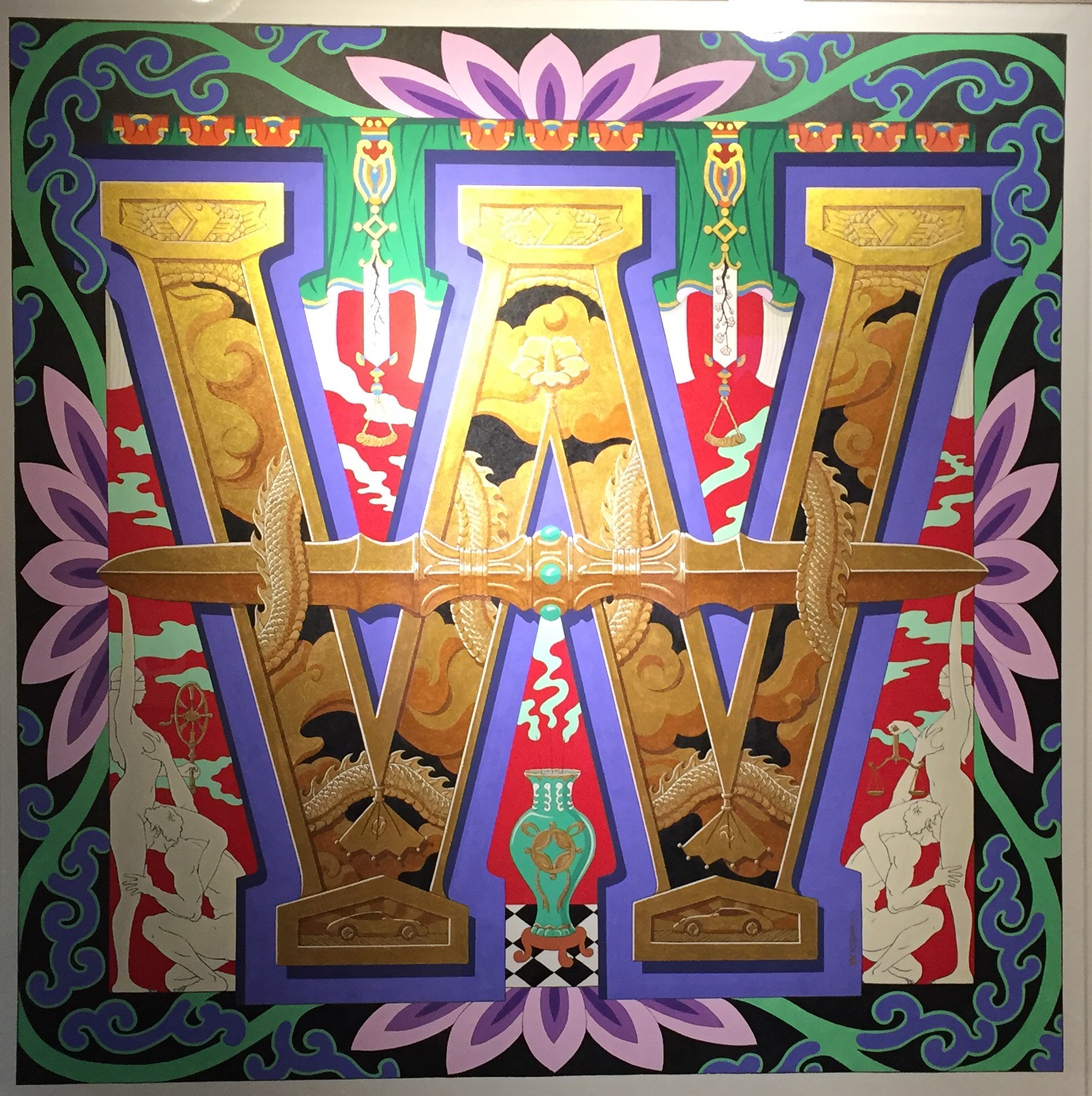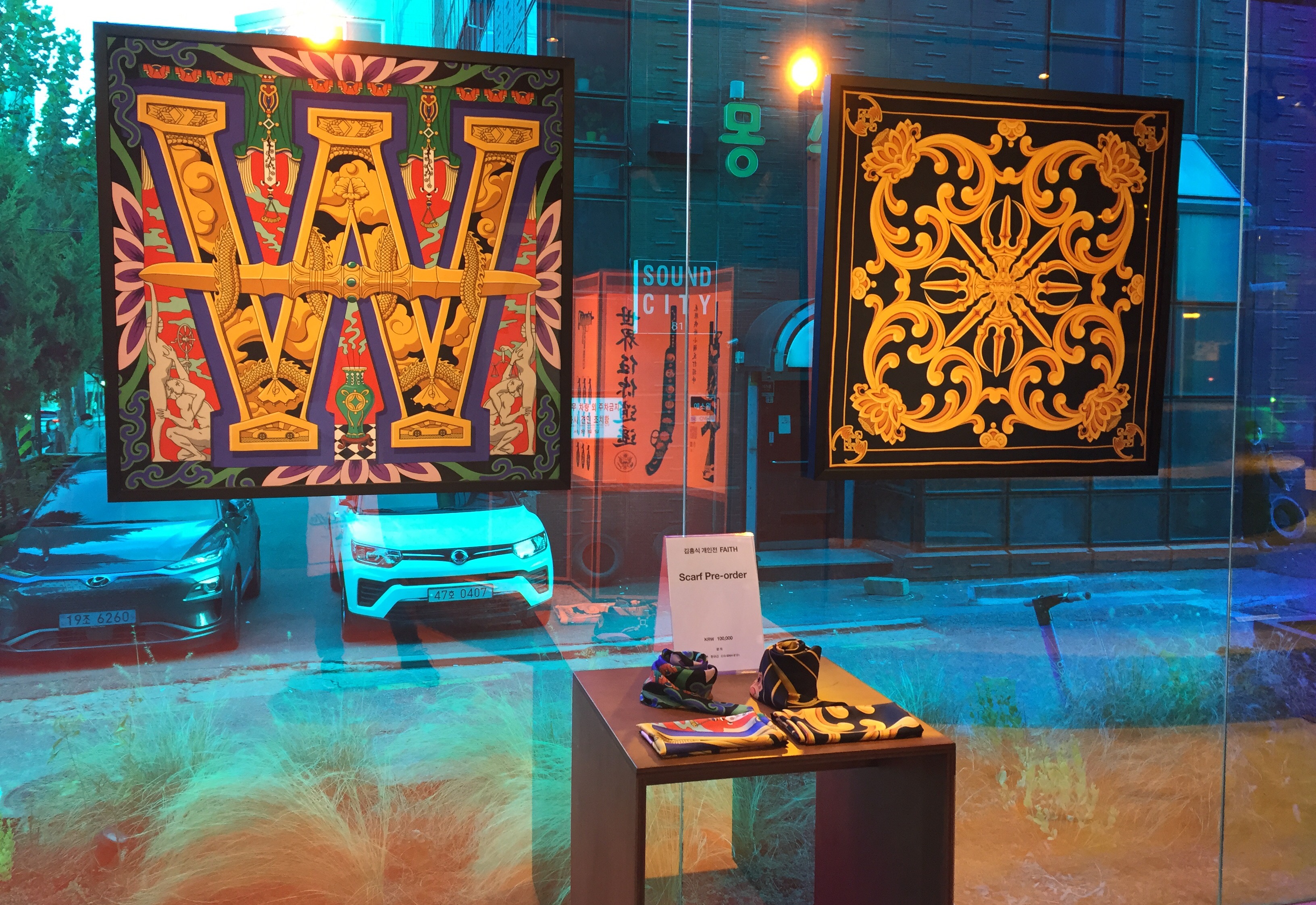 작가님의 작품을 프린팅 한 스카프를 판매하고 있었습니다. 화려한 황금색 패턴이 이국적이면서도 중간에 원색으로 단청에서 볼 수 있는 문양이 들어가 있어 인상적이었습니다.
