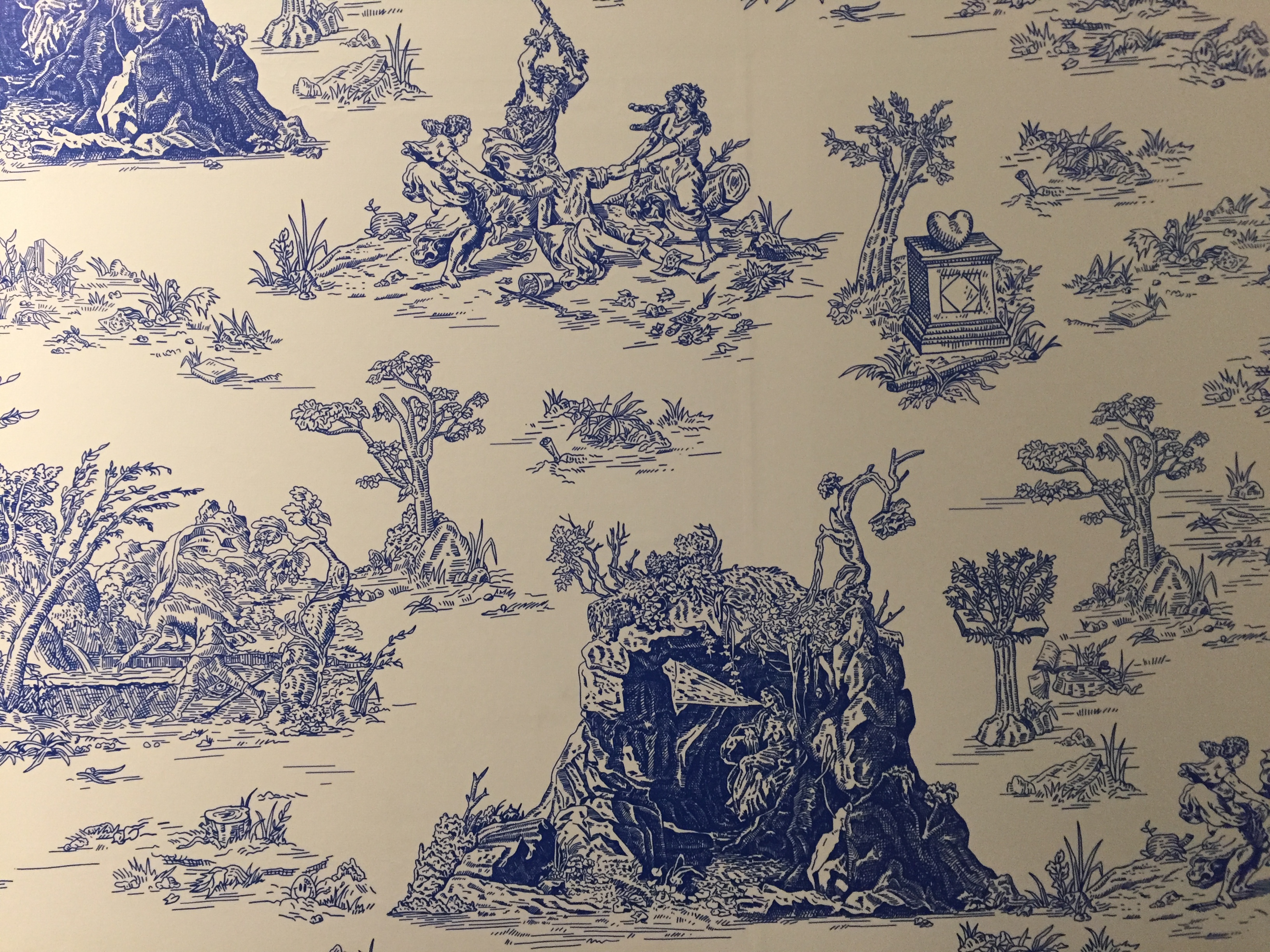 한편 <Where the Voice Is>에서 작품의 전면과 함께 눈여겨보아야 할 지점은 캔버스의 배경이 되는 뒤쪽 벽면이다. 우정수는 한 뮤직비디오에서 발견한 앤티크 한 벽지의 모티브를 차용하여 고전 판화를 연상시키는 동굴 속 인물의 이미지, 식물과 오브제 등을 가는 선으로 그렸다. 이후 이것을 반복적인 패턴으로 만든 뒤, 벽지로 프린트하여 회화의 배경 화면으로 삼았다. 작가가 아이패드로 그린 벽지의 패턴 이미지와, 캔버스의 신화적 모티브들은 서로 이야기를 만들고, 주고받으며 보는 사람의 눈을 화면 안과 밖으로 오가게 만든다.