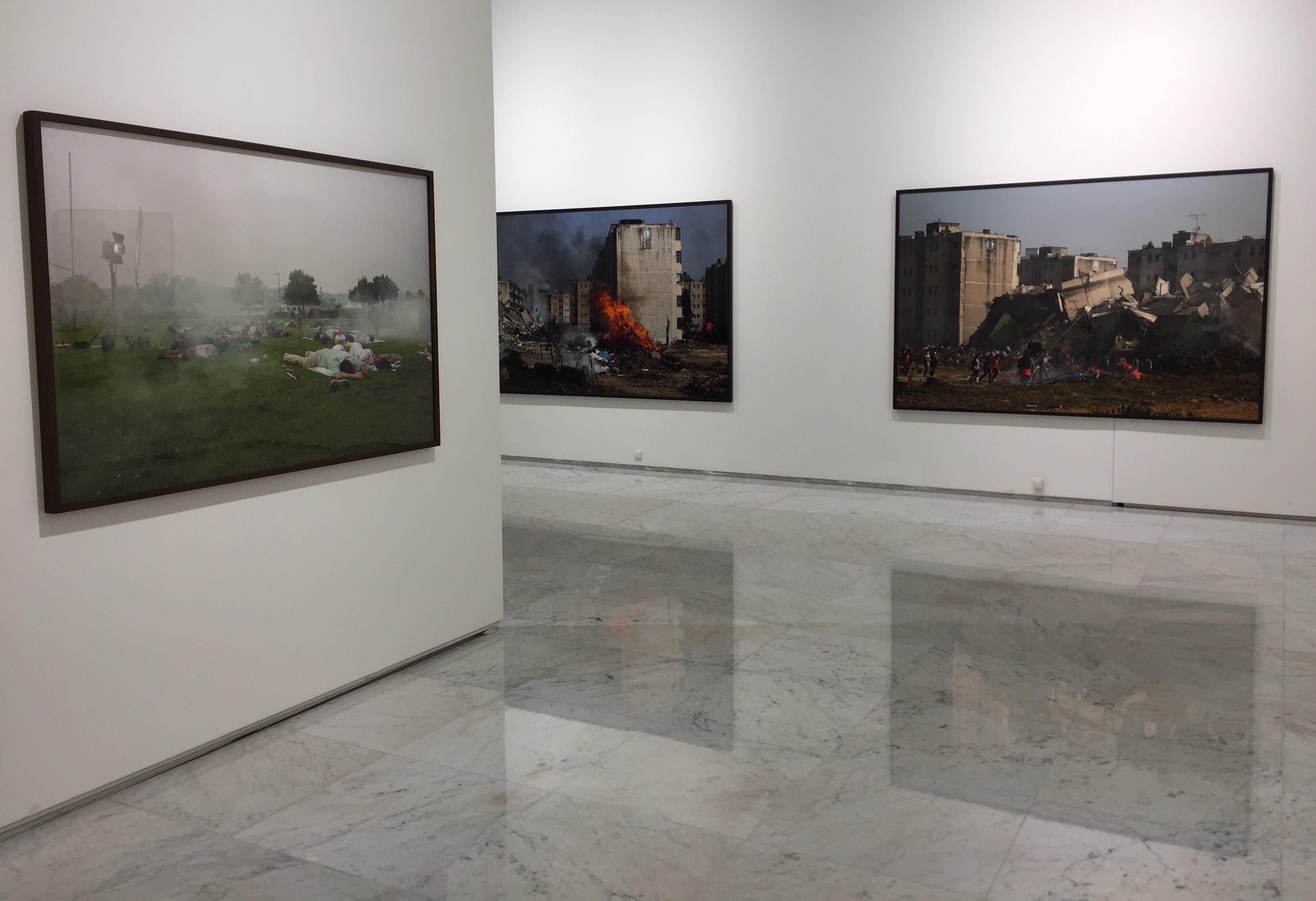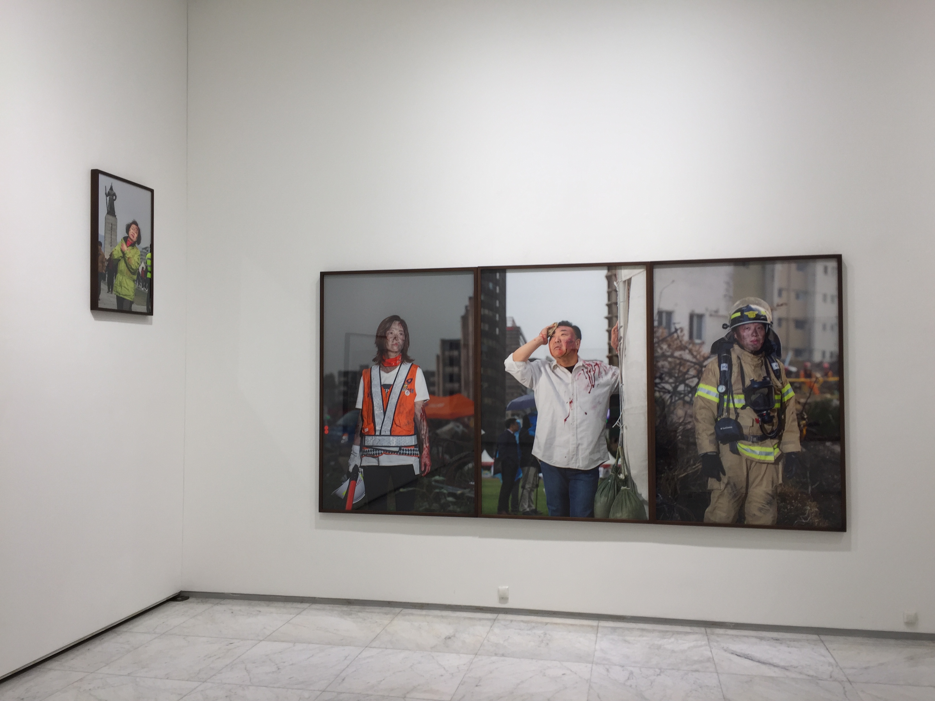 전시작품들은 전쟁 무기를 향한 판타지를 구현한 장면과 전쟁 무기를 애도와 기원의 상징으로 소비하는 아이러니한 풍경의 수집, 미디어로 공유되는 사회적 위험과 불안을 모티브로 비극적인 보도 사진을 모방한 연출 장면, 그리고 재난을 대비하는 사회 공동체의 훈련 현장을 기록한 이미지들로 구성되어 있습니다.