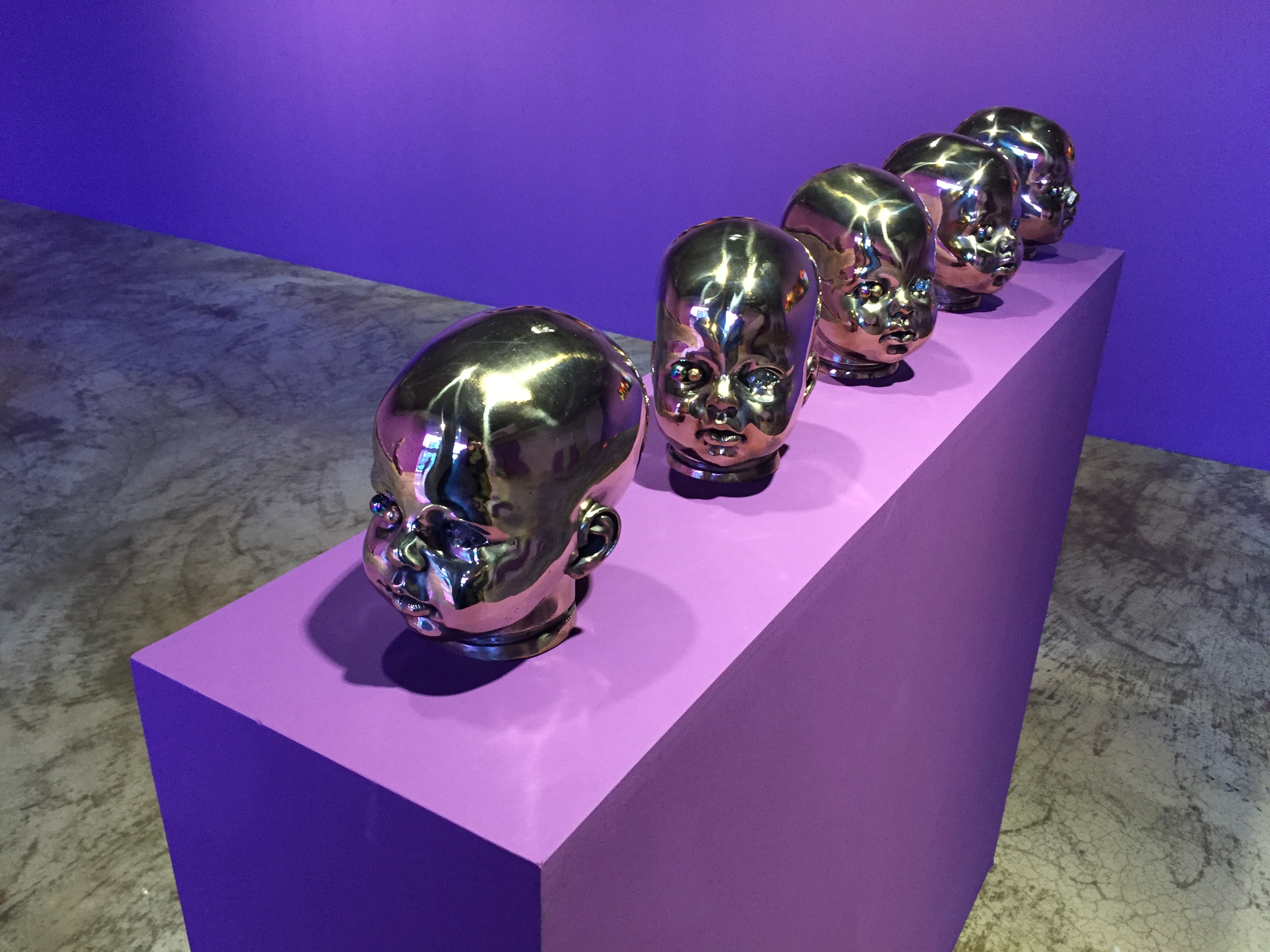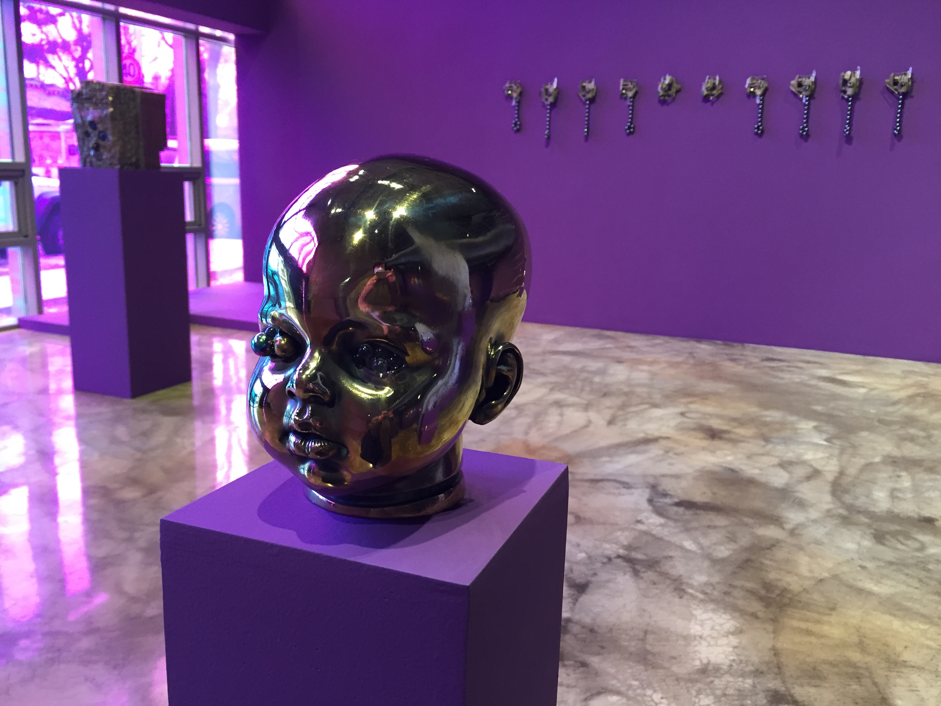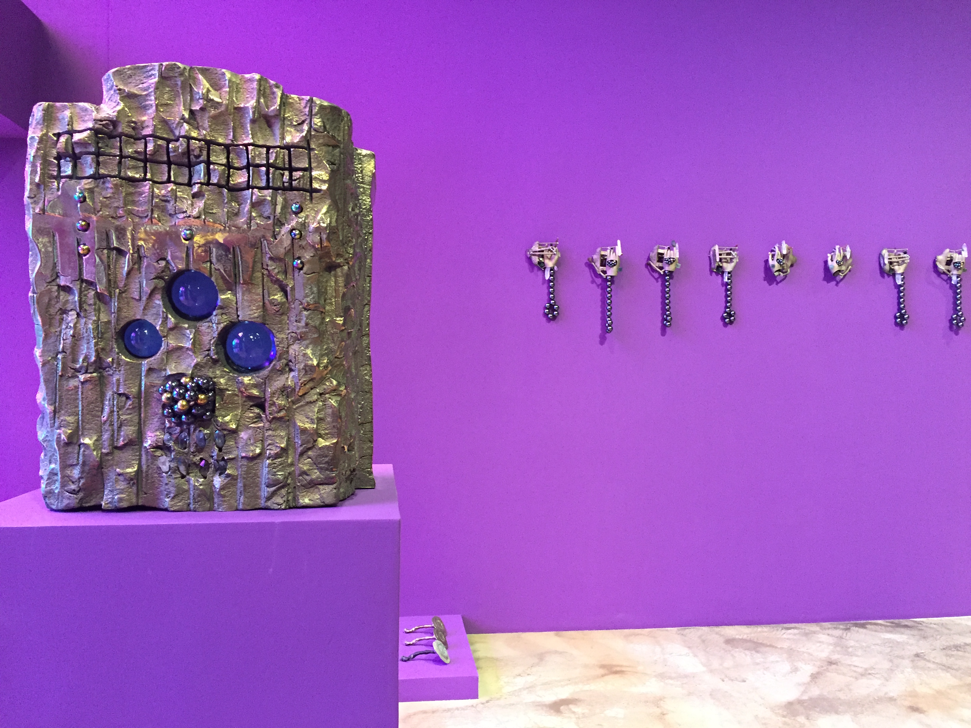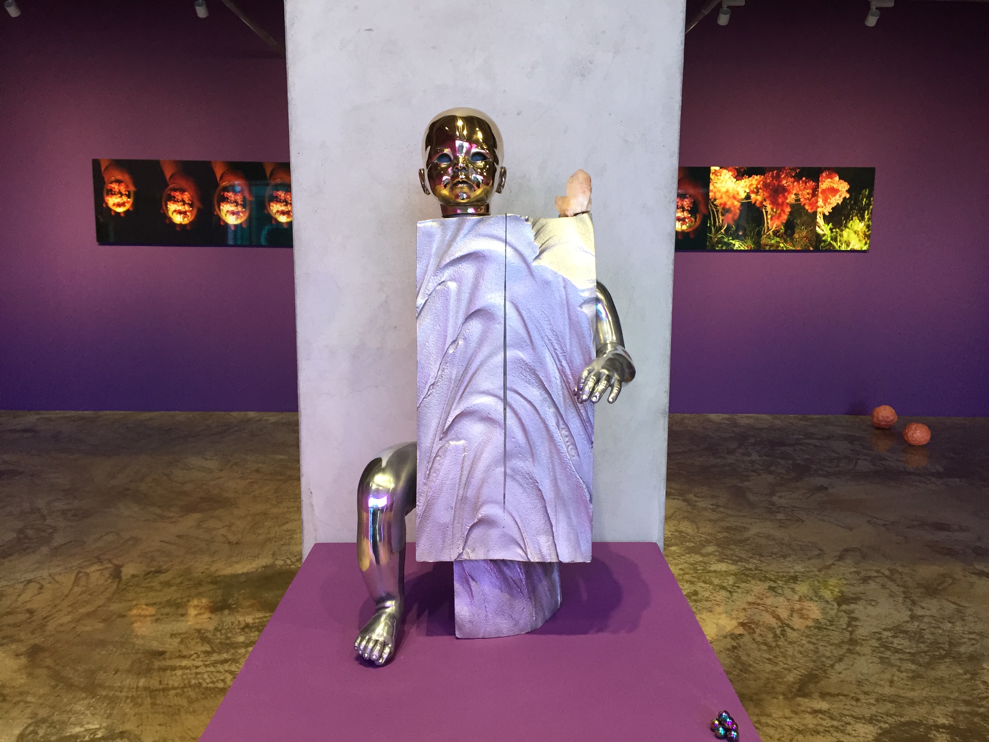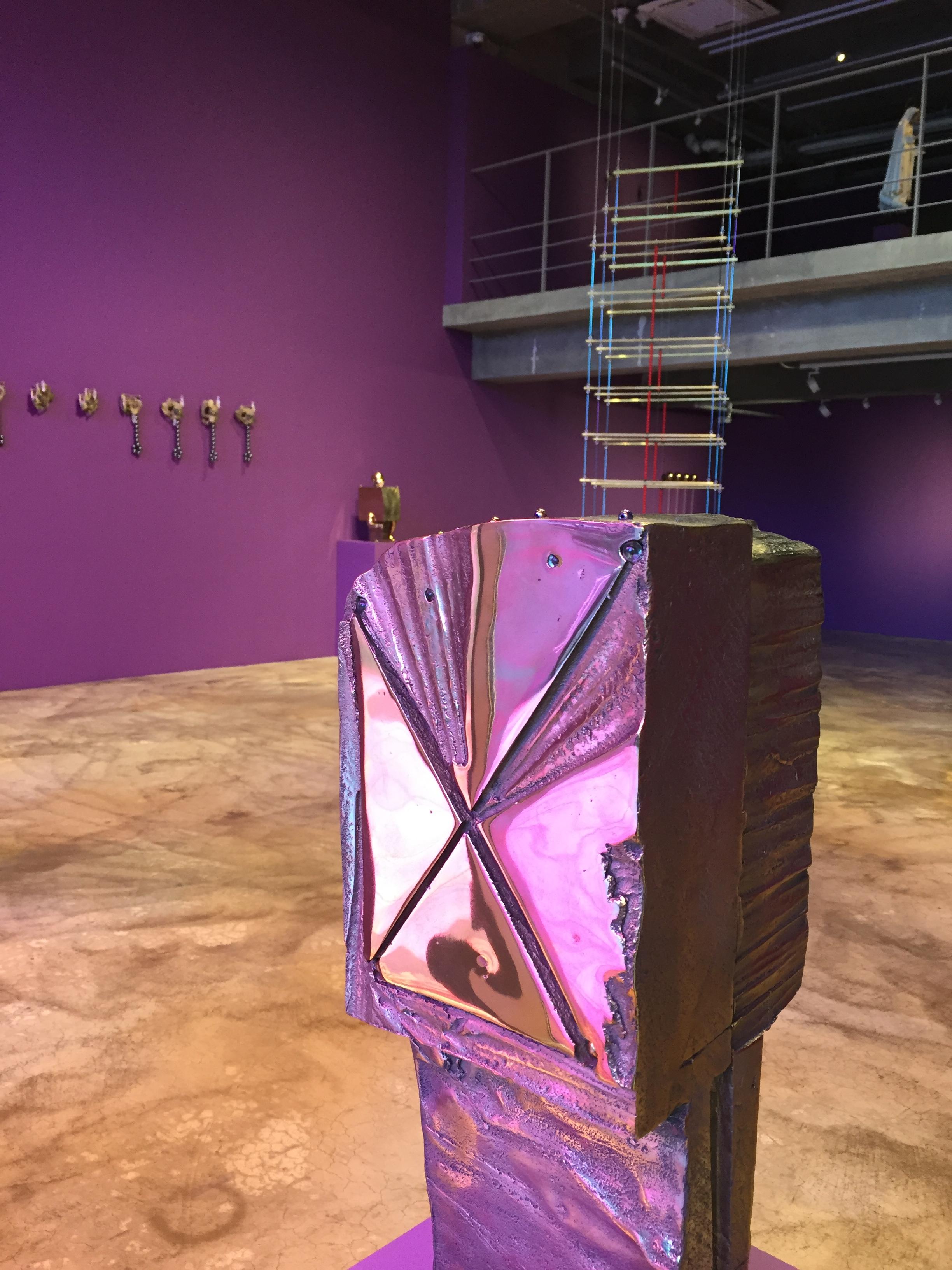 전시장은 여러 개의 동공을 가진 아이의 얼굴과 사이보그 같은 몸통, 알 수 없는 기호와 광석들이 박힌 조각 등 익숙하지 않은 형상으로 가득합니다.