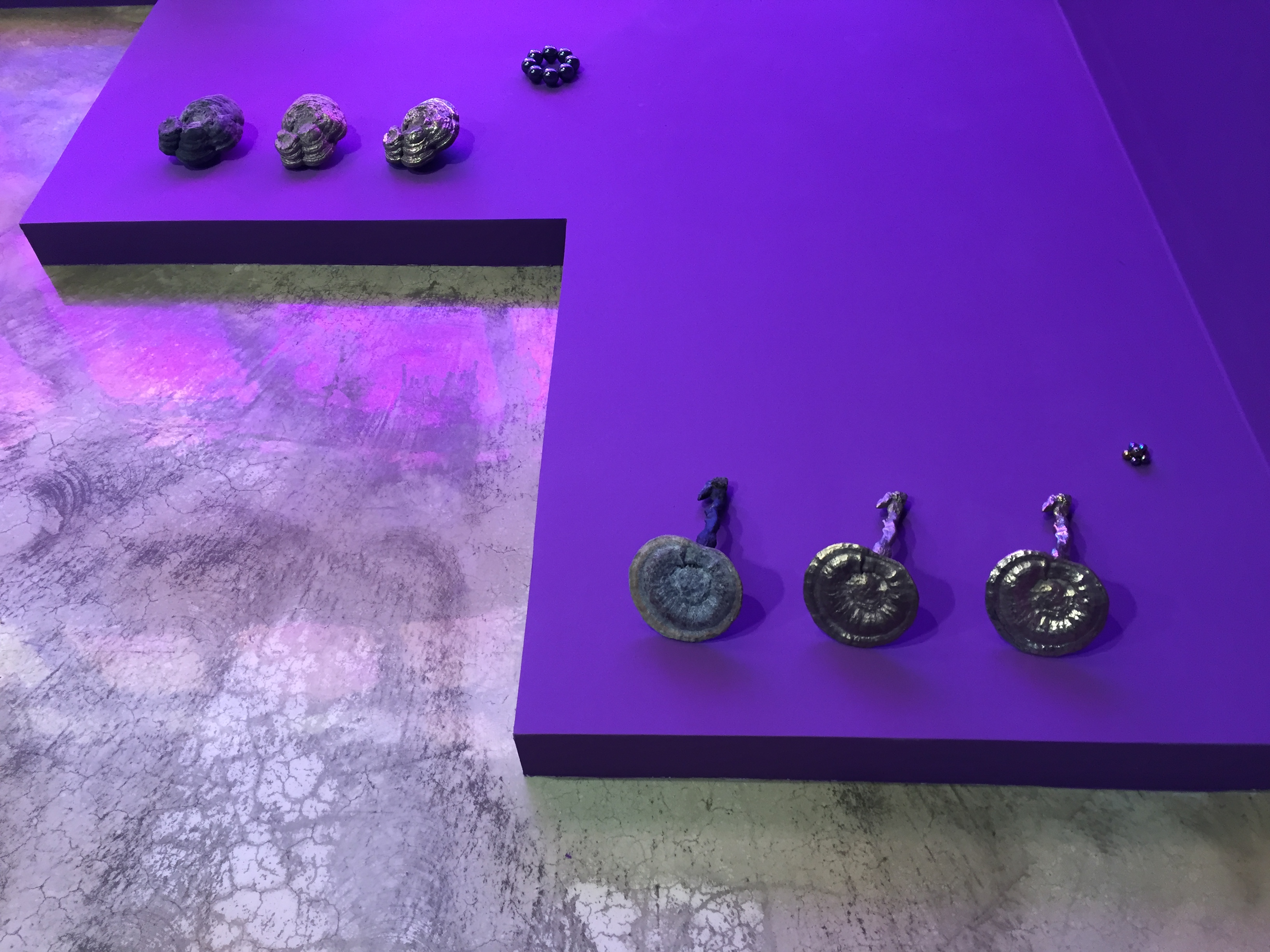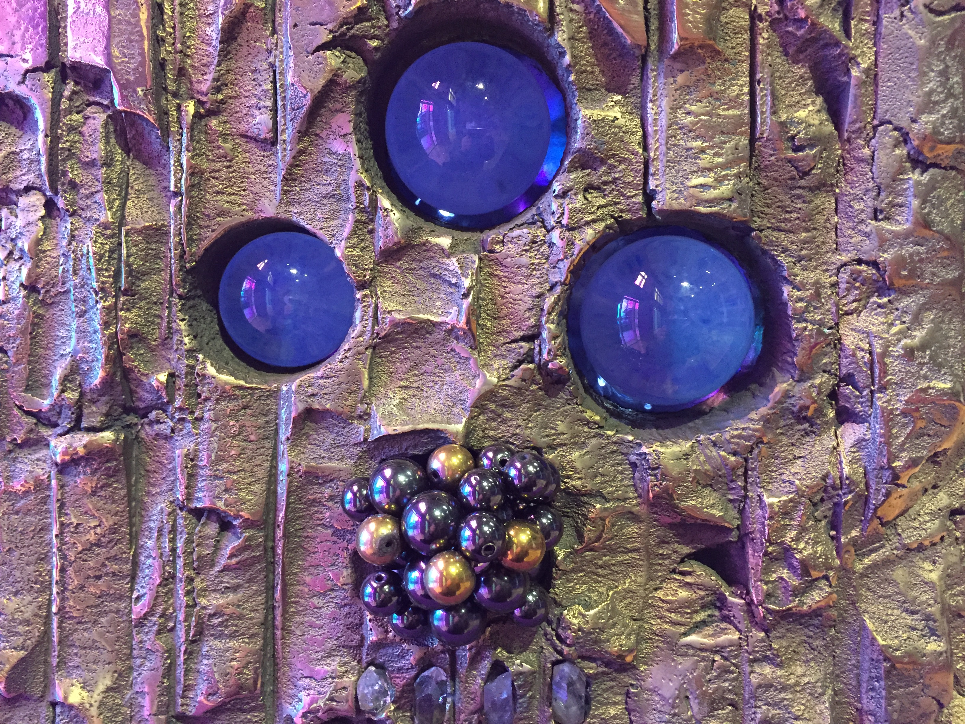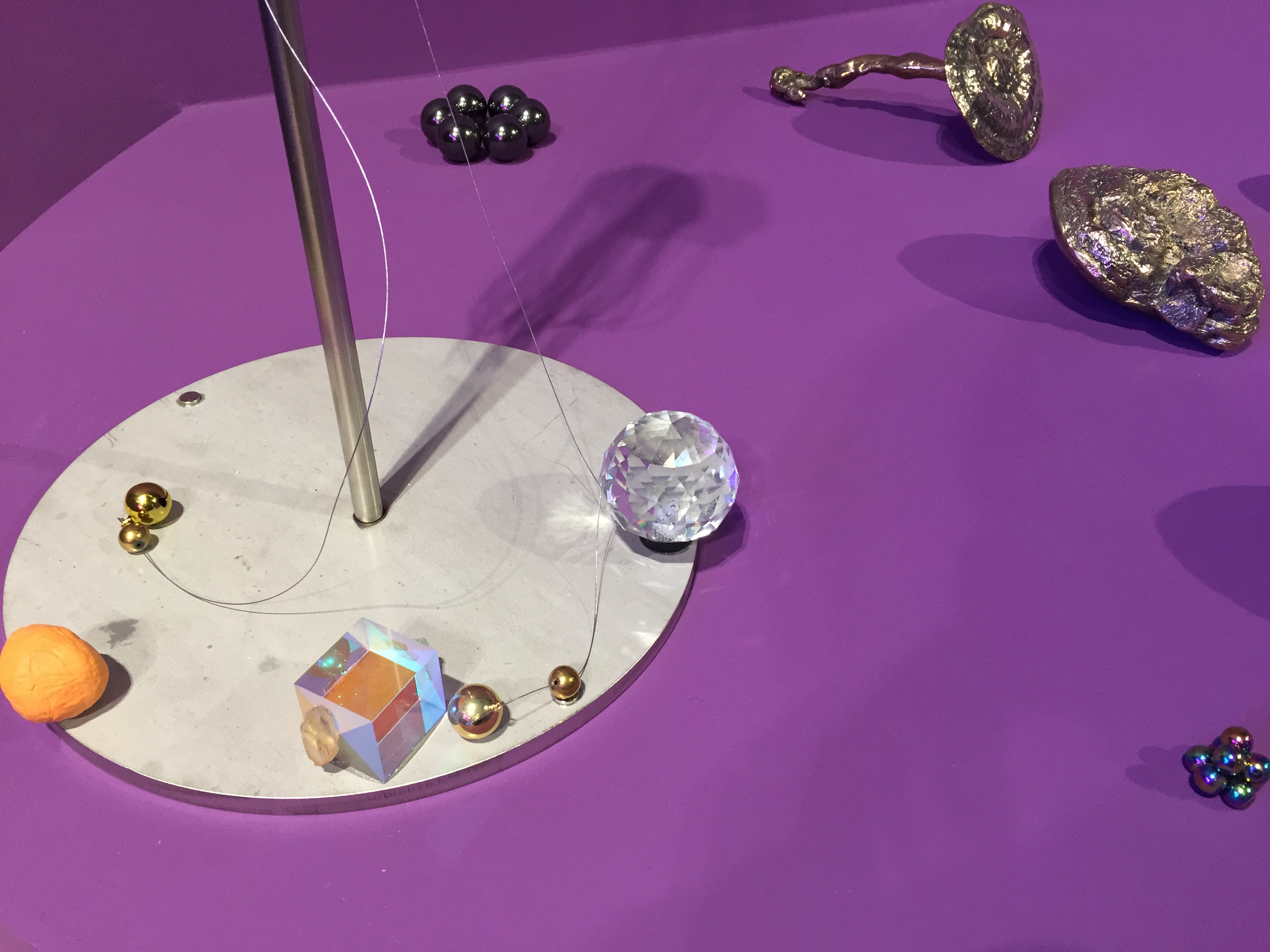 보라색 공간에 황금색으로 주조된 사물들이 주를 이루는 우주 공간 속 행성들과 같은 영롱하고 신비한 모습입니다.