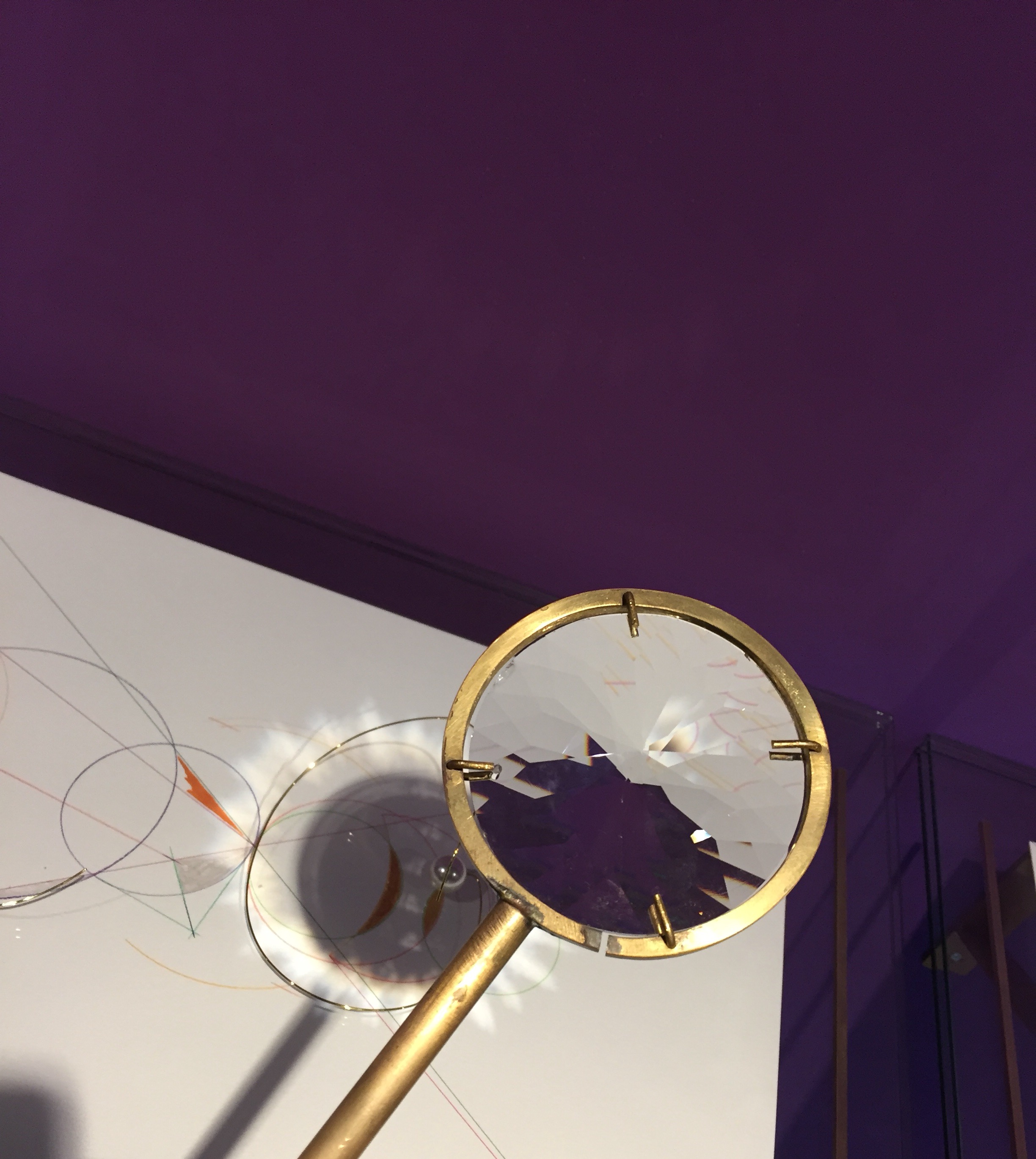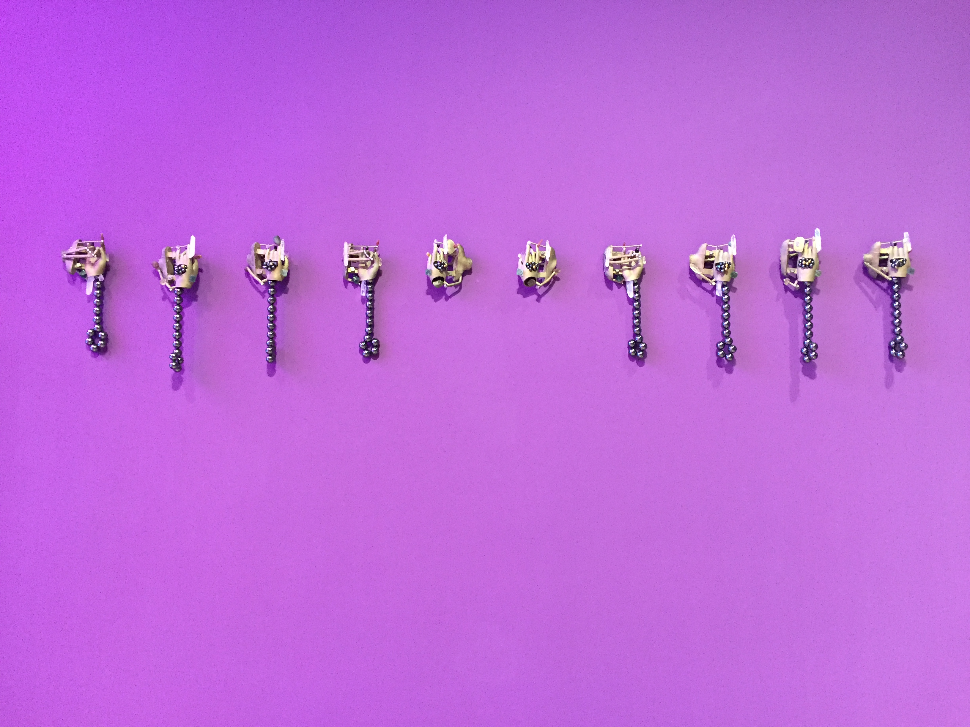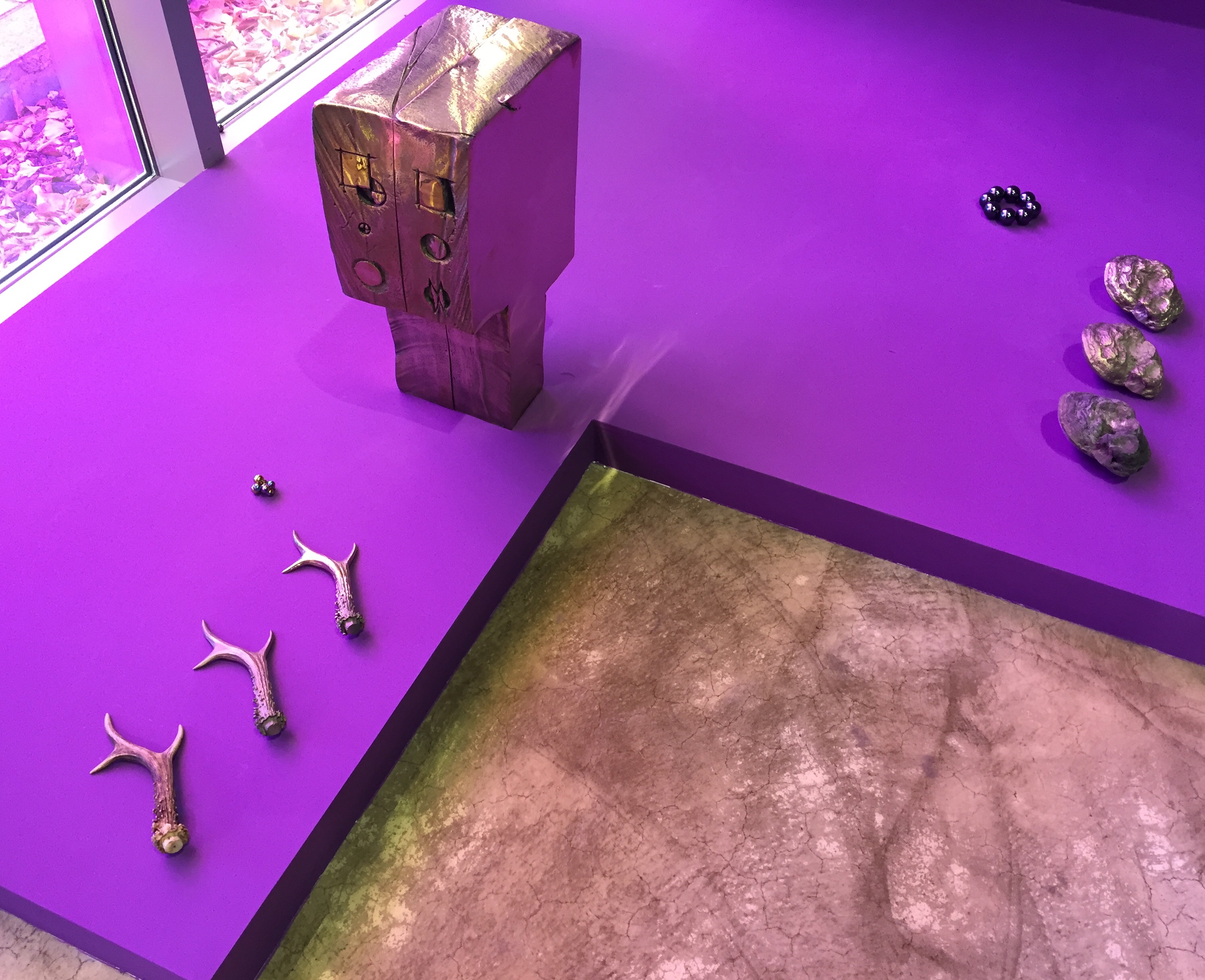 보라색 공간에 황금색으로 주조된 사물들이 주를 이루는 우주 공간 속 행성들과 같은 영롱하고 신비한 모습입니다.