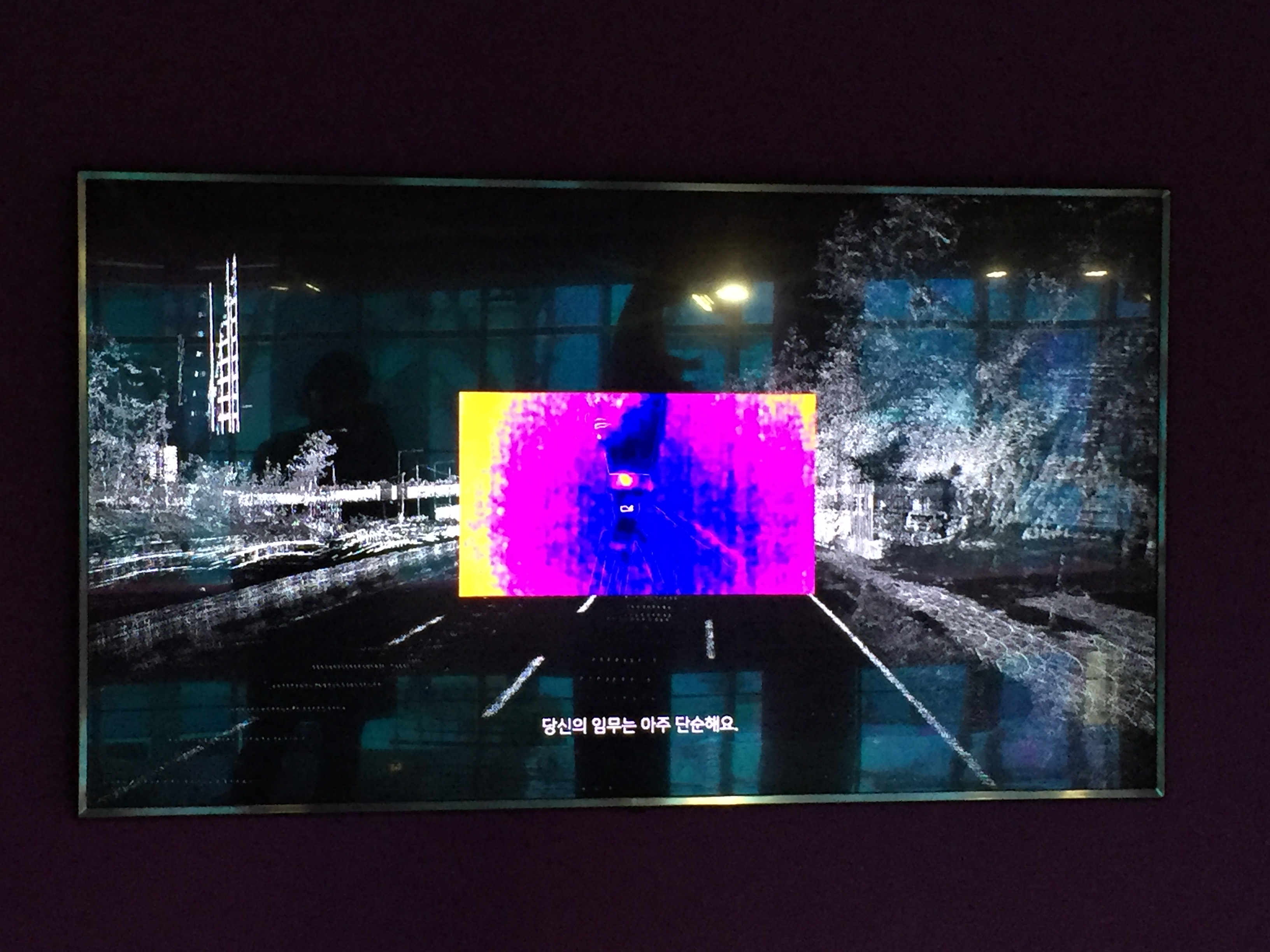 우리가 경험할 수 있는 지각과 인식의 범위를 넘어서지만 먼 미래의 변화가 아닌 아주 가까운 미래에 다가올 변화를 감지하며 자연과 인간, 사물, 기계가 다중적으로 영향을 미치며 존재하는 세계를 예상치 못한 사물들의 조합으로 구성합니다. 2층에서 영상작업 'Galaxy Express'을 볼 수 있는데요. 열화상 카메라, 라이다로 제작한 화면이 중독적인 사운드와 함께 강하게 인상에 남았습니다.