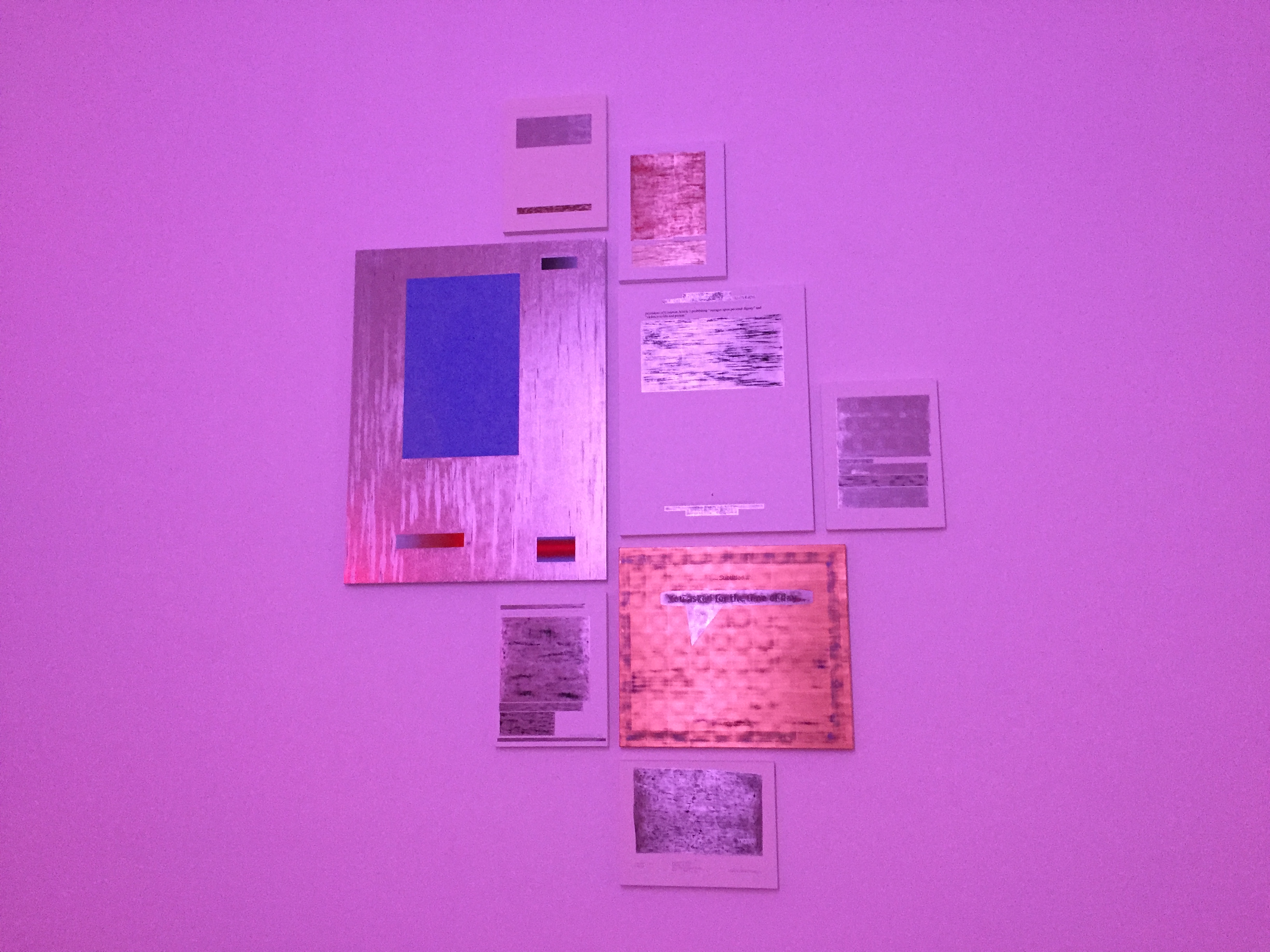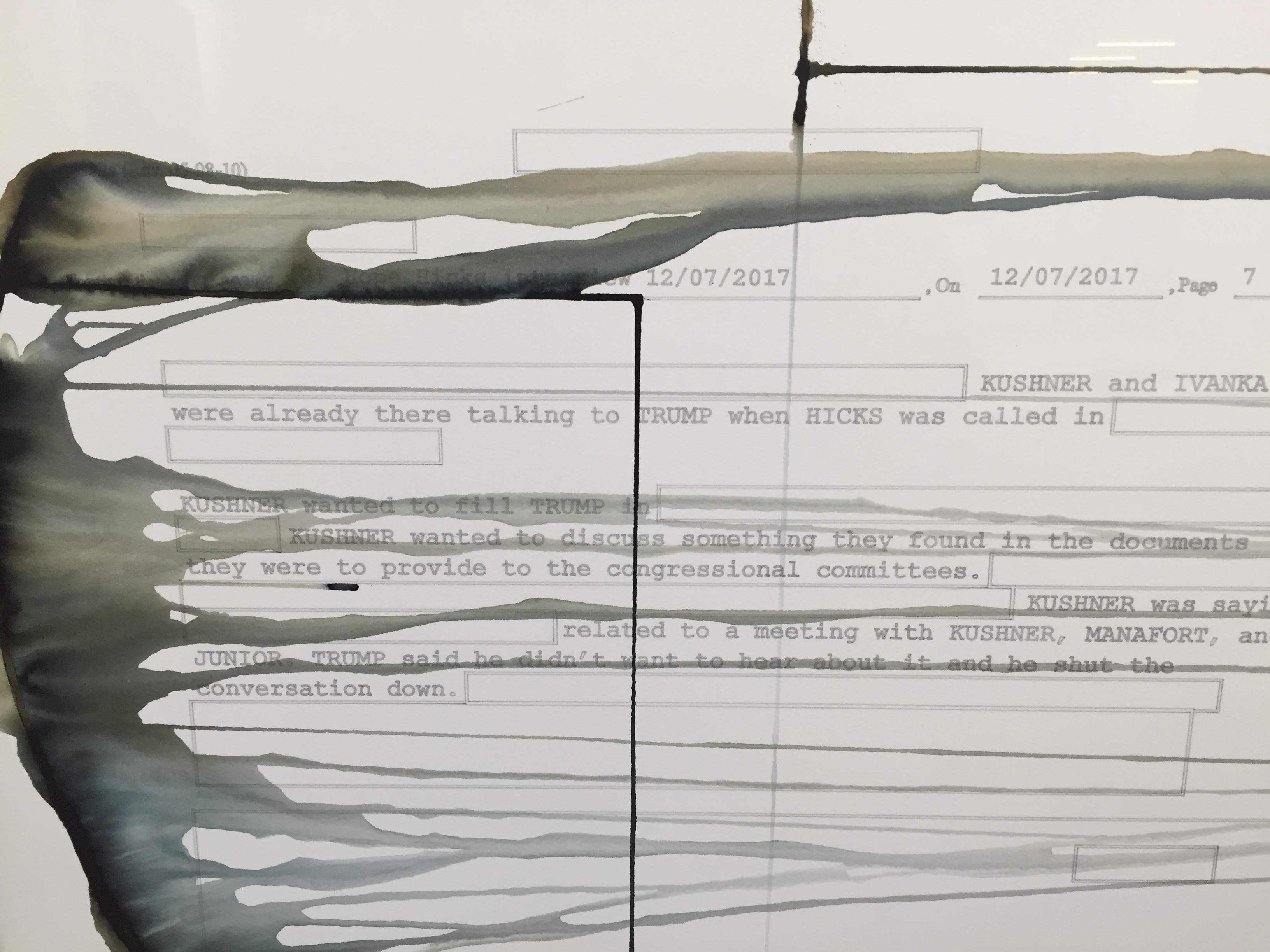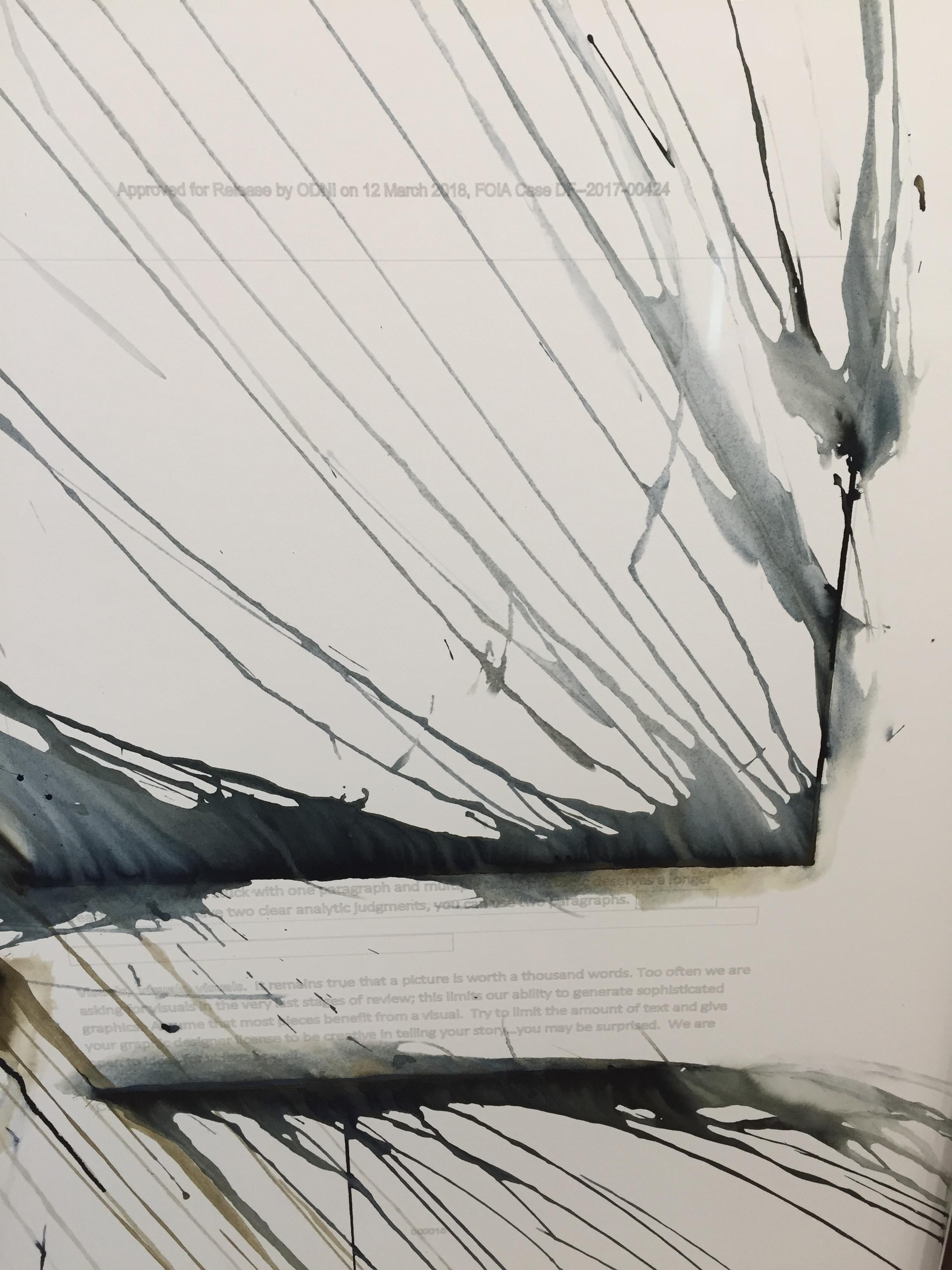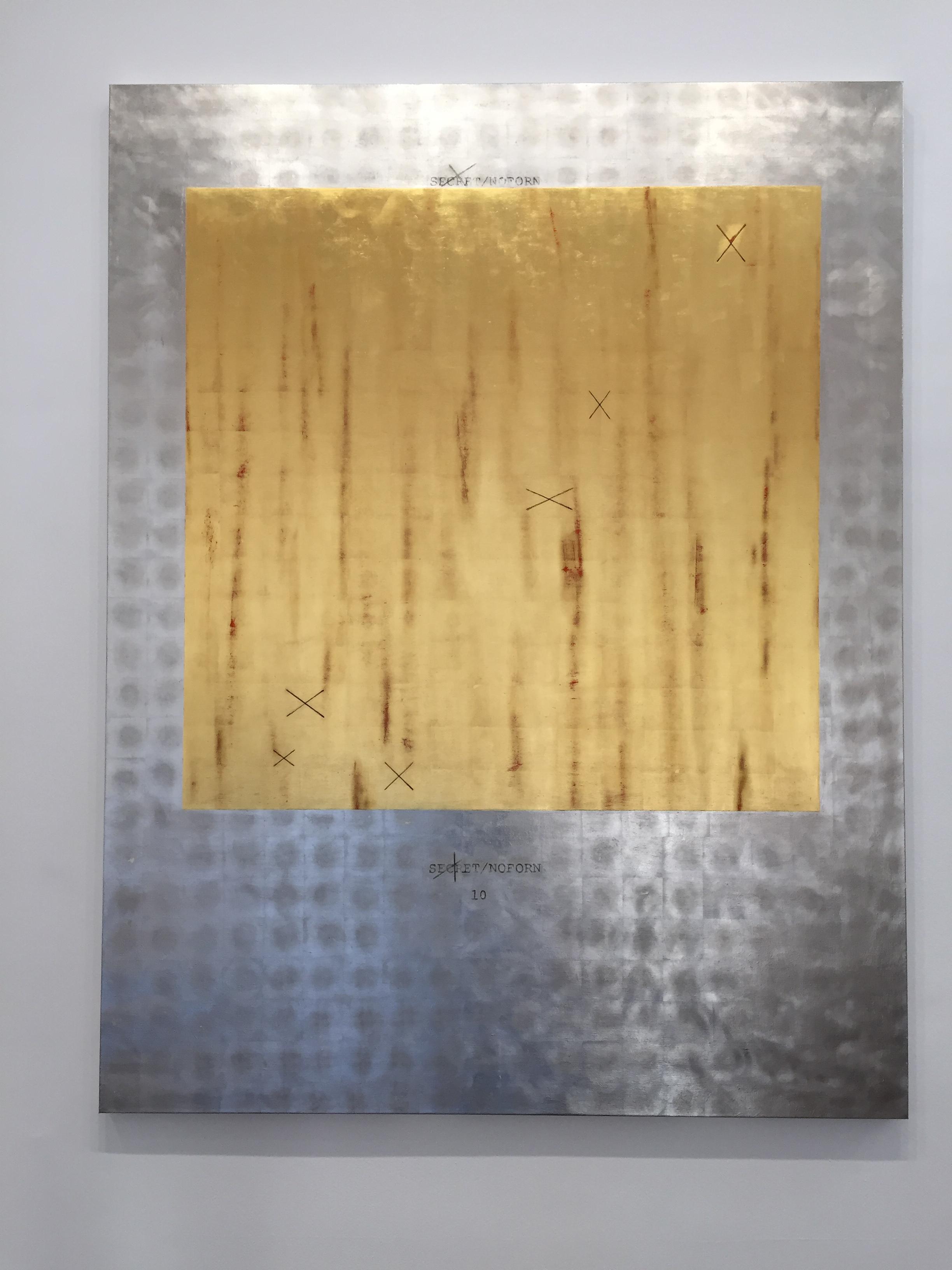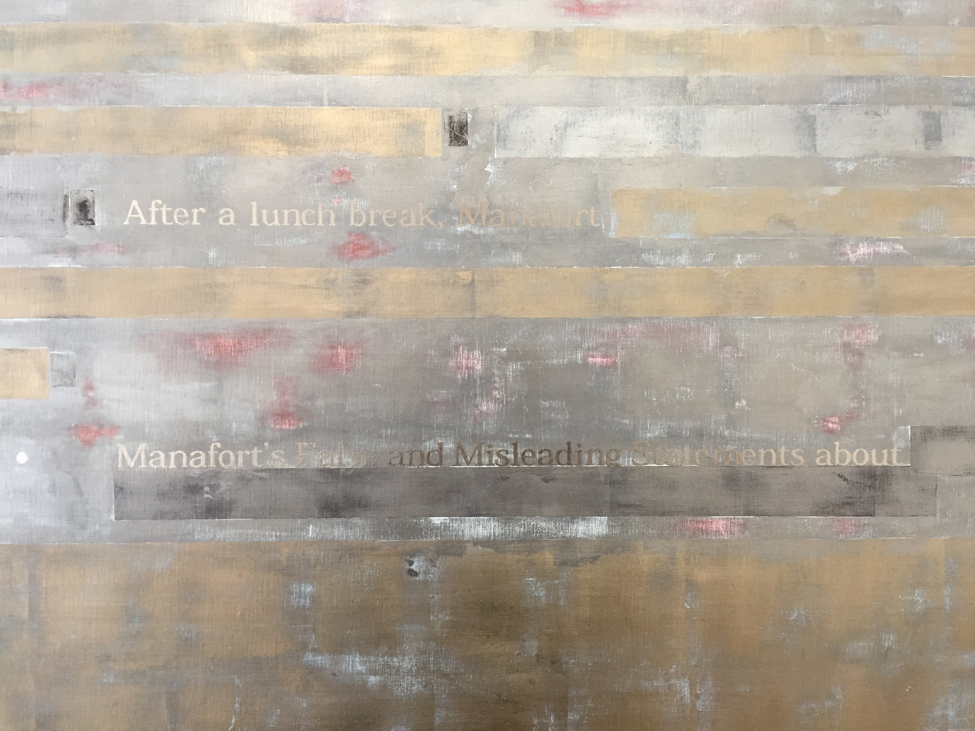제니 홀저가 꾸준히 제작하고 있는 검열 회화(Redaction Painting) 연작이 K2 벽면을 장식한다. 린넨에 유화를 입히면서 미국 정보 공개법(Freedom of Information Act)에 따라 공개된 정부 문서를 회화로 번안해내는 방식이다. 이미 상당히 검열된 상태로 기밀 해제된 미국 정부 및 군부 문서가 작가의 손을 거쳐 거대한 추상화로 변모하고, 이때 정부문서 상의 검정색 검열 막대기는 다채로운 금박 및 은박으로 호환된다.