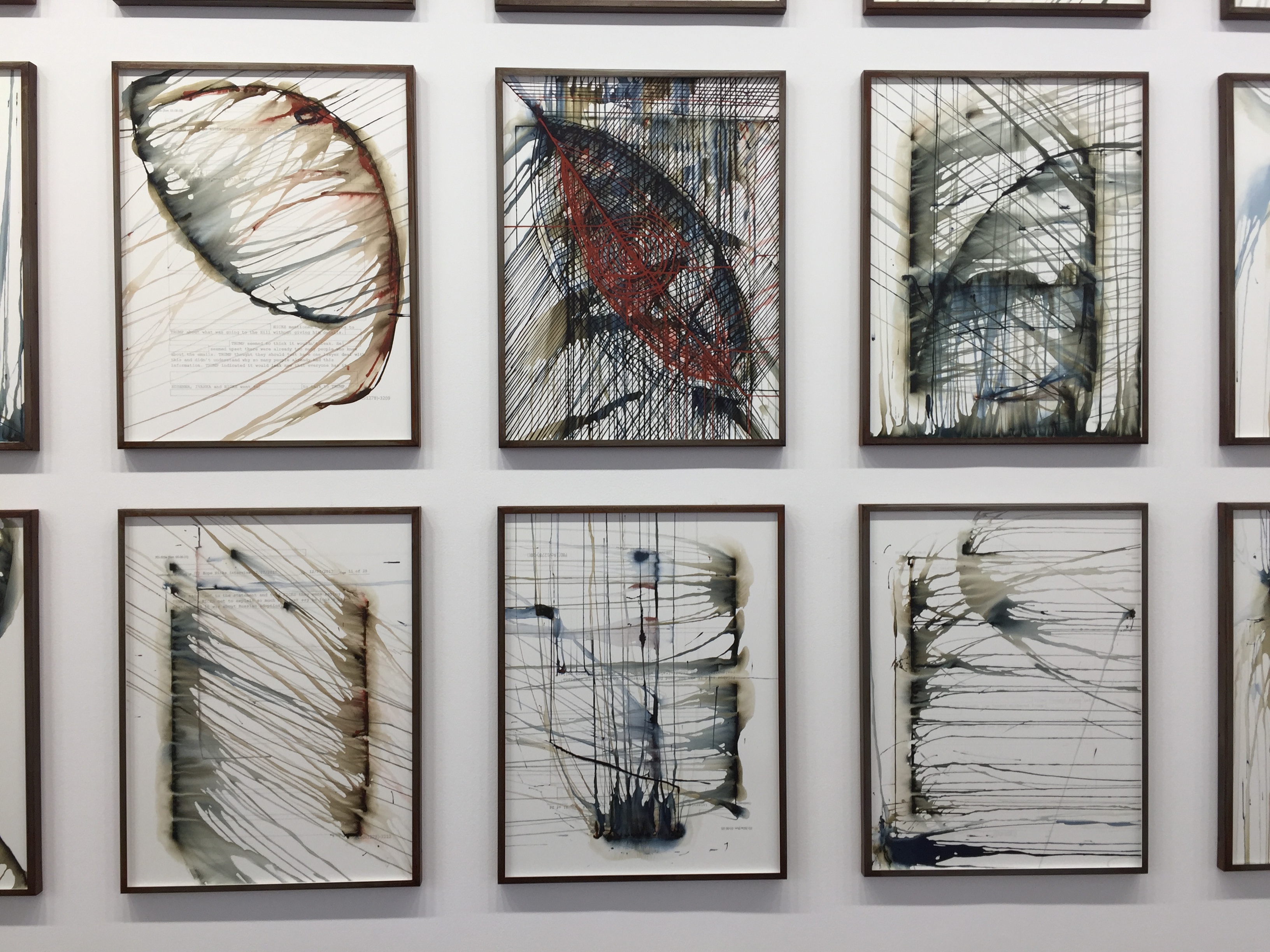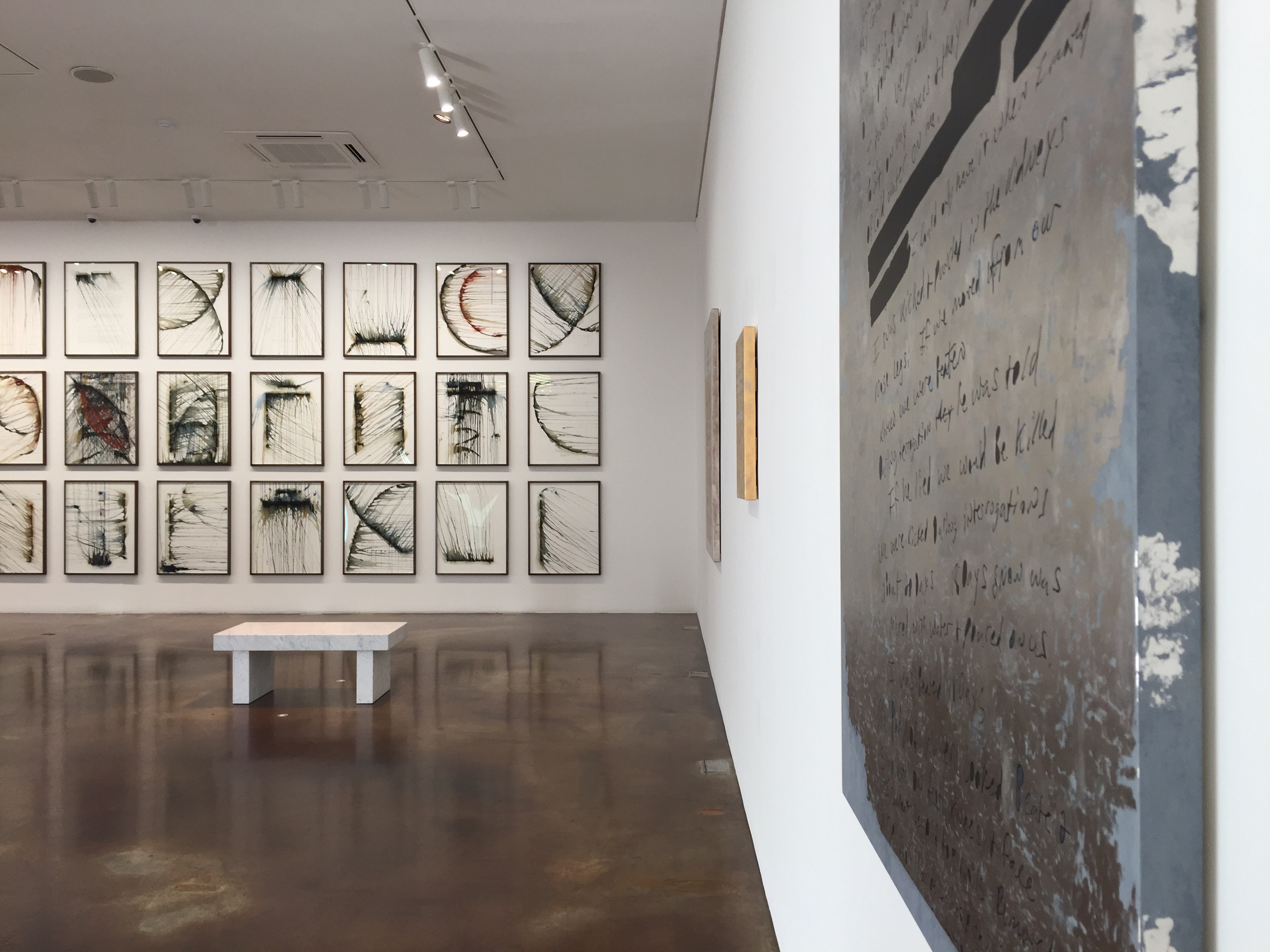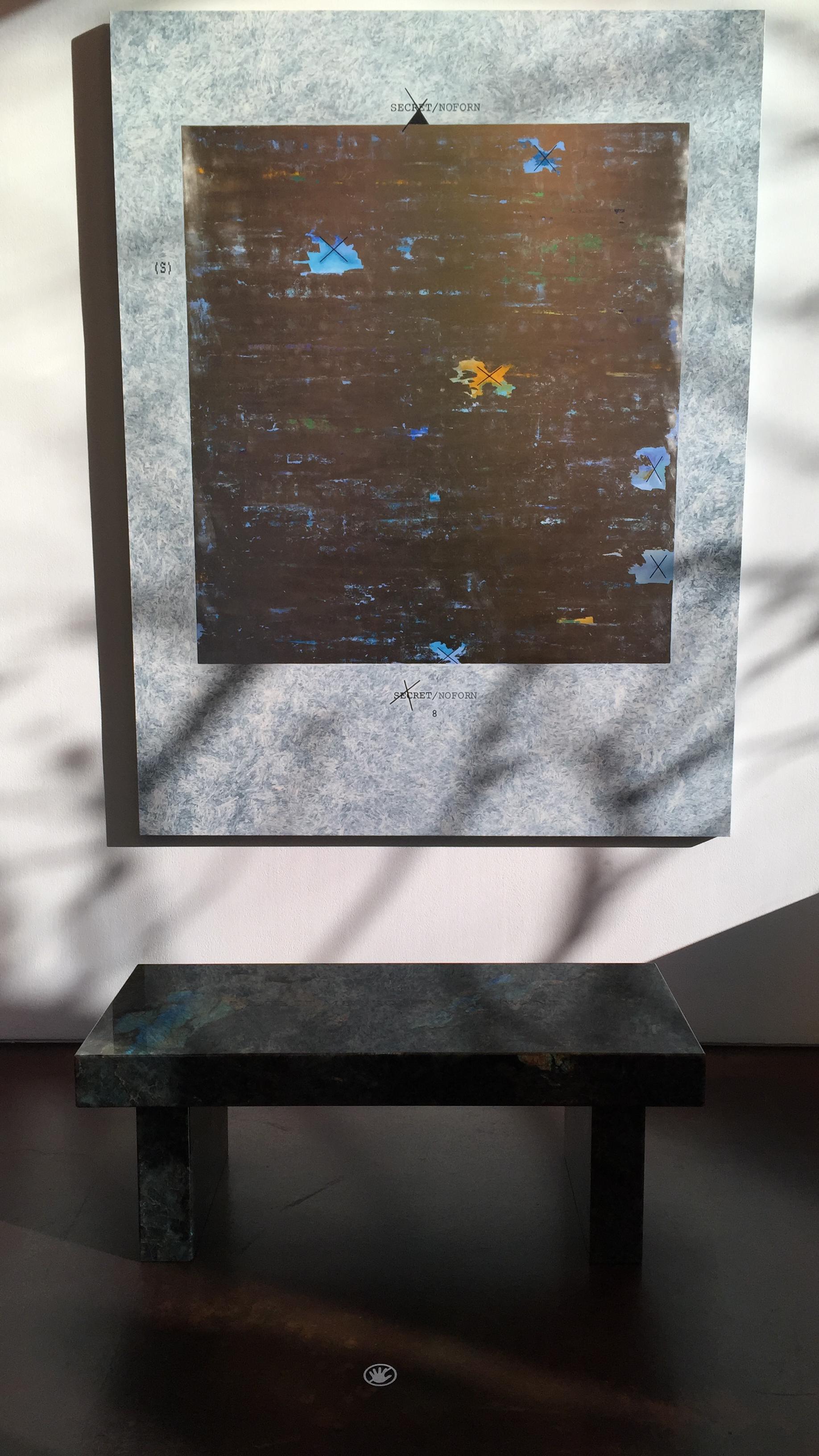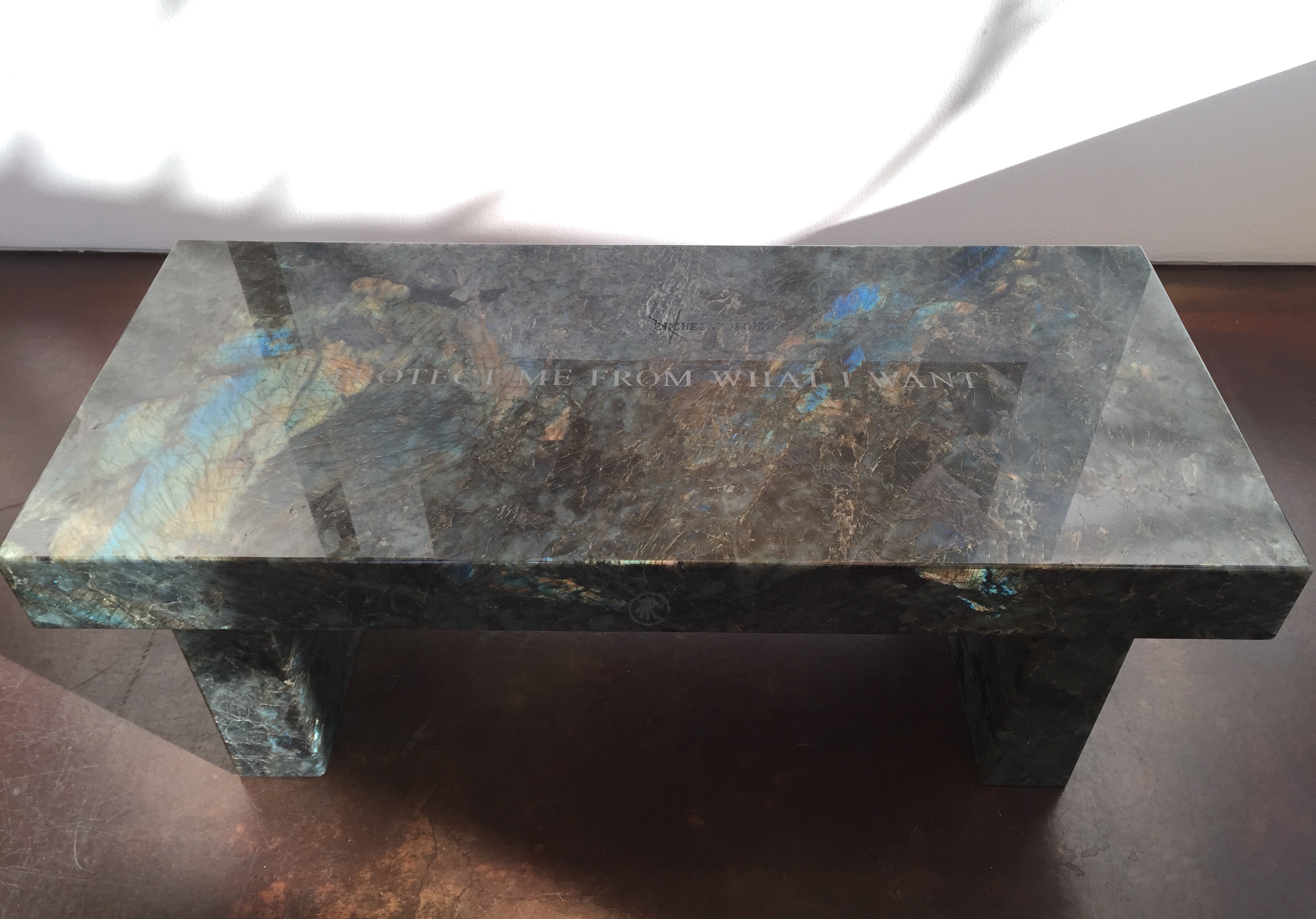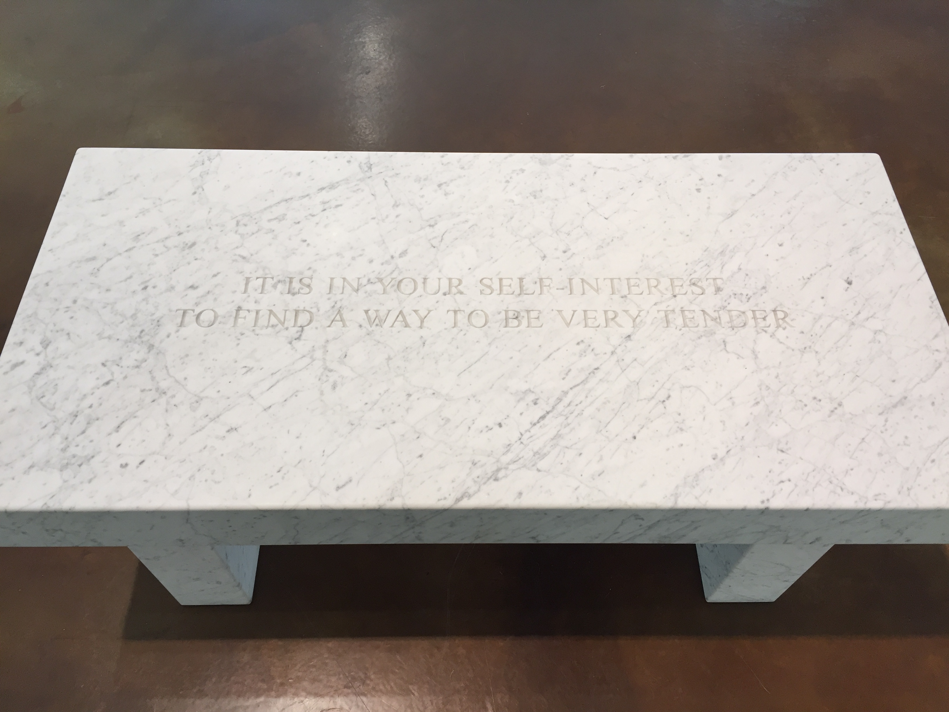 회화 및 수채화 앞에는 벤치 모양을 한 대리석 작품이 여러 점 자리한다. 상판에 새겨진 텍스트를 손가락으로 따라 읽는 과정에서 관람객은 본능화된 독해 과정을 새삼스럽게 의식하며 감정의 범주와 이해의 범주에 대해 생각해볼 기회를 갖는다.