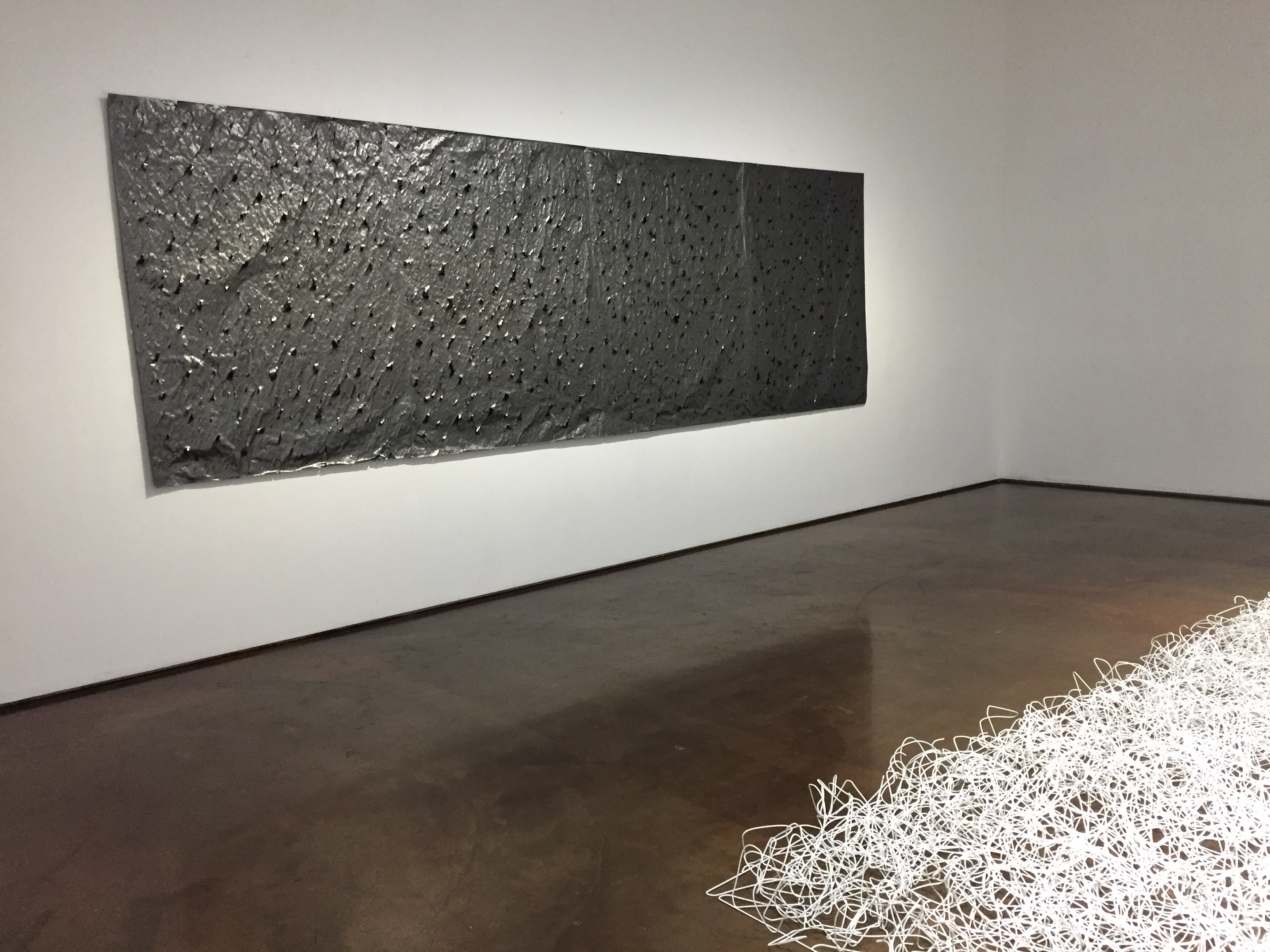 일상의 물건을 작업에 사용해 한국 사회를 살아가던 최병소 개인과 예술가의 열망을 표현하는 방식은 현장 설치 작품 <무제 016000>(2016)에서도 이어진다. 전시장 바닥을 가득 채운 이 설치 작품은 옷장에 걸려있는 세탁소 철제 옷걸이 한 개를 즉흥적으로 구부려 보는 것에서 시작되었다. 세로 7미터, 가로 4미터를 덮은 8천여 개의 가벼운 옷걸이들은 구부러져 백색의 선으로, 그리고 단색의 공간으로 먹먹하게 펼쳐진다. 이 옷걸이들은 신문 지우기 연작의 연필과 같은 의미를 지닌다