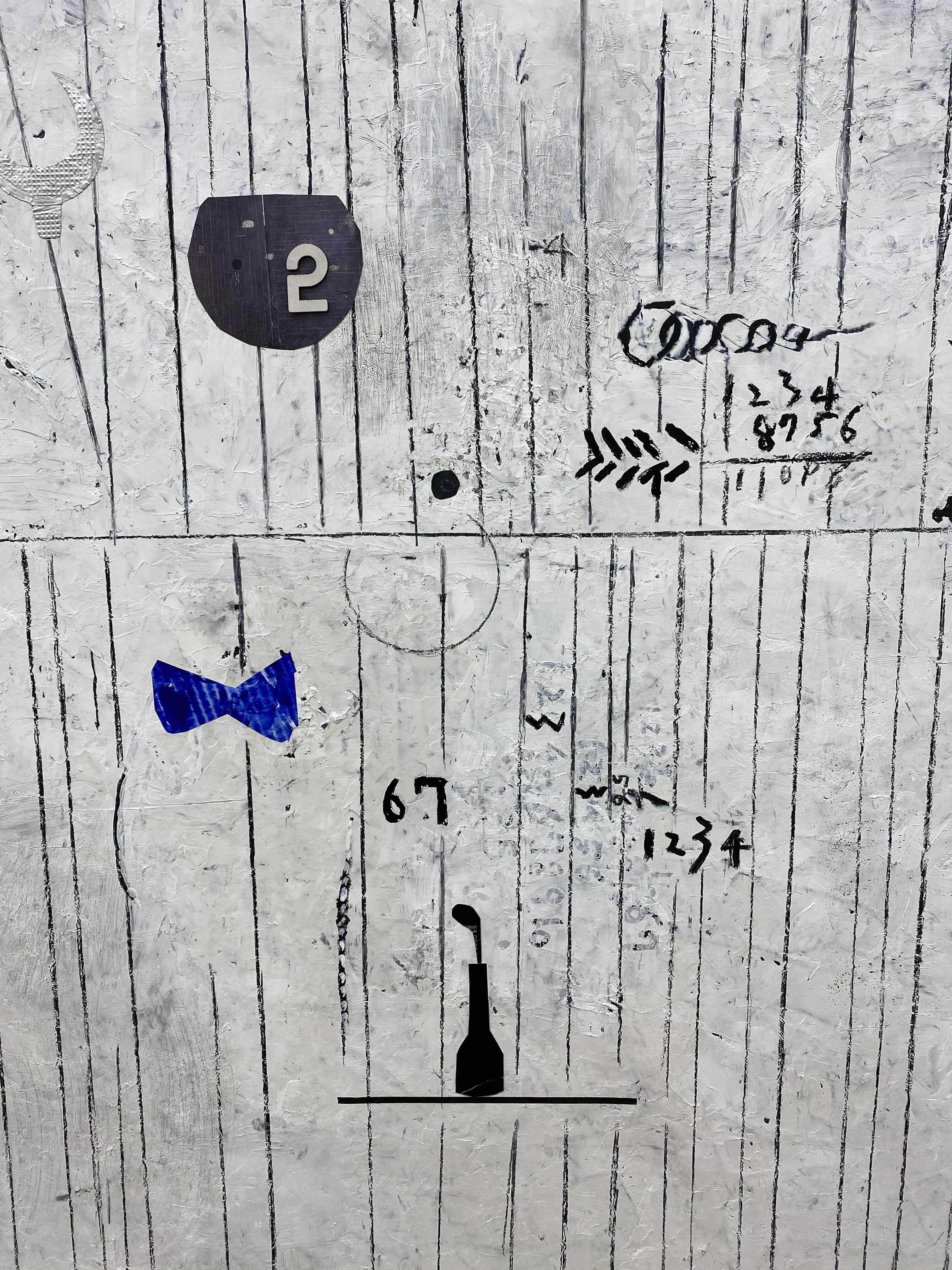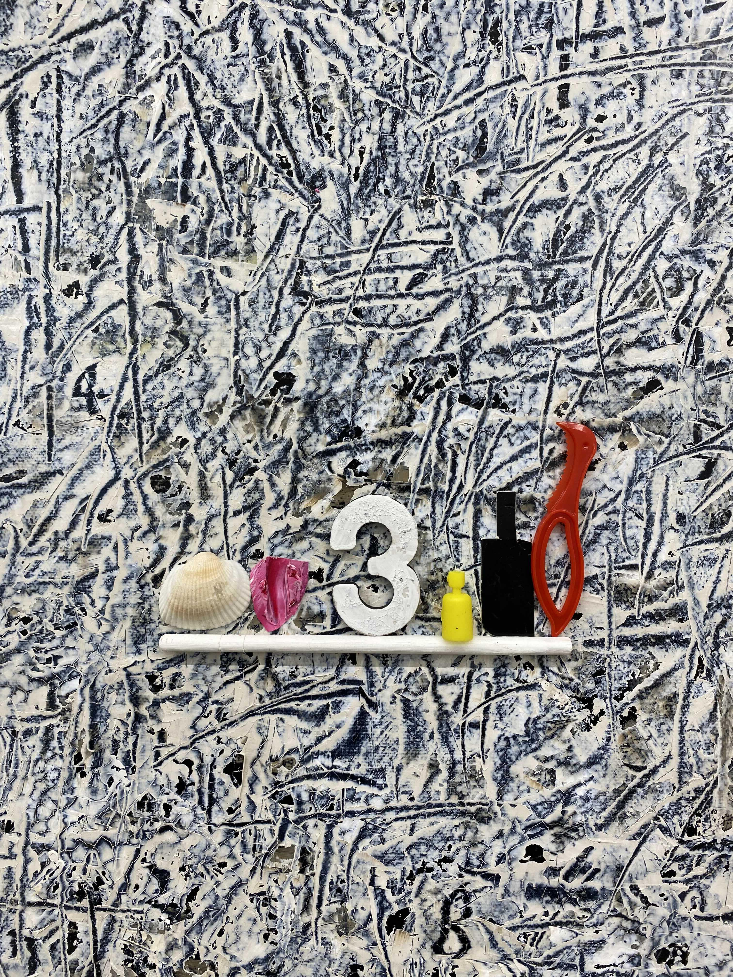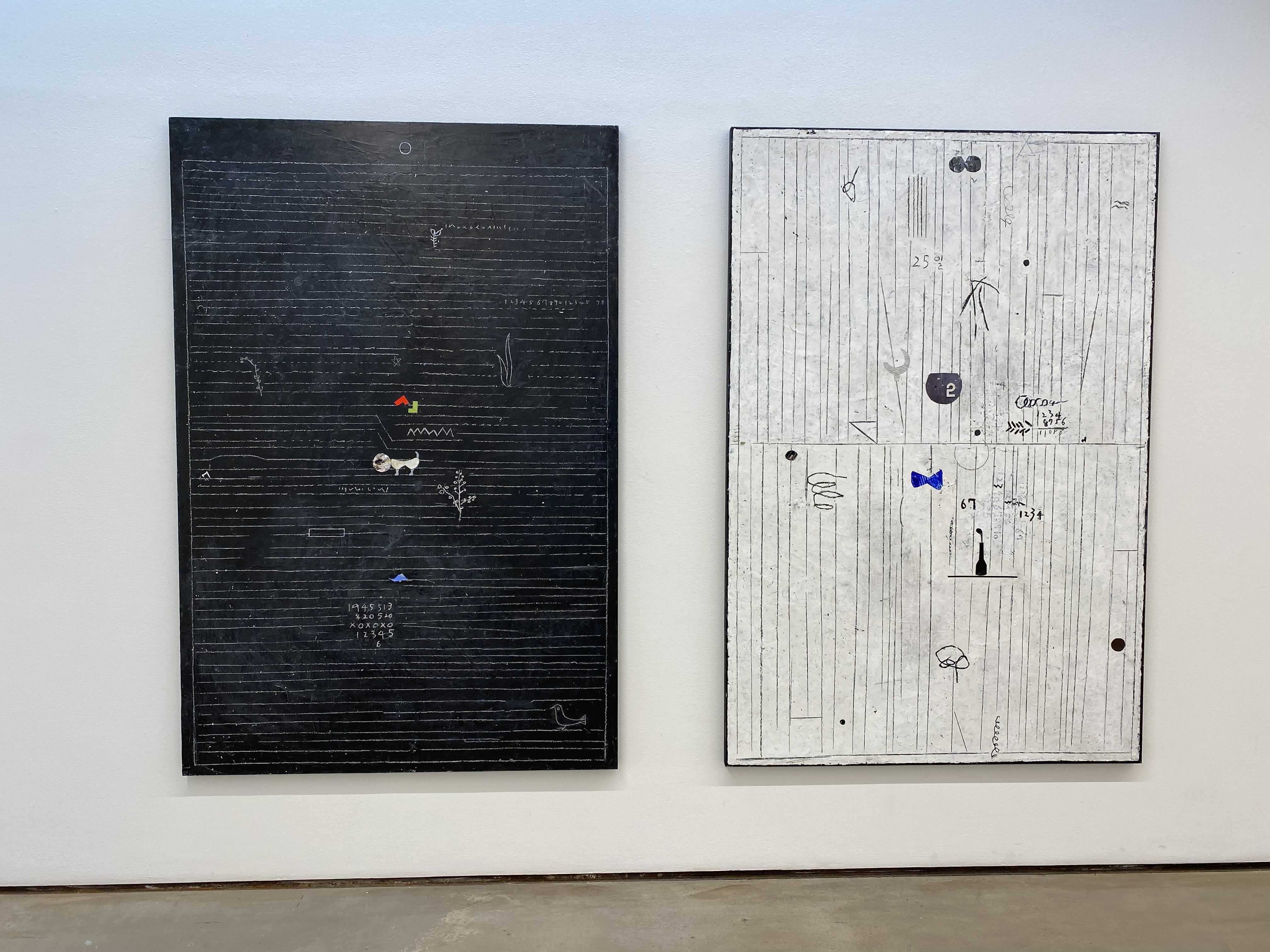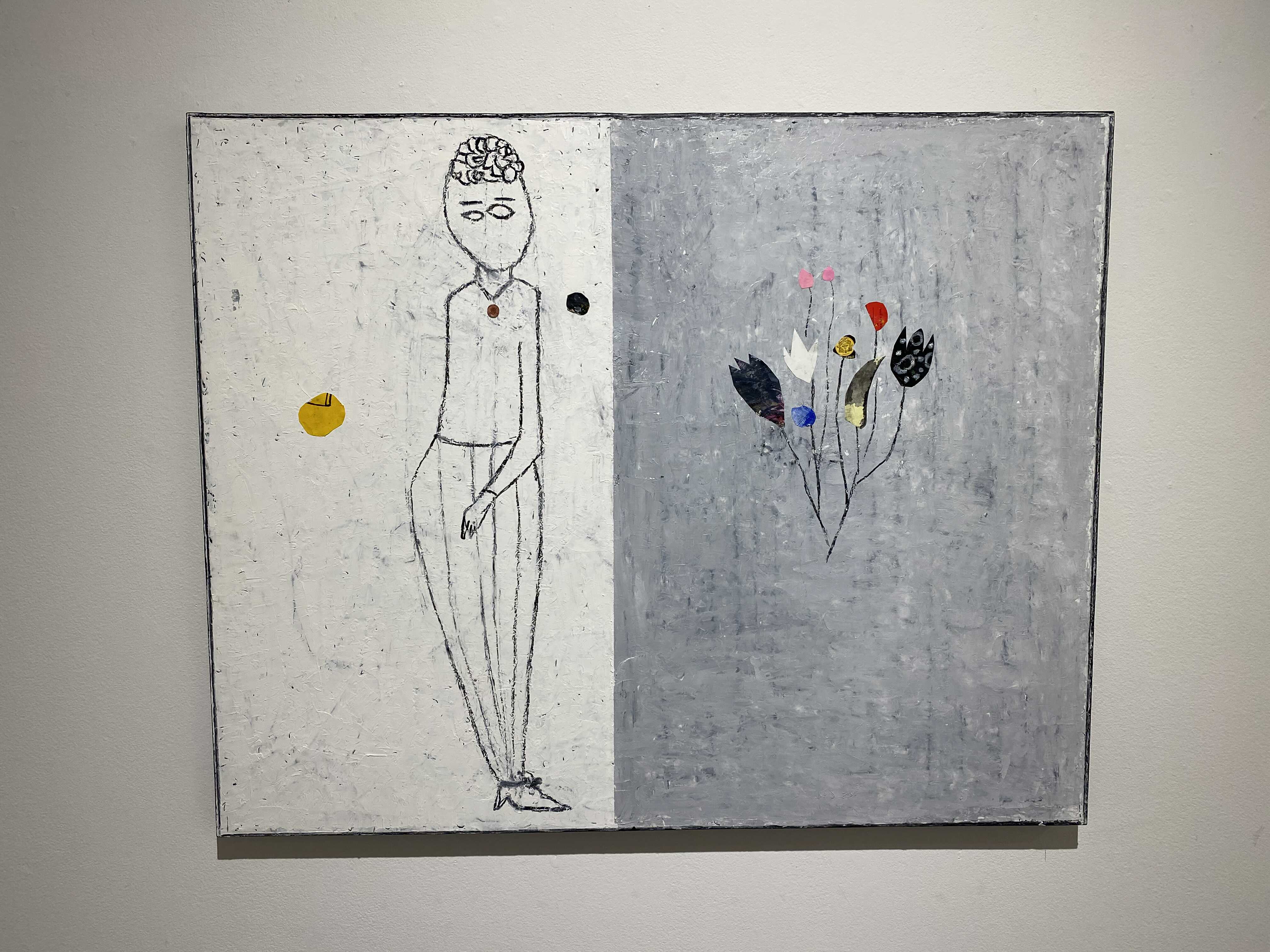 화면의 피부는 매우 납작하지만, 그 위로 물감과 사물이 생명체처럼 서식한다. 다양한 작가만의 표식들이 풀이나 돌처럼 흩어져있다. 그것들이 희한하게 어우러져 매혹적인 작품을 일군다. 그림과 콜라주, 오브제와 조각적 행위가 섞인 상태로, 낙서와 장난 같은 것들이 마음 가는 대로 표면에서 뒹군다. 우연성과 자발성에 기댄 이 조형적 행위는 연쇄적인 고리 안에서 순환한다. 숫자들은 연속적으로, 반복해서 적혀있고 그것 자체로 자족적인 독해될 수 없는 선, 기호들이 곳곳에 출몰한다. 그 사이로 꽃과 새 등의 형상을 거느린 콜라주가 얹혀있다. 그 주변에는 작은 일상의 사물들이 은밀하게, 조심스레 안착되었다. 그림과 콜라주, 오브제들은 표면 위에서 차이를 무화시키면서 공존한다. 이미 배경이 되는 바탕 화면 자체가 견고하고 풍부한 물성의 흔적, 아득한 시간과 풍화의 과정을 농밀하게 저장하면서 거의 조각에 가까운 오브제화된 피부를 회임하고 있기에 그 위에 올라간 모든 것들은 밑바닥에서 자연스레 베어 올라오는, 불가피하게 밀려나온 것으로 보인다. 표면과 분리되지 않는 그림이자 바탕을 지지대 삼아 그것과 내용적, 형식적 연관성의 공모관계를 부단히 조성하는, 일구어가는 그림이다.