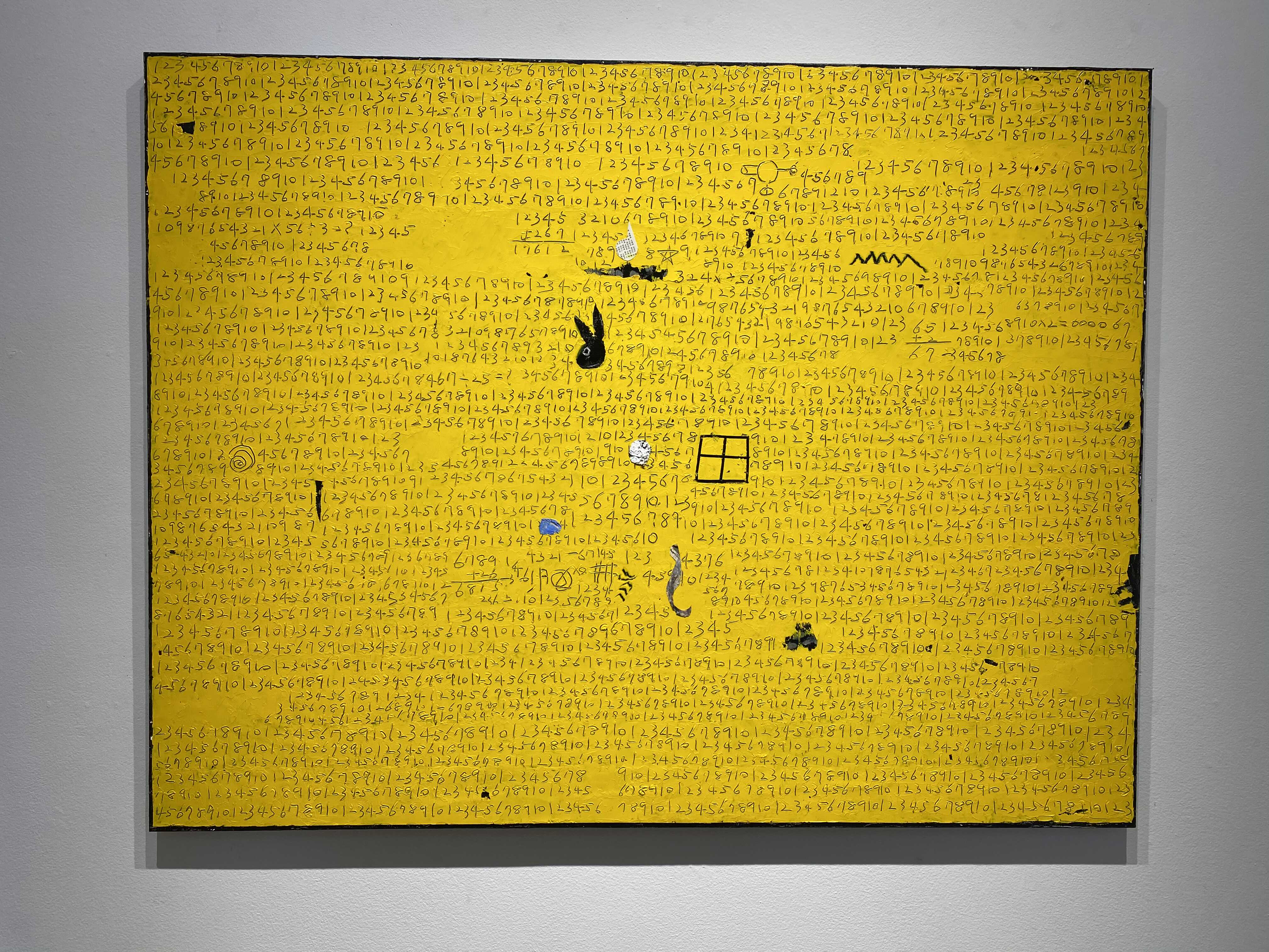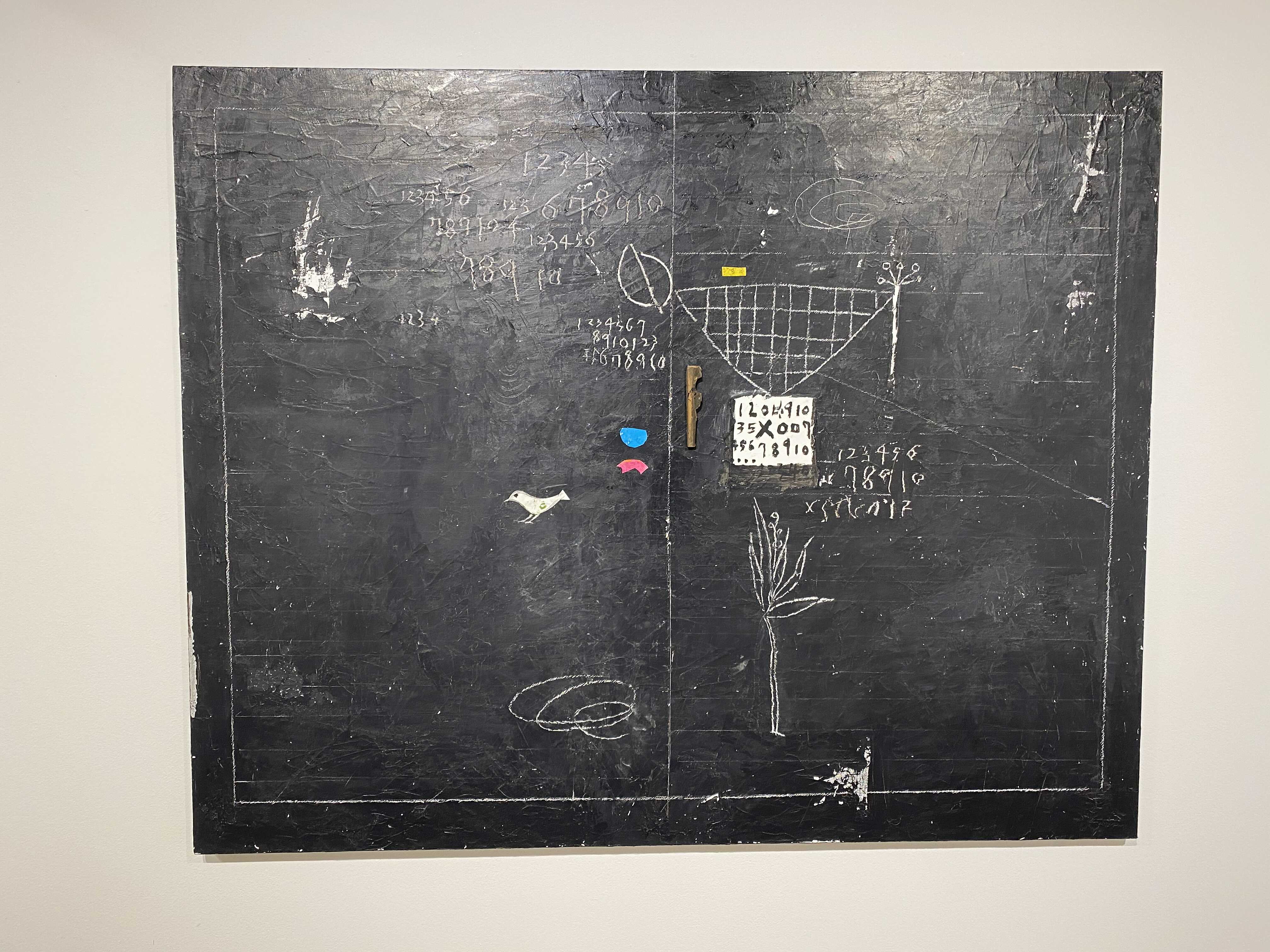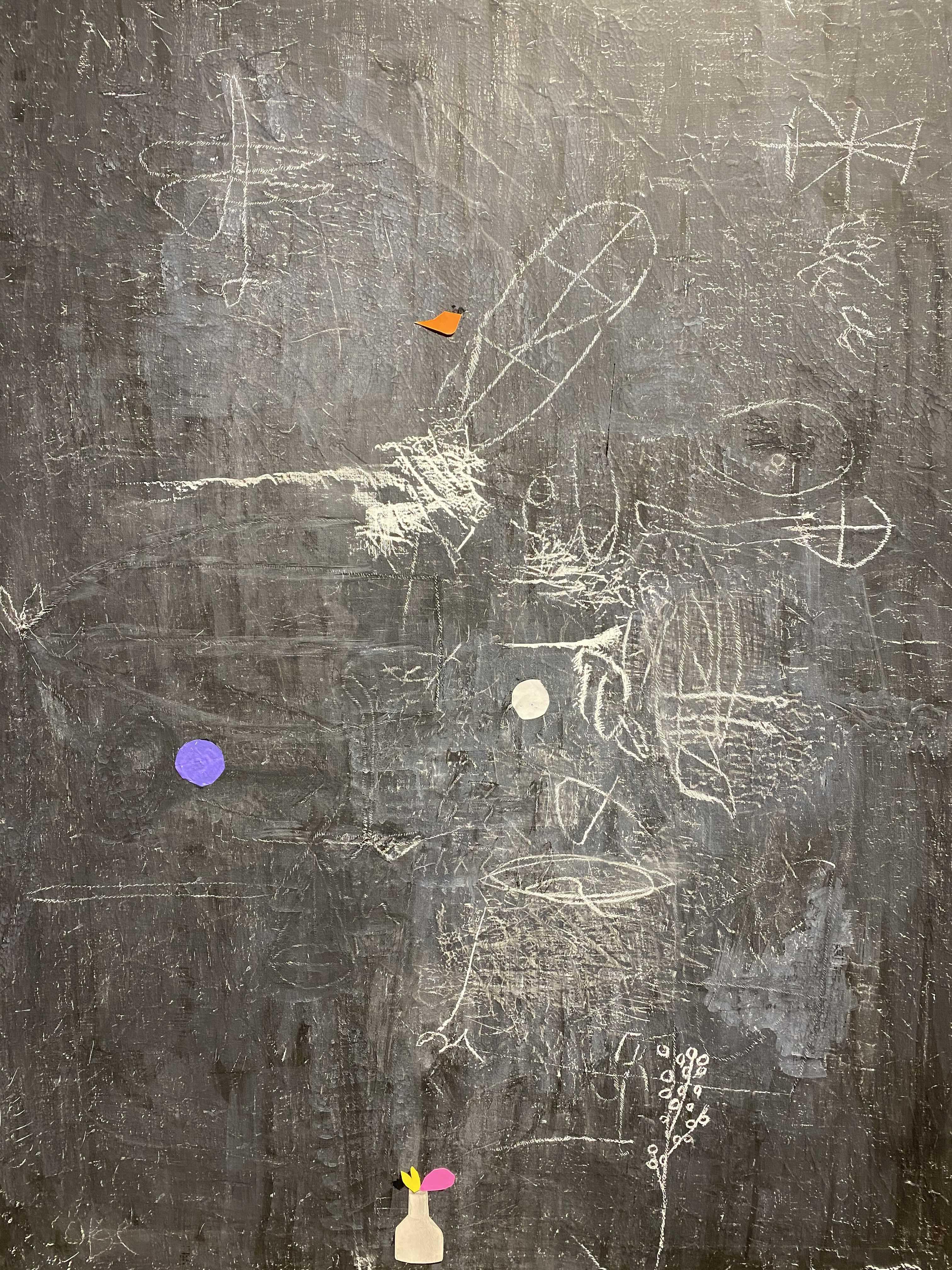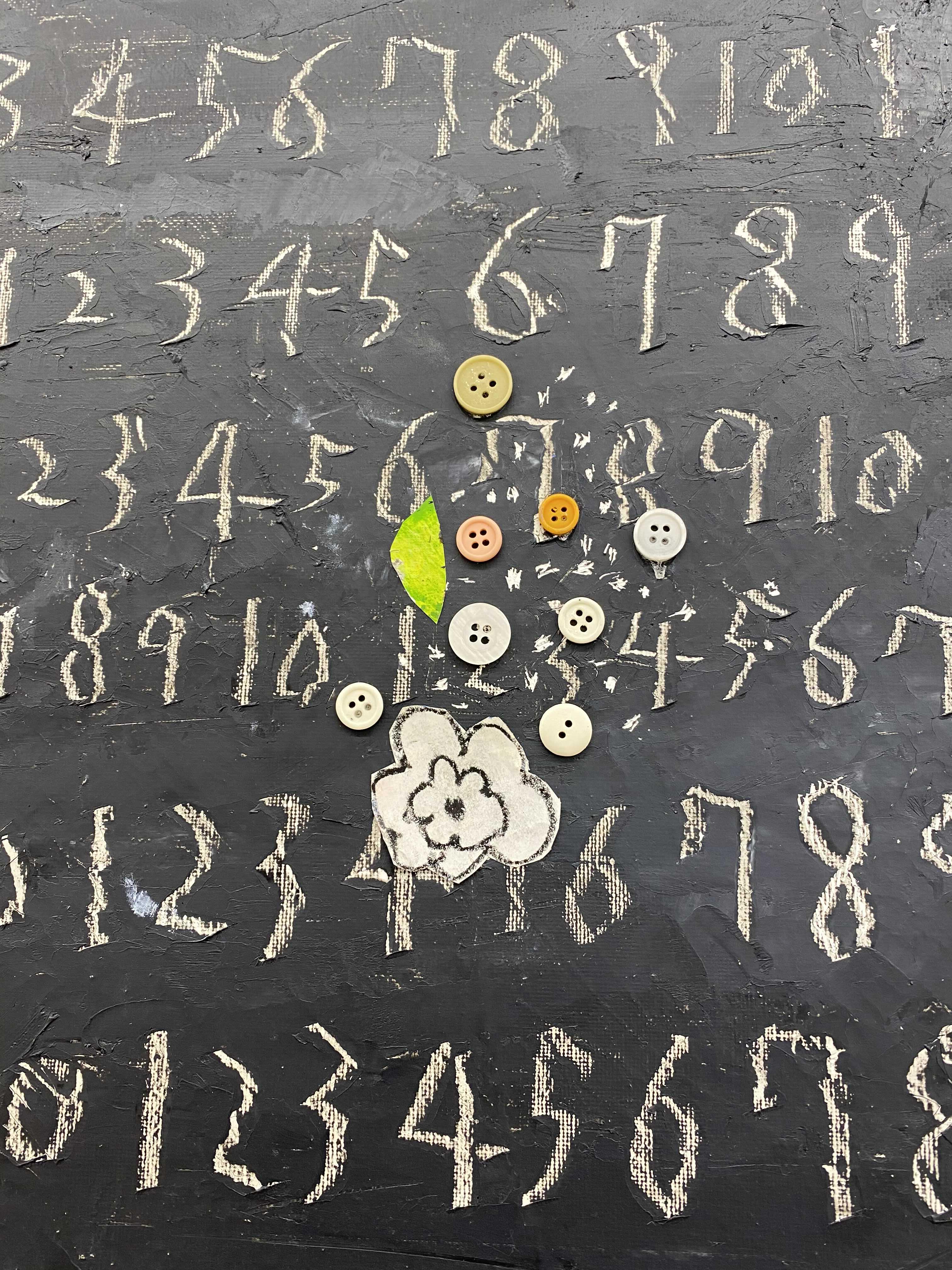 화면의 피부는 매우 납작하지만, 그 위로 물감과 사물이 생명체처럼 서식한다. 다양한 작가만의 표식들이 풀이나 돌처럼 흩어져있다. 그것들이 희한하게 어우러져 매혹적인 작품을 일군다. 그림과 콜라주, 오브제와 조각적 행위가 섞인 상태로, 낙서와 장난 같은 것들이 마음 가는 대로 표면에서 뒹군다. 우연성과 자발성에 기댄 이 조형적 행위는 연쇄적인 고리 안에서 순환한다. 숫자들은 연속적으로, 반복해서 적혀있고 그것 자체로 자족적인 독해될 수 없는 선, 기호들이 곳곳에 출몰한다. 그 사이로 꽃과 새 등의 형상을 거느린 콜라주가 얹혀있다. 그 주변에는 작은 일상의 사물들이 은밀하게, 조심스레 안착되었다. 그림과 콜라주, 오브제들은 표면 위에서 차이를 무화시키면서 공존한다. 이미 배경이 되는 바탕 화면 자체가 견고하고 풍부한 물성의 흔적, 아득한 시간과 풍화의 과정을 농밀하게 저장하면서 거의 조각에 가까운 오브제화된 피부를 회임하고 있기에 그 위에 올라간 모든 것들은 밑바닥에서 자연스레 베어 올라오는, 불가피하게 밀려나온 것으로 보인다. 표면과 분리되지 않는 그림이자 바탕을 지지대 삼아 그것과 내용적, 형식적 연관성의 공모관계를 부단히 조성하는, 일구어가는 그림이다.