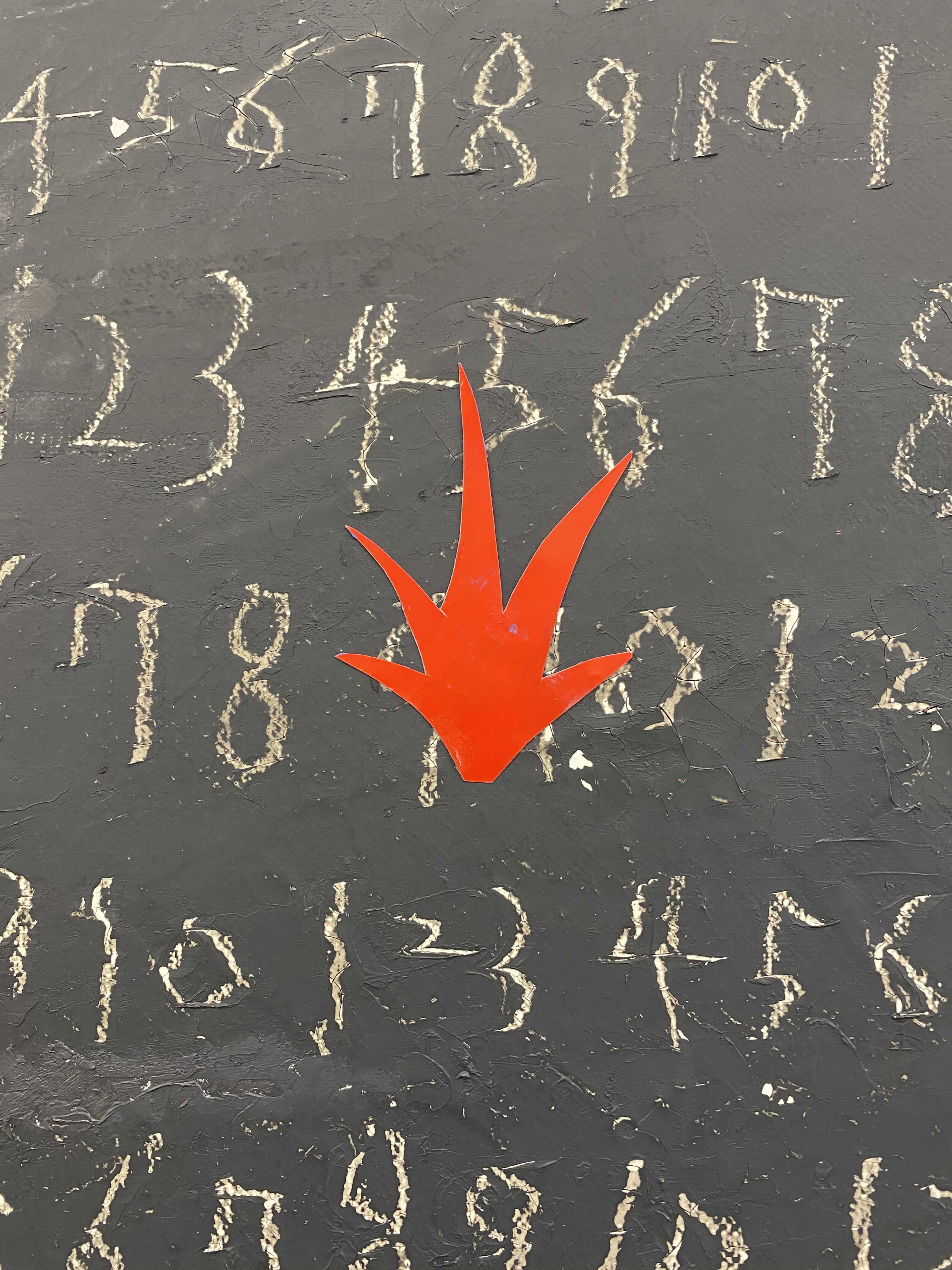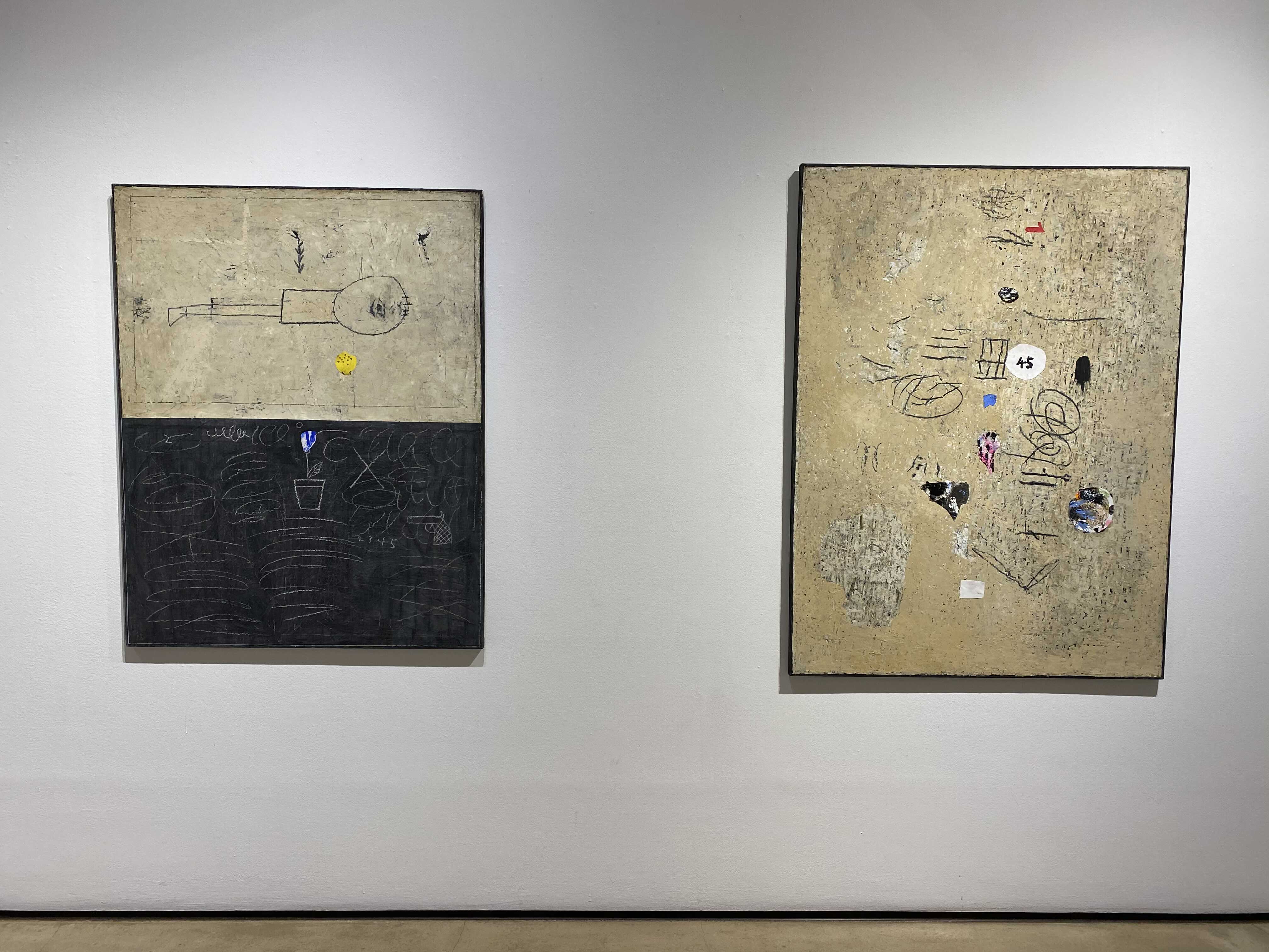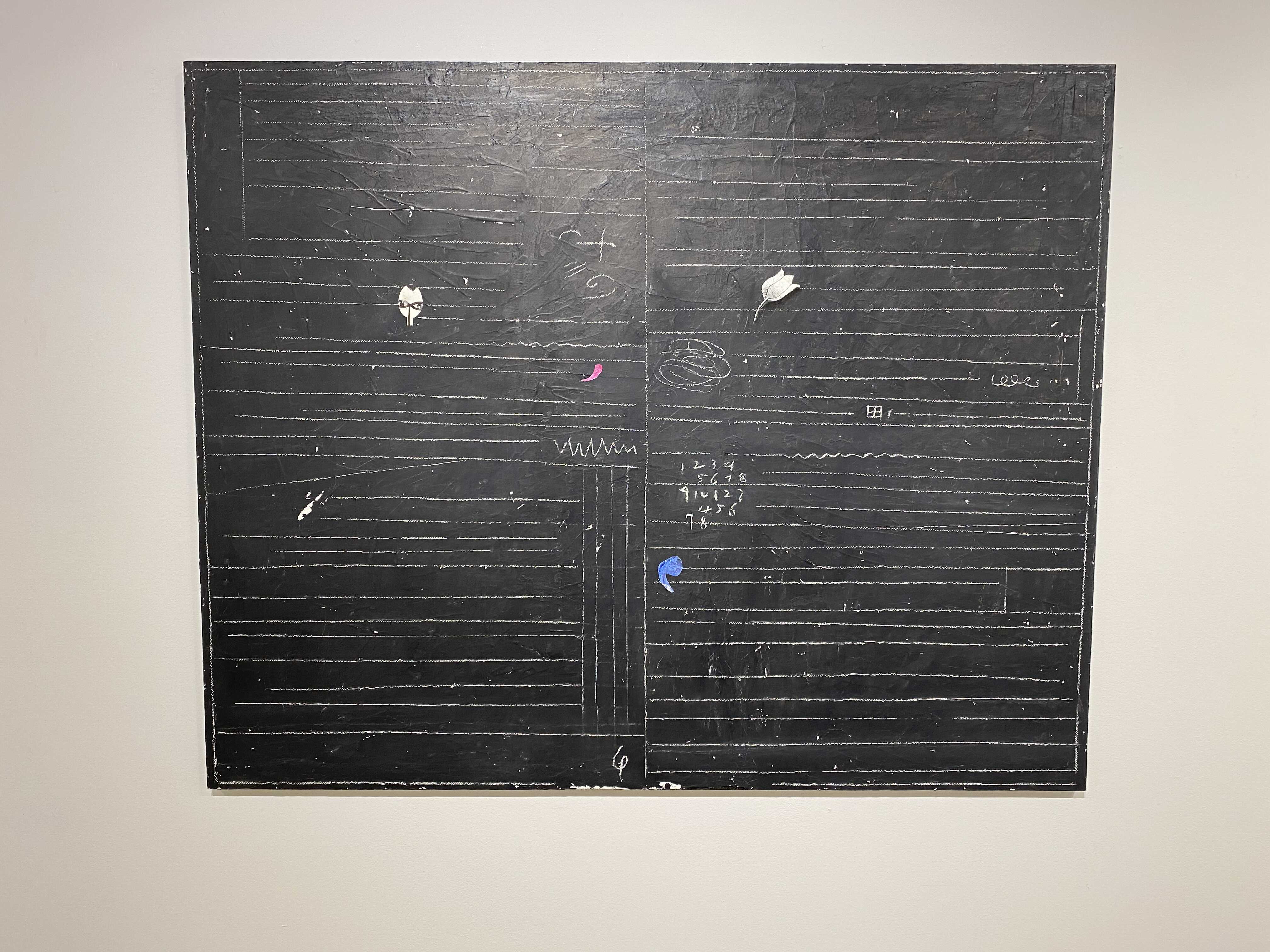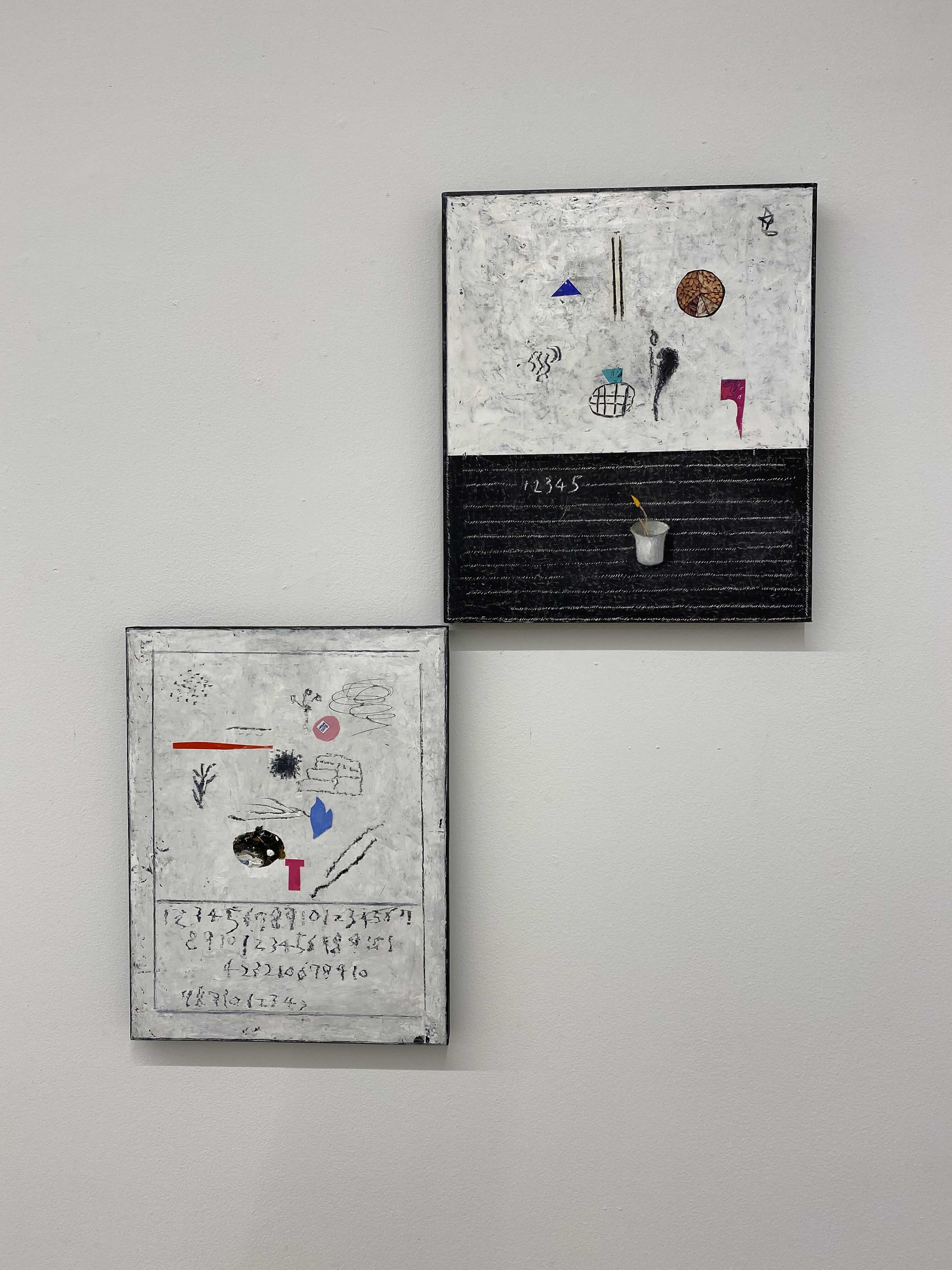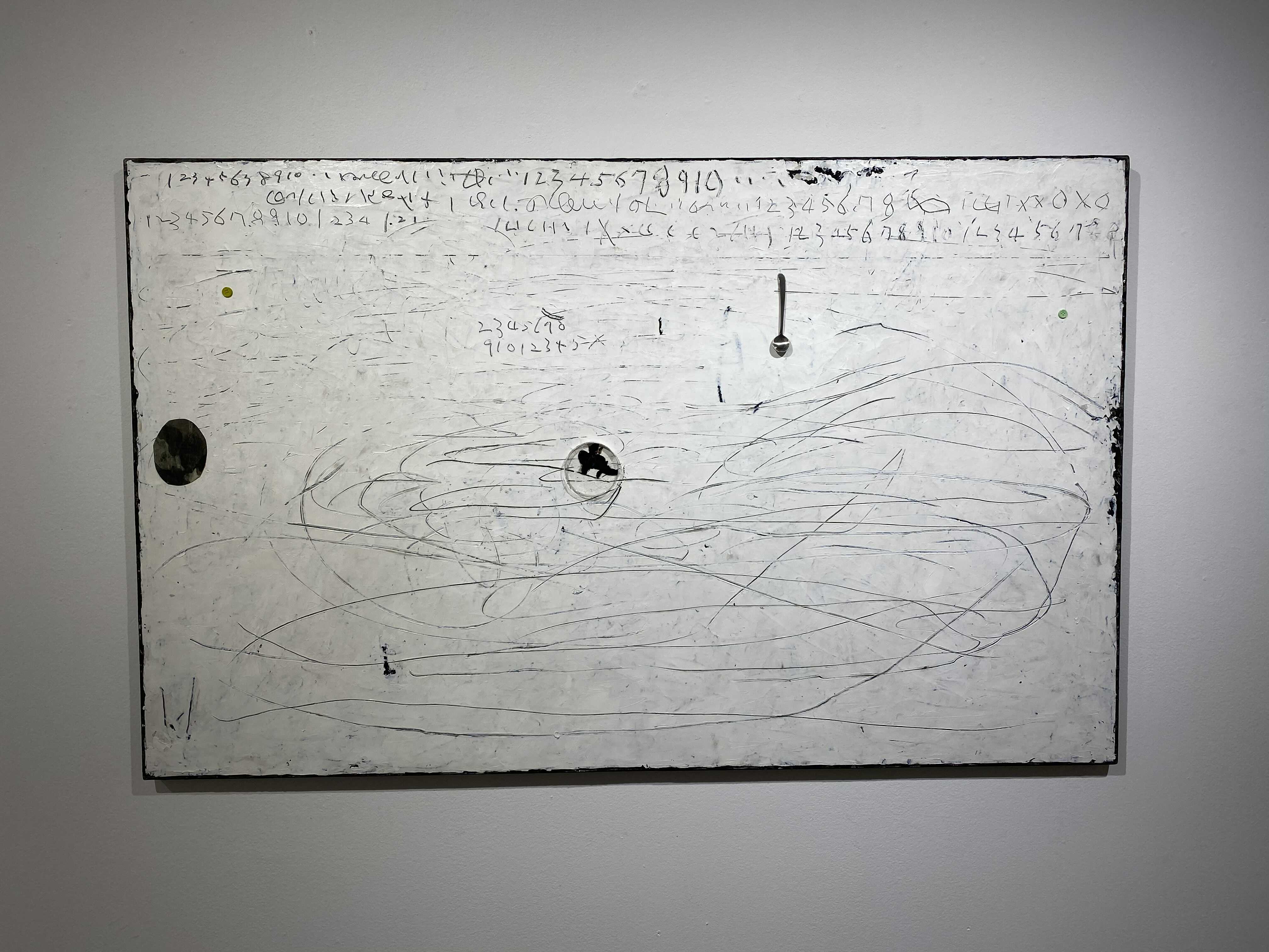 화면의 피부는 매우 납작하지만, 그 위로 물감과 사물이 생명체처럼 서식한다. 다양한 작가만의 표식들이 풀이나 돌처럼 흩어져있다. 그것들이 희한하게 어우러져 매혹적인 작품을 일군다. 그림과 콜라주, 오브제와 조각적 행위가 섞인 상태로, 낙서와 장난 같은 것들이 마음 가는 대로 표면에서 뒹군다. 우연성과 자발성에 기댄 이 조형적 행위는 연쇄적인 고리 안에서 순환한다. 숫자들은 연속적으로, 반복해서 적혀있고 그것 자체로 자족적인 독해될 수 없는 선, 기호들이 곳곳에 출몰한다. 그 사이로 꽃과 새 등의 형상을 거느린 콜라주가 얹혀있다. 그 주변에는 작은 일상의 사물들이 은밀하게, 조심스레 안착되었다. 그림과 콜라주, 오브제들은 표면 위에서 차이를 무화시키면서 공존한다. 이미 배경이 되는 바탕 화면 자체가 견고하고 풍부한 물성의 흔적, 아득한 시간과 풍화의 과정을 농밀하게 저장하면서 거의 조각에 가까운 오브제화된 피부를 회임하고 있기에 그 위에 올라간 모든 것들은 밑바닥에서 자연스레 베어 올라오는, 불가피하게 밀려나온 것으로 보인다. 표면과 분리되지 않는 그림이자 바탕을 지지대 삼아 그것과 내용적, 형식적 연관성의 공모관계를 부단히 조성하는, 일구어가는 그림이다.