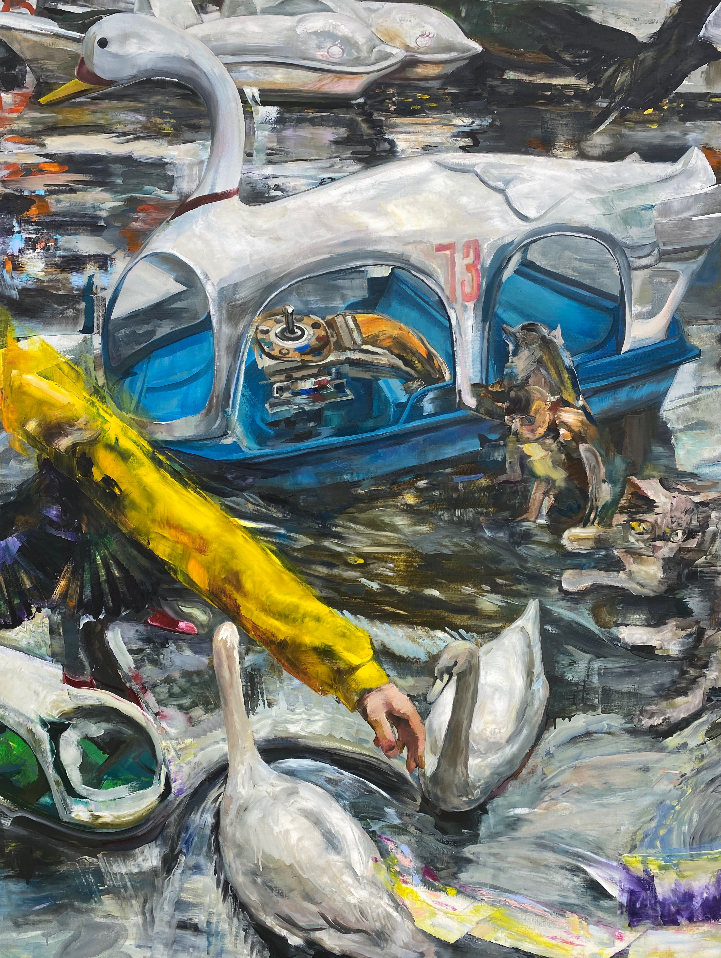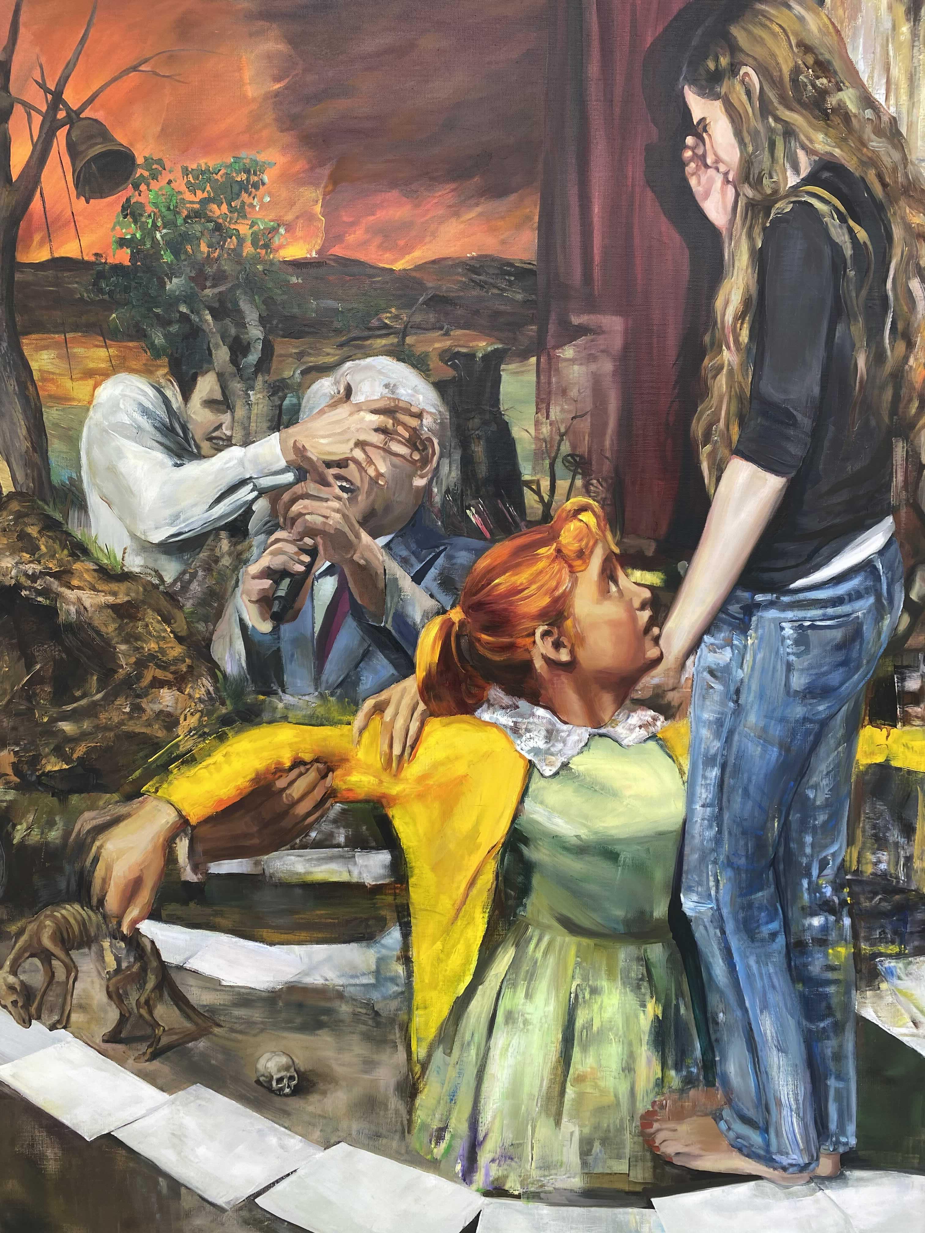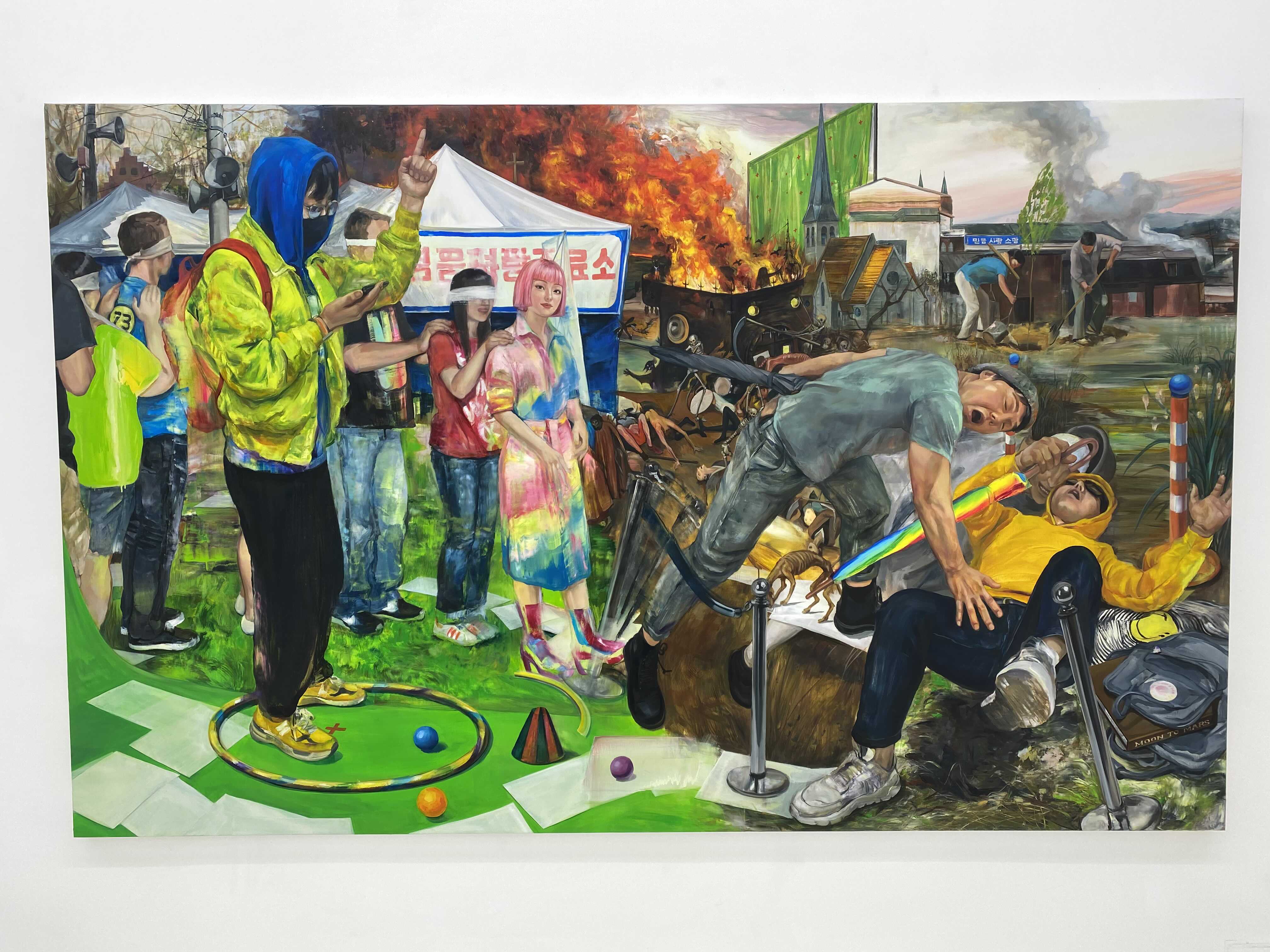 이채은의 작품는 자신이 살고 경험하며 노출되어 있는 동시대 사회적 현상과 구성원들 간의 역학 관계의 회화적 반영에서 출발합니다. 작가는 창작의 영역에서 즉흥성이 가지는 놀라운 효과를 최대한 훼손하지 않는 선에서 사전에 화면을 세심하게 구획하고 대상을 위치시킵니다. 문학에서 르포르타쥬가 어떠한 사건에 대해서 필자의 배경 지식과 식견이 팩트와 함께 어우러져 기술되는 장르라면, 이채은은 회화의 영역에서 이와 유사한 효과를 자아내고 있습니다. 현란한 화면 구성에 현혹되지 않고 찬찬히 살펴본다면 작가가 애초에 염두에 두었던 스포트라이트는 몇몇 지점에 고정되어 있으며, 거기에 내러티브들이 도사리고 있음을 알아챌 수 있습니다.