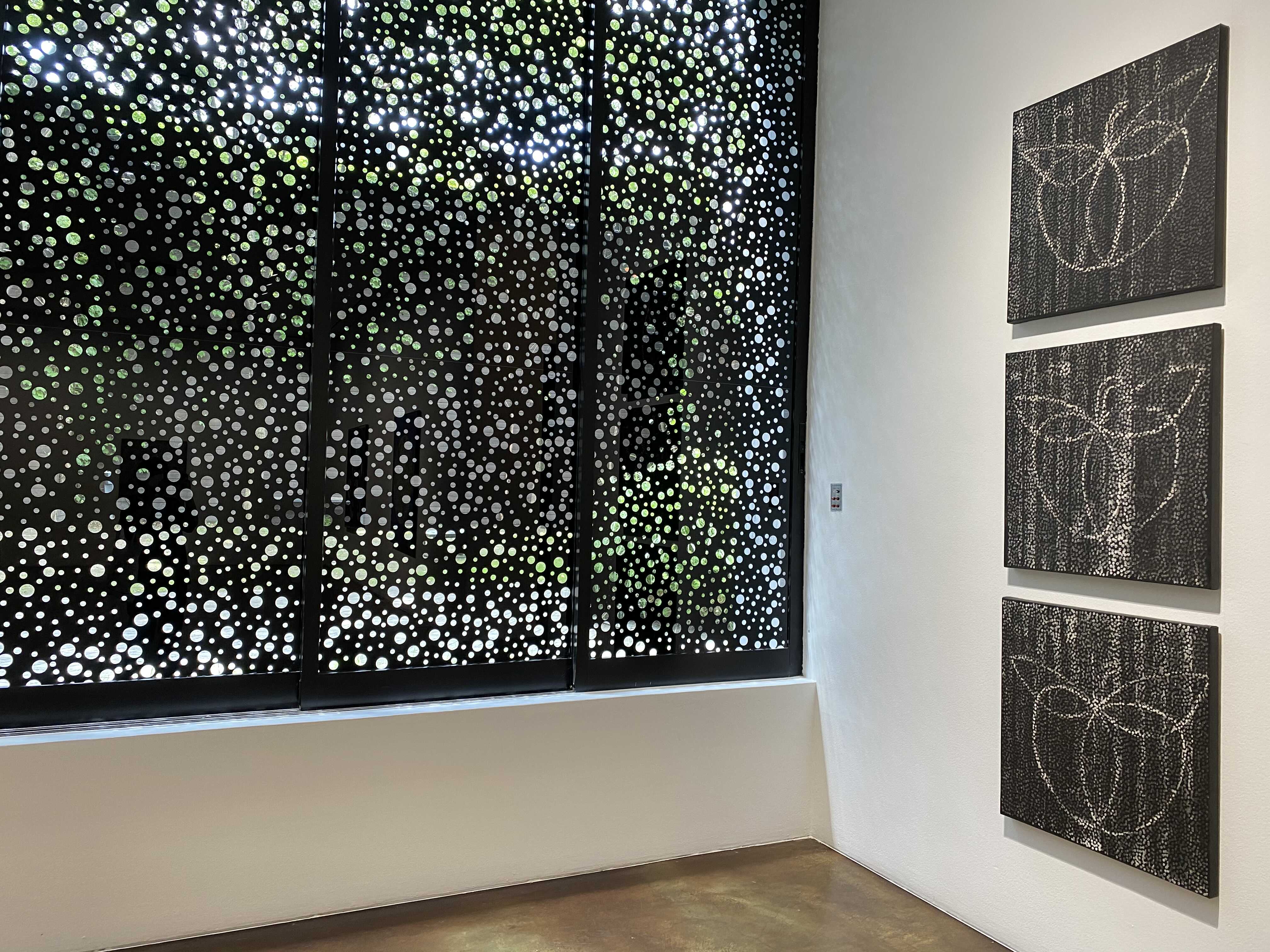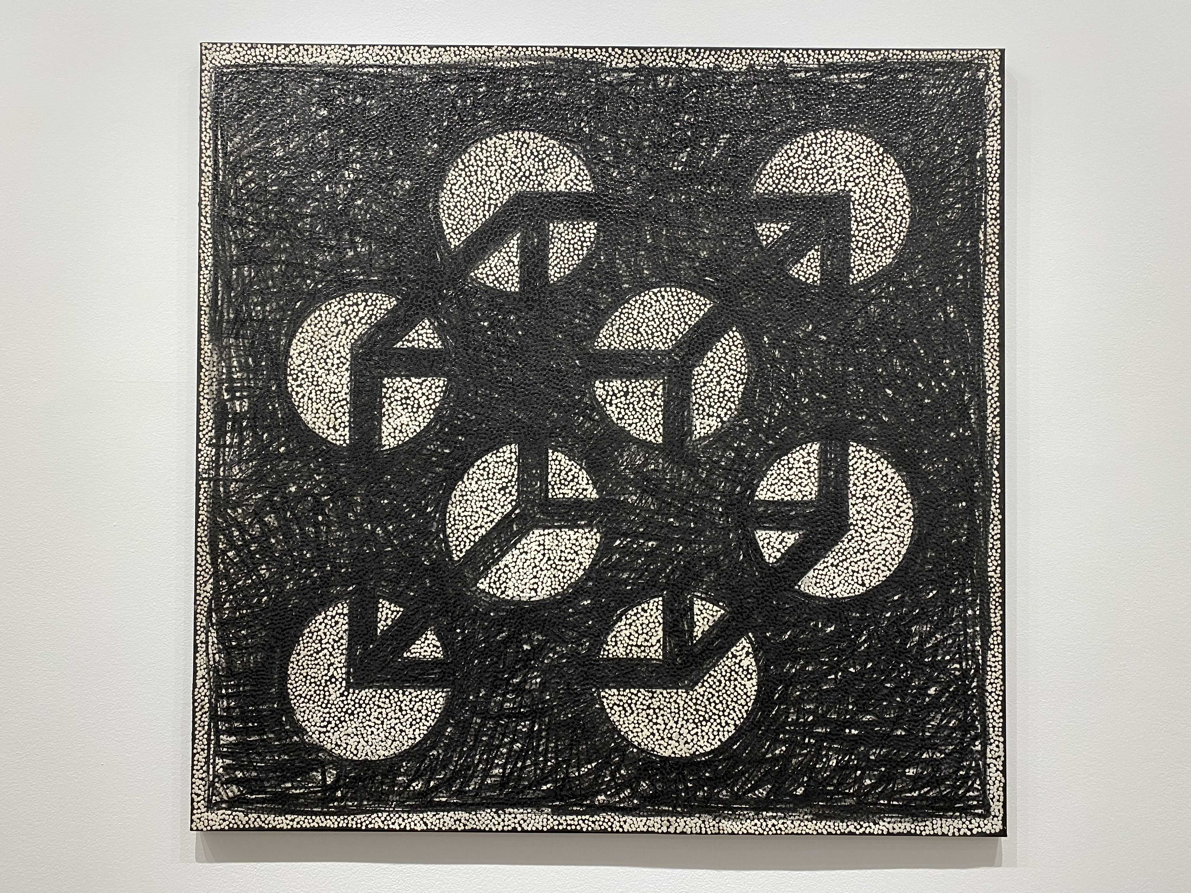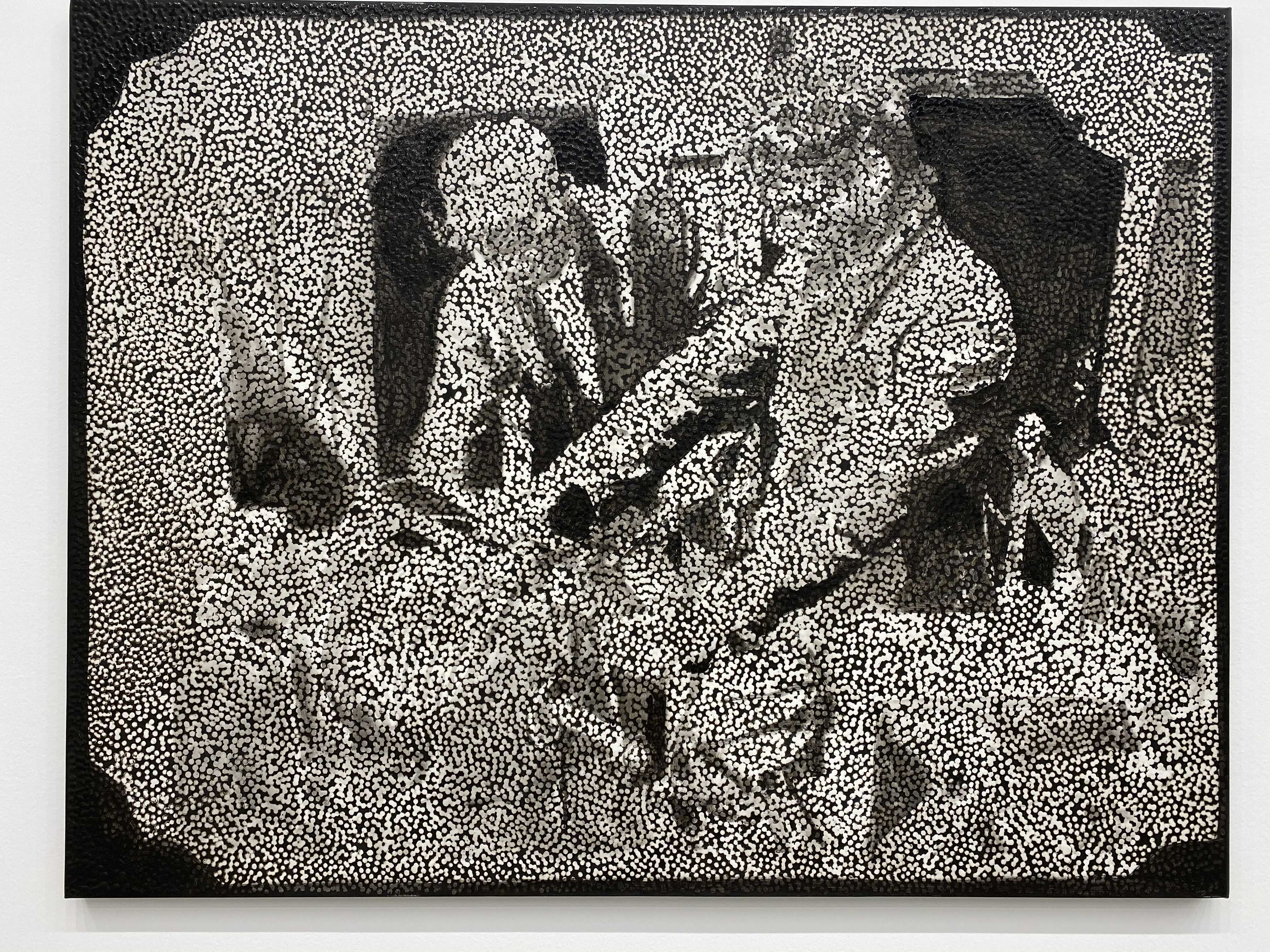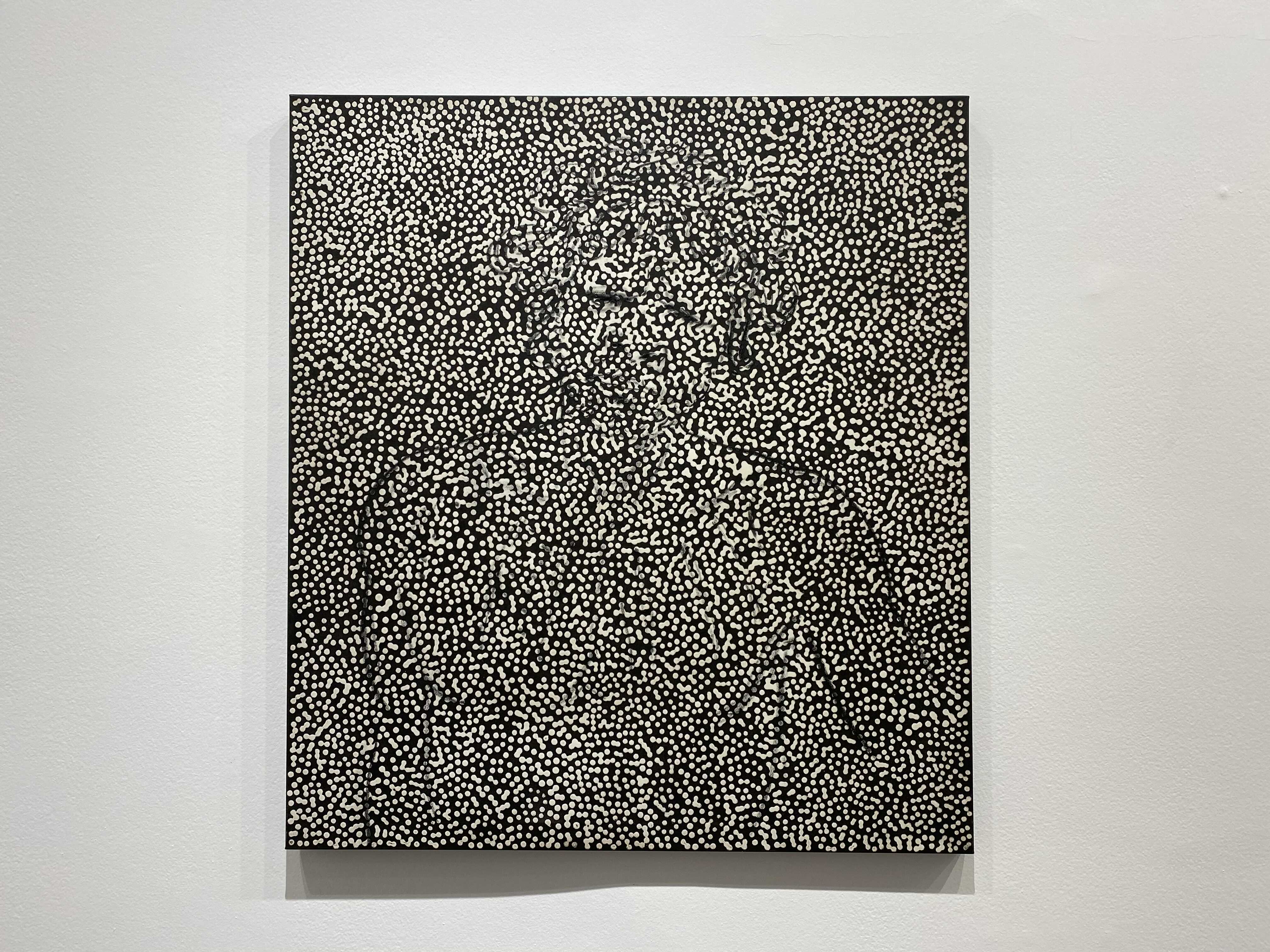 다니엘 보이드의 회화작품을 구성하고 있는, 볼록하고 투명한 풀(glue)로 찍은 점들은 우리가 세상을 바라보는 ‘렌즈’를 재현하는데요. 작가는 “이 렌즈는 우리가 하나의 집단으로서 세상을 이해하고 지각하는 방식, 즉 복수성(plurality)과 다양성(multiplicity)을 나타낸다”고 설명합니다. 각각의 점은 흑과 백, 어둠과 빛 사이에 계산화 된 정보를 시각화해 전달하고, 점을 둘러싼 검고 불투명한 부분은 기억이 소실된 역사적 경험을 자각하고자 하는 노력을 내포하고 있다. 작가가 의도한 양과 음 사이의 영역, 정보와 비정보를 적극적으로 연결해 작품을 이해하며, 과거와 현재 사이의 시점을 재조율하게 됩니다.