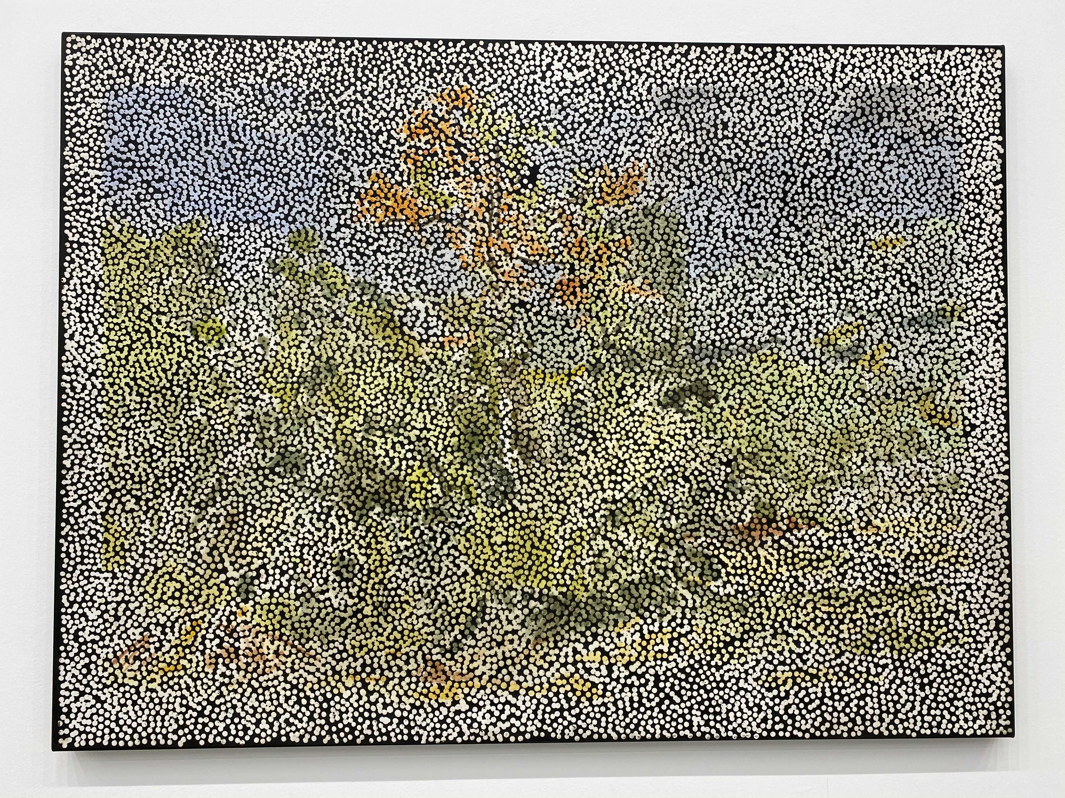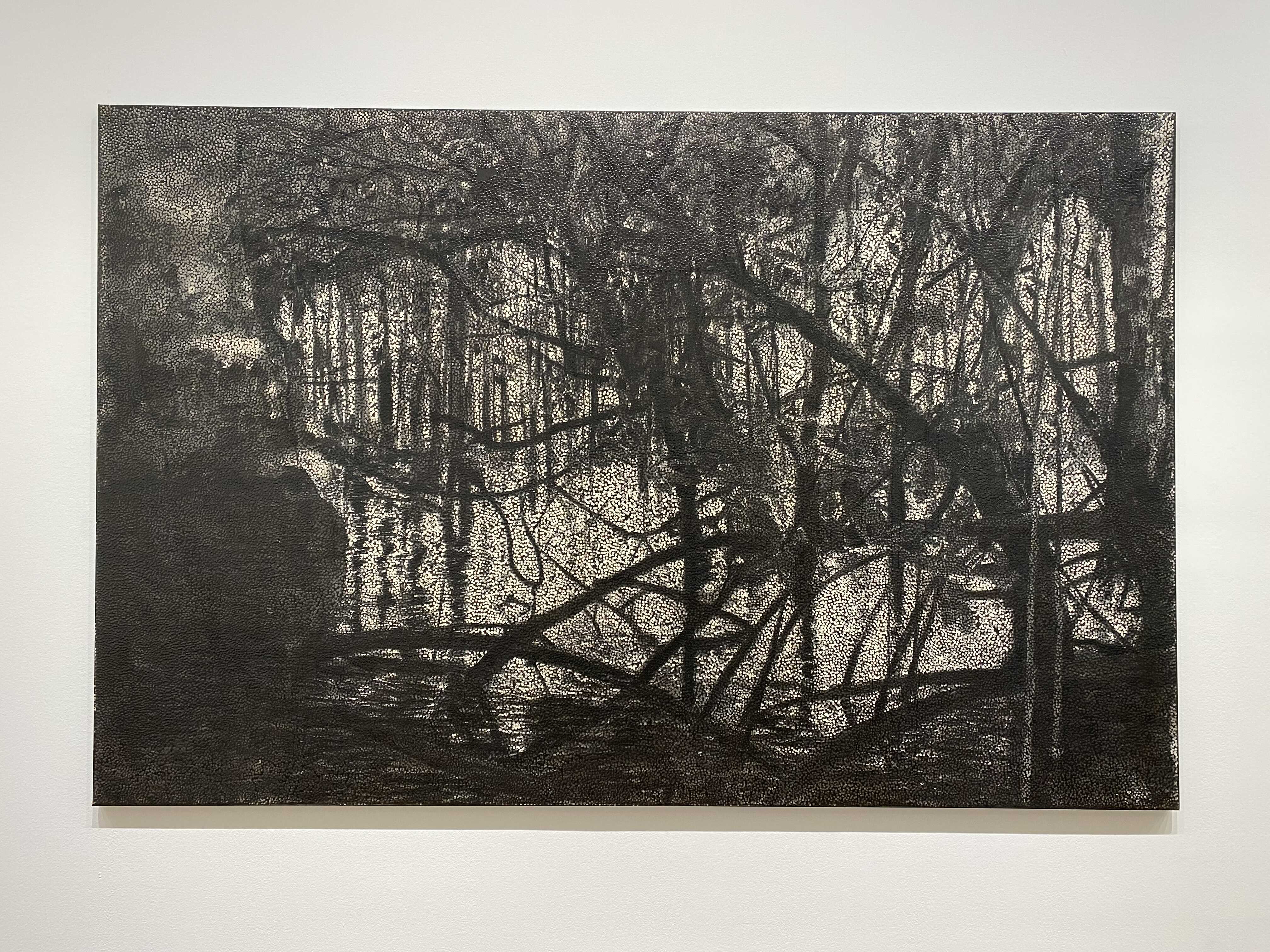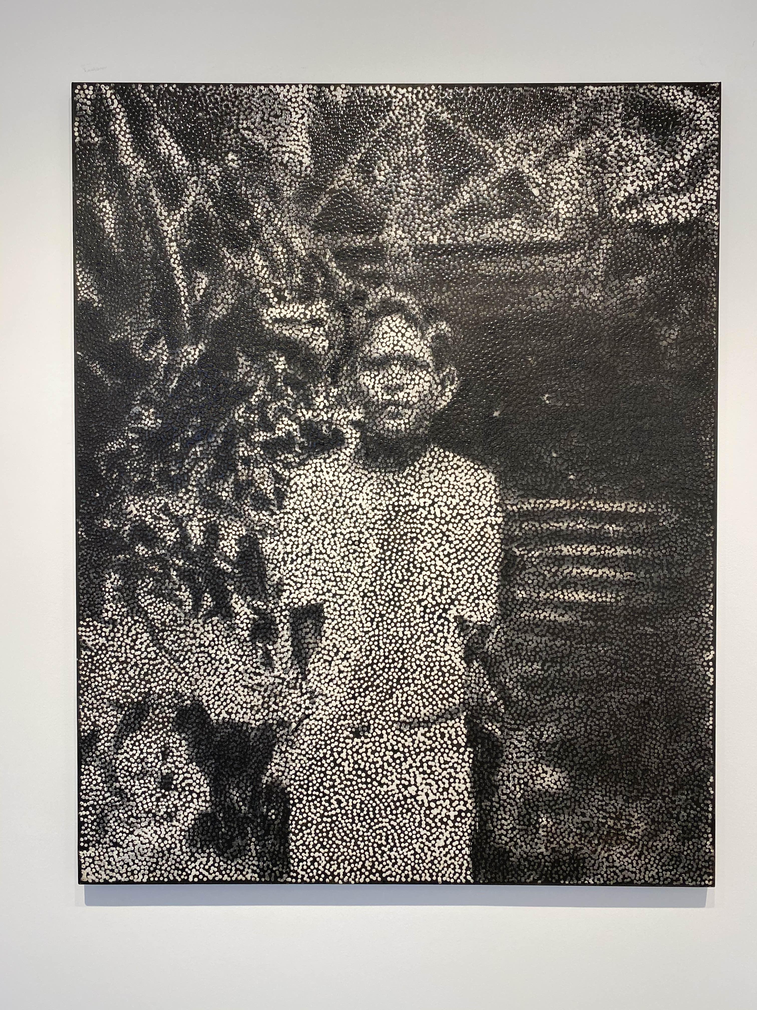 다니엘 보이드의 회화작품을 구성하고 있는, 볼록하고 투명한 풀(glue)로 찍은 점들은 우리가 세상을 바라보는 ‘렌즈’를 재현하는데요. 작가는 “이 렌즈는 우리가 하나의 집단으로서 세상을 이해하고 지각하는 방식, 즉 복수성(plurality)과 다양성(multiplicity)을 나타낸다”고 설명합니다. 각각의 점은 흑과 백, 어둠과 빛 사이에 계산화 된 정보를 시각화해 전달하고, 점을 둘러싼 검고 불투명한 부분은 기억이 소실된 역사적 경험을 자각하고자 하는 노력을 내포하고 있다. 작가가 의도한 양과 음 사이의 영역, 정보와 비정보를 적극적으로 연결해 작품을 이해하며, 과거와 현재 사이의 시점을 재조율하게 됩니다.