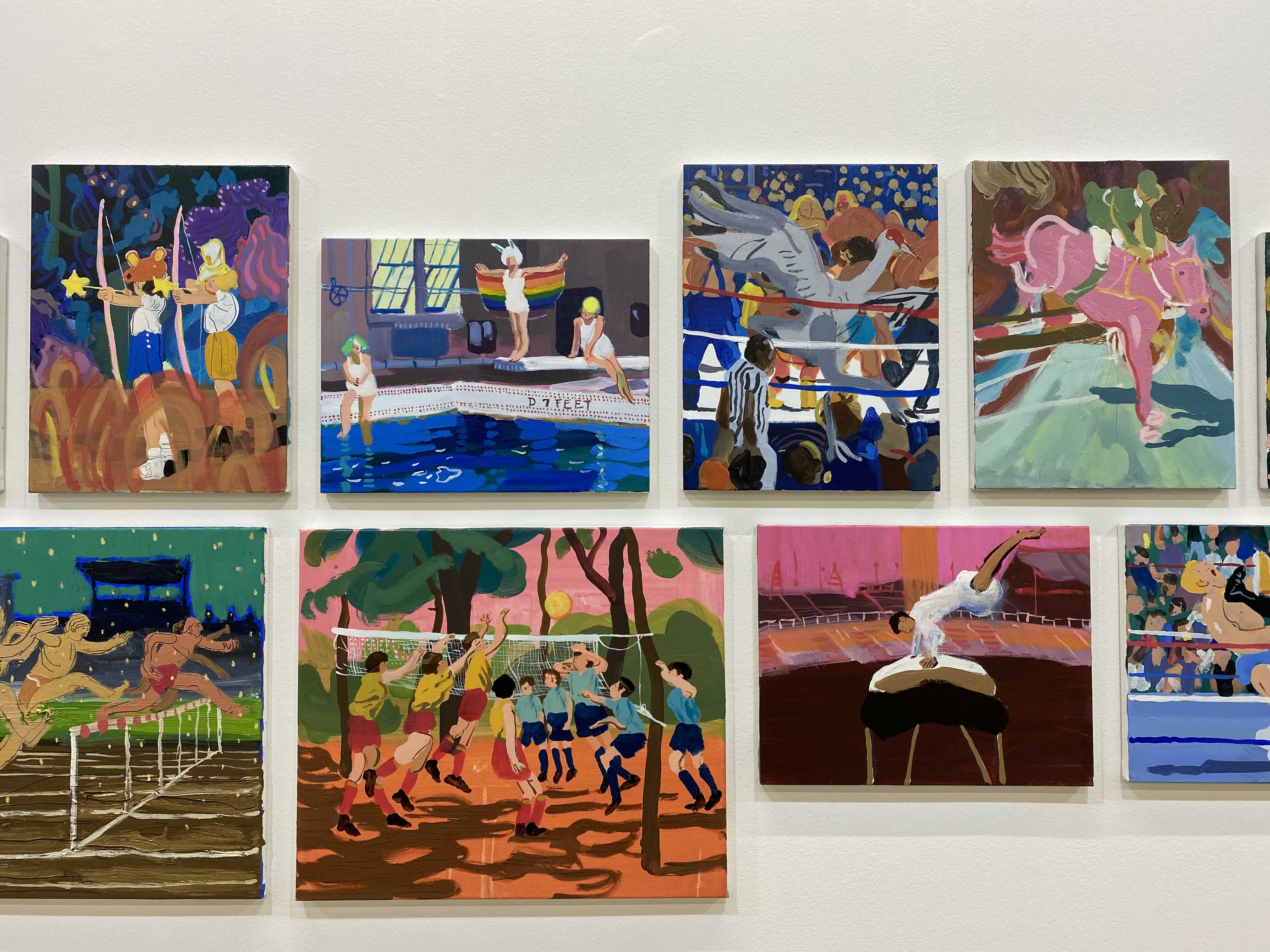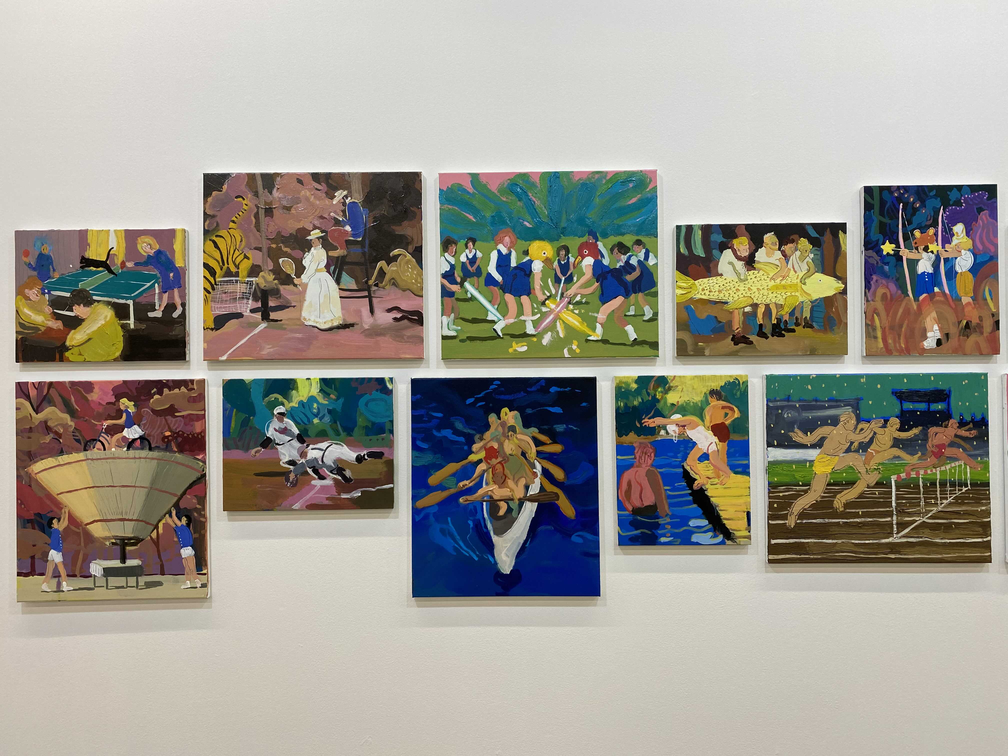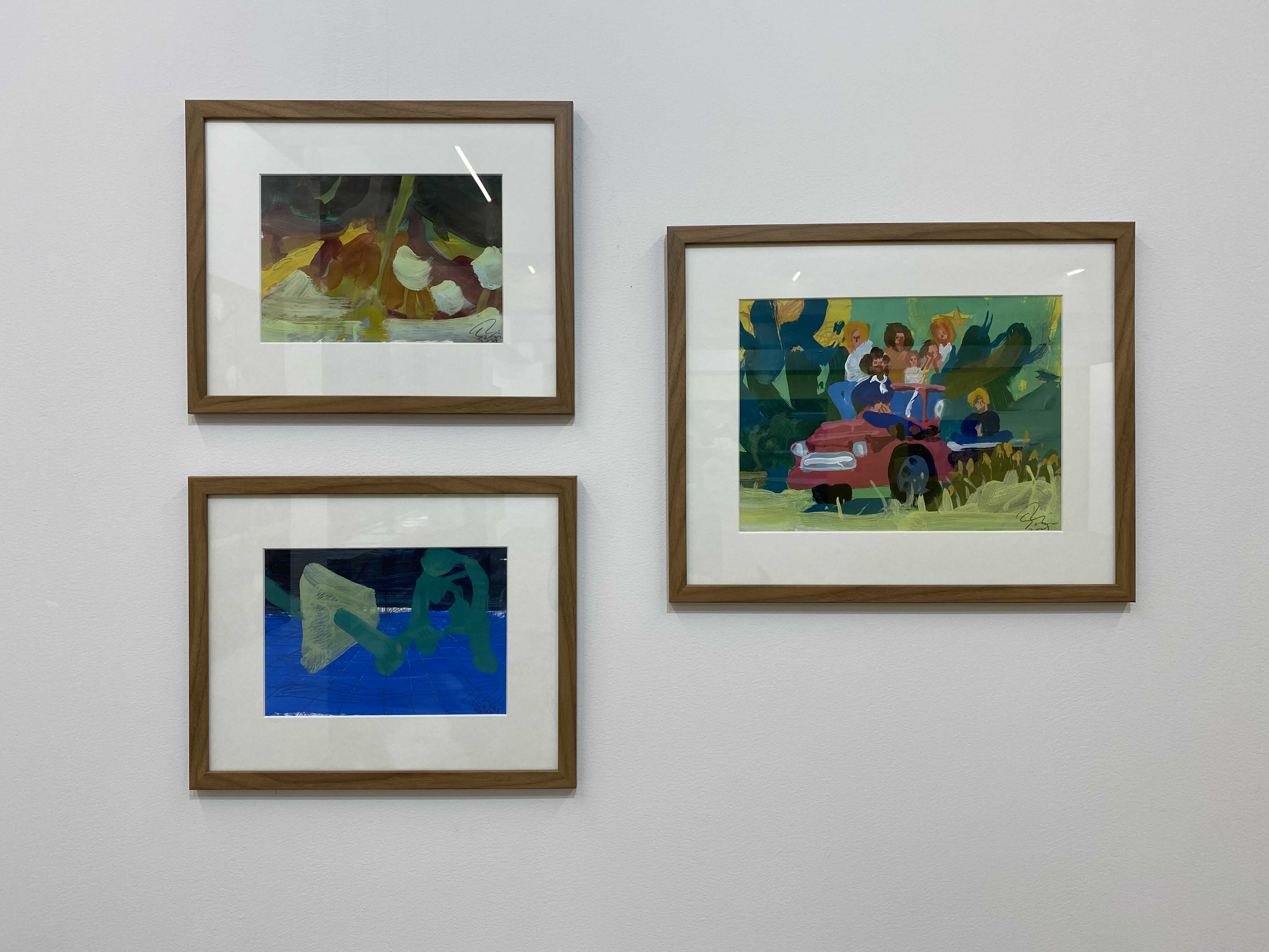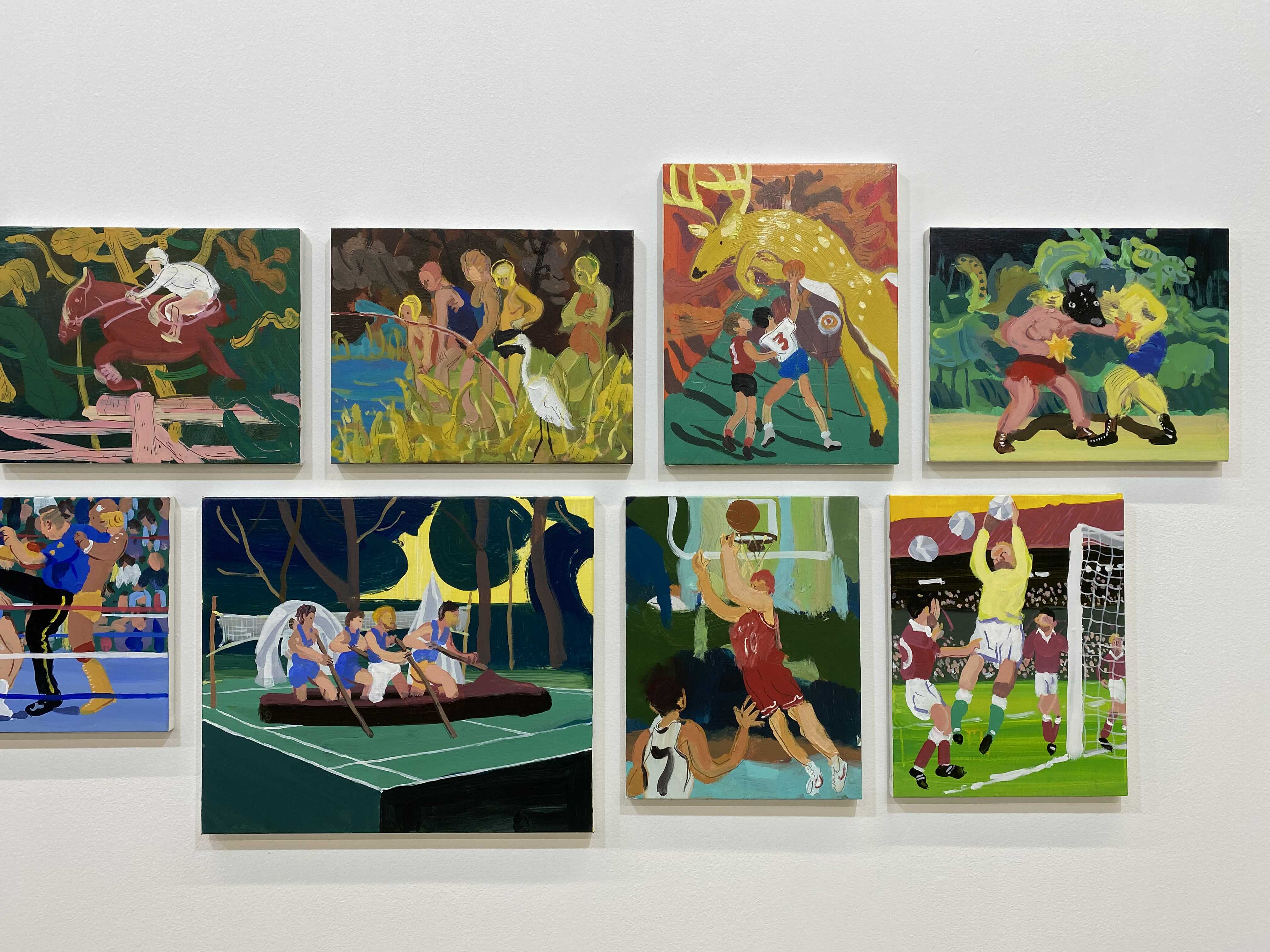 전시의 제목인 유벤투스는 청춘을 의미하는 라틴어입니다. 그림 속 운동하는 인물들이 얼마 전에 끝난 올림픽이 떠올랐습니다. 윤상윤 작가님은 오른손과 왼손을 구분하여 작업하는 작가입니다. 이번 전시에는 양손 사용을 시도한 그림들을 만나 볼 수 있습니다. 작가님의 오른손 작품도 또한 만날 수 있습니다. 왼손으로 글씨를 쓰는 것도 어려운데 그림을 그리는 것은 더욱 어려운 일입니다. 작가님에게 왼손으로 그린다는 행위는 우선 수고한 오른손에게 휴식과 일탈을 주고자 함이라고 합니다.