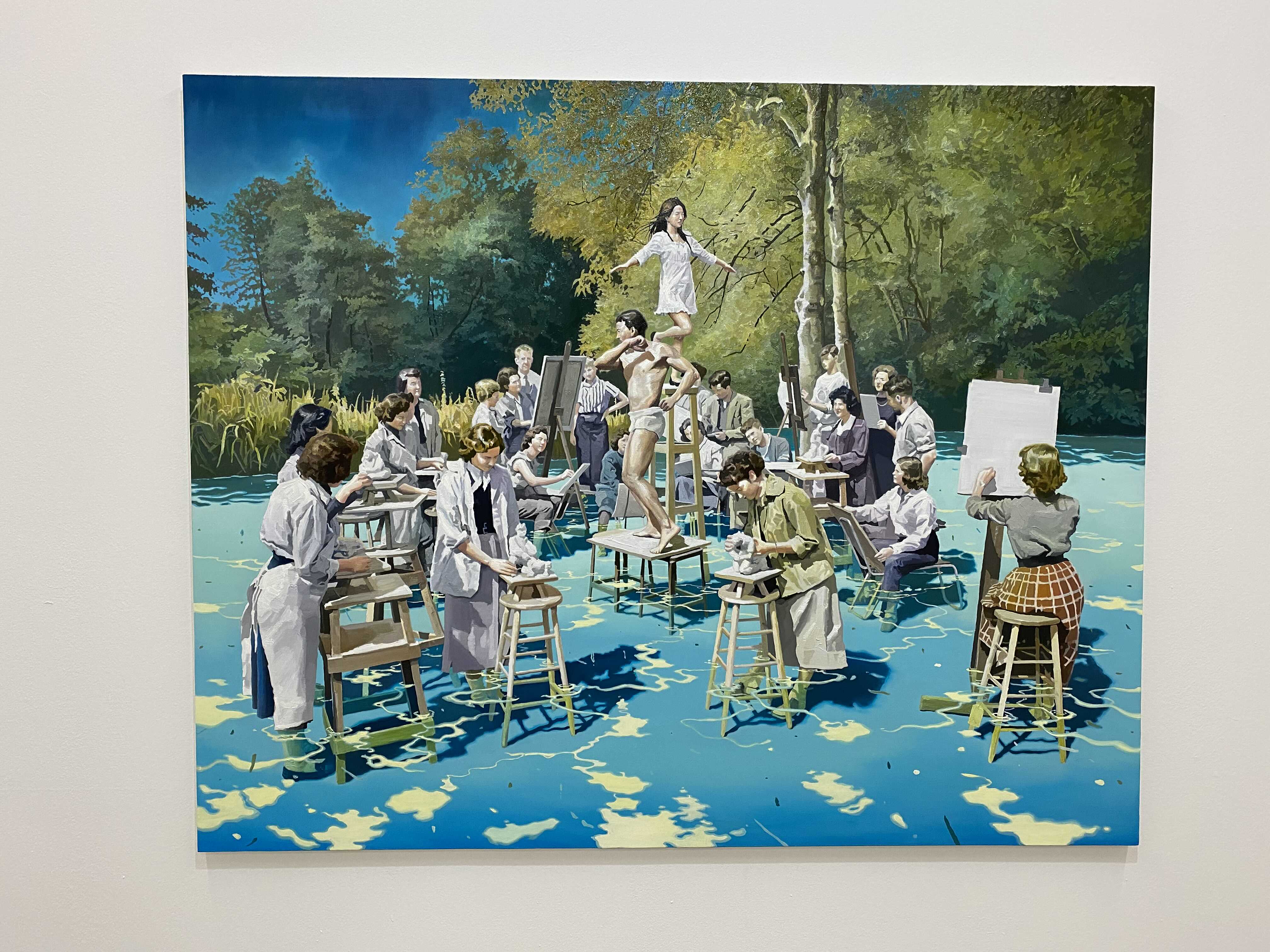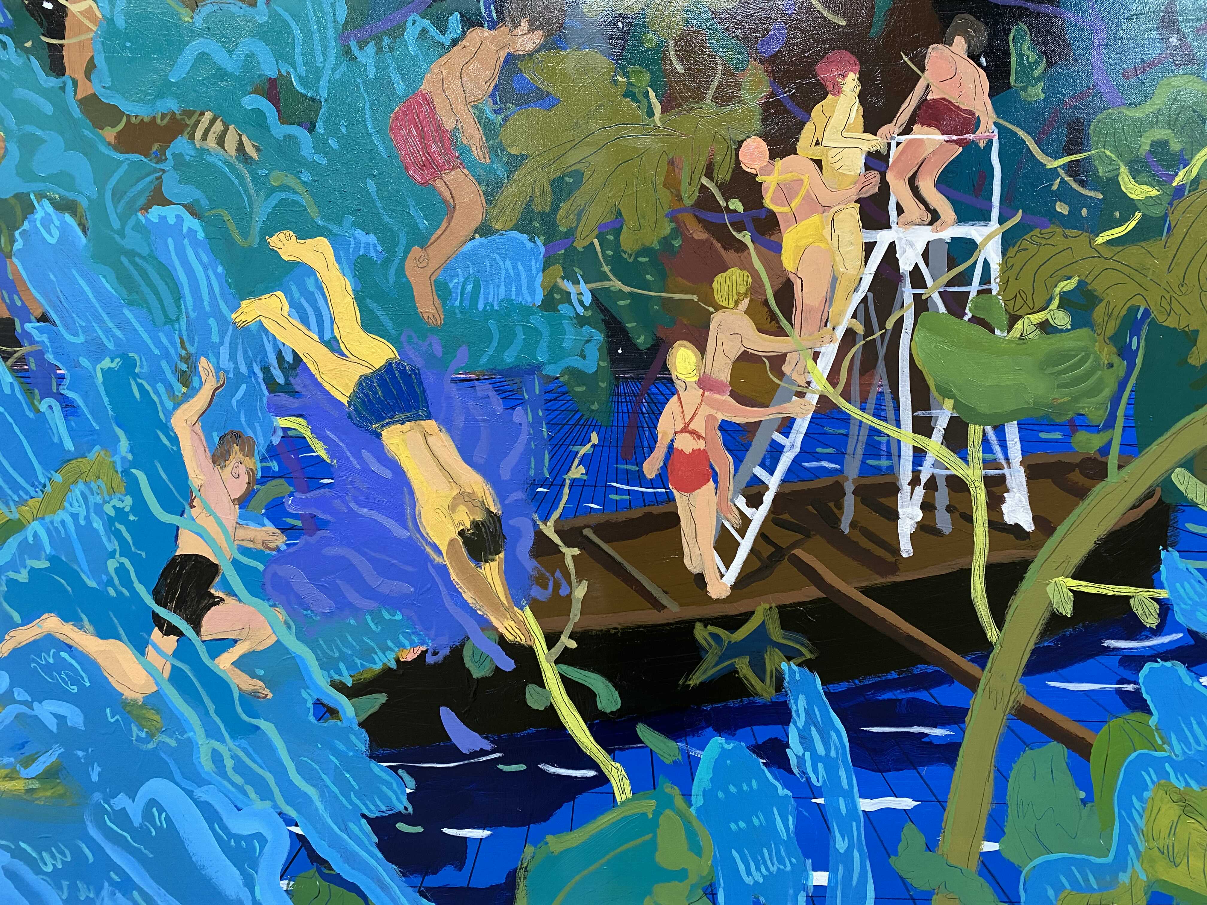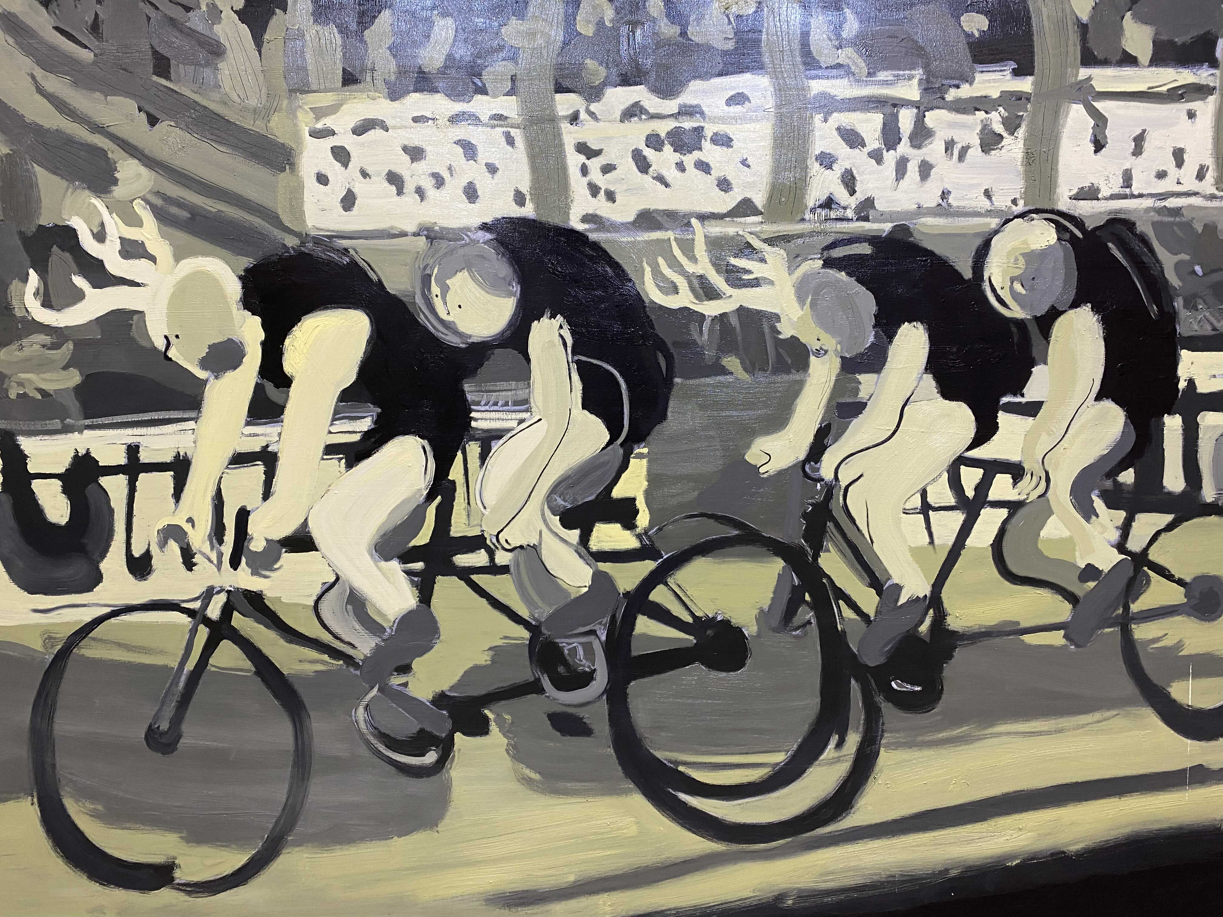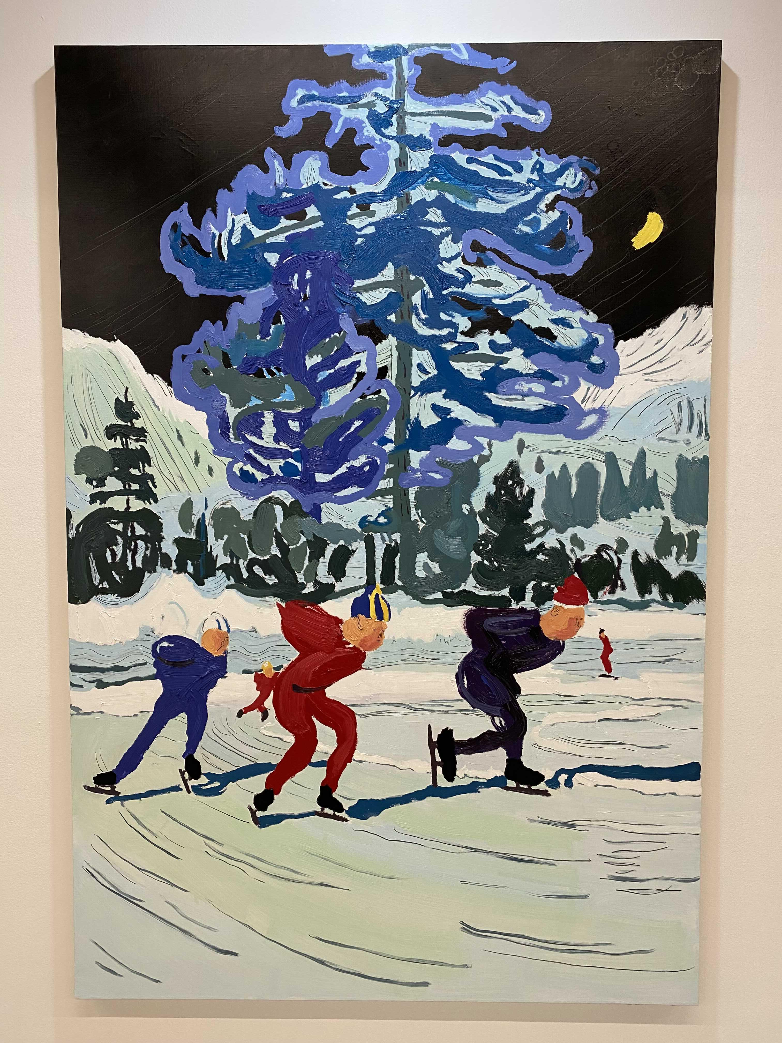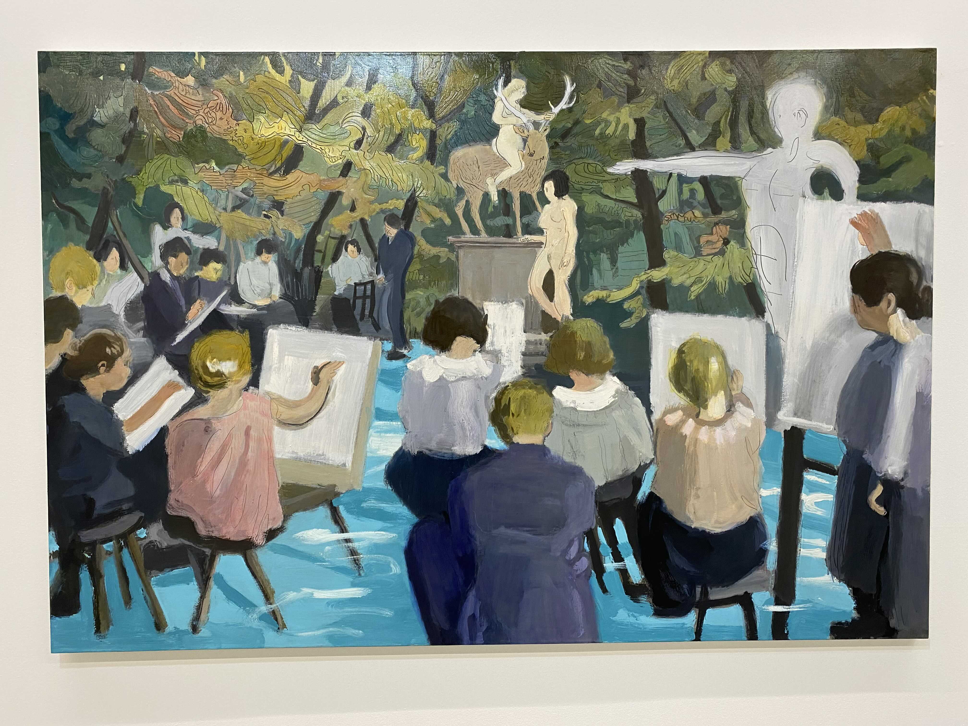 전시의 제목인 유벤투스는 청춘을 의미하는 라틴어입니다. 그림 속 운동하는 인물들이 얼마 전에 끝난 올림픽이 떠올랐습니다. 윤상윤 작가님은 오른손과 왼손을 구분하여 작업하는 작가입니다. 이번 전시에는 양손 사용을 시도한 그림들을 만나 볼 수 있습니다. 작가님의 오른손 작품도 또한 만날 수 있습니다. 왼손으로 글씨를 쓰는 것도 어려운데 그림을 그리는 것은 더욱 어려운 일입니다. 작가님에게 왼손으로 그린다는 행위는 우선 수고한 오른손에게 휴식과 일탈을 주고자 함이라고 합니다.