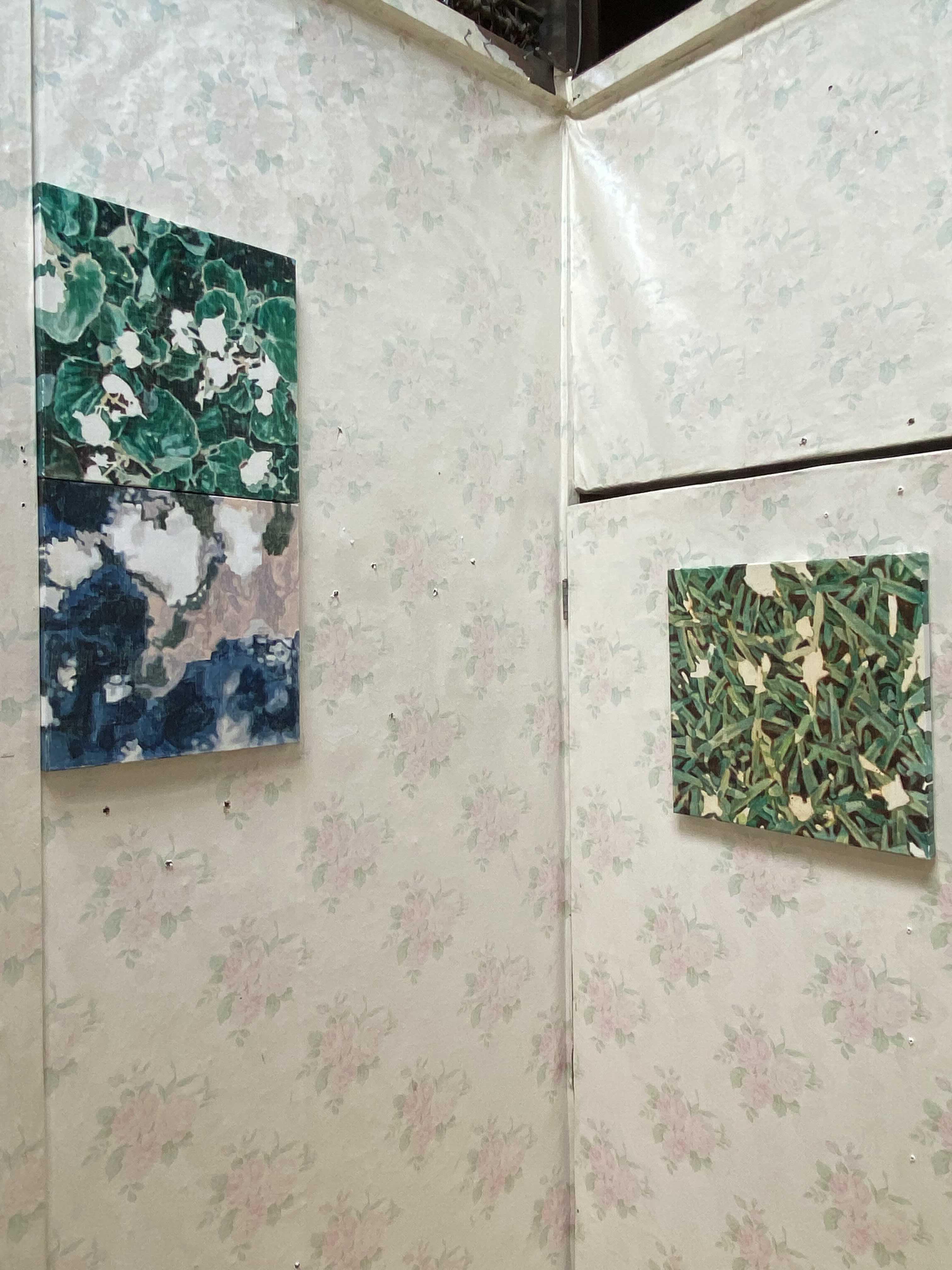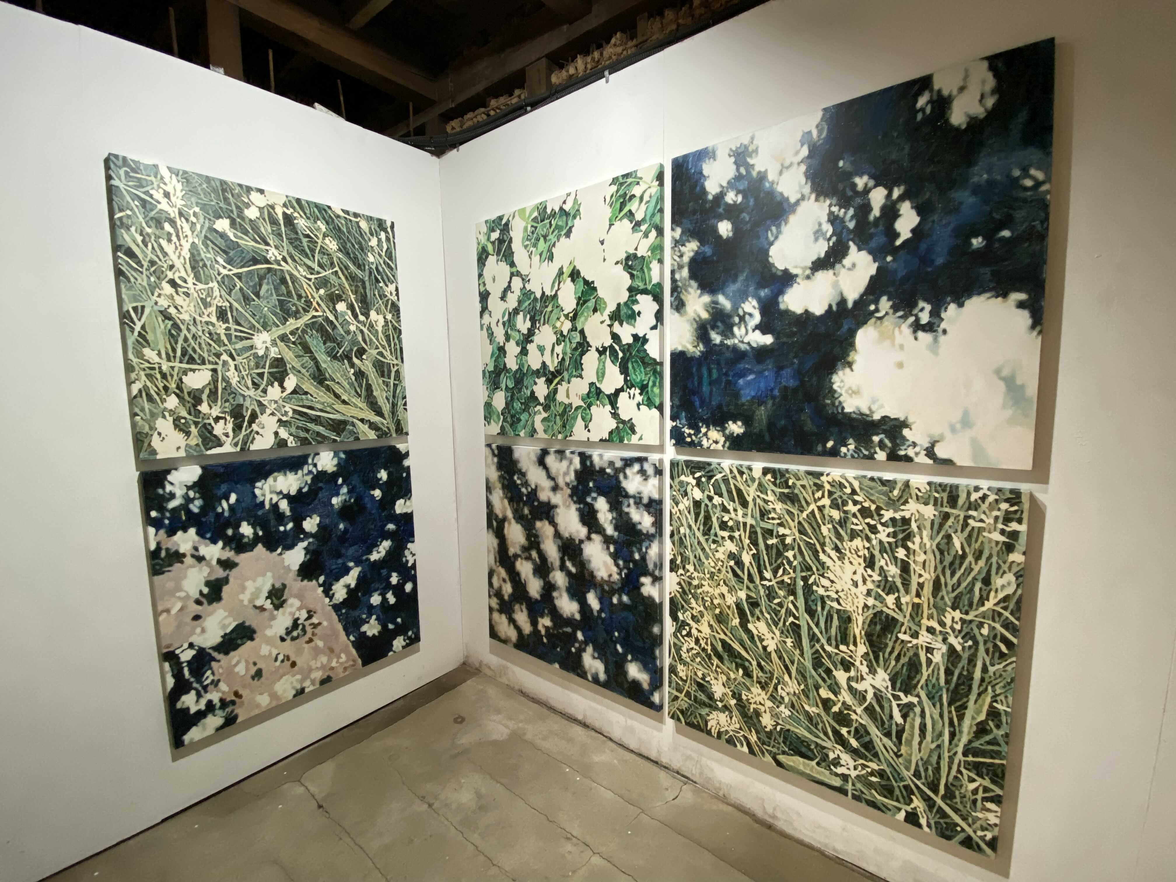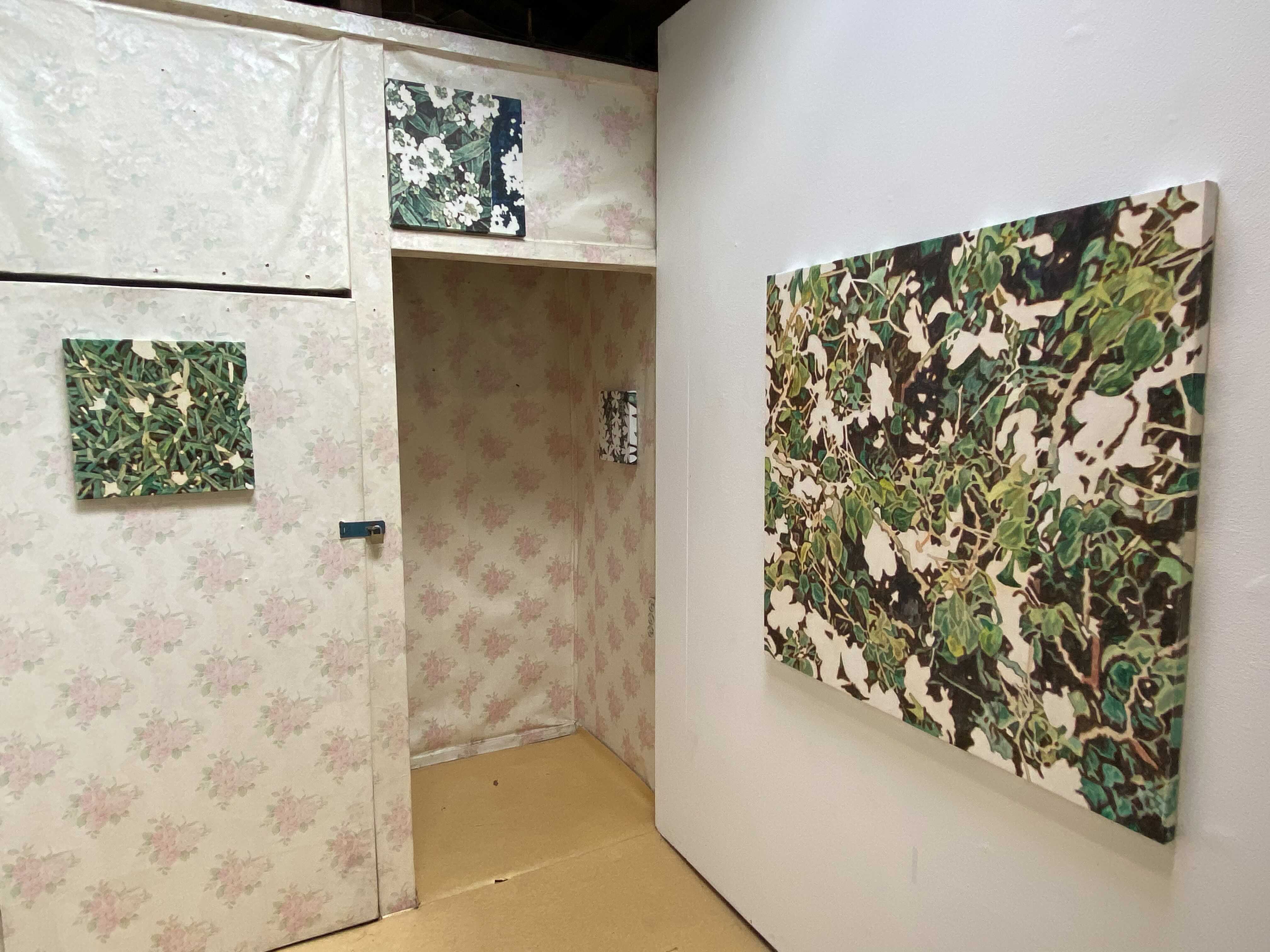 이번 전시 <고요한 소란>은 제목의 역설적 표현처럼 상충되지만 조형적으로 유사한 이미지를 조합한 회화 작품을 선보인다. 전시의 주요한 두 축이 되는 식물과 연기 이미지는 유연한 형태를 공유하며 조형적 리듬과 패턴을 형성하는 한편, 자연과 재해를 표상하며 일상과재난이 혼재한 시대의 불안과 모호함을 그려낸다. 나아가 지금 이곳에서 관객이 경험하는 현상적 감각과 장소적 특성을 포섭하며이미지의 연속성과 확장 가능성을 실험한다.