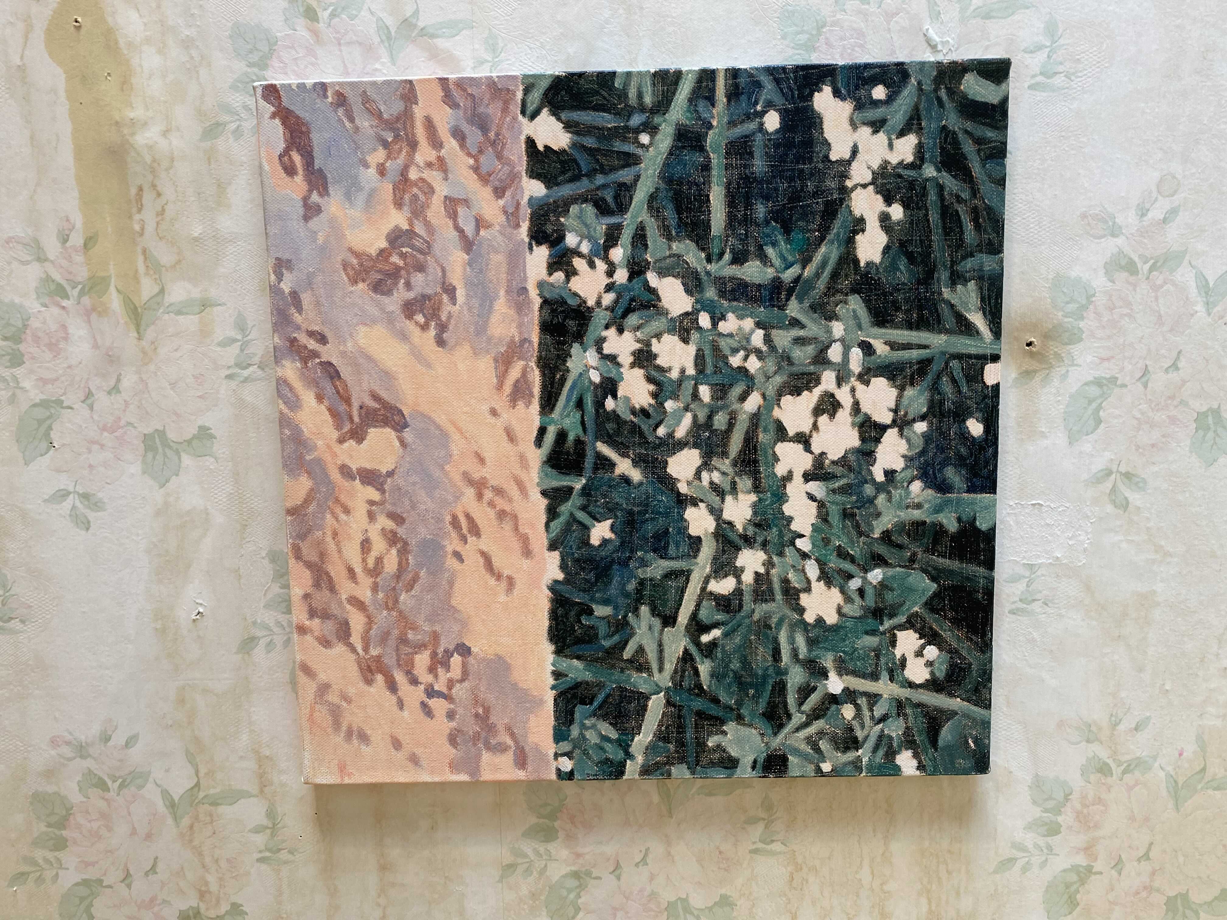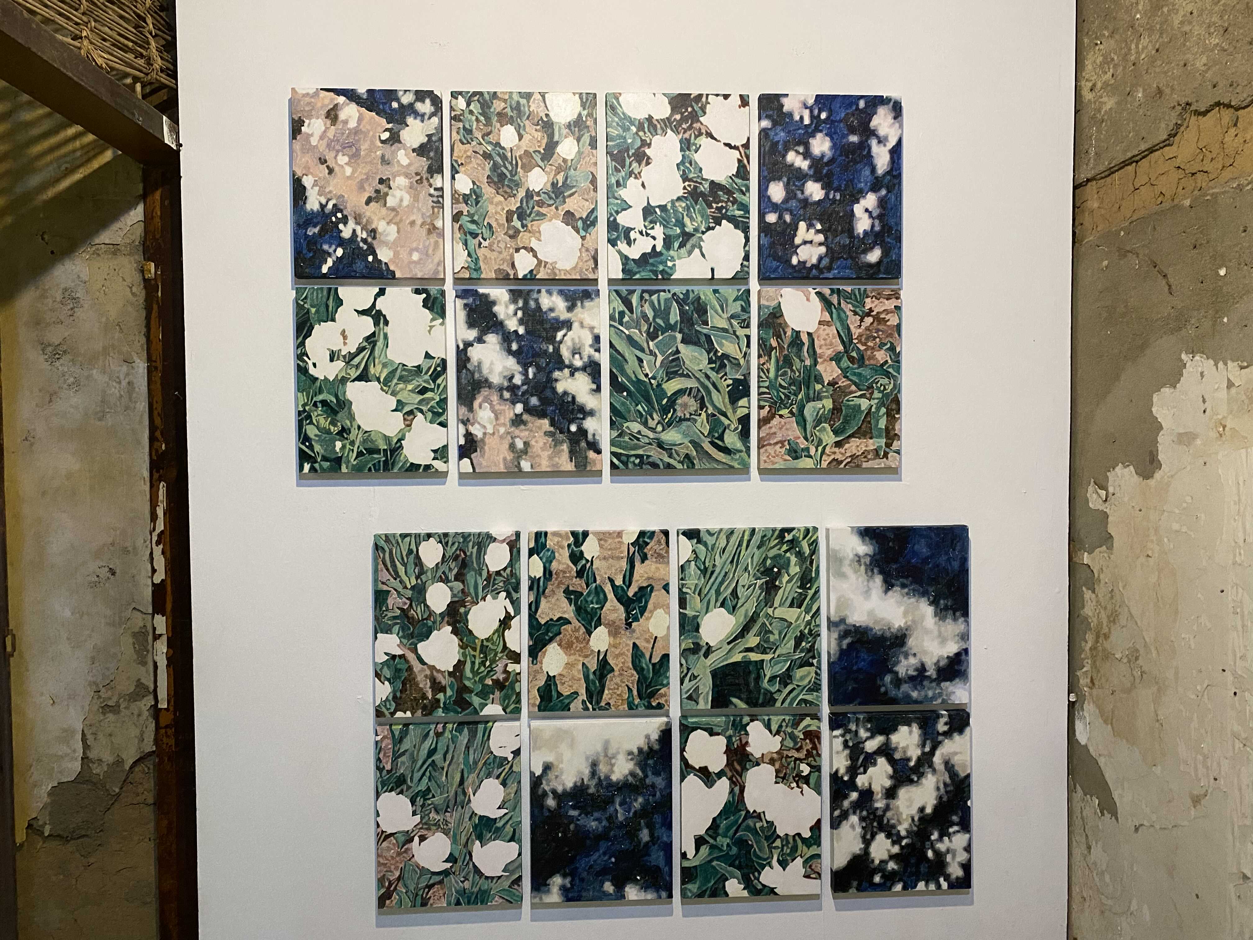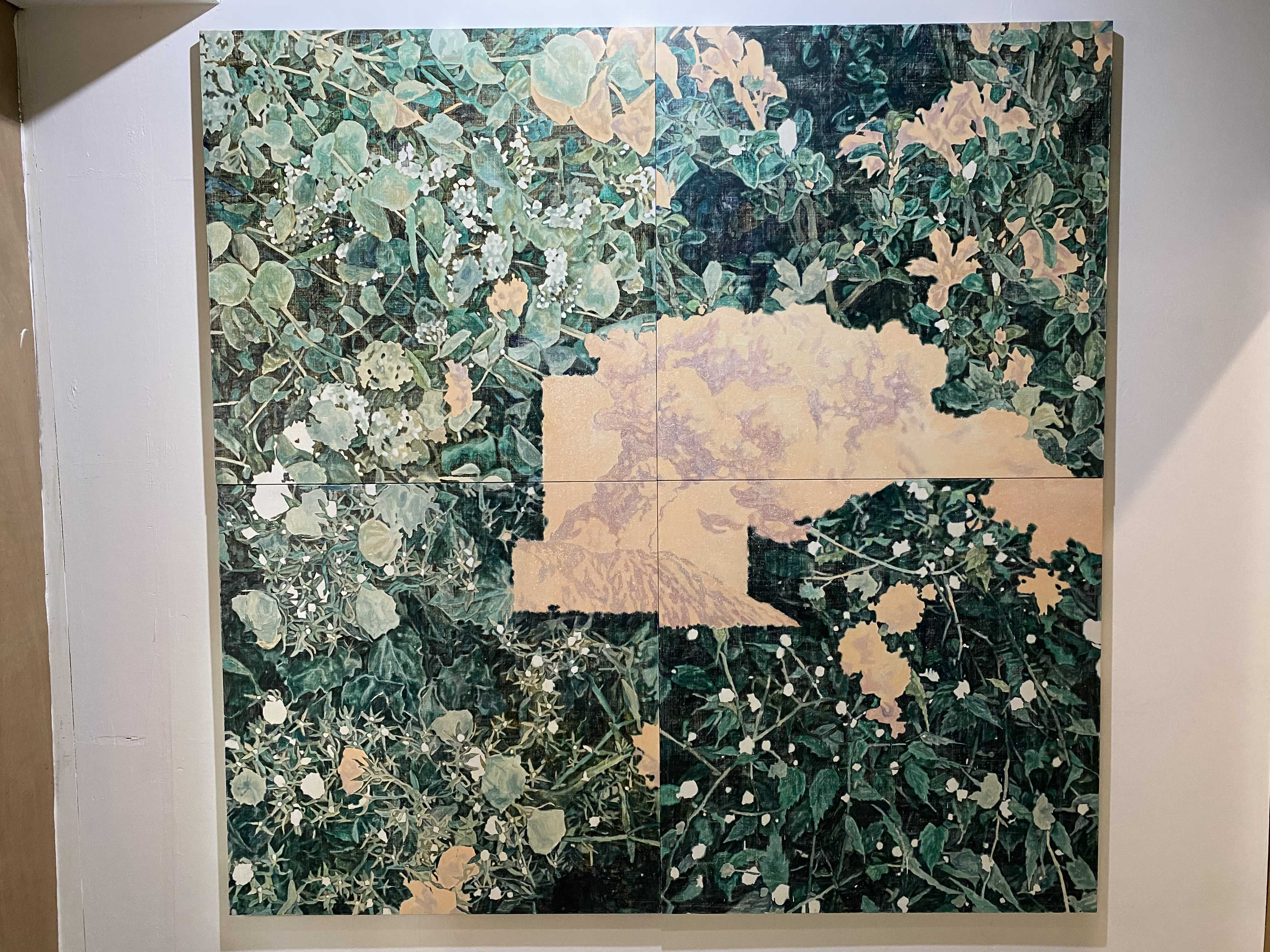 이번 전시 <고요한 소란>은 제목의 역설적 표현처럼 상충되지만 조형적으로 유사한 이미지를 조합한 회화 작품을 선보인다. 전시의 주요한 두 축이 되는 식물과 연기 이미지는 유연한 형태를 공유하며 조형적 리듬과 패턴을 형성하는 한편, 자연과 재해를 표상하며 일상과재난이 혼재한 시대의 불안과 모호함을 그려낸다. 나아가 지금 이곳에서 관객이 경험하는 현상적 감각과 장소적 특성을 포섭하며이미지의 연속성과 확장 가능성을 실험한다.