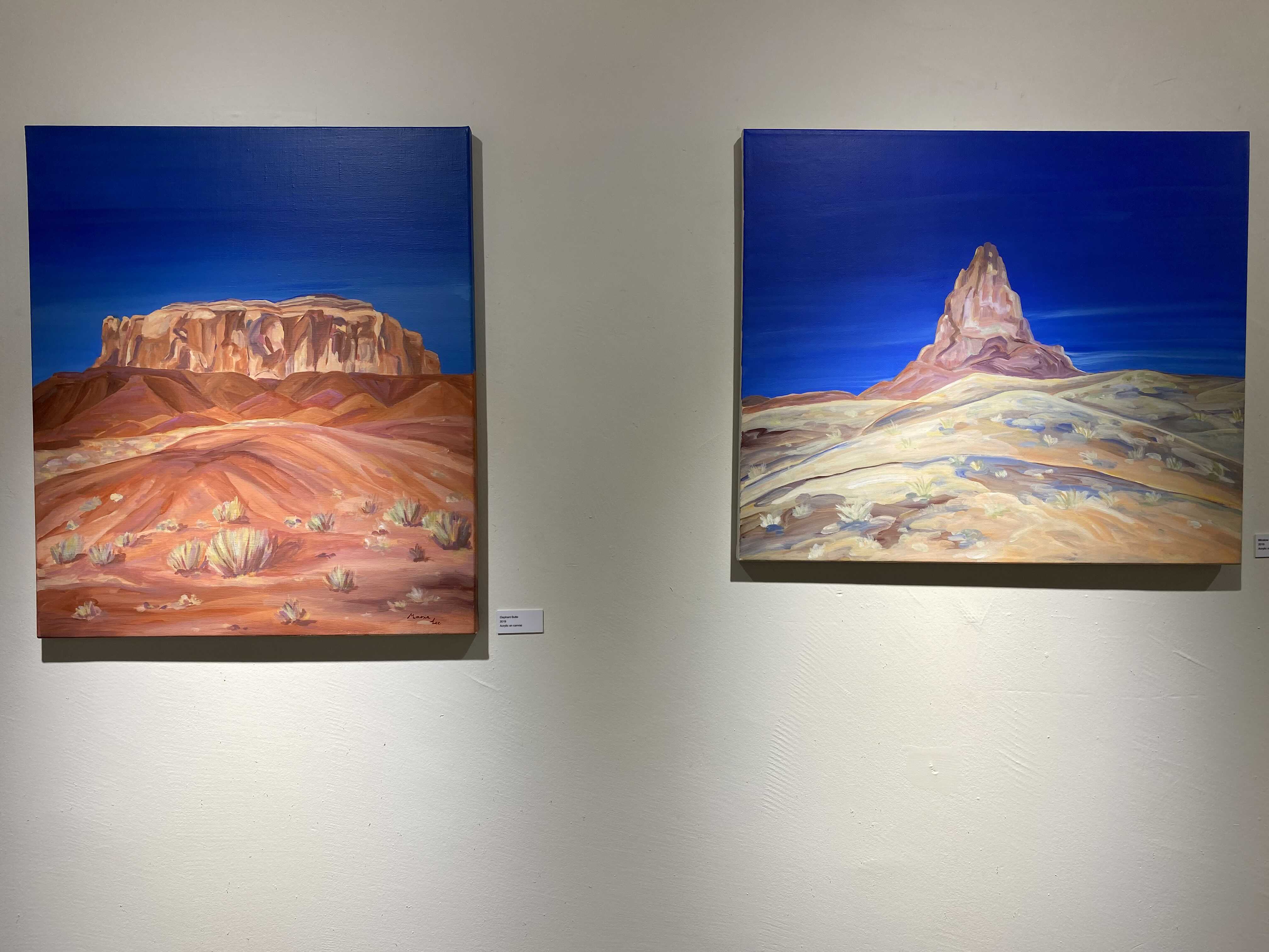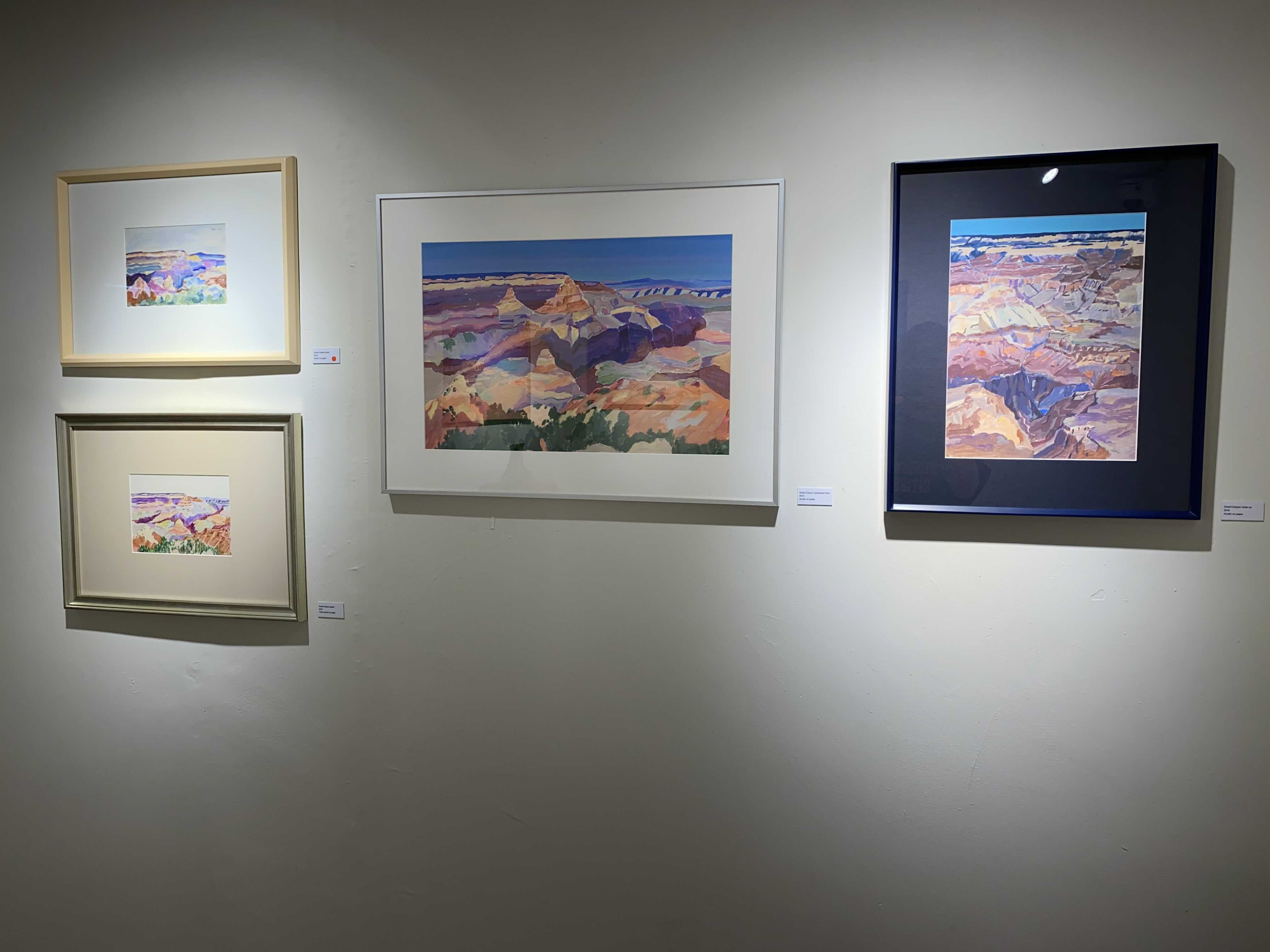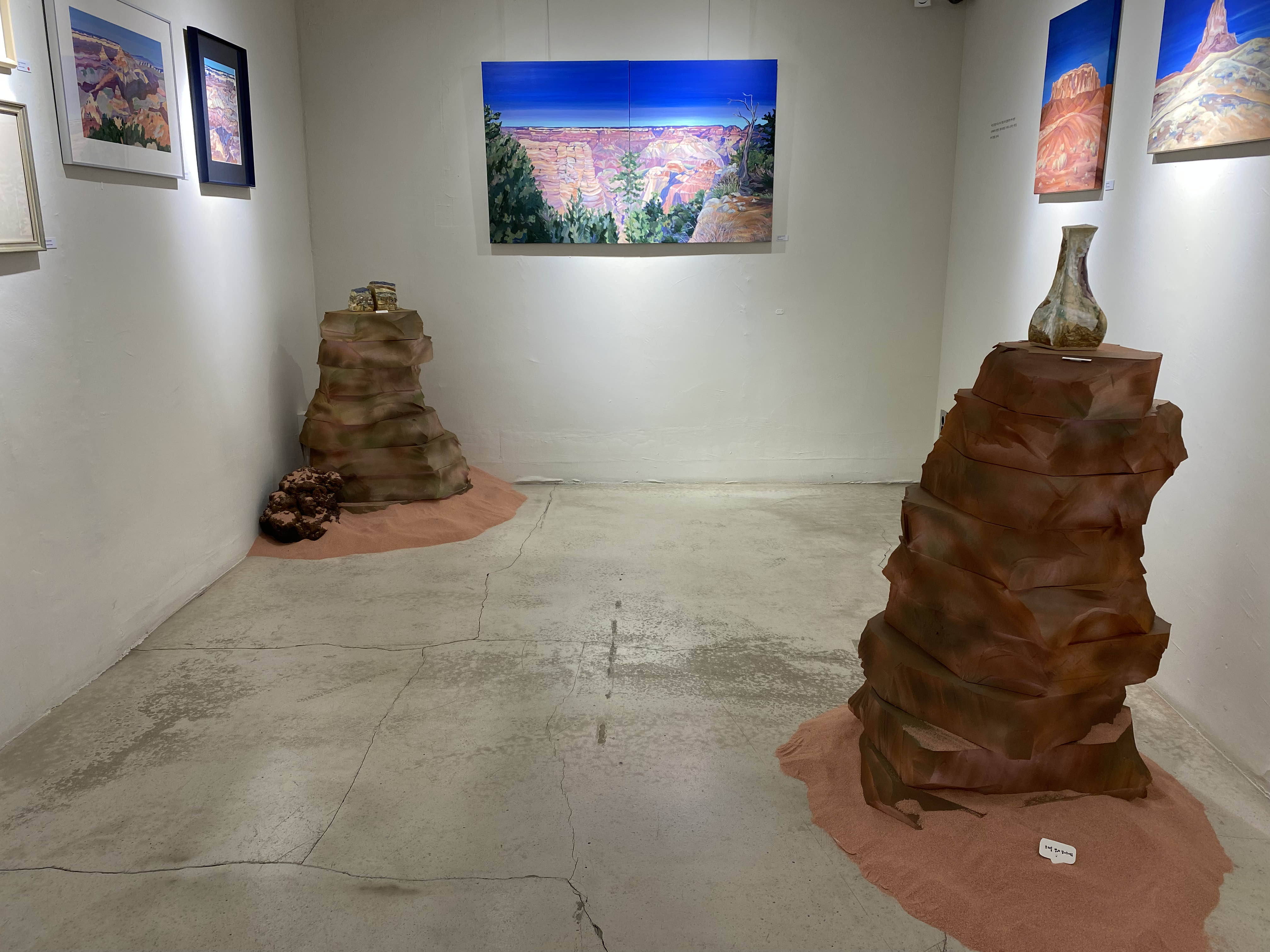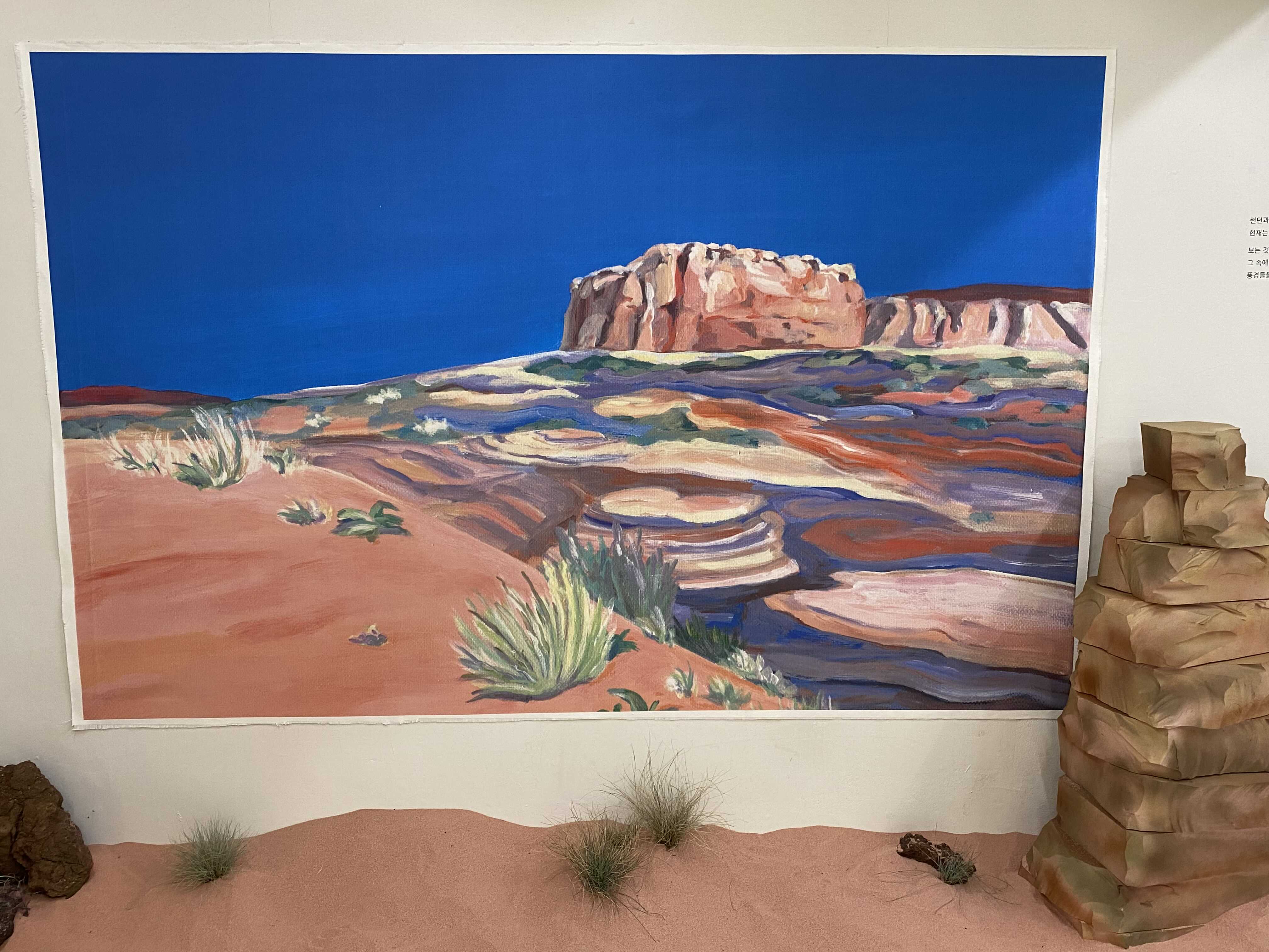 작가님이 미국 서부여행을 가서 보았던 그랜드캐년, 애리조나의 사막 풍경들을 작가의 색과 방식대로 풀어낸 회화 시리즈입니다. 사막을 떠올리면 베이지색, 황금색 등 노란색 계열의 색상이 떠오르는데요. 보라색, 핑크색, 오렌지색 등 노을이 생각나는 색들로 채워진 아름다운 풍경을 만날 수 있는 전시였습니다.