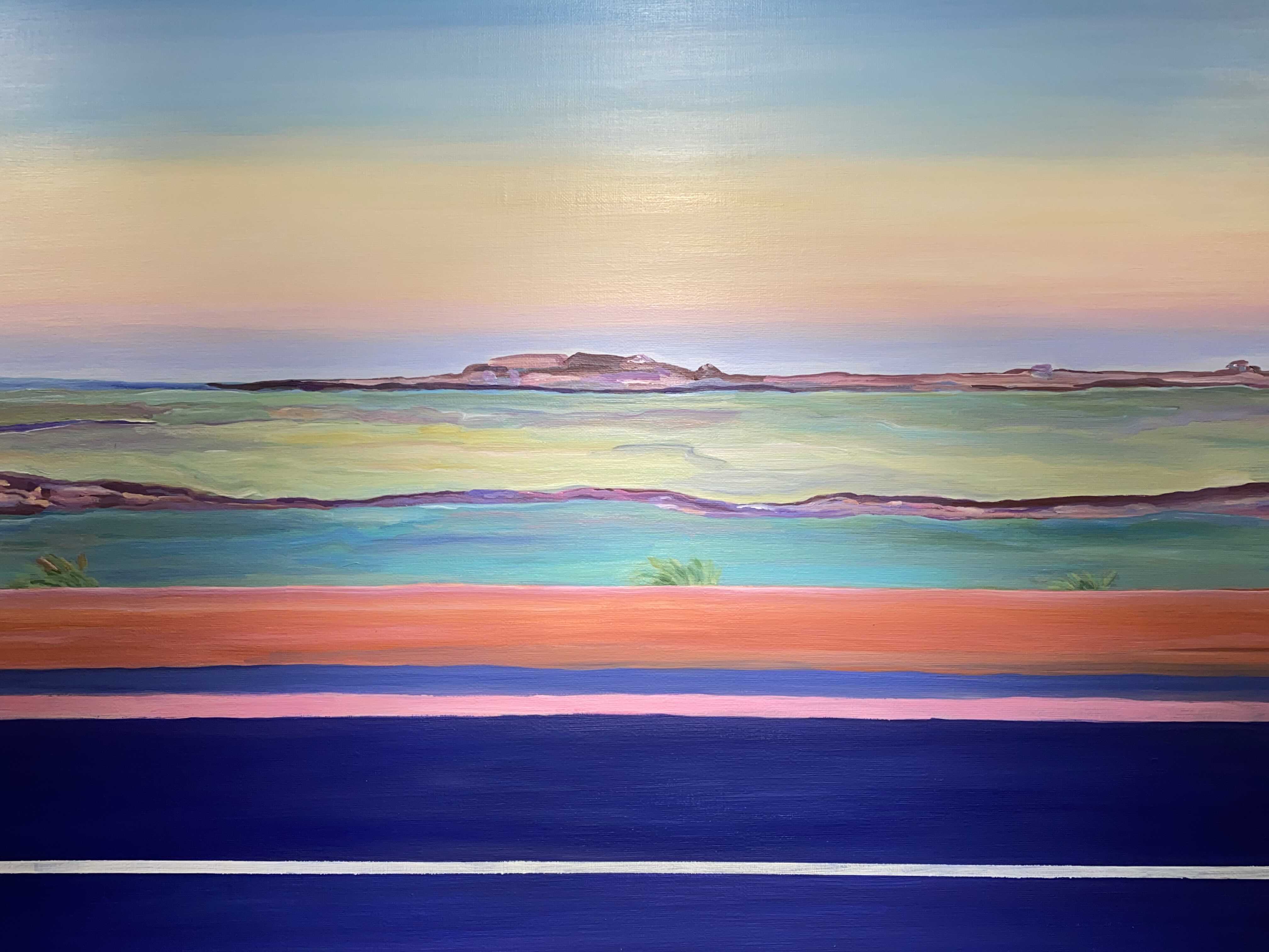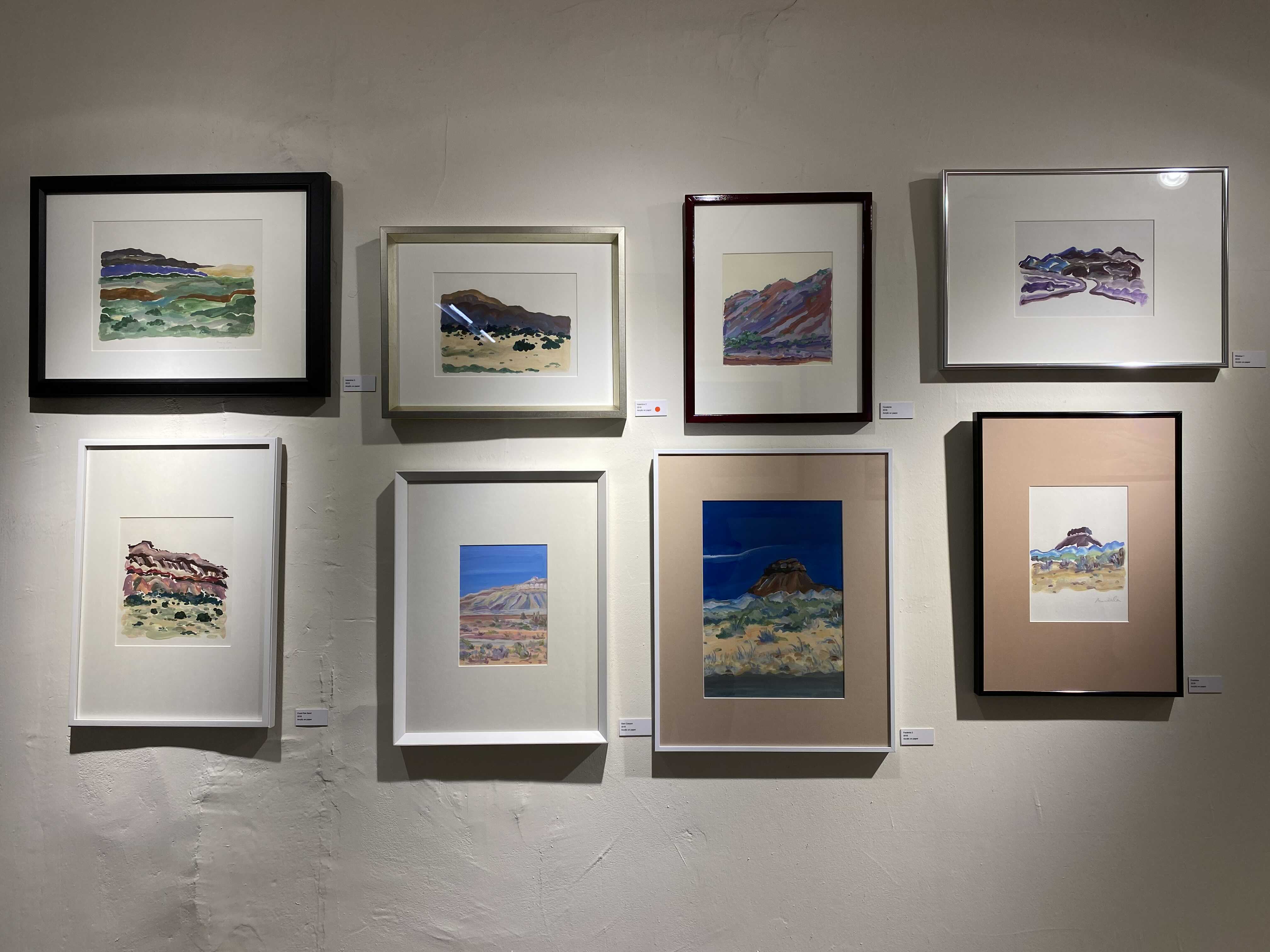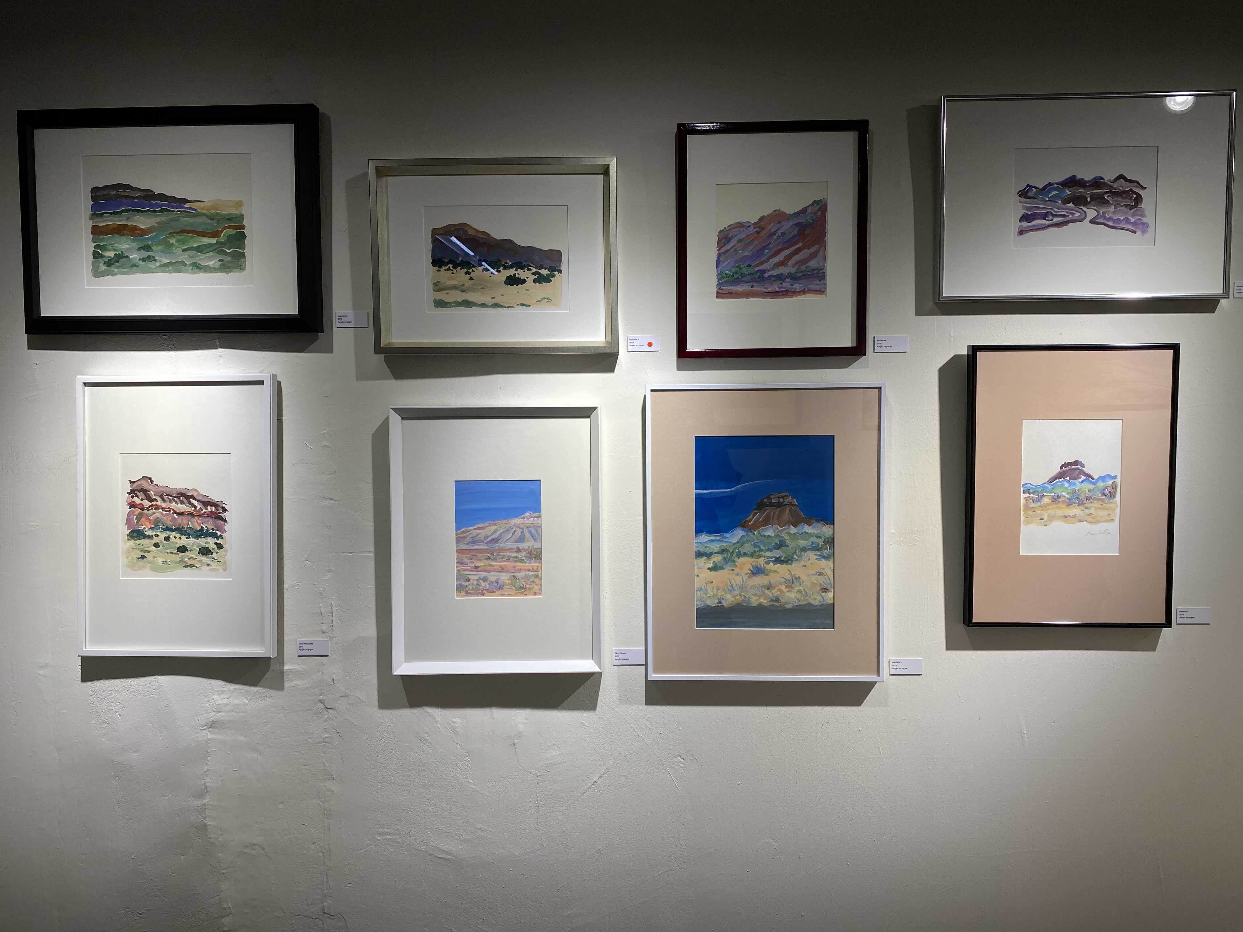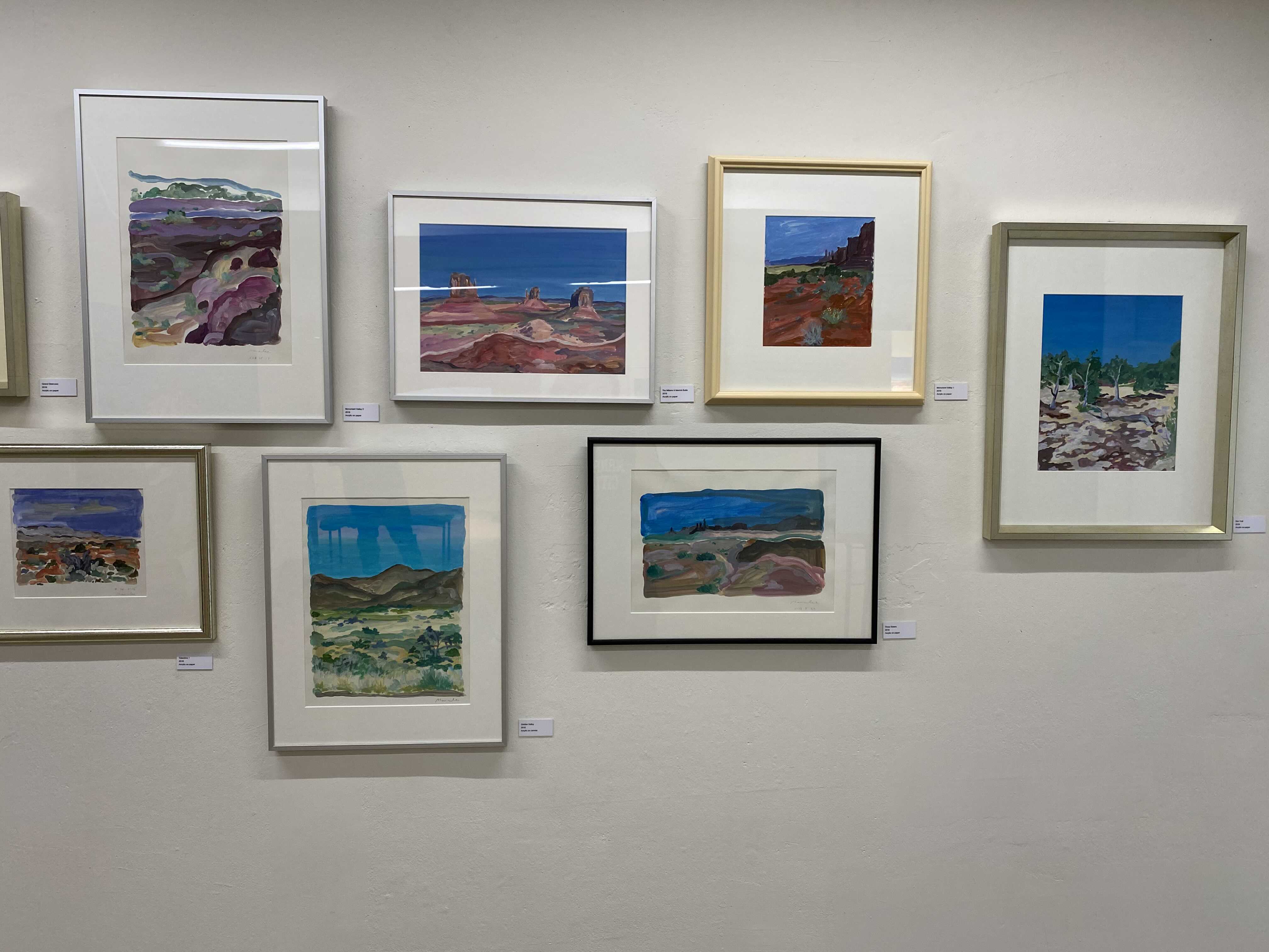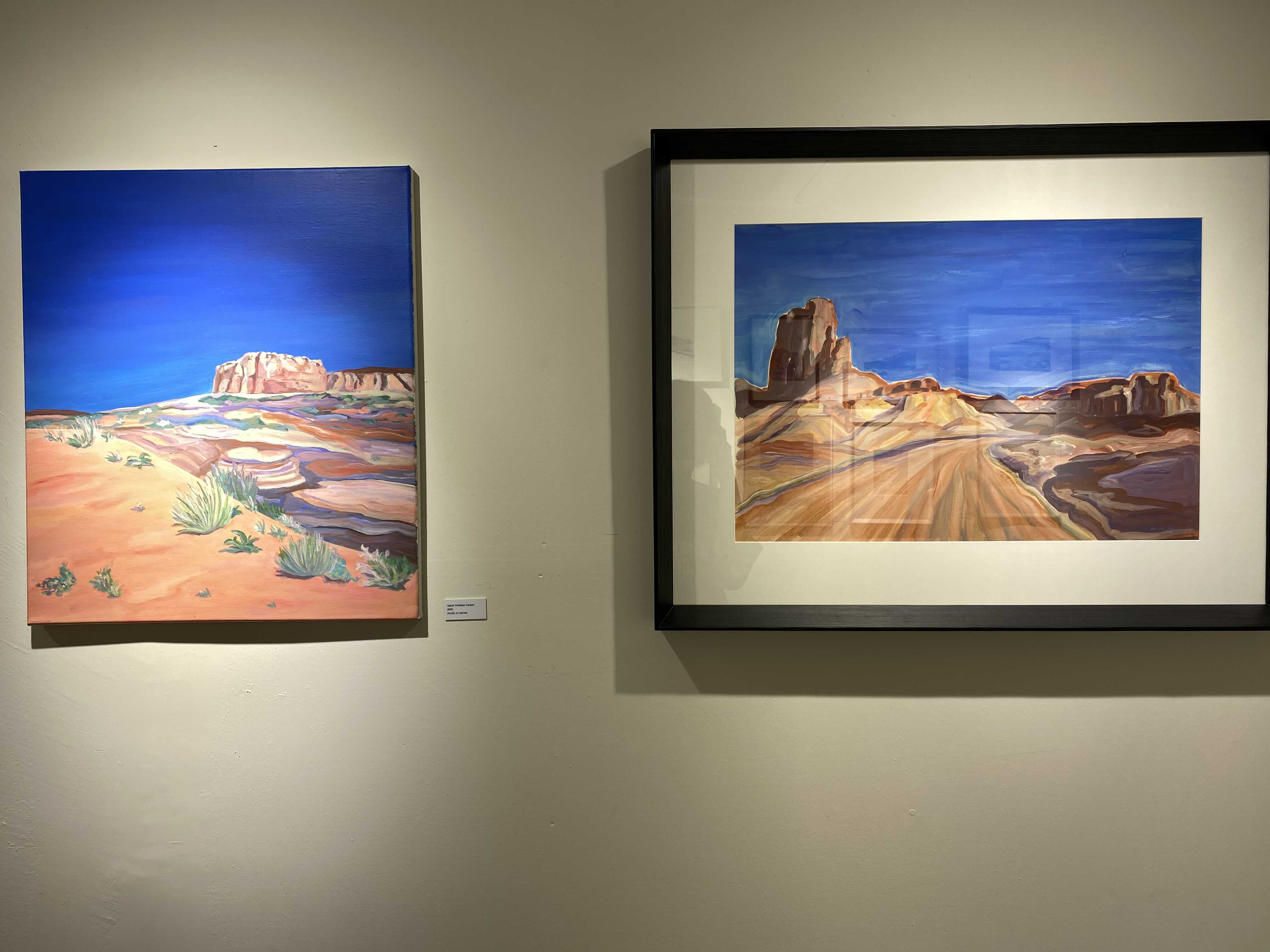 작가님이 미국 서부여행을 가서 보았던 그랜드캐년, 애리조나의 사막 풍경들을 작가의 색과 방식대로 풀어낸 회화 시리즈입니다. 사막을 떠올리면 베이지색, 황금색 등 노란색 계열의 색상이 떠오르는데요. 보라색, 핑크색, 오렌지색 등 노을이 생각나는 색들로 채워진 아름다운 풍경을 만날 수 있는 전시였습니다.