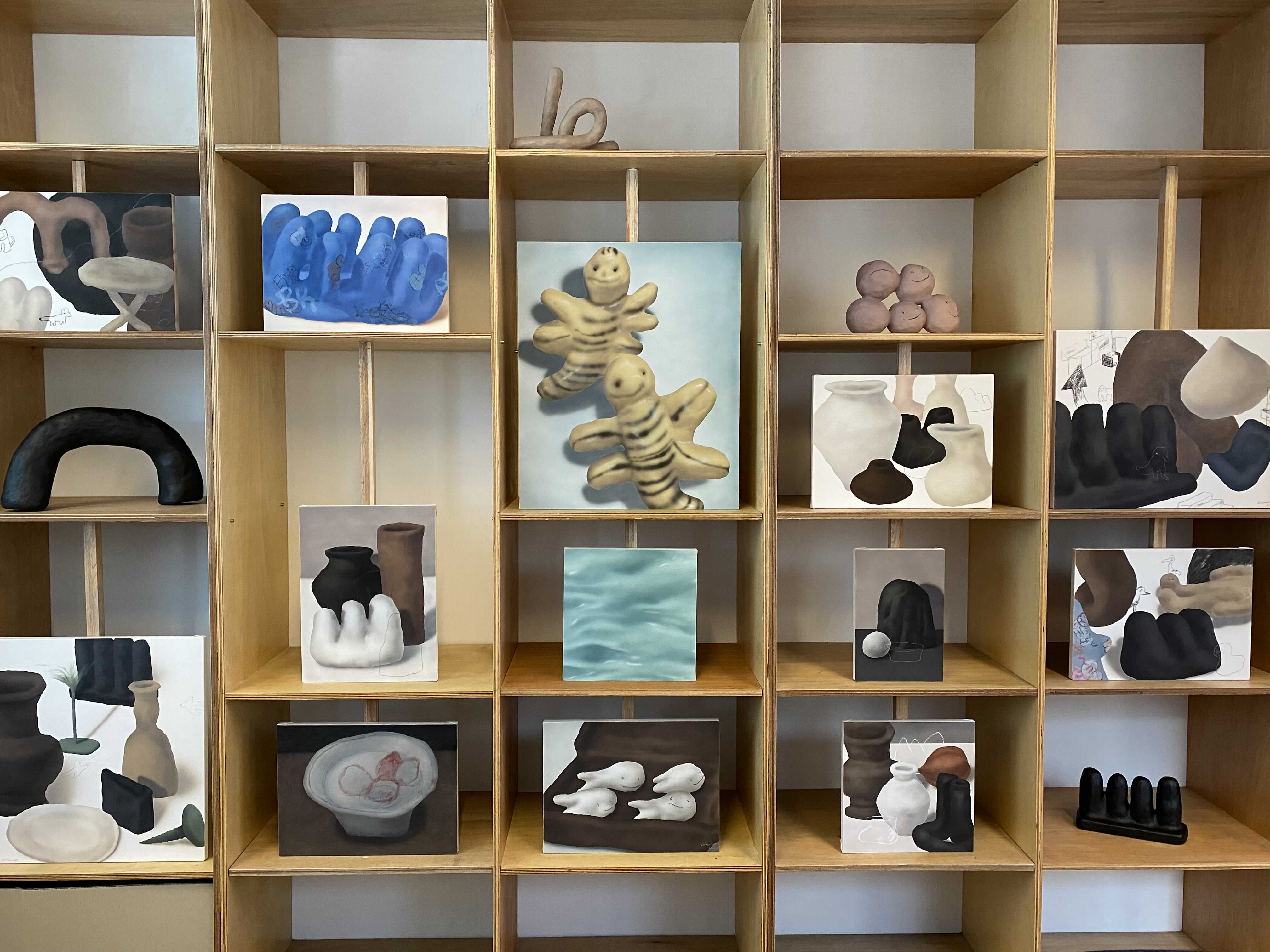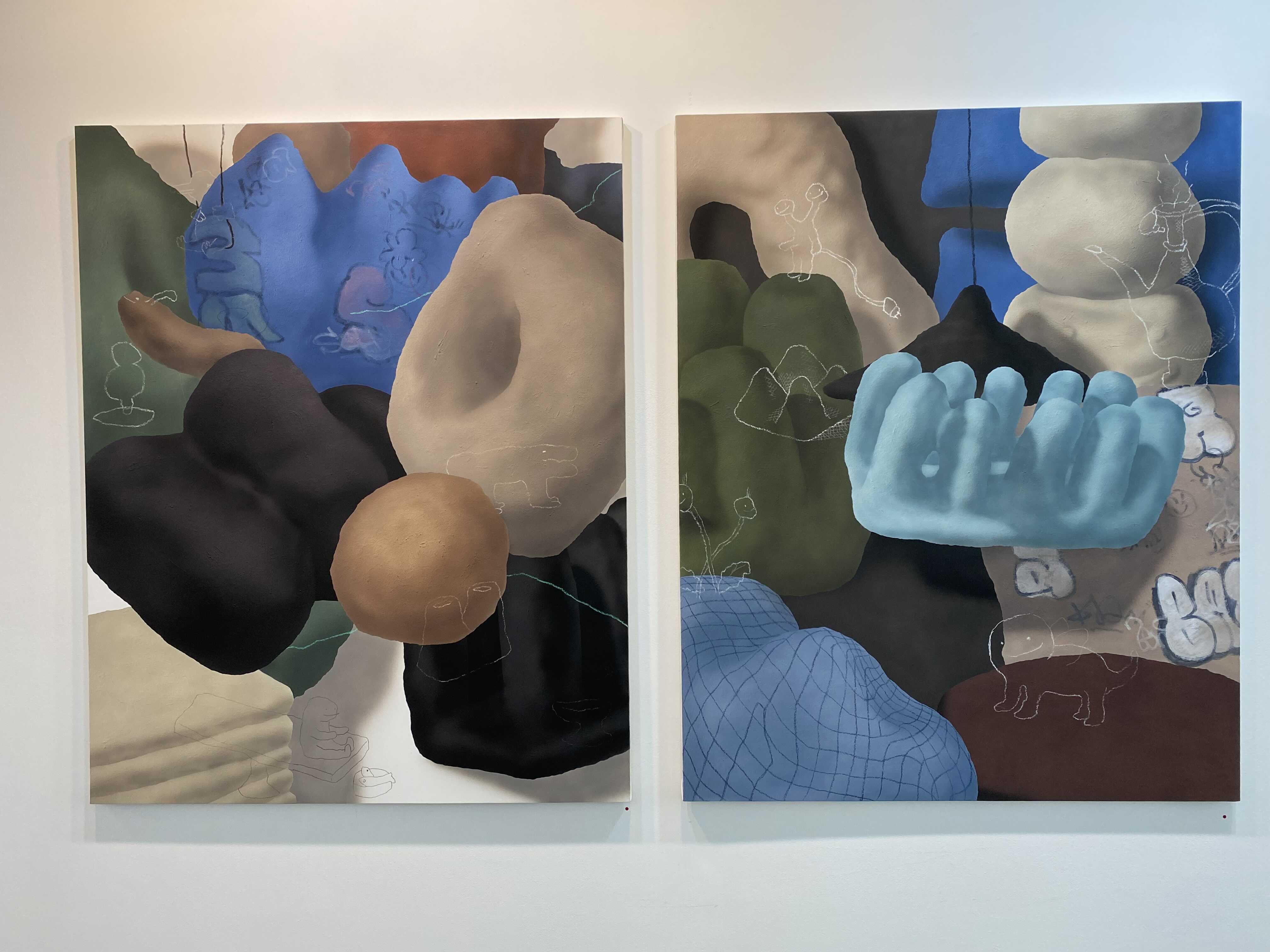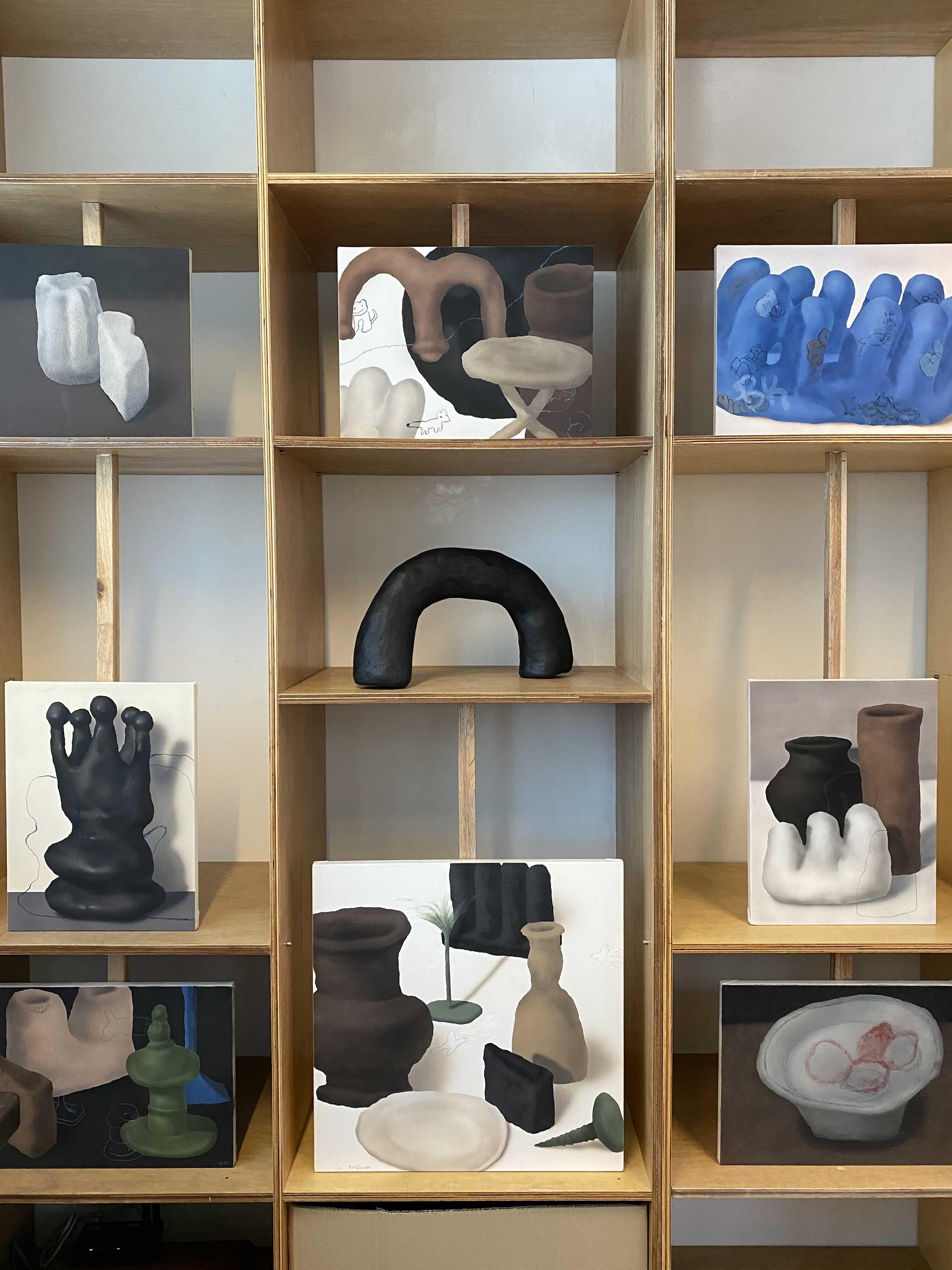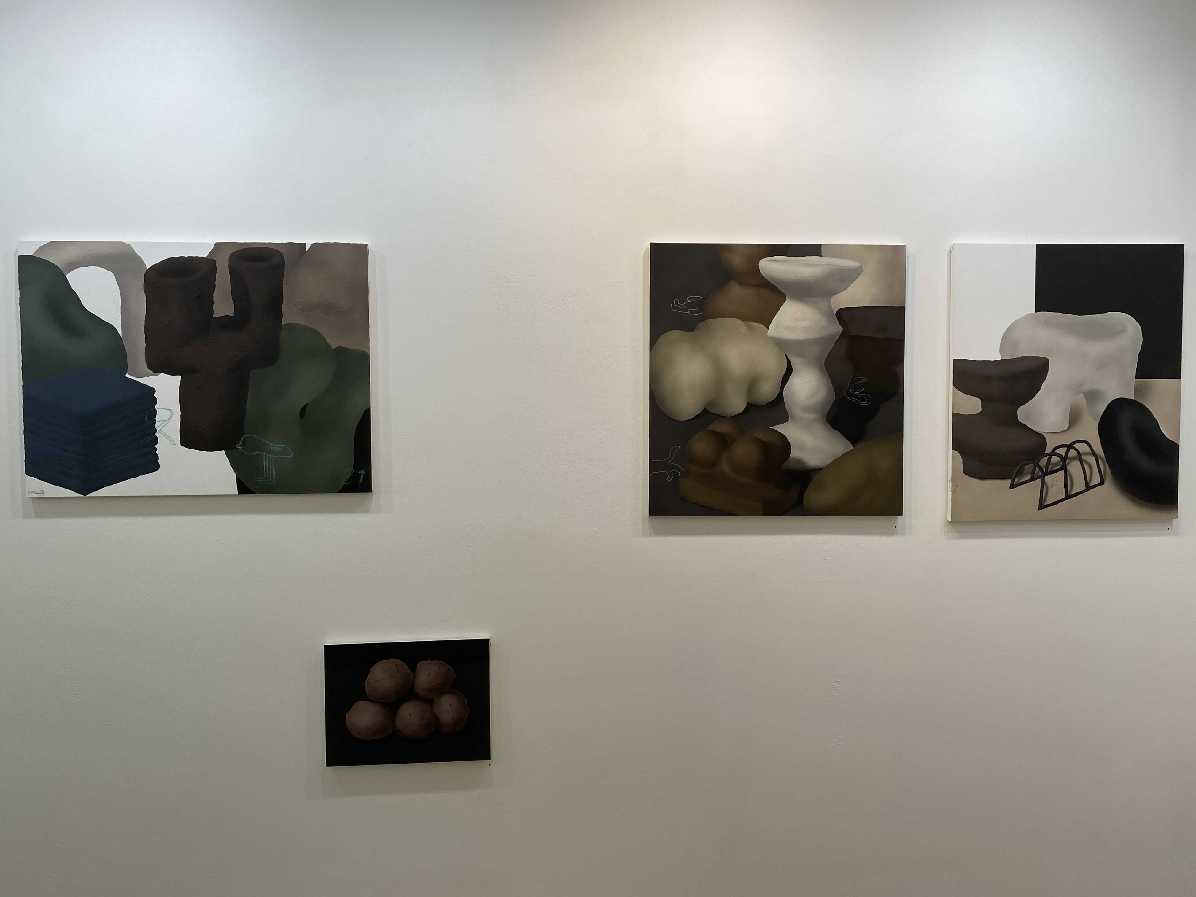 김시안 작가의 화면에 구성되어 있는 덩어리들은, 일상의 친근한 사물로부터 시작된 작가의 무의식적인 정신활동의 결과다. 동시대를 살아가면서 서로 교감을 받을 수 있는 순간이 얼마나 있을지 모르겠지만, 그의 덩어리들은 우리의 삶에서 가장 친근했던 순간에 떠오르게 되는 형태들이다. 해서 어딘가 본 듯 한, 연락도 없이 우연이 만난 오래된 친구처럼 어딘지 모르게 반갑다. 오랫동안 판화 작업을 해온 작가의 회화는 전통 회화의 원칙적 논리를 거부한다. 그의 화면에 놓인 사물들은 작가의 전혀 다른 상상력으로 구성된다.