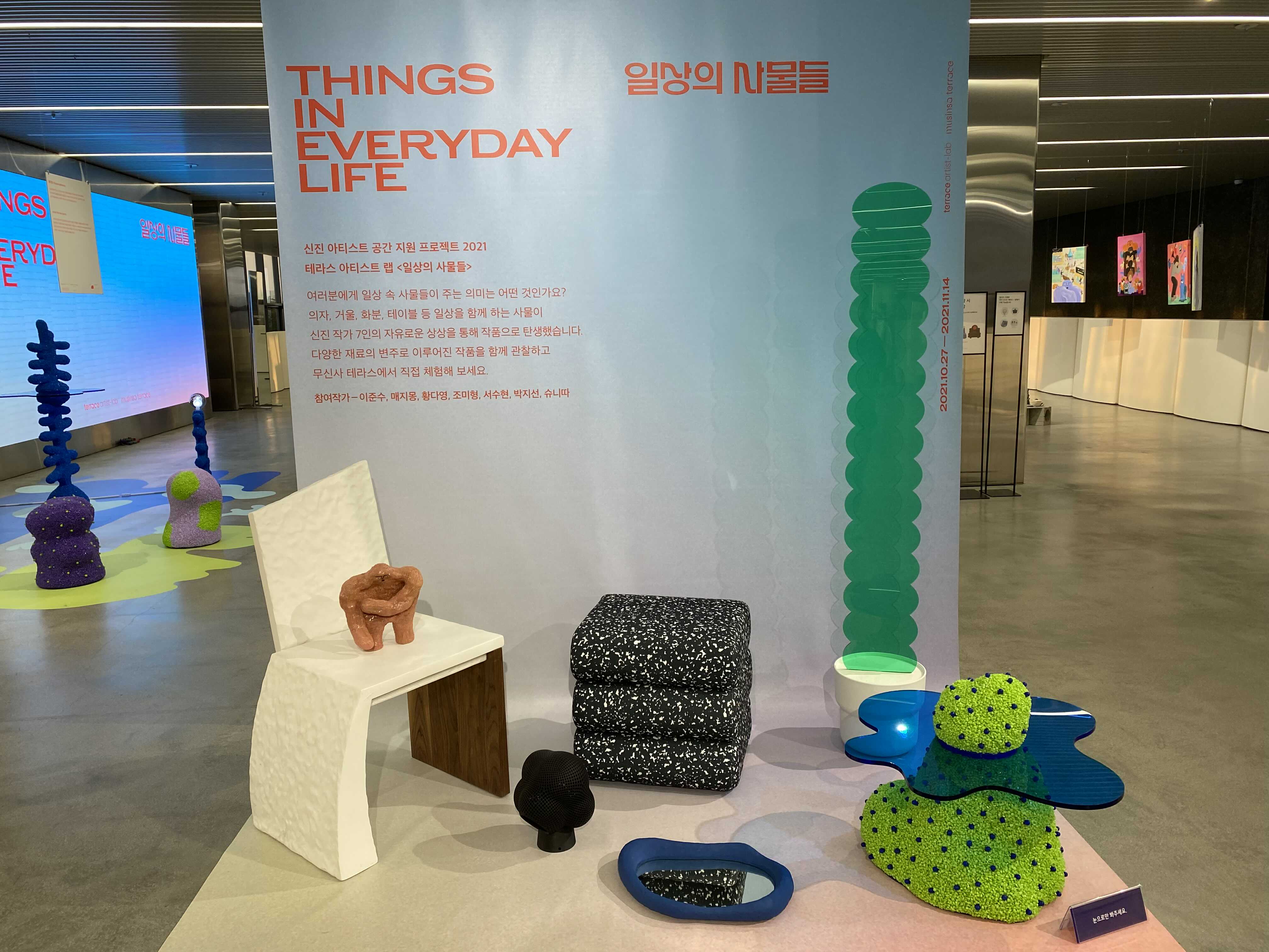 이준수, 매지몽, 황다영, 조미형, 서수현, 박지선, 슈니따 작가 7명의 자유로운 상상으로 풀어낸 일상의 사물들 전시입니다. 가구부터 오브제, 회화 등 다양한 작품을 만날 수 있었습니다. 이번 전시는 무신사 테라스샵에서 전시 굿즈를 판매하고 있었습니다. 무신사 회원이라면 무료로 문화생활을 즐겨 보세요.