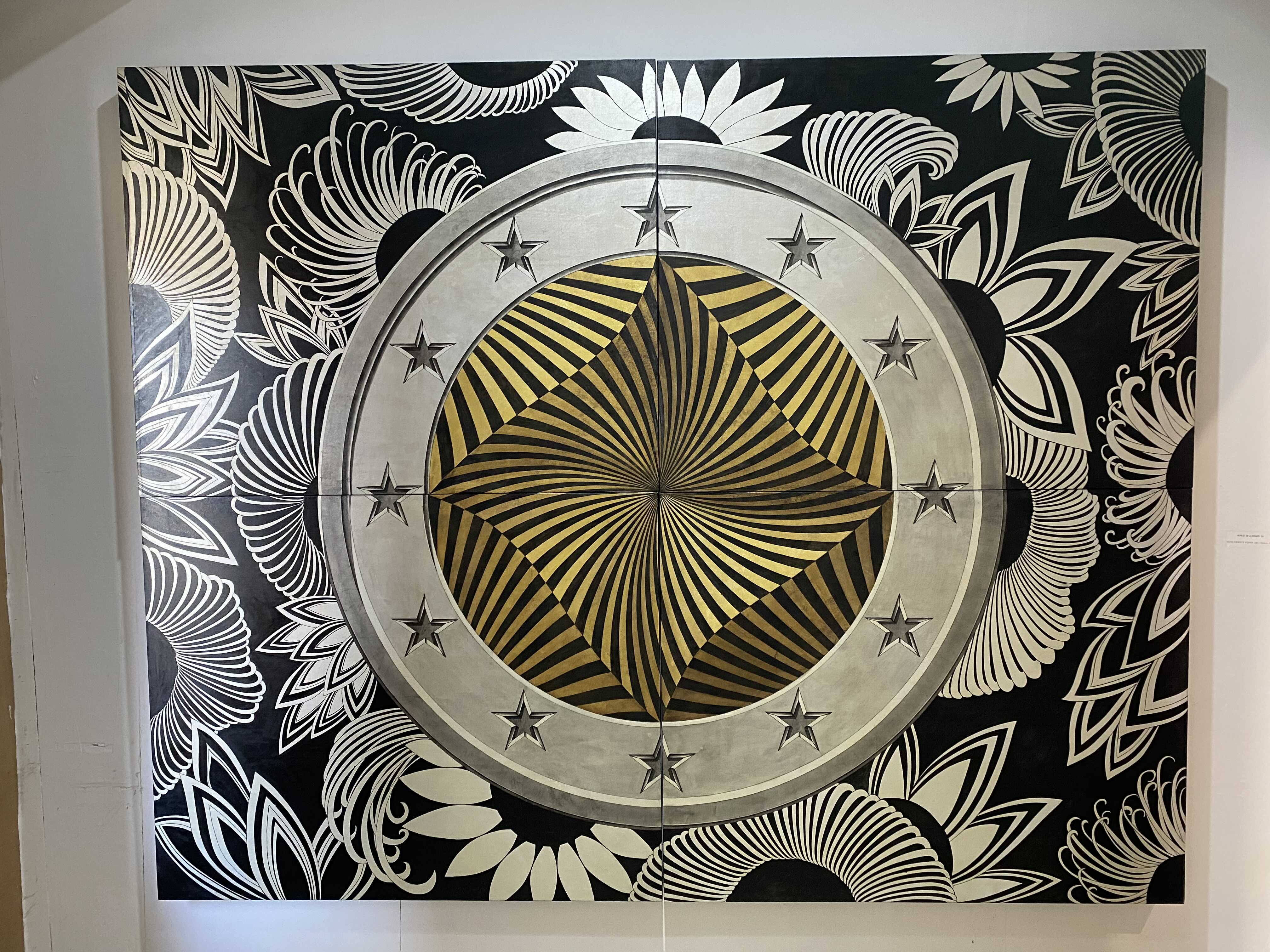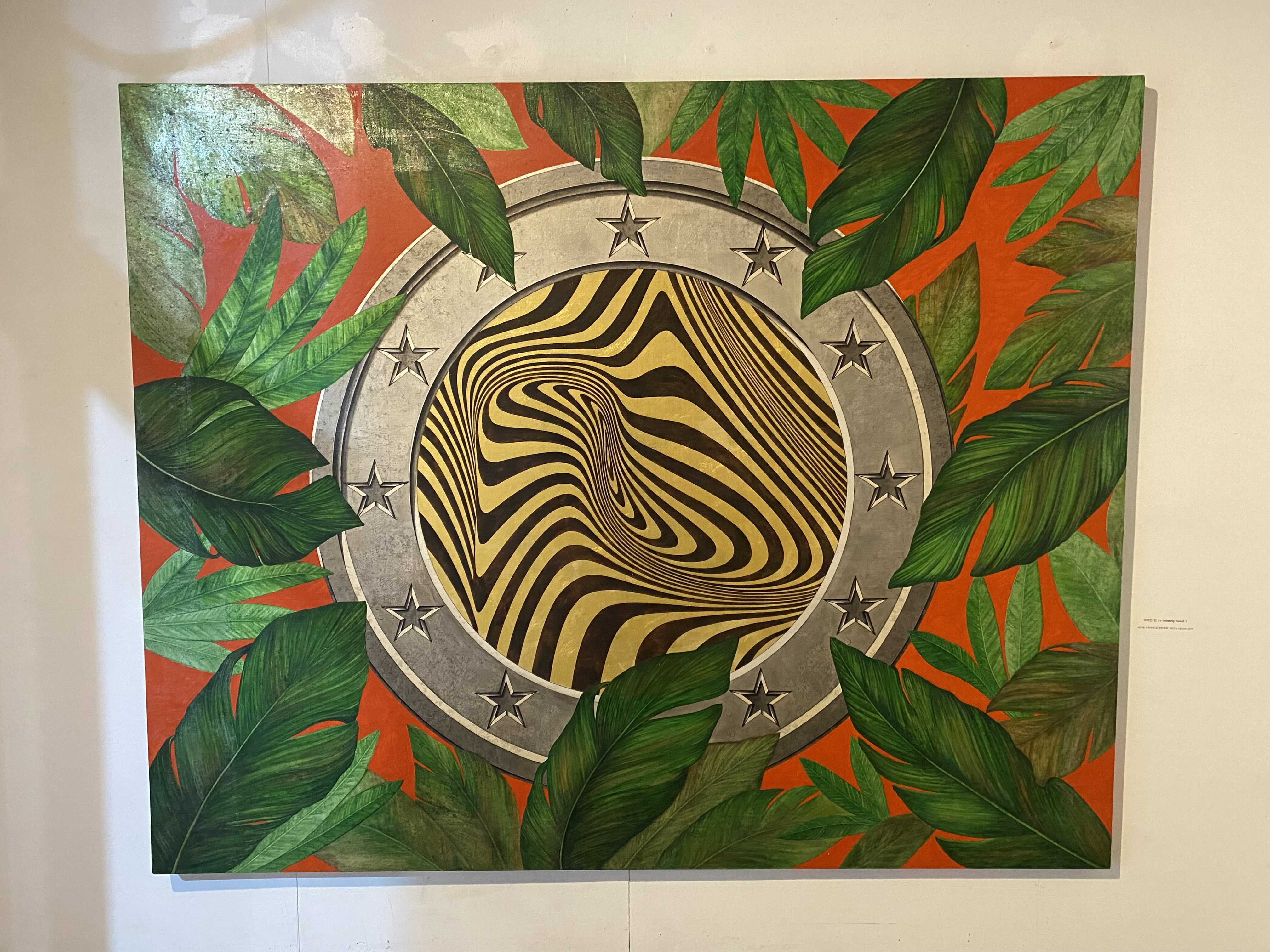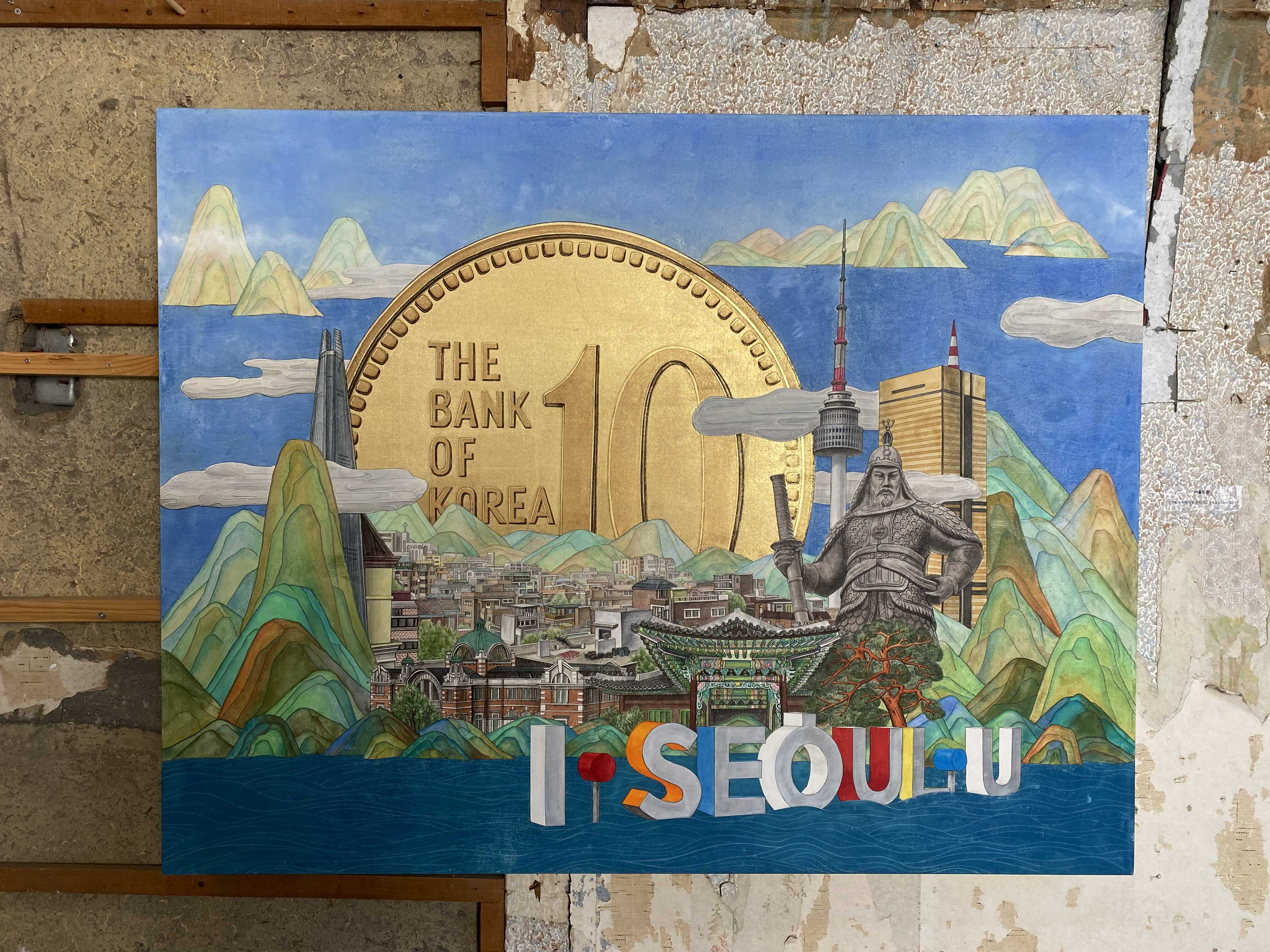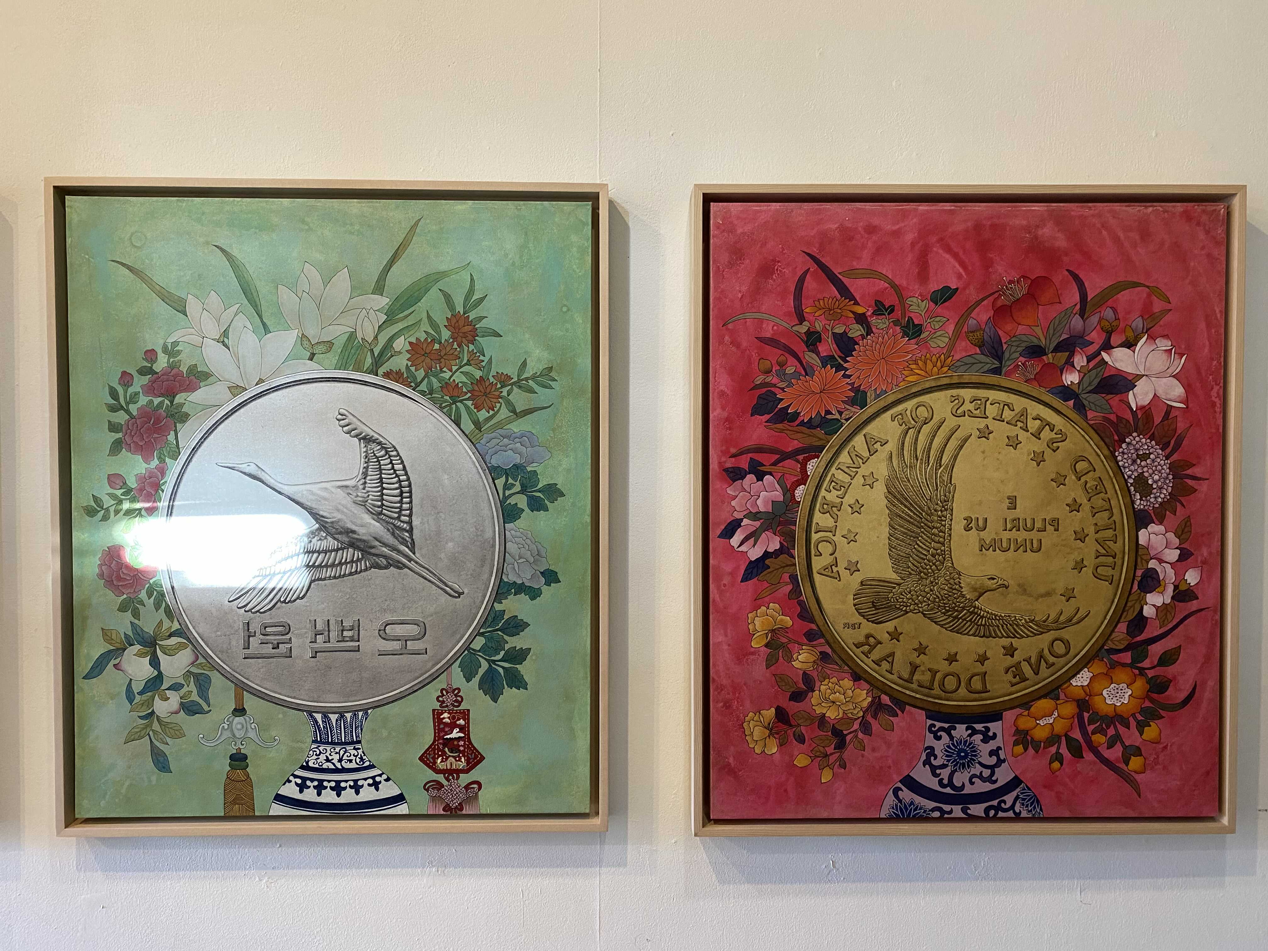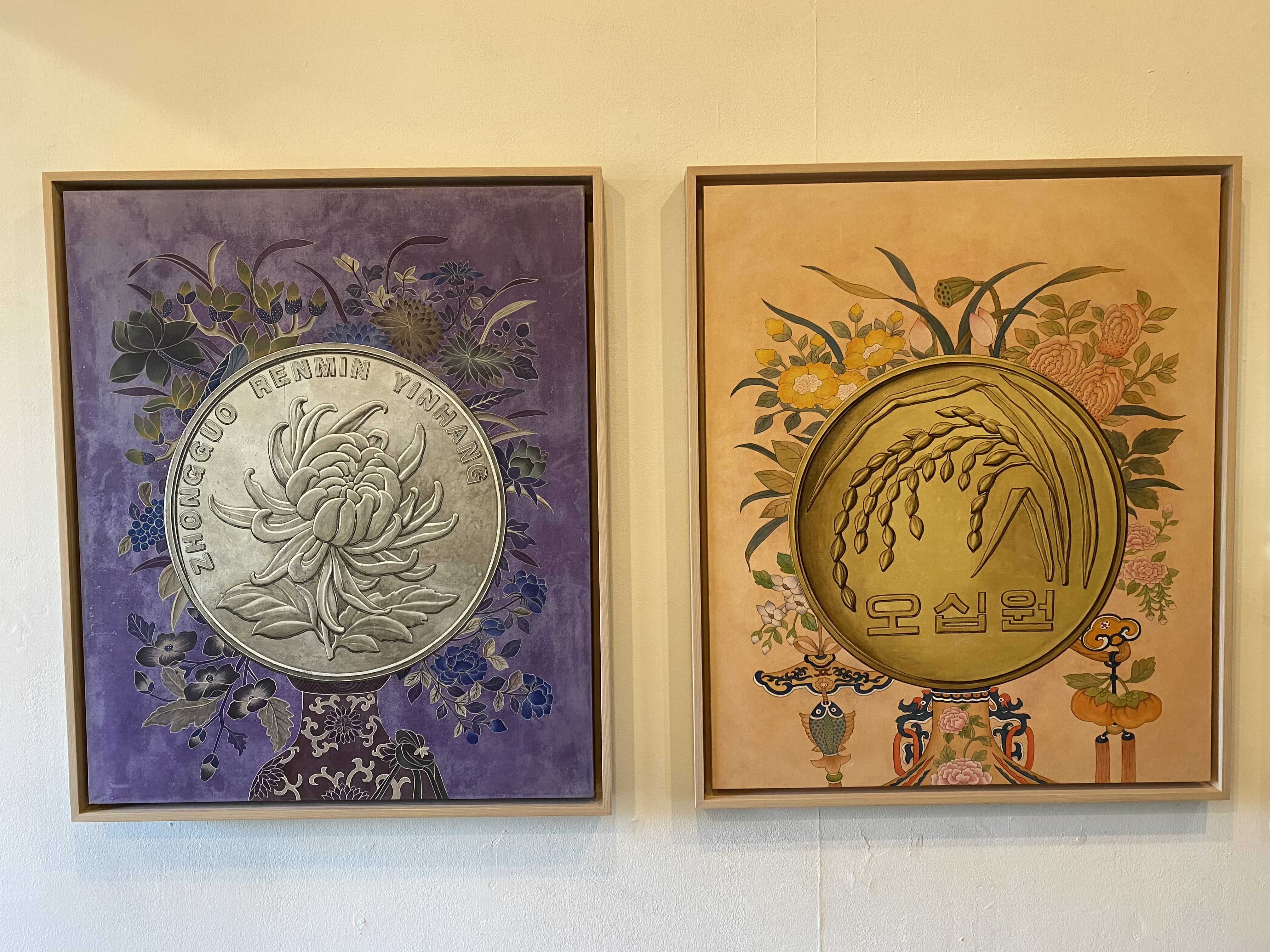 비단에 수묵으로 정밀하게 채색된 화면 속의 주요 도상은 김현하가 지속적으로 그려왔던 동전이다. 동전과 병치된 일상의 정경과 이국적 디자인이 더해진 가상의 풍경이라고 할 수도 있겠다. 여러 안면을 가진 돈의 형상을 통해 작가는 줄곧 세계의 행복과 덧없음, 순환 가능해 보이지만 한쪽으로 쏠려있는 존재의 욕망에 대한 시각적 기표를 붙들고 있었던 것 같다. 불타버린 것은 캔버스였지만, 그림 속 동전들과 그림이 담보하는 경제적 가치 또한 소실되어 버렸다.