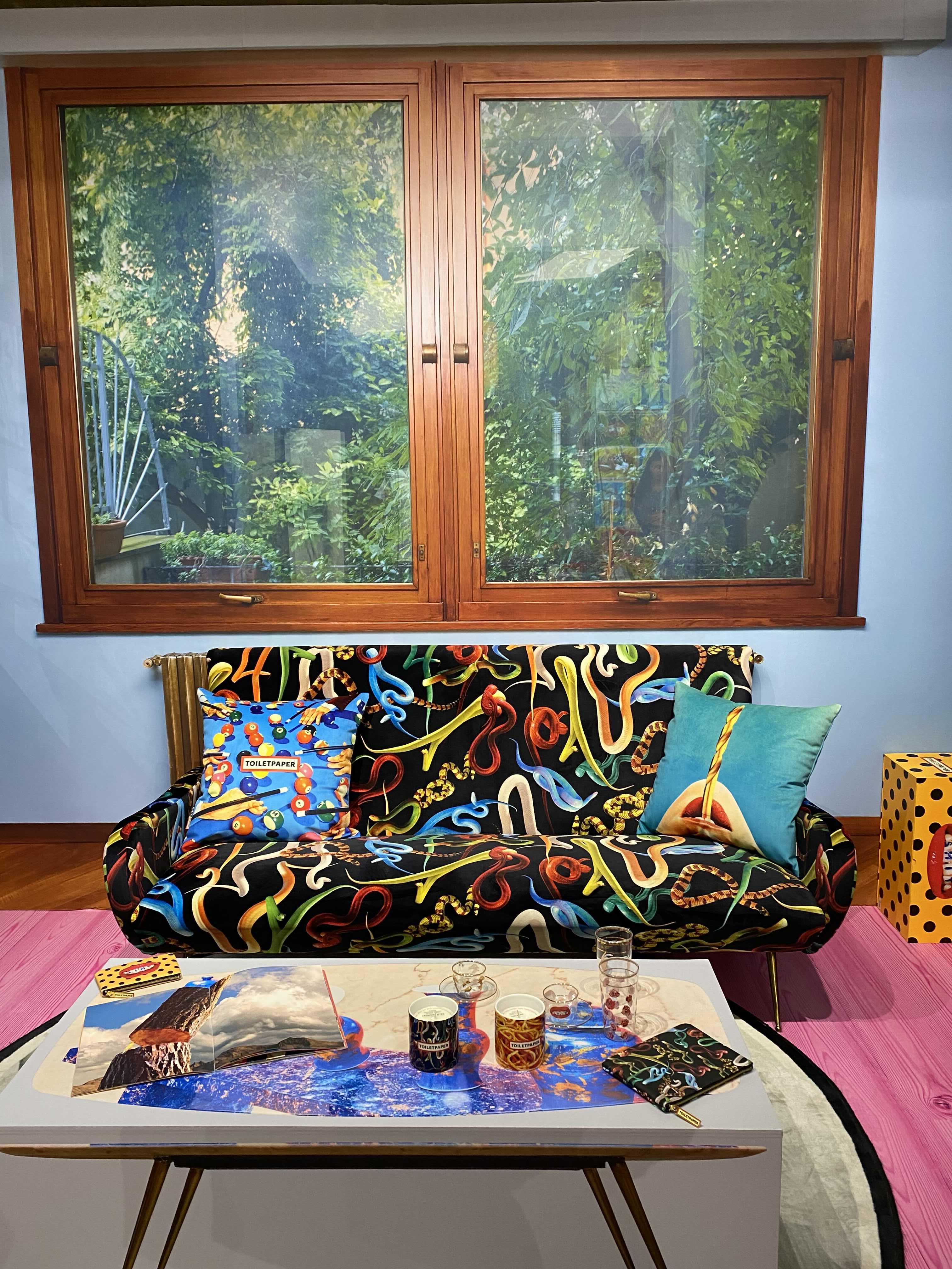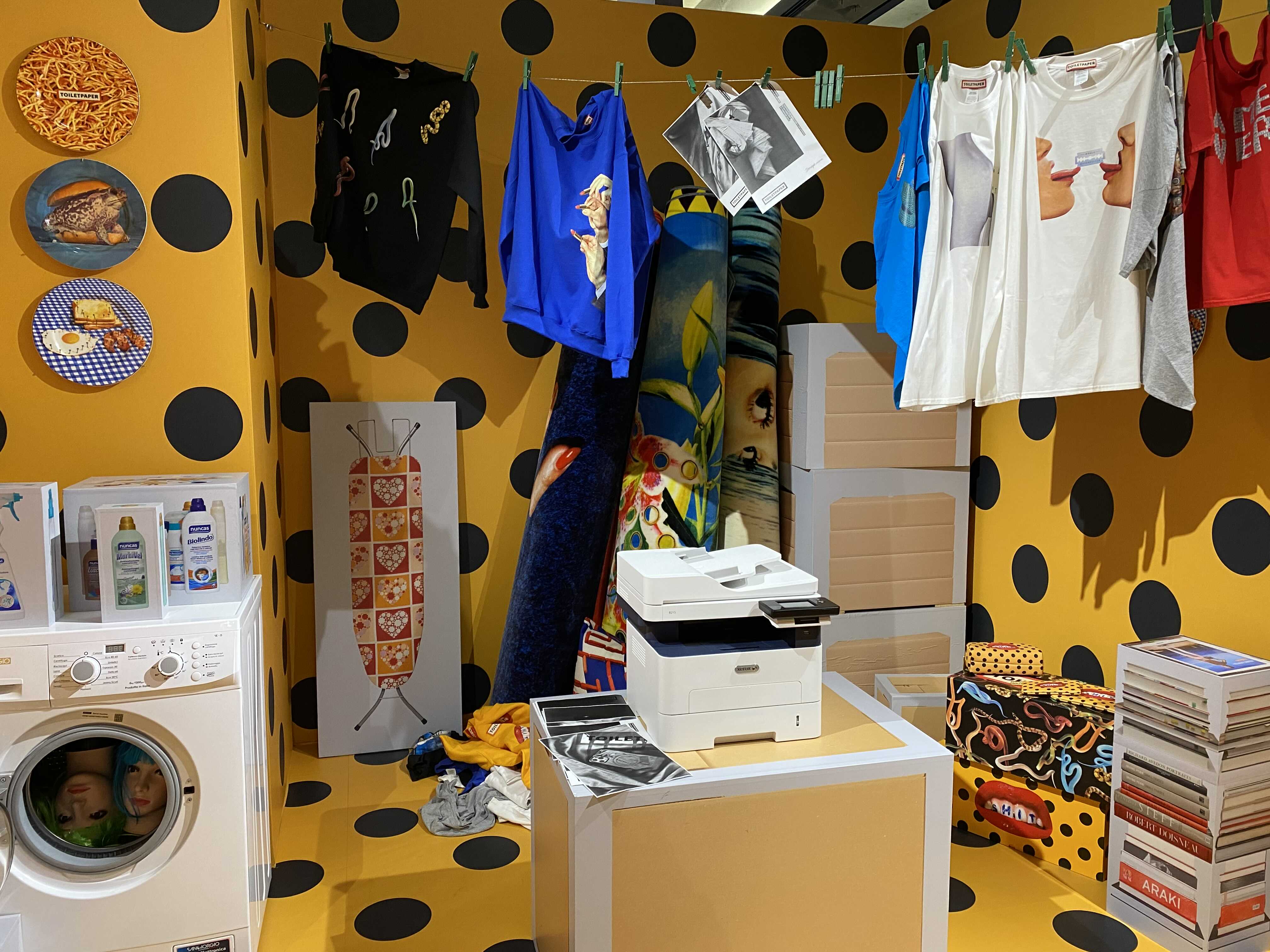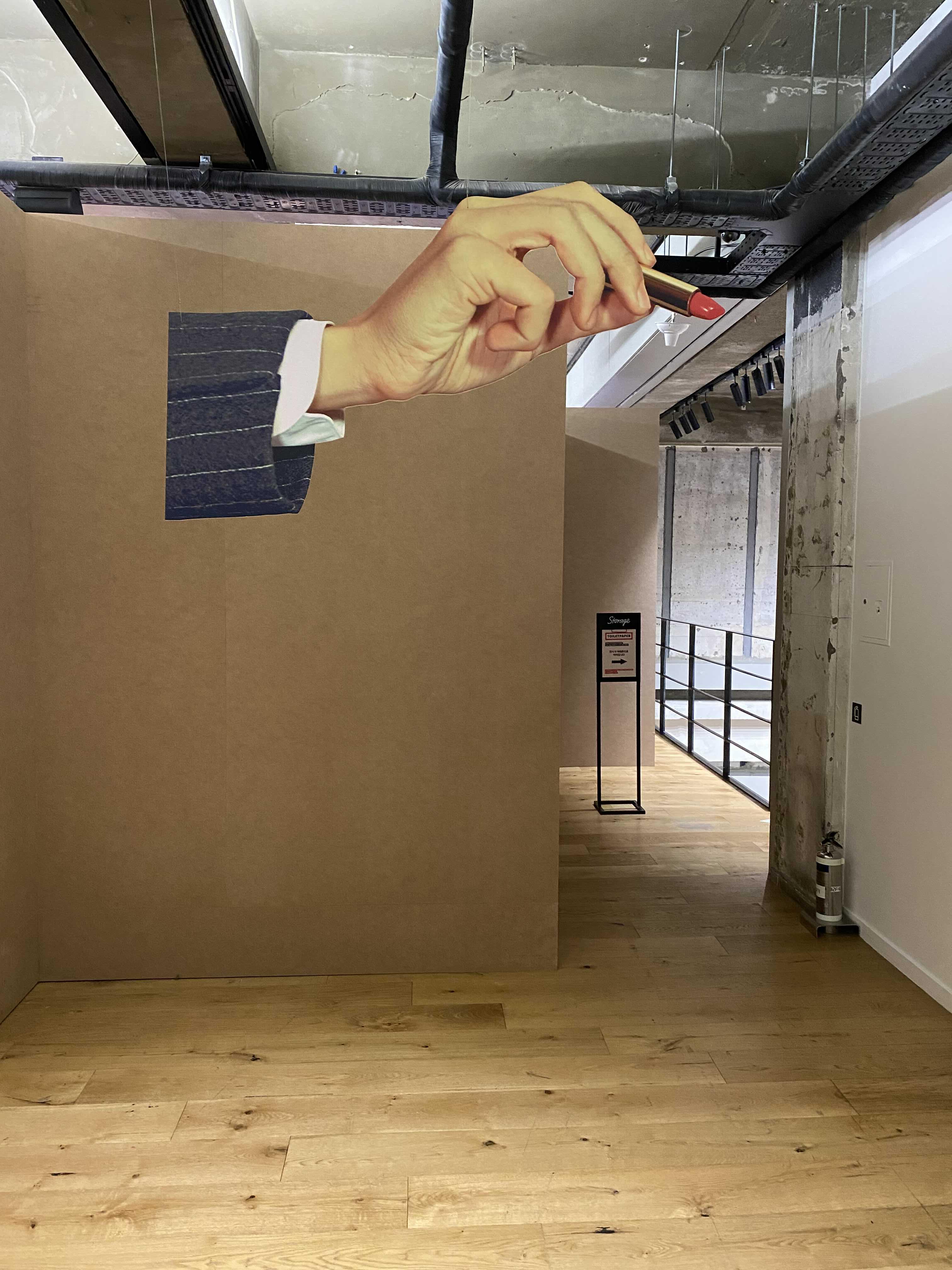 <TOILETPAPER: The Studio>는 TOILETPAPER의 밀라노 본사 스튜디오를 서울 이태원 스토리지에 그대로 옮겨와 관람객을 맞이한다. TOILETPAPER의 스튜디오 정문을 통해 밀라노로 가는 비밀통로를 지나면 TOILETPAPER의 오피스와 함께 거실과 주방, 정원 등의 공간을 만나볼 수 있다. 그간 TOILETPAPER 매거진에서 보았던 다양한 작업들이 미드 센추리 모던 가구와 러그, 거울, 조각상, 갖가지 장식소품 등에 콜라주 되어 현실에는 존재하지 않을 법한 화려한 만화경의 세계가 펼쳐진다.