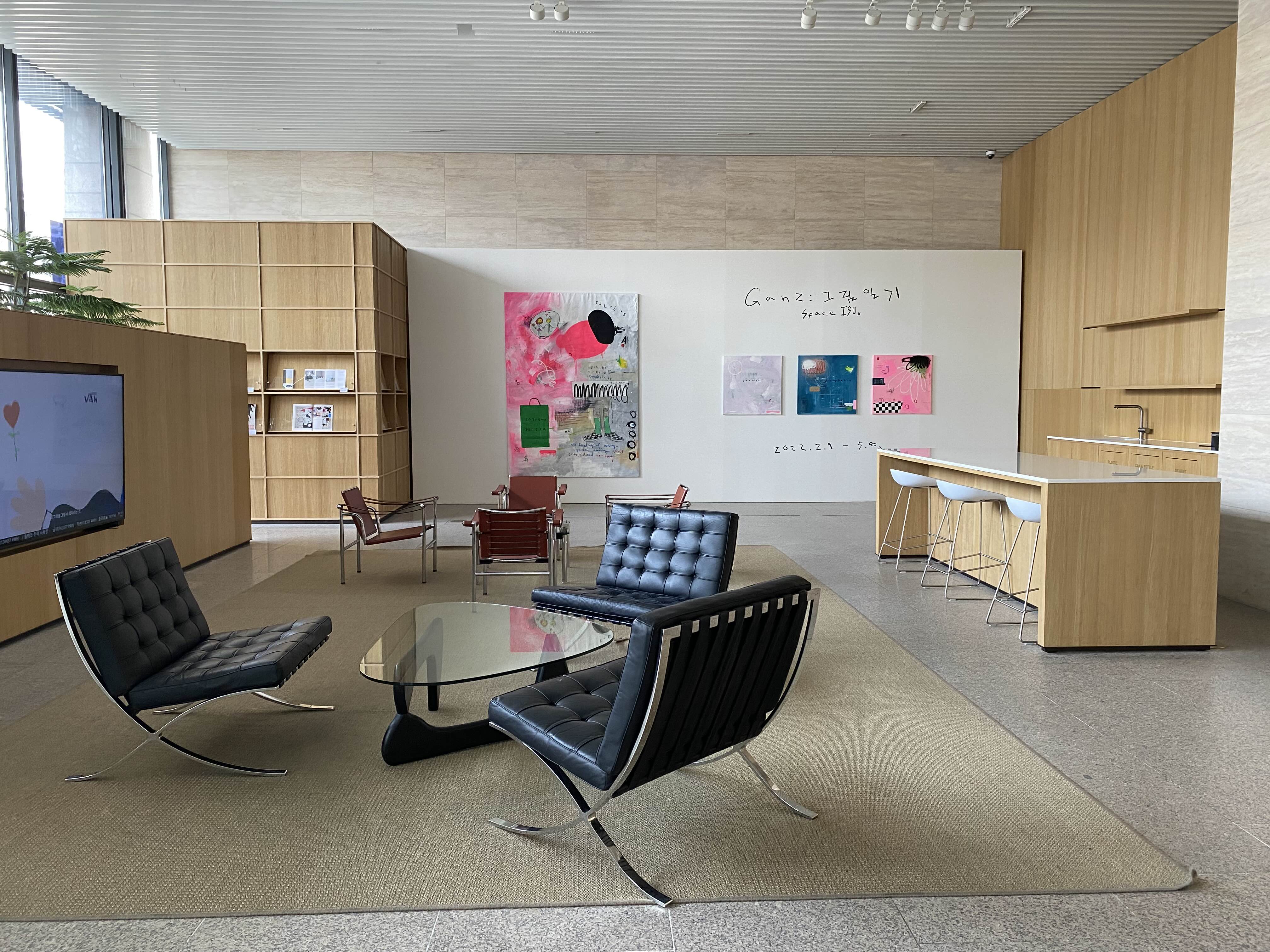 스페이스 이수는 이수그룹에서 운영하는 예술공간인데요. 2020년 6월에 오픈한 곳입니다. GANZ 작가의 그림일기 전시를 만날 수 있습니다. 이수화학 건물 로비 공간에 작품들이 전시되어 있습니다. 소소한 일상에서 영감을 받은 요소들이 화면 위에서 다채롭게 펼쳐지는 모습을 감상할 수 있습니다. GANZ 작가 외에도 제임스 터렐의 작품도 만날 수 있습니다.