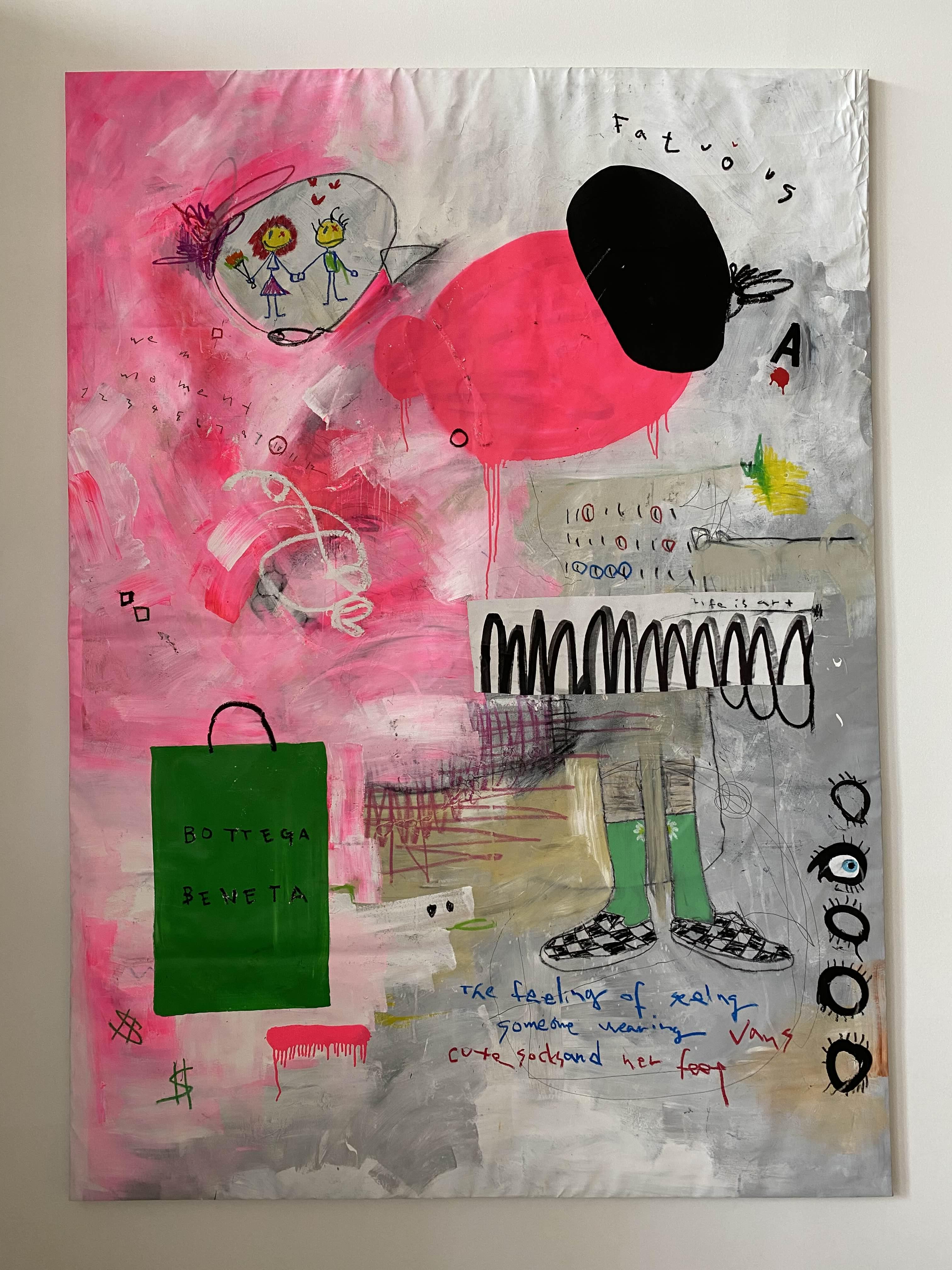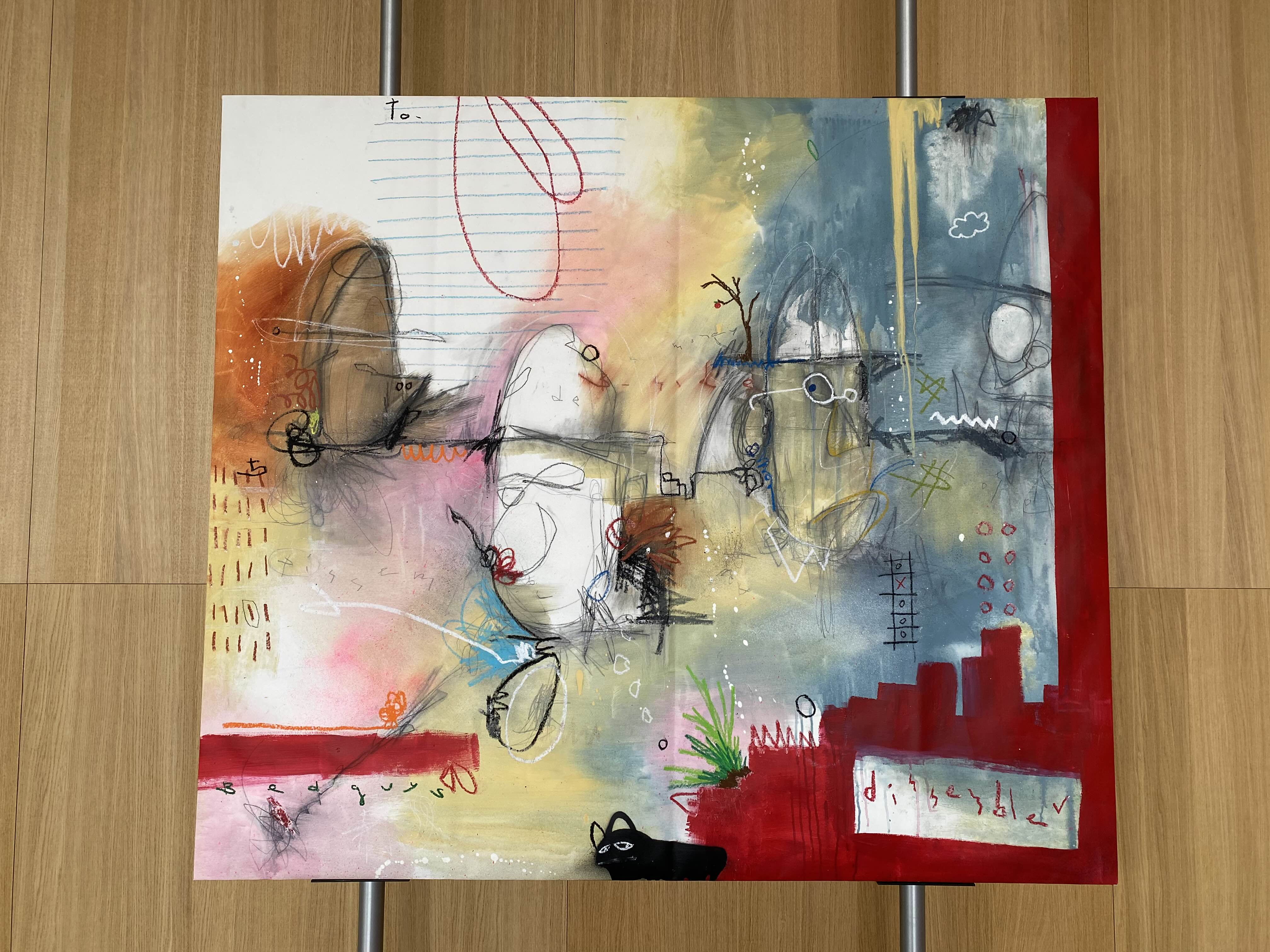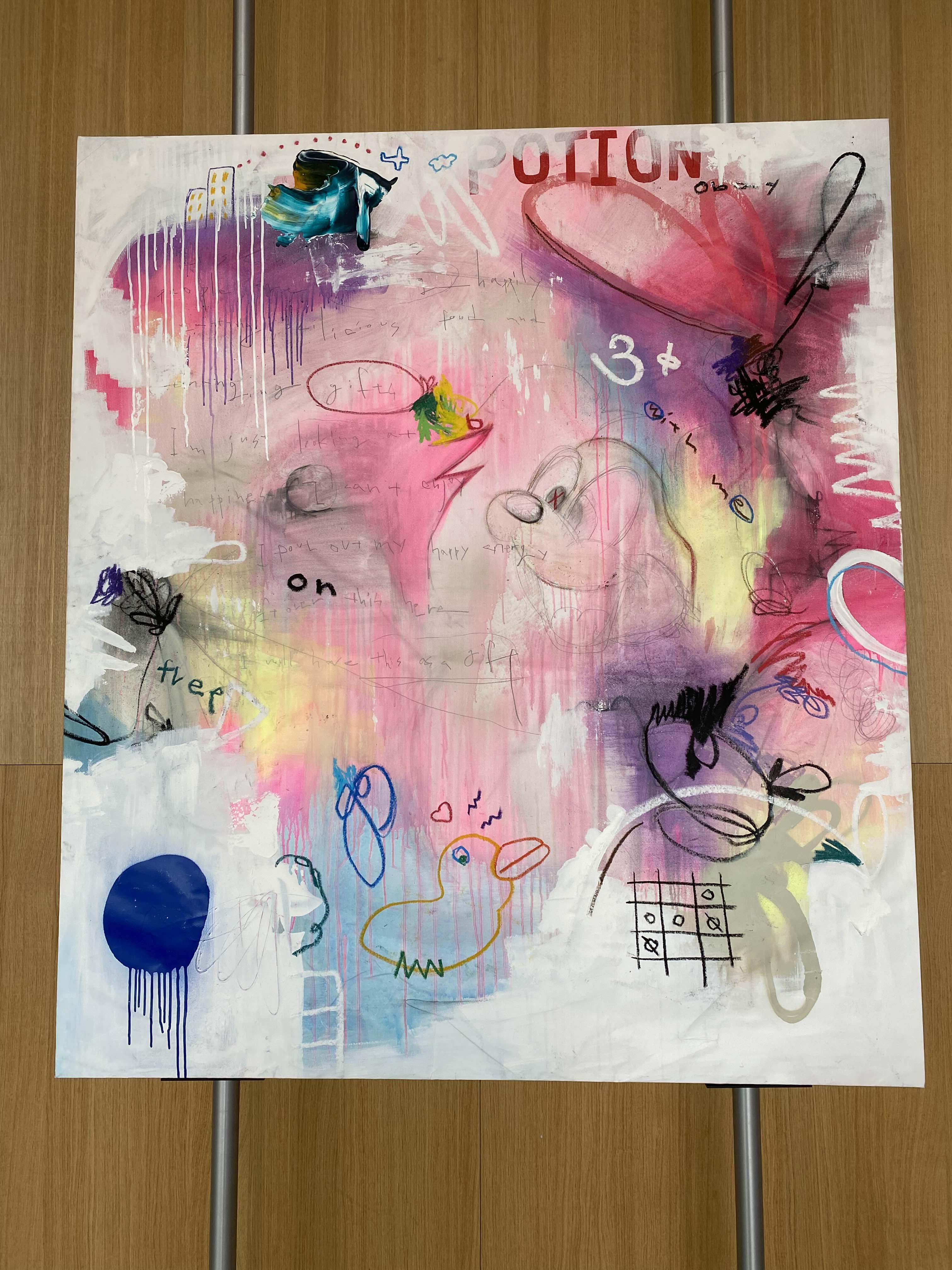 첫눈에 시각적으로 밀도 높은 조형미를 자아내는 화면은 아이러니하게도 어린아이의 낙서와 같은 미묘하고 자유분방한 화법으로 감상자의 시선을 사로잡는다. 그림일기장 같은 화면을 자세히 들여다보면 소소한 일상에서 영감을 받은 작가가 요소들을 수집하고 그것들을 펼쳐놓은 의도를 짐작해 볼 수 있는데, 구성적으로는 작가의 일상의 축소판이기도 한 화면은 이질적인 문자와 도상들이 포개지면서 혼재되어 독특한 분위기를 자아낸다. 이는 드로잉, 페인팅 및 콜라주 기법을 통해 화면을 오버랩하는 삶의 투영체가 되는 알파벳, 동물, 샌드위치 포장지, 캐릭터 등과 같은 다양한 일상 속 사물들이 작가의 기억 속에서 자유롭게 발췌되고 화면 위에서 결합되면서 시각적으로 매개되기 때문이다. 켜켜이 레이어로 쌓아 올려진 화면은 함축적 은유와 상징으로 하루에도 별별 사건이 동시다발적으로 발생하는 작가의 일상에 대한 소소한 인상(impression)을 창조한다. 이 지점을 통해 작품은 평면이지만 이야기의 의미가 강화되어 발화하는 그림일기와 같이 작동한다.