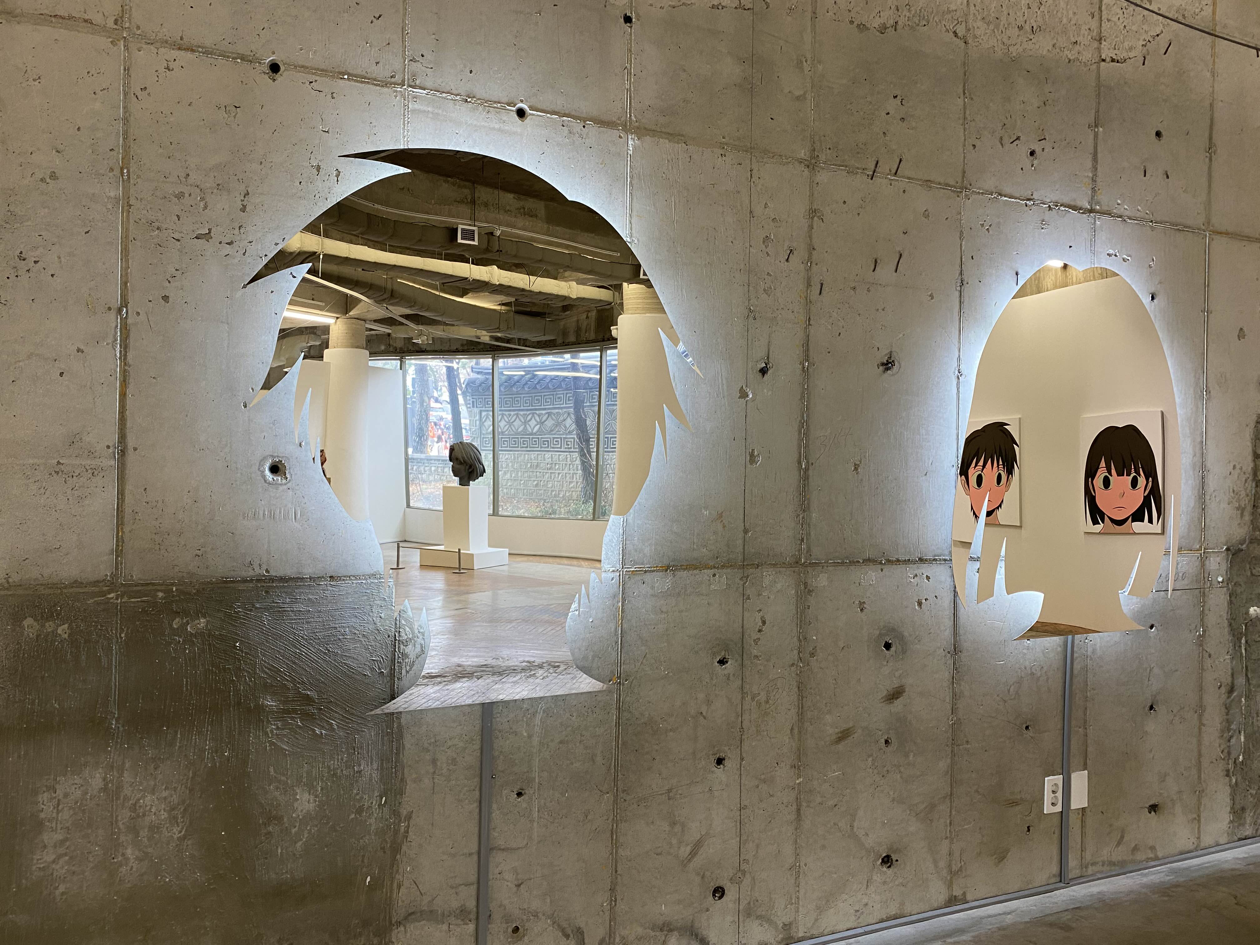 밴드 아도이의 앨범 디자인을 했던 옥승철 작가님의 전시입니다. 캐릭터 이미지에 대한 회화, 영상, 조각 등의 작품을 한 자리에서 만나볼 수 있습니다. 이번 전시의 제목인 크리에이트 아웃라인즈(Create Outlines)는 어도비 일러스트레이터의 명령어라고 합니다.