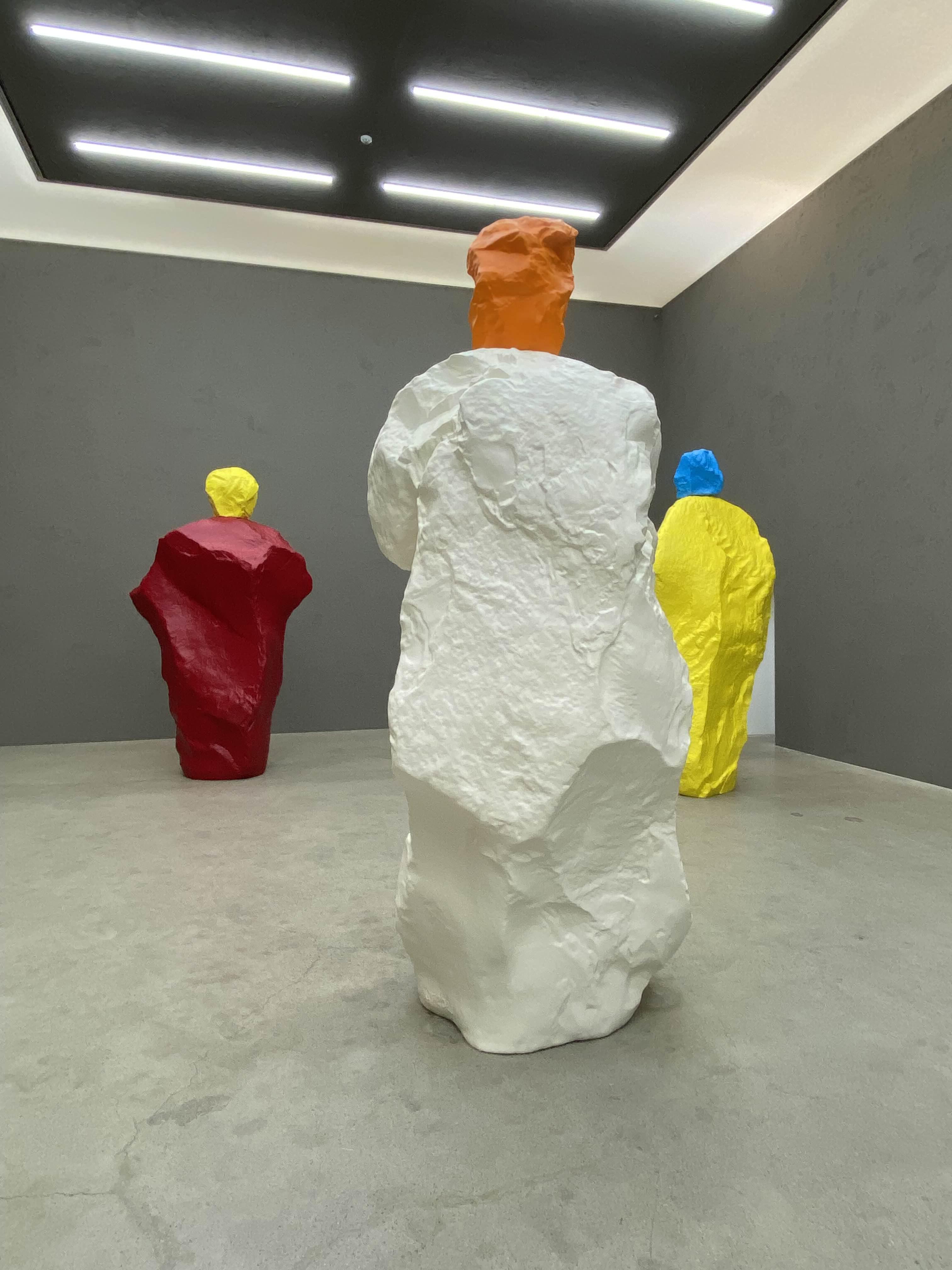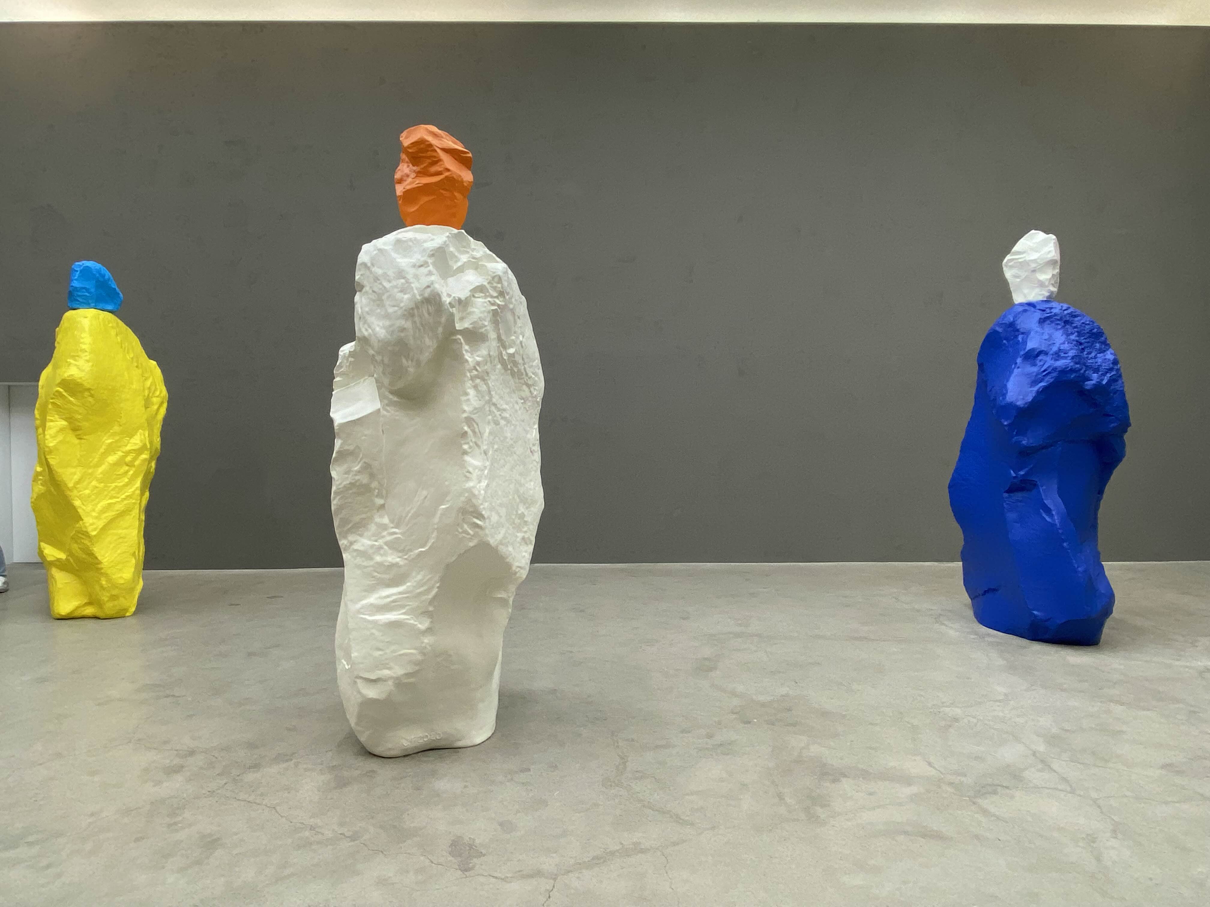 전시 제목에서 나타나듯, 이번 개인전은 국제갤러리 서울점 K3 공간에 설치된 우고 론디노네의 대규모 청동 조각 연작 〈nuns + monks〉를 주축으로 내세운다. 성인(聖人)의 신비로움과 엄숙함을 불러일으키는 다섯 점의 〈nuns + monks〉 조각들은 공간을 사로잡고 또 생기를 불어넣는다. 하나의 거대한 돌 위에 다른 색상의 작은 머리를 올린 이 의인형 조각들은 제각기 다른 개성을 발산한다. 관람객들의 키를 훌쩍 넘어 우뚝 솟은 신화적 존재들은 우상적 상징성으로 짓누르기보다는 열린 상태로 그들을 환영하며, 거칠게 깎인 작품 표면은 불안정한 독단성보다는 치유자의 풍성한 옷자락을 연상시킨다. 본래 작은 크기의 석회암 모형으로 제작되었던 작품을 작가가 스캔하고 확대하여 청동 주물로 재탄생시켰는데, 이 과정에서 습작의 내밀한 특징들을 포착해 섬세한 질감을 지닌 형태와 거대한 비율 사이의 절묘한 균형을 이루어 냈다. 무아의 황홀경을 선사하는 이 조각들은 바로크 미술가들이 작품에 담곤 했던 바람(wind)으로 고요히 마음을 움직인다.