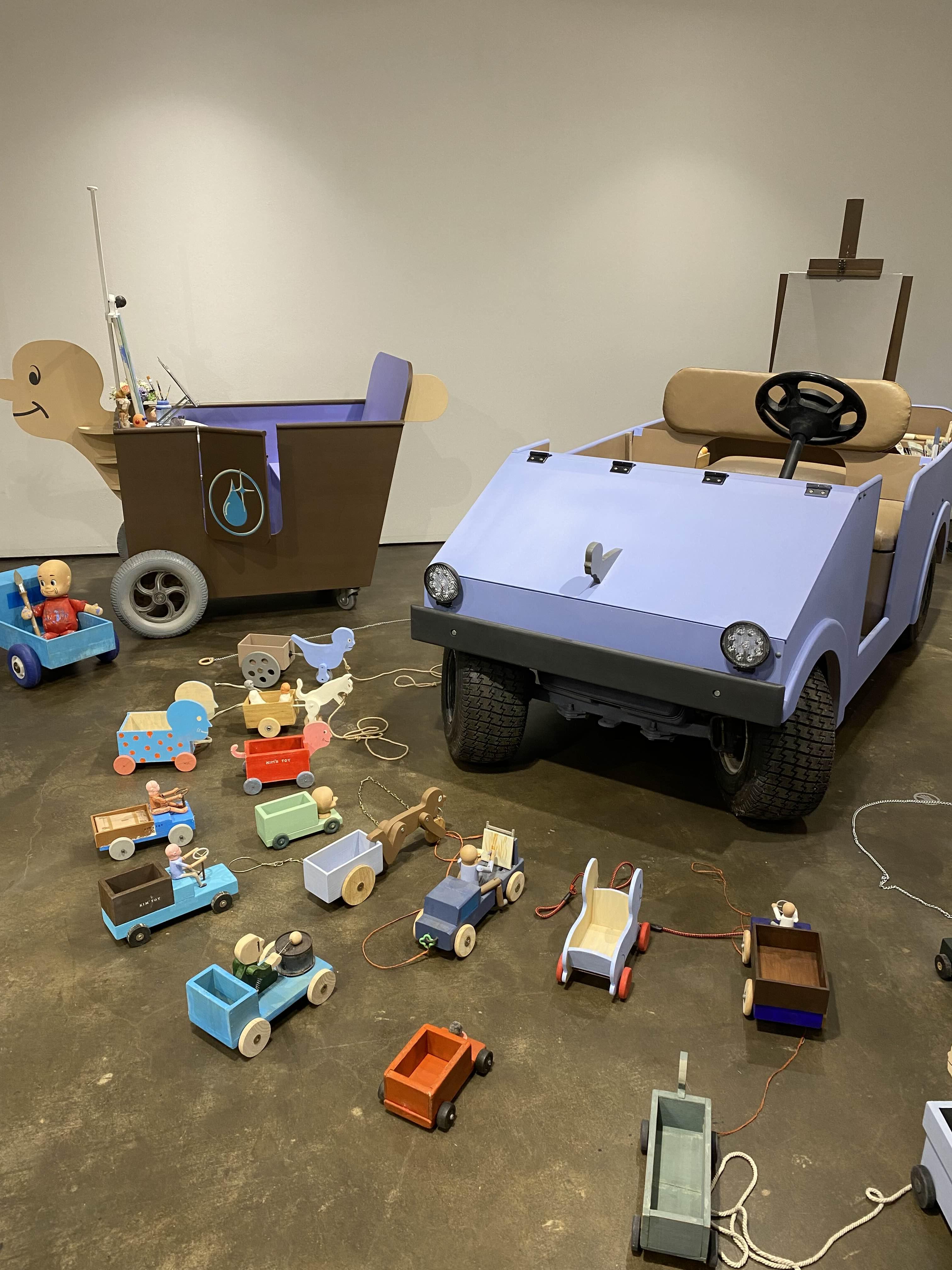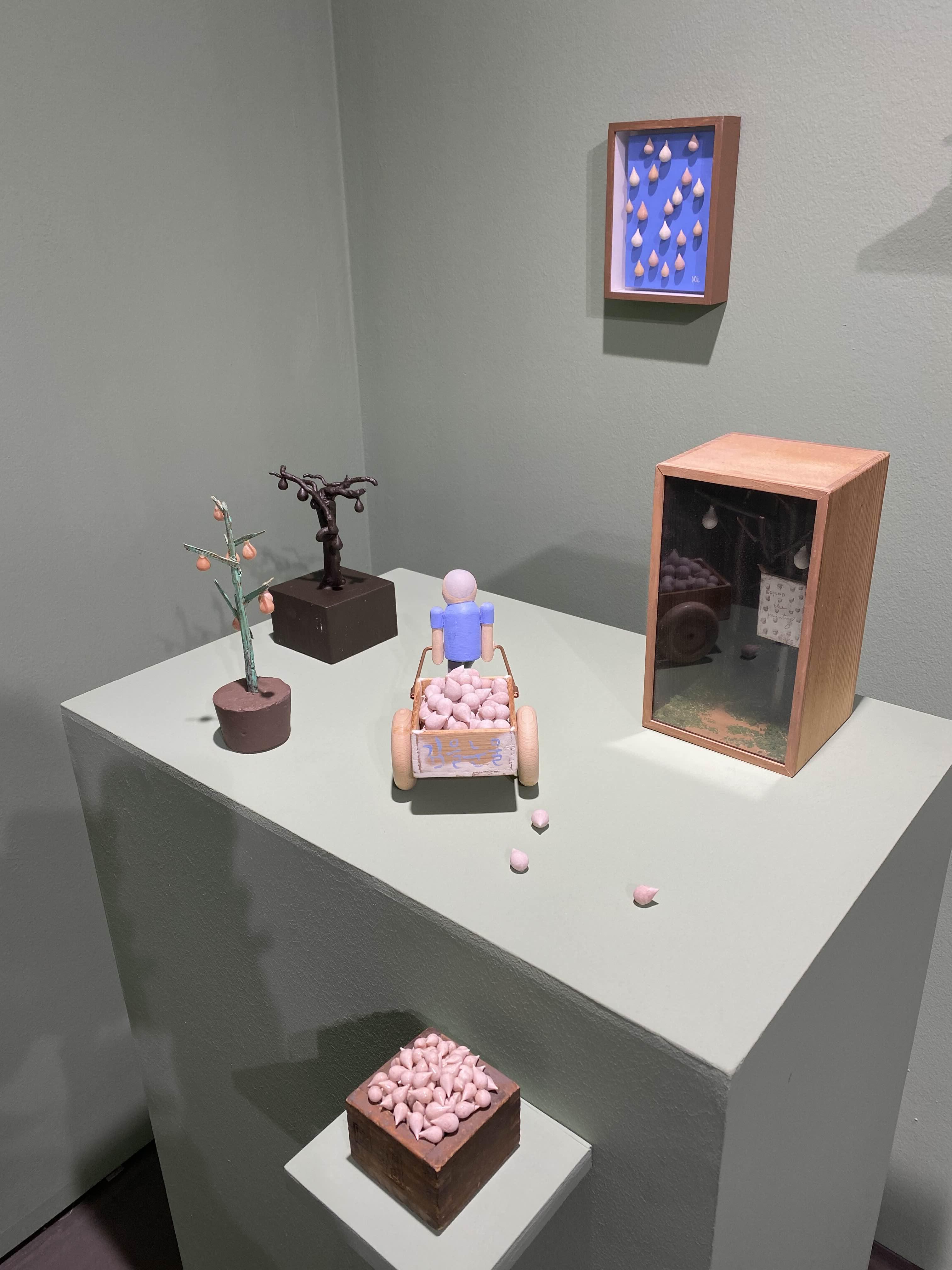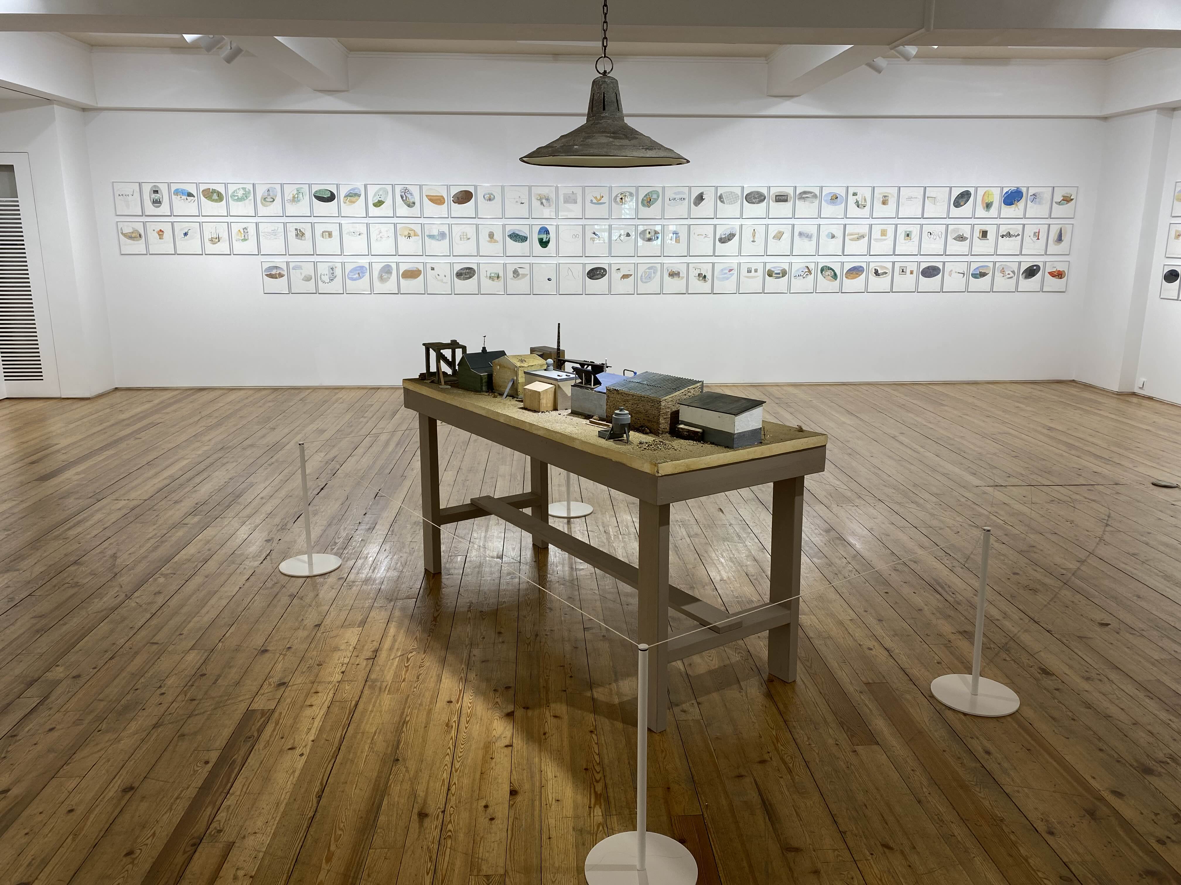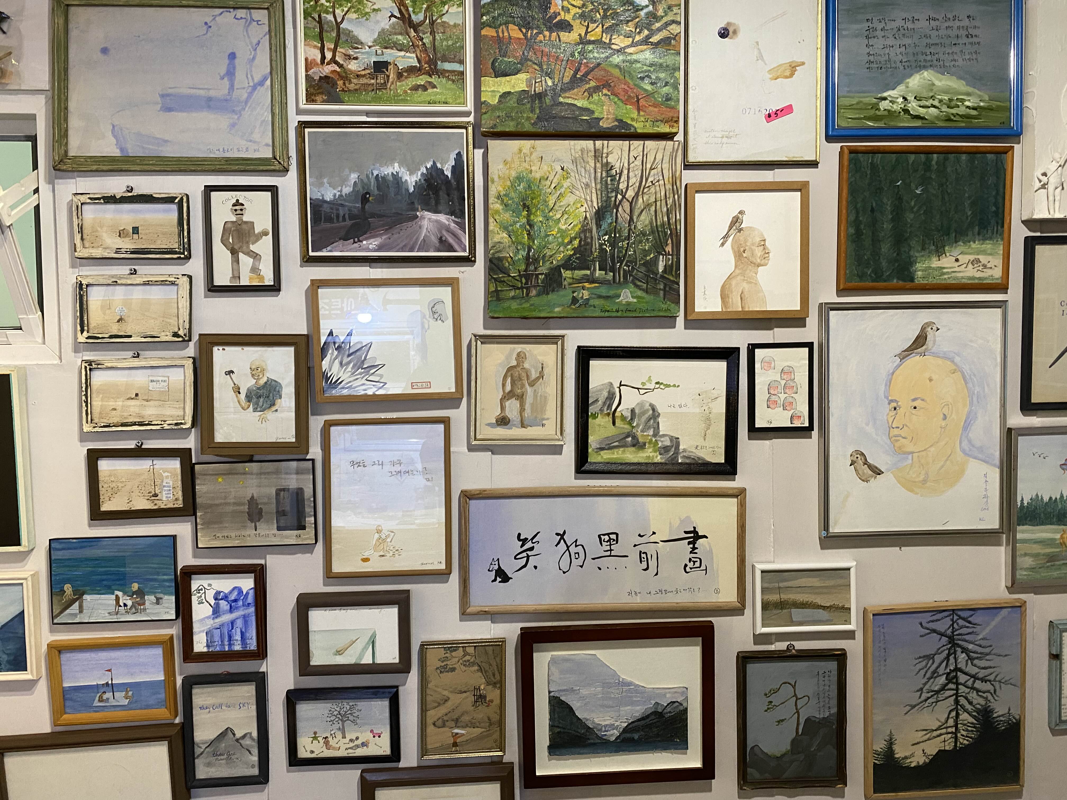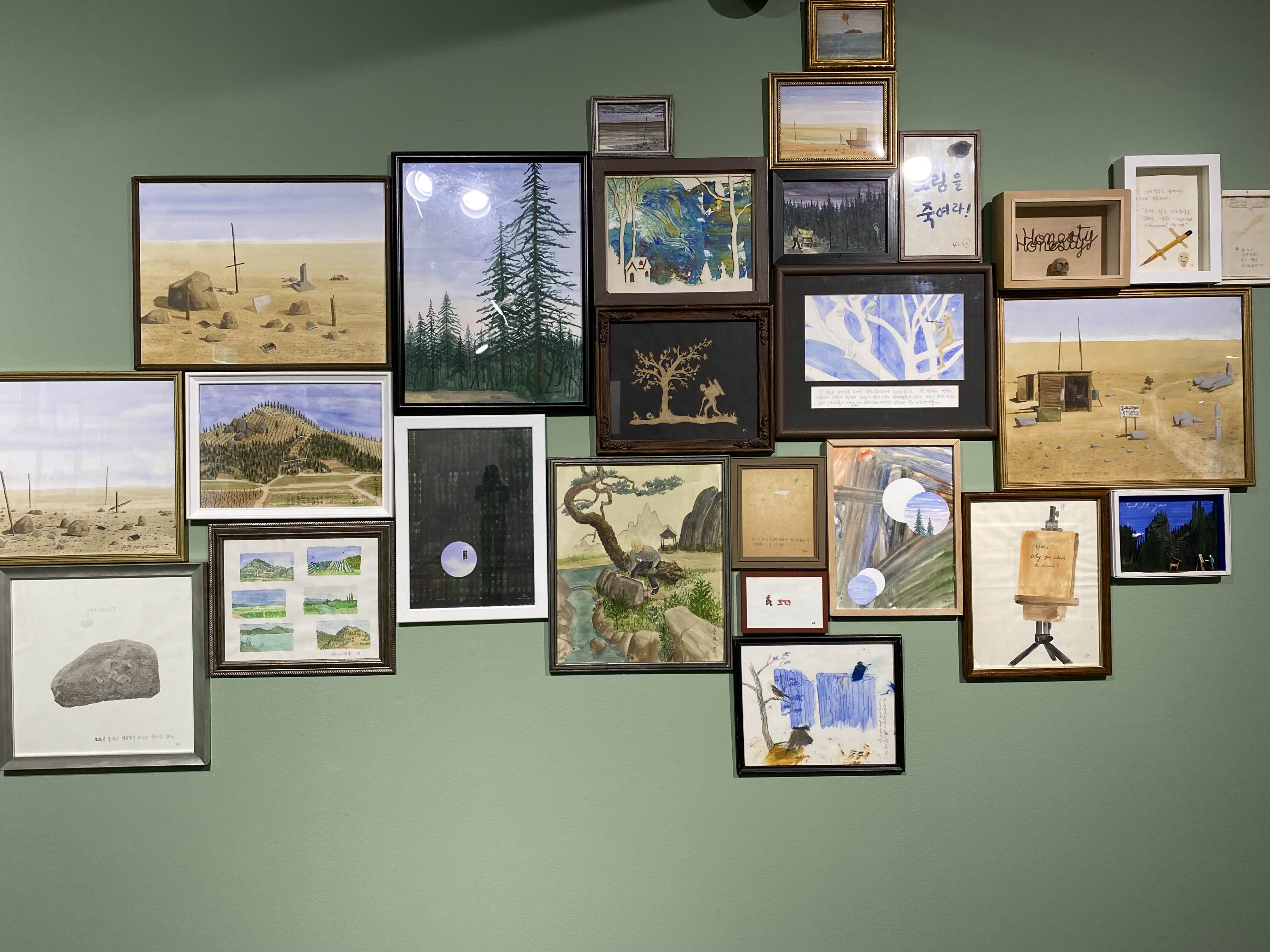 1층부터 3층까지 김을 작가의 회화, 사진, 글씨, 사진, 조각 등 다양한 작품을 만날 수 있습니다. 1층 전시장에 입장하면 작은 나무집이 보이는데요. 작가의 공간을 공간을 확인할 수 있습니다. 3층에서는 같은 크기의 그림이 전시장 3면을 꽉 채우고 있습니다. 볼거리가 풍부한 전시입니다.