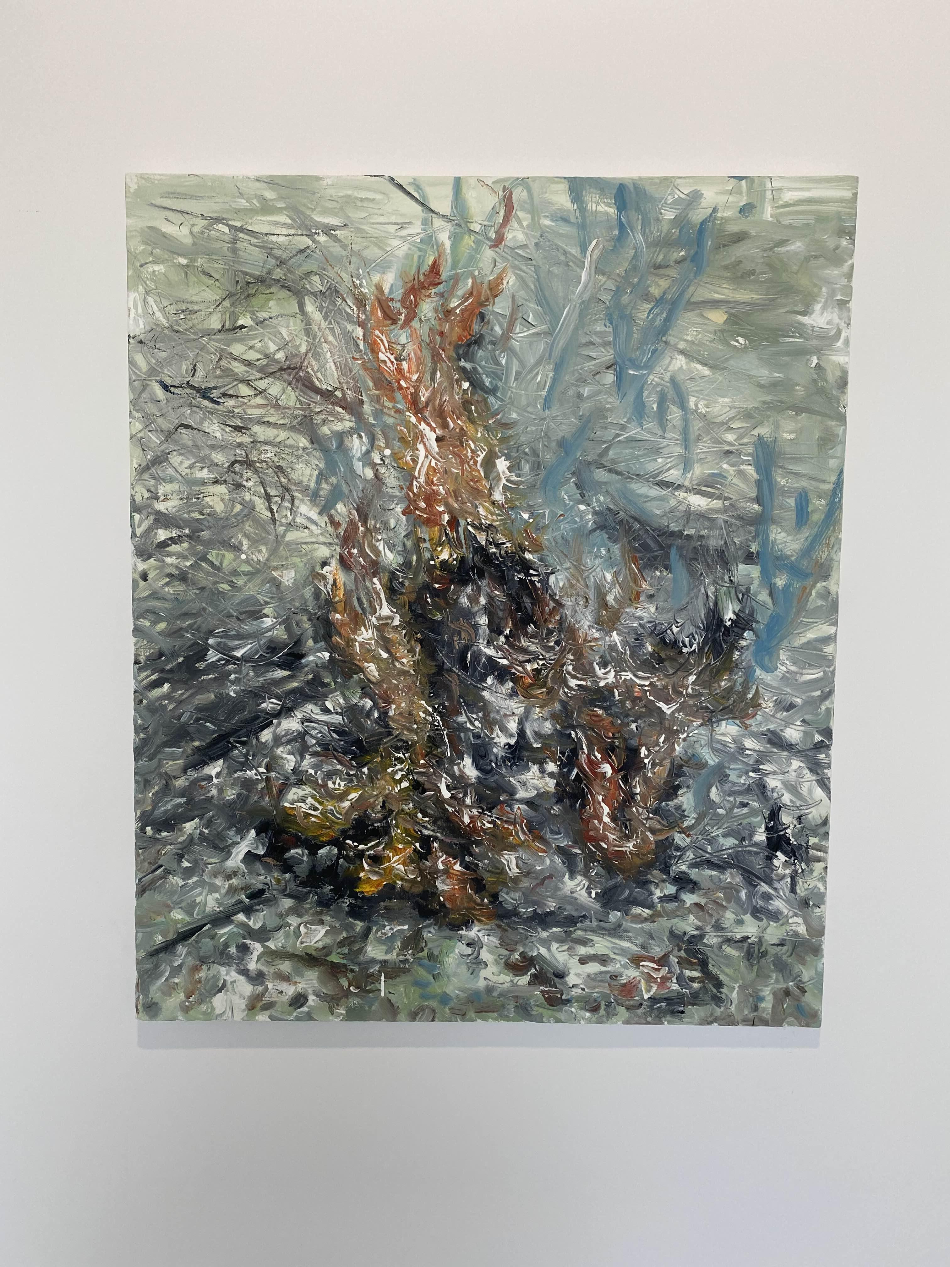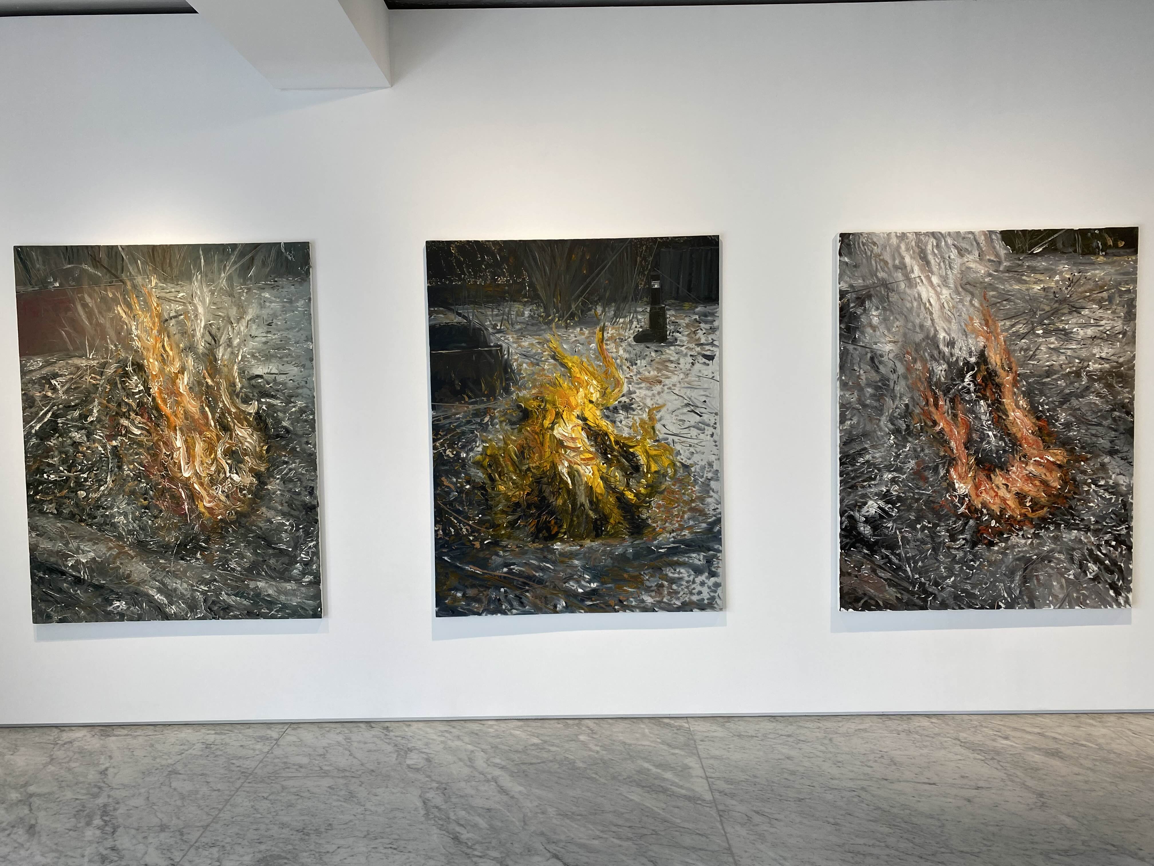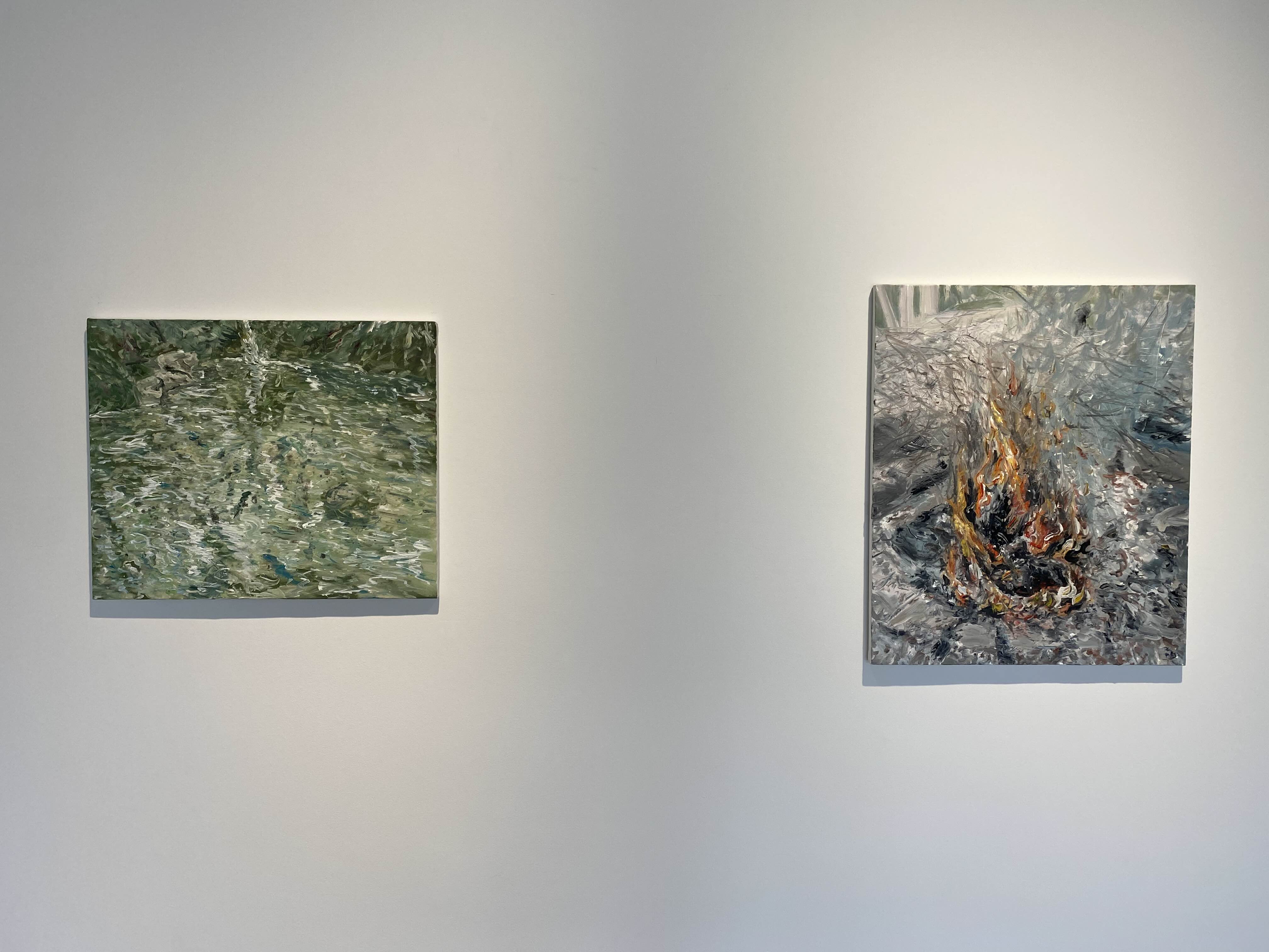 한편 별관의 <모든 형태 있는 것은 사라진다>는 ‘레몬’의 발랄함과 상반되는 지점의 연작으로, 작가가 마당에서 모닥불을 피우며 한 무망한 생각에서 비롯되었다. 모든 것을 태워버리는 불은 유형의 것을 사라지게 하면서도, 이를 정신과 같은 다른 무형의 것으로 소생시킨다는 점에서 역설적이다. 이 연작의 화면 속 흩어지는 불씨가 바람을 타고 날아오르는 형국이라면, 함께 설치된 <풍경화> 안 엉겨있는 풀들과 계곡의 물길은 바람을 따라 생동한다. 작가가 작업실과 집 주변을 산책하면서 만난 정경이 화면 위 풍경화가 되었다.