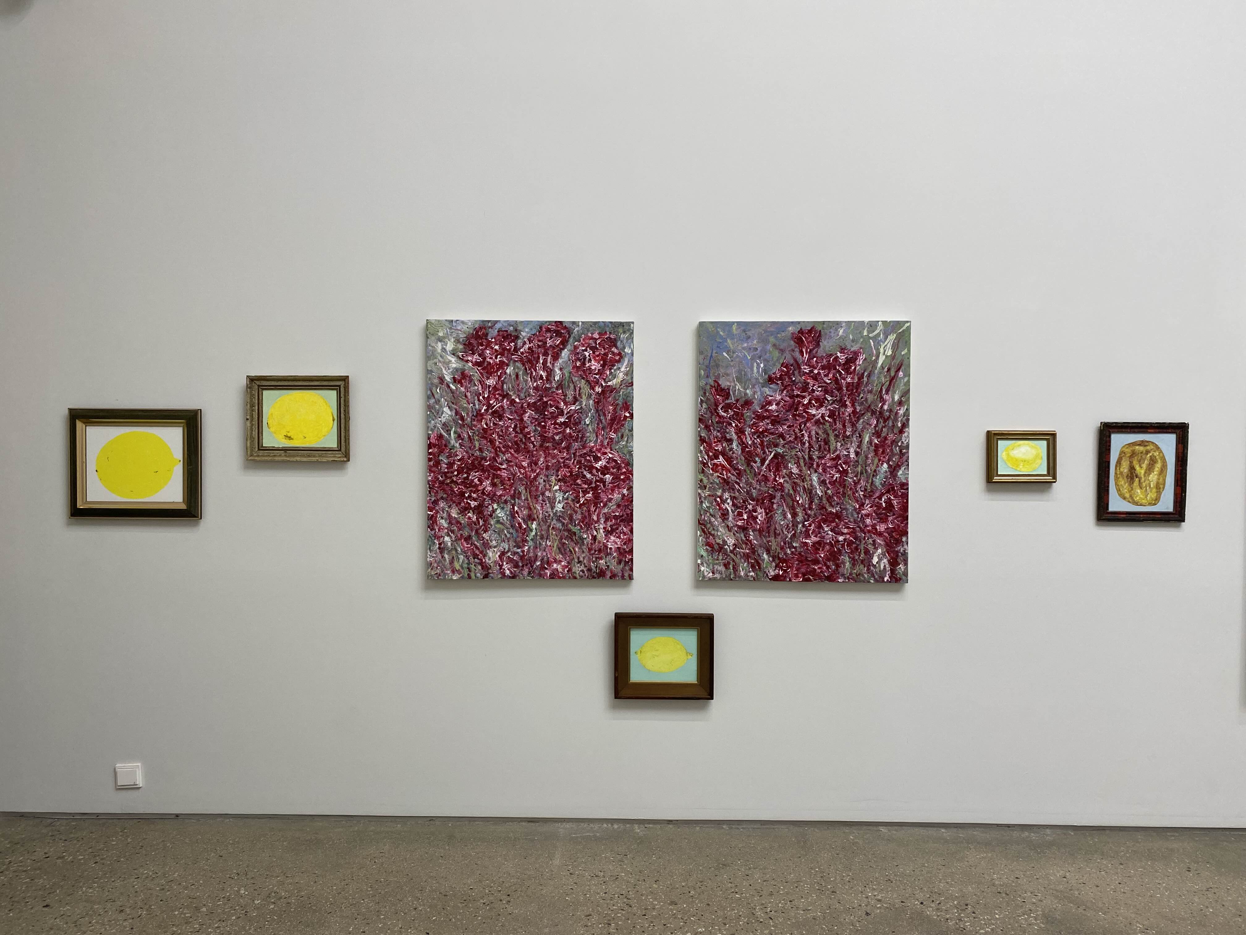 갤러리 본관에 전시되는 <맨드라미>에서는 붓과 쇠 주걱으로 짓이긴 유화 물감, 묽은 안료와 안료의 찌꺼기, 흩뿌려진 기름 방울 사이로 꽃이 자라고 소멸한다. 이 연작은 작업실 뜰에 뿌린 한 줌 씨에서 솟아나 한여름 뜨거운 해를 머리에 인 채 이글거리다 후드득 사그라지는 맨드라미의 생사를 그려낸 작업으로, 화려함 이면에는 독사와 같은 욕망이 잠재한다. 이 동물적인 식물이 거침없이 피어난 전시 공간에 <레몬>의 상큼함이 부유한다. 대기를 소독하듯이, 늘어진 신경을 건드리듯이, 맥없는 현시점에 탄산음료와 같은 각성의 단잔을 관람객에게 불쑥 권하고 있는 것이다. <레몬> 연작의 일부는 김지원이 오랜 기간 수집하여 스튜디오 한 켠에 보관해 온 액자 틀에 프레이밍 되었다.