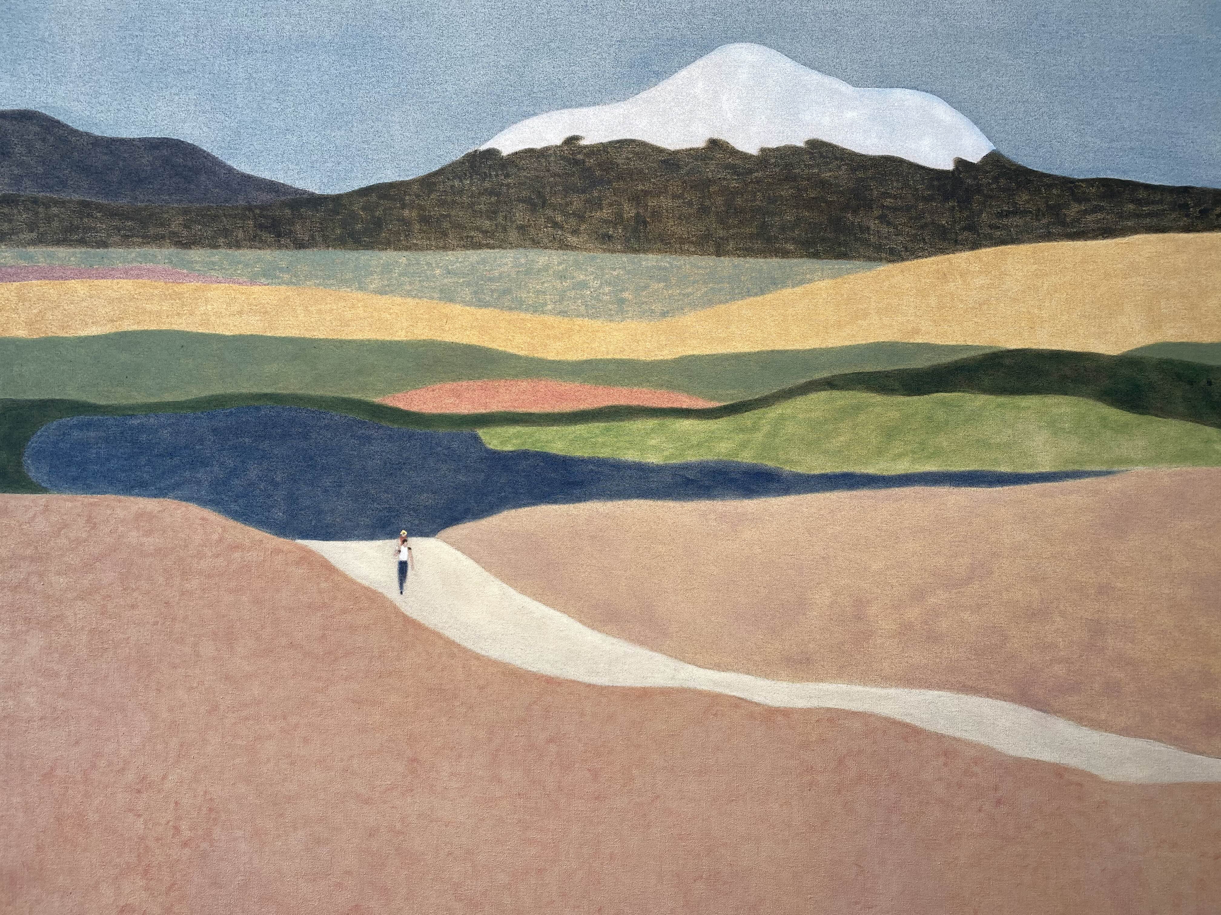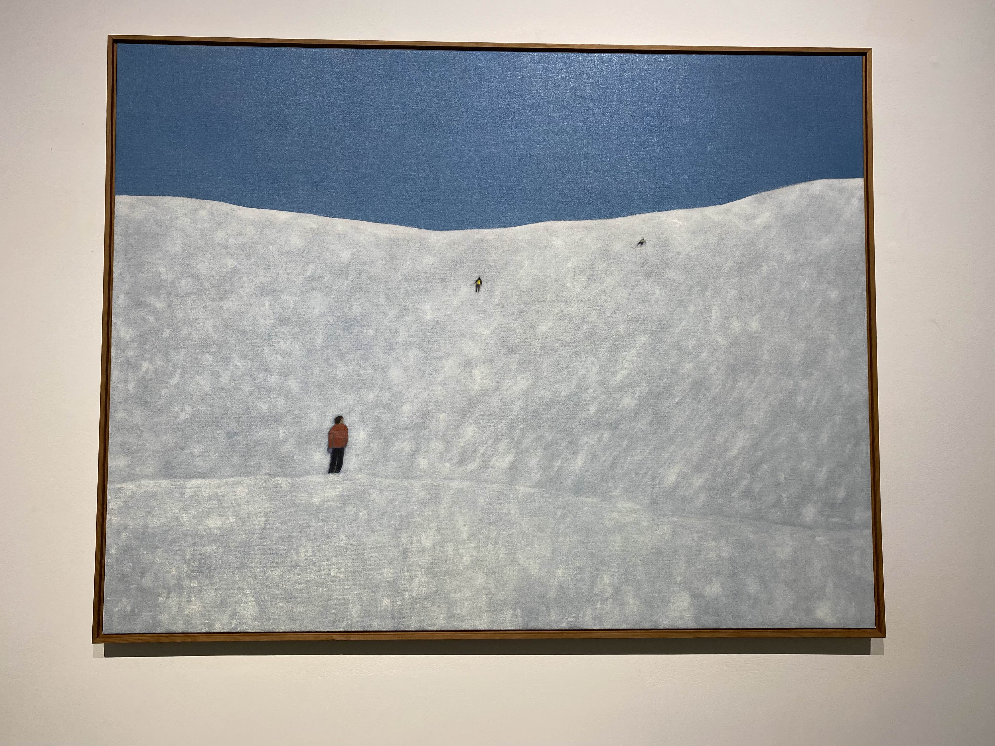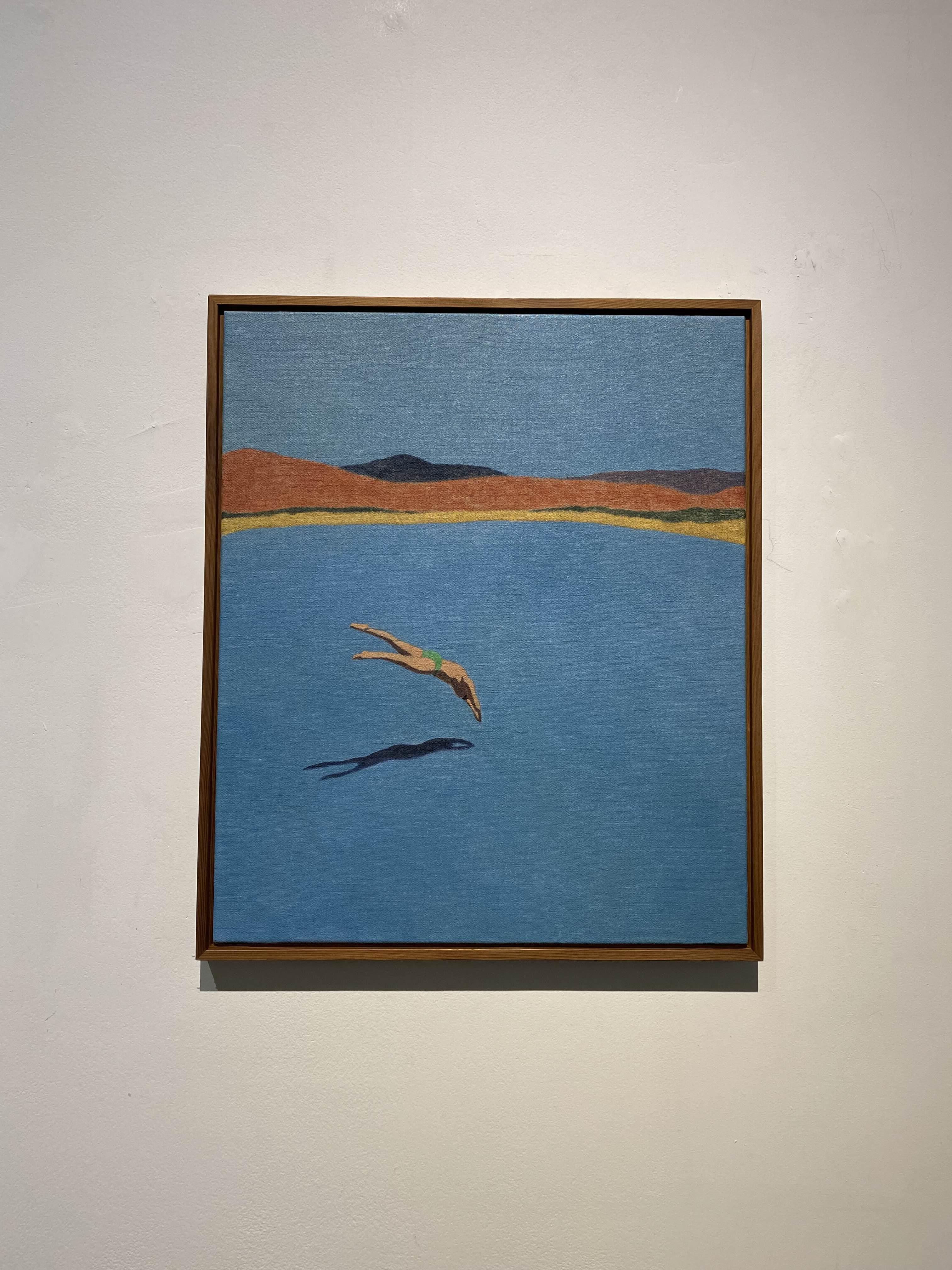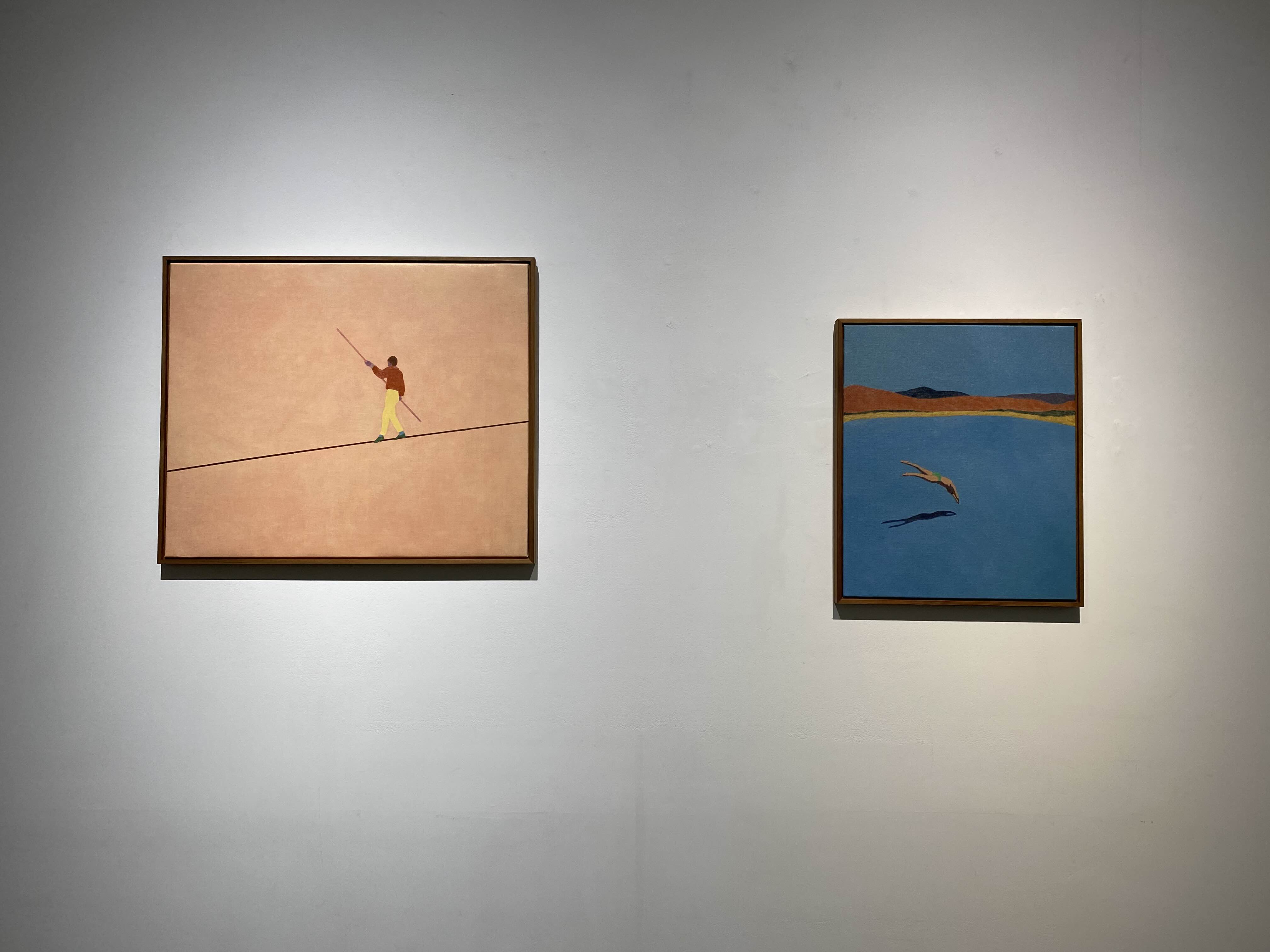 작품들의 중심 객체인 자연과 인간은 서로 대치하지 않고 광활한 대지의 인간이 눈 덮인 설산을 홀로 오르거나 끝이 없을 것만 같은 길을 묵묵하게 걷고 있다. 마치 인생에 대해 말하는 것처럼 사막에 던져져 홀로 유영하는, 그리고 그에 대하여 긍정도 부정도 하지 않아 오히려 위로가 되는 풍경이다. 예를 들어 작품에서는 단잠을 자는 한때를 단순한 형태, 많지 않은 컬러의 배합으로 탁월하게 묘사한다. 전시작에서도 다이빙하는 한 남자의 모습이 그려져 있는데, 마치 적막이 흐를 것만 같은 매우 단순화된 자연의 고요한 정취를 배경에 인물이 물속으로 뛰어드는 순간을 표현한다.