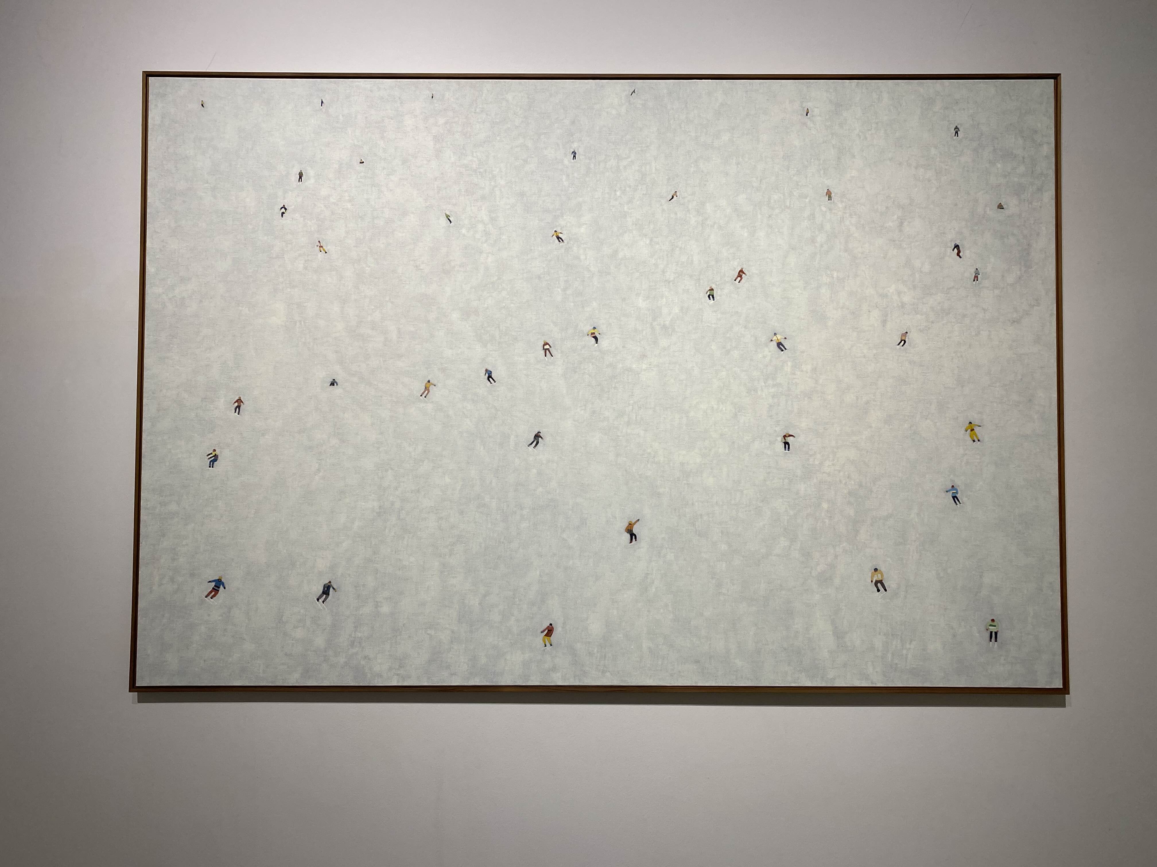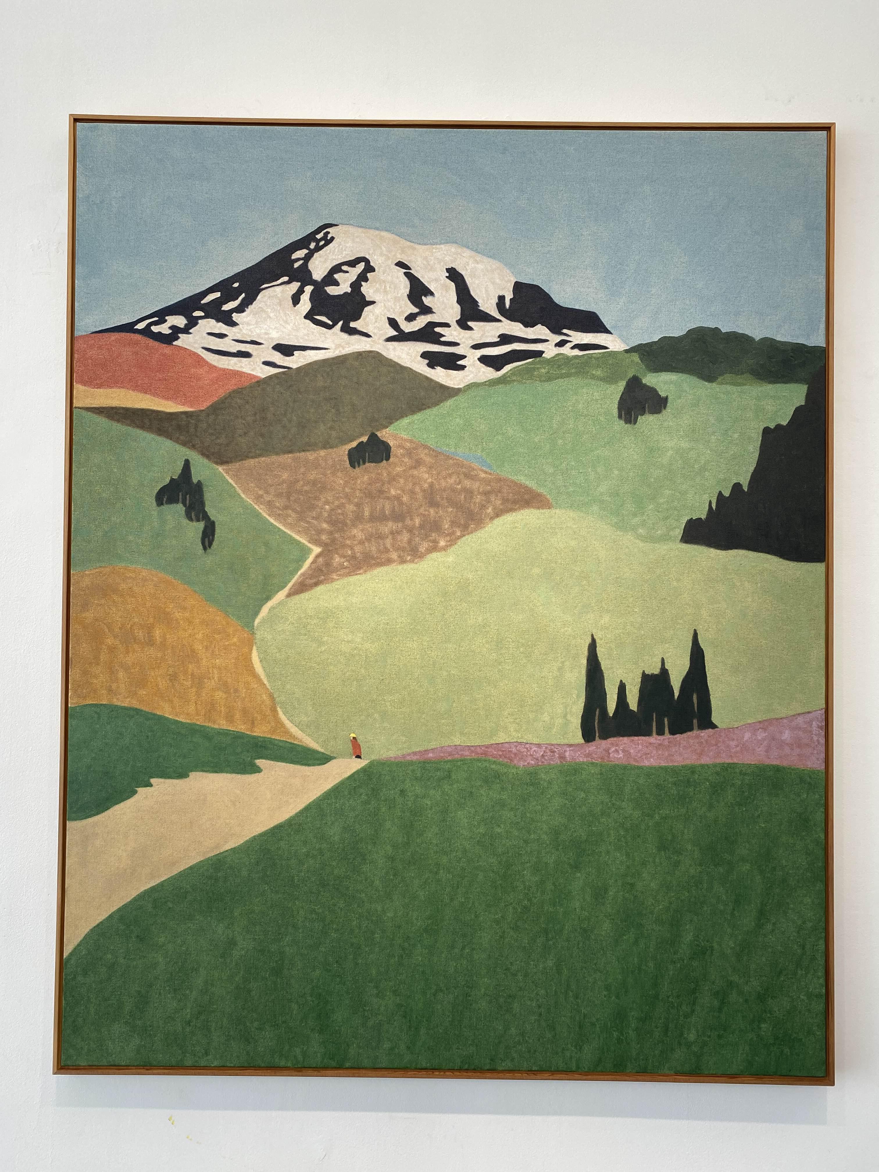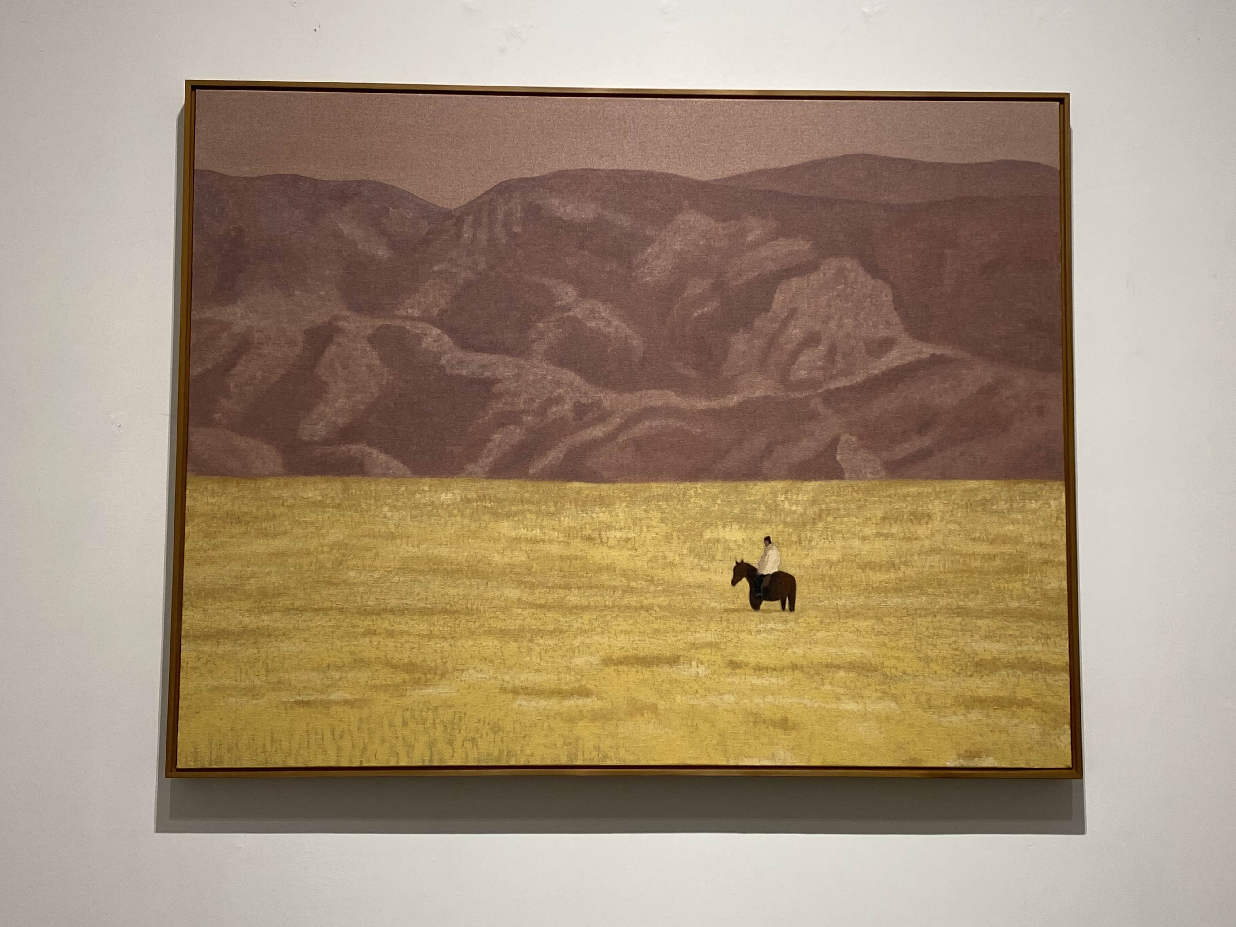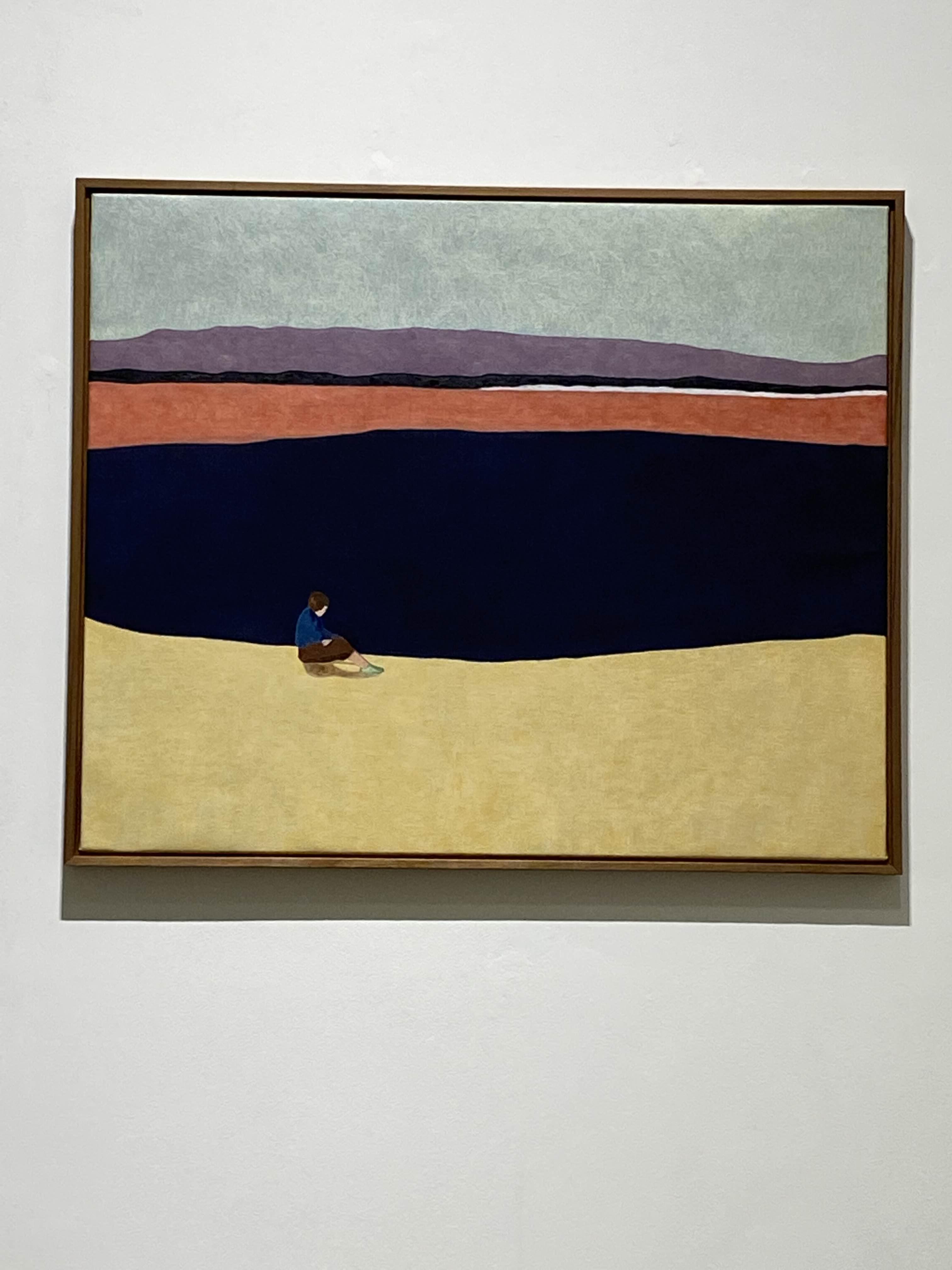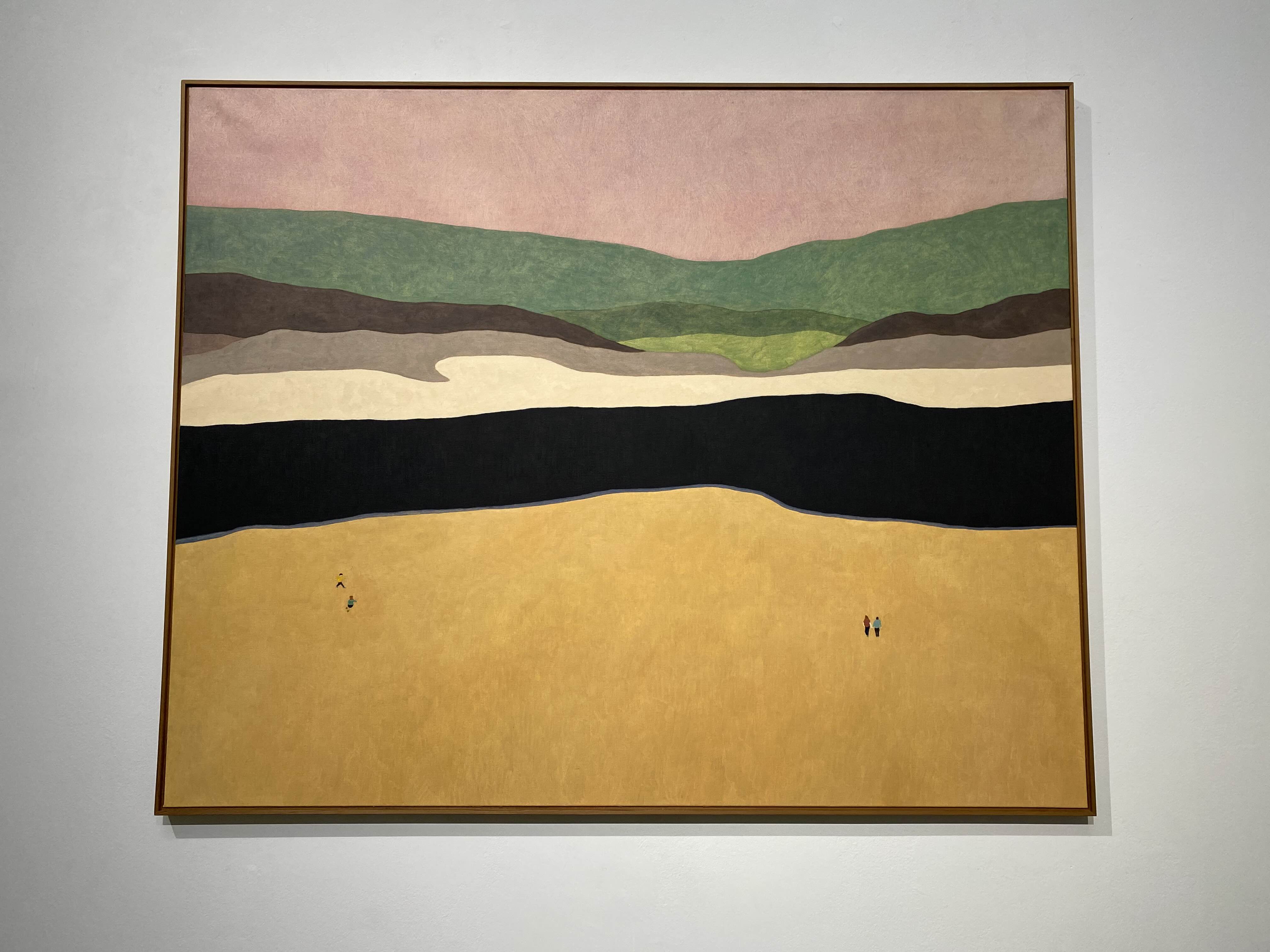 작품들의 중심 객체인 자연과 인간은 서로 대치하지 않고 광활한 대지의 인간이 눈 덮인 설산을 홀로 오르거나 끝이 없을 것만 같은 길을 묵묵하게 걷고 있다. 마치 인생에 대해 말하는 것처럼 사막에 던져져 홀로 유영하는, 그리고 그에 대하여 긍정도 부정도 하지 않아 오히려 위로가 되는 풍경이다. 예를 들어 작품에서는 단잠을 자는 한때를 단순한 형태, 많지 않은 컬러의 배합으로 탁월하게 묘사한다. 전시작에서도 다이빙하는 한 남자의 모습이 그려져 있는데, 마치 적막이 흐를 것만 같은 매우 단순화된 자연의 고요한 정취를 배경에 인물이 물속으로 뛰어드는 순간을 표현한다.