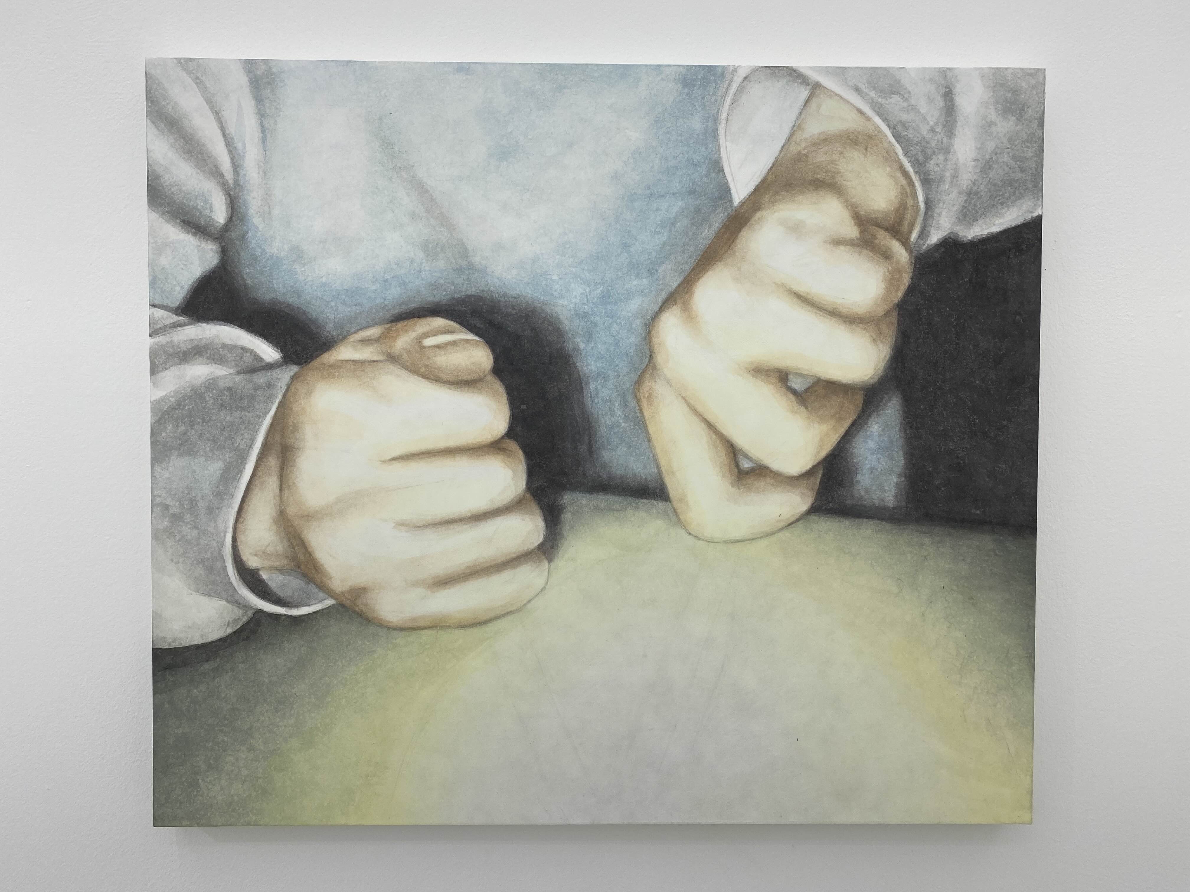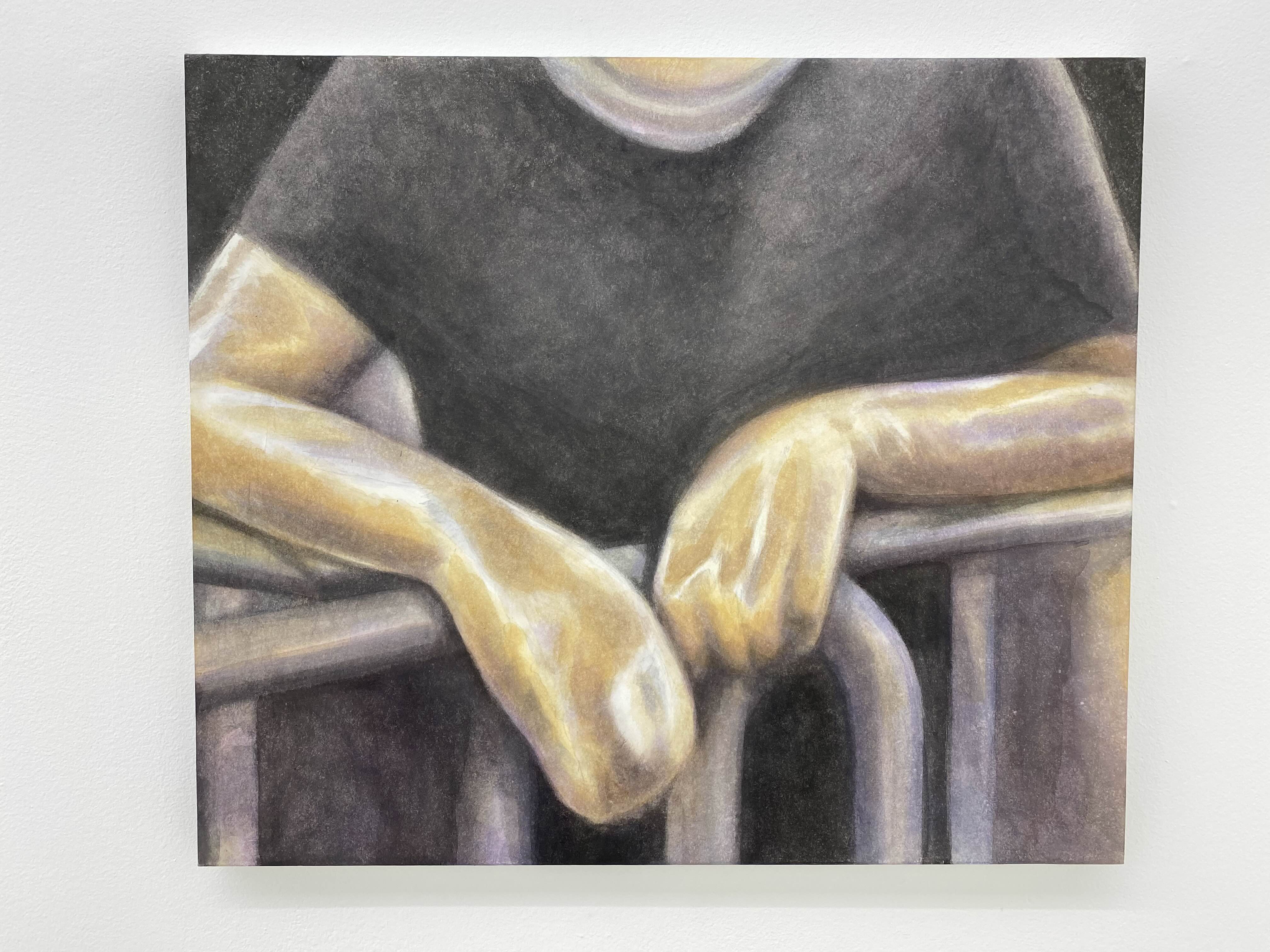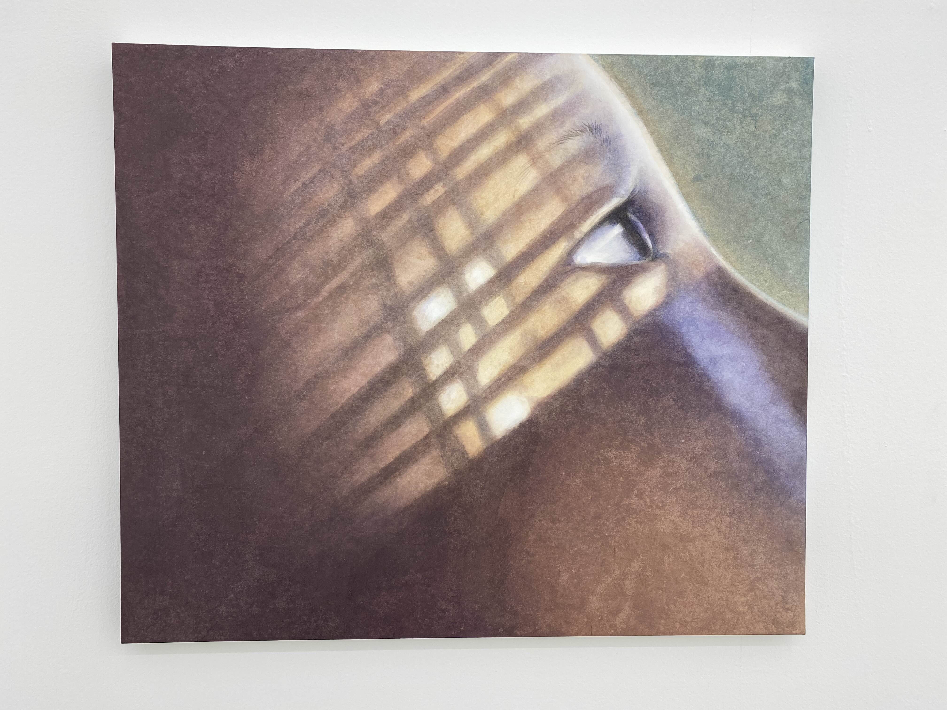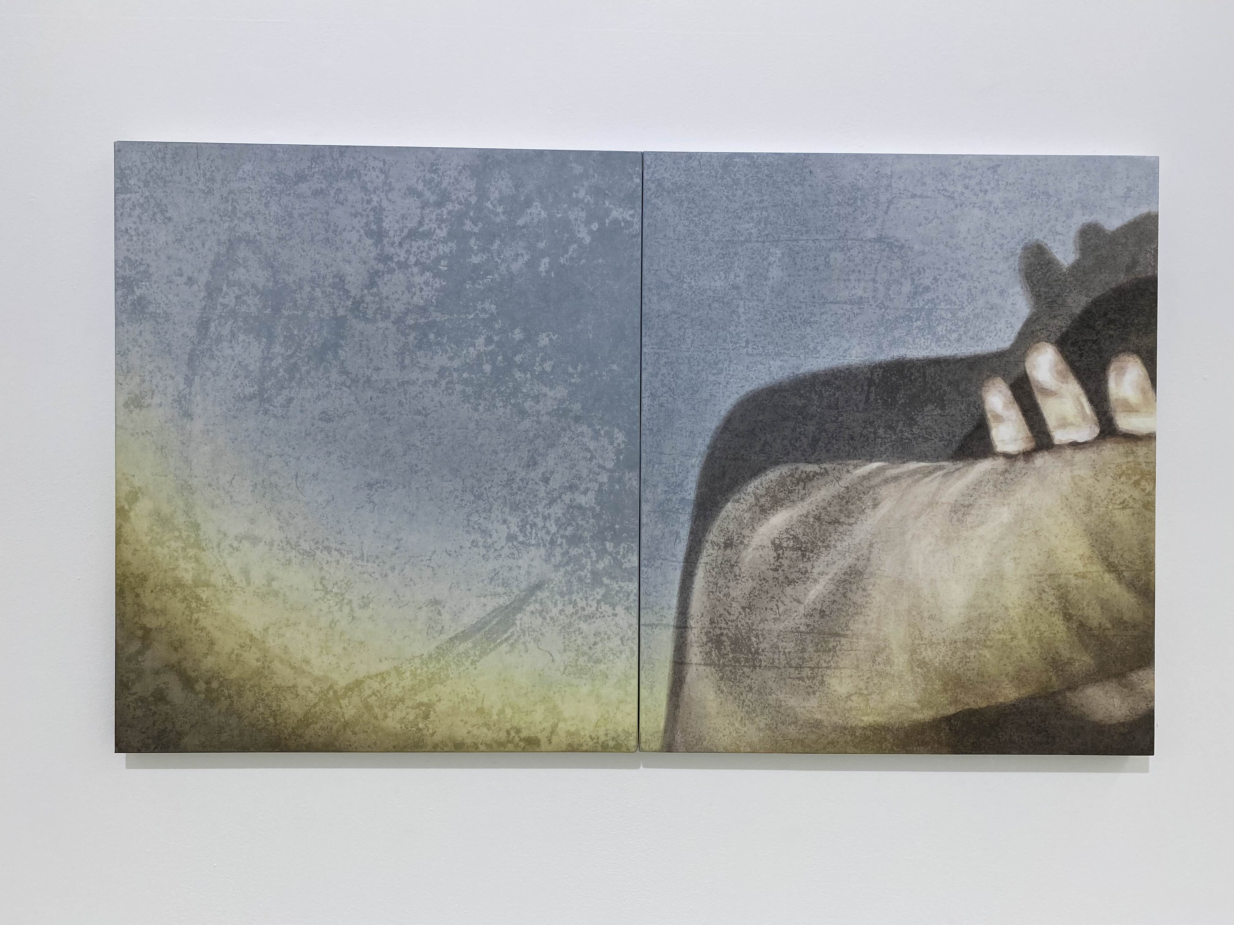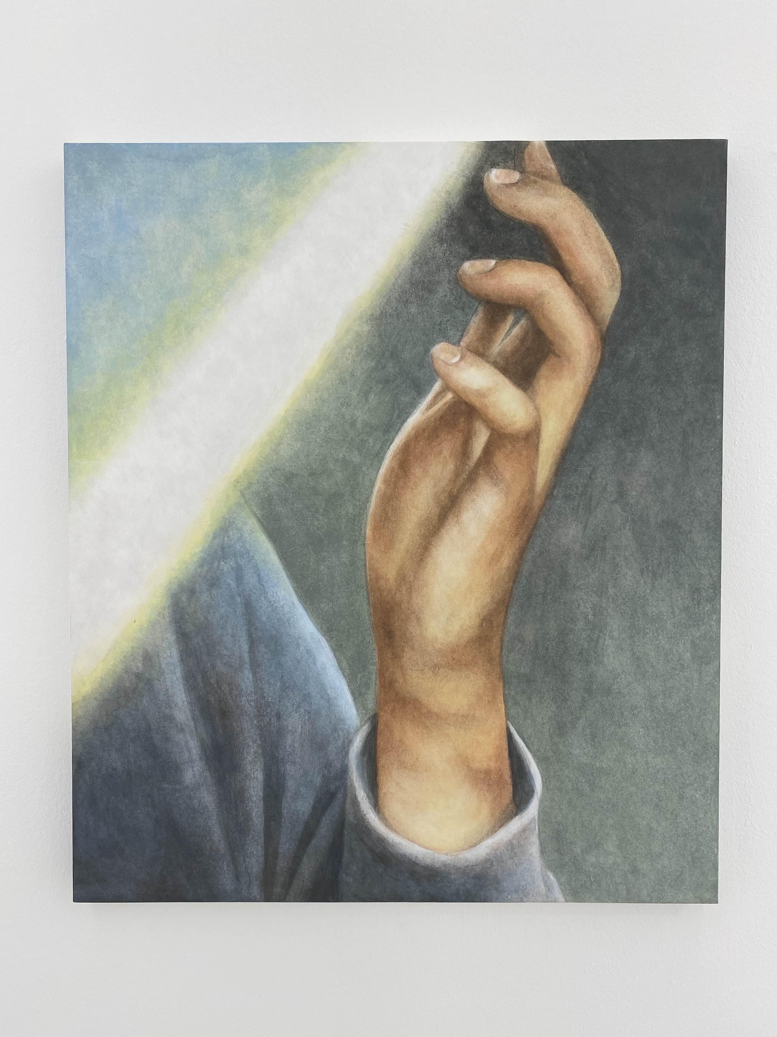 이번 전시에서 작가는 그동안 모아 온 기록의 조각들을 꺼내어 소재로 삼고 있는데 그 대상들은 난간에 기대어 있는 사람 혹은 손과 얼굴 같은 신체의 일부이거나 미디어 속의 인물로 누구나 일상 속에서 마주할 수 있는 이미지이다. 하지만 작가의 그림 안에서 이 이미지들은 어딘가 낯선 느낌을 준다. 새로운 작품 속의 빛은 자연스럽게 드리운다기보다 어둠 속에서 조명을 켠 듯 인위적으로 피사체를 비춘다. 불빛 안에서 손은 신체의 질감을 잃고 익명의 피사체로써 인위적으로 환하게 빛날 뿐이다.
