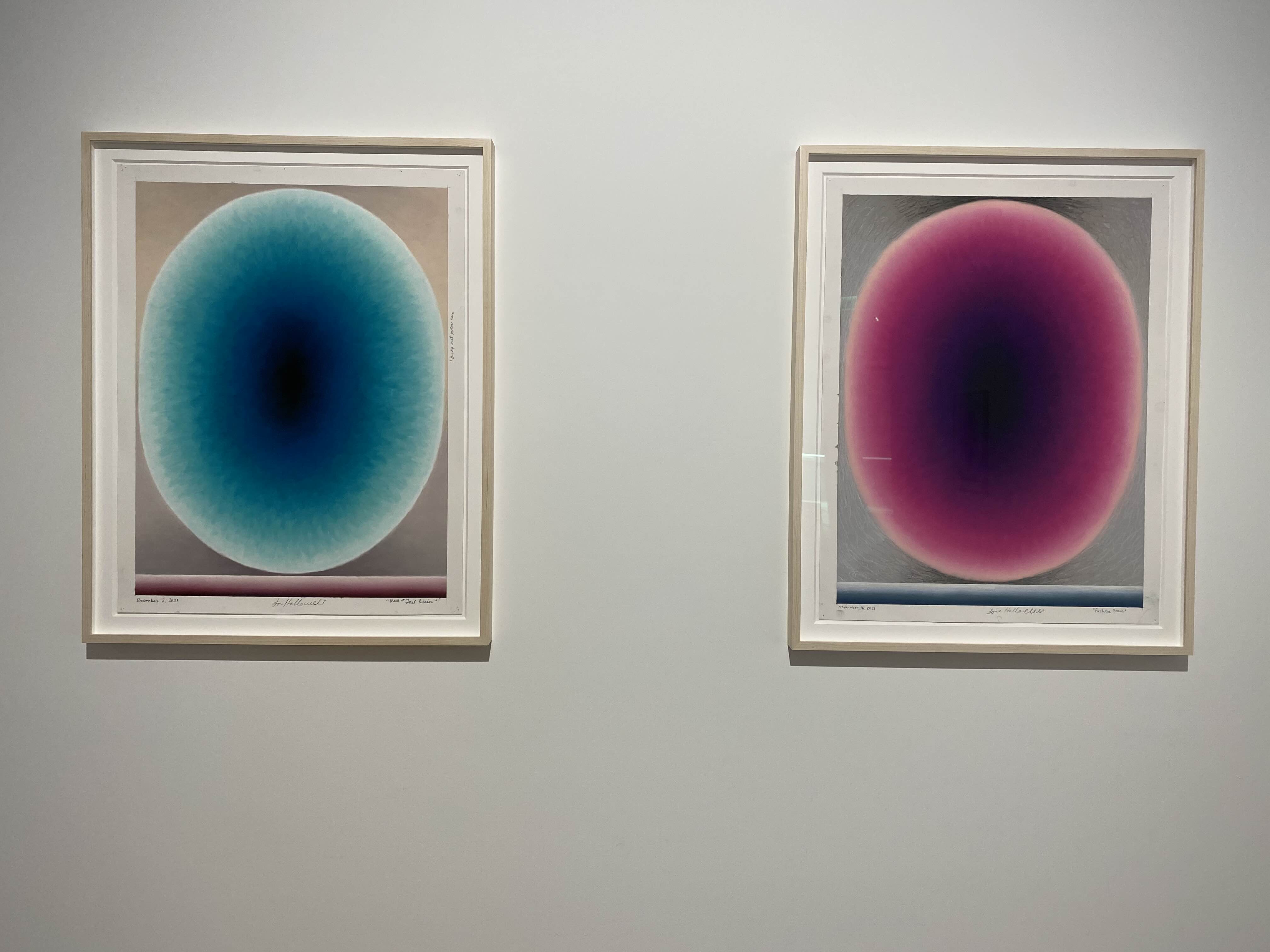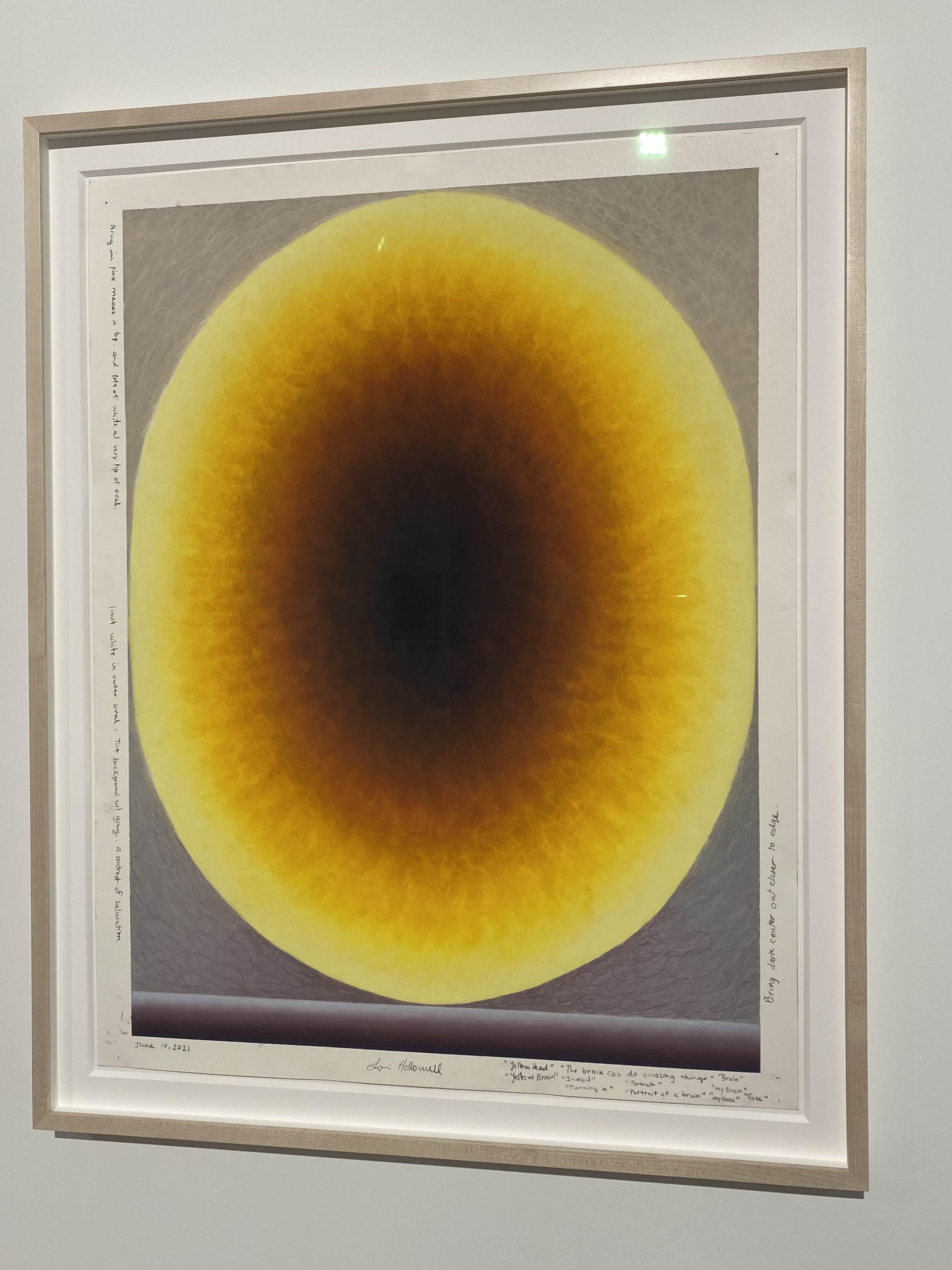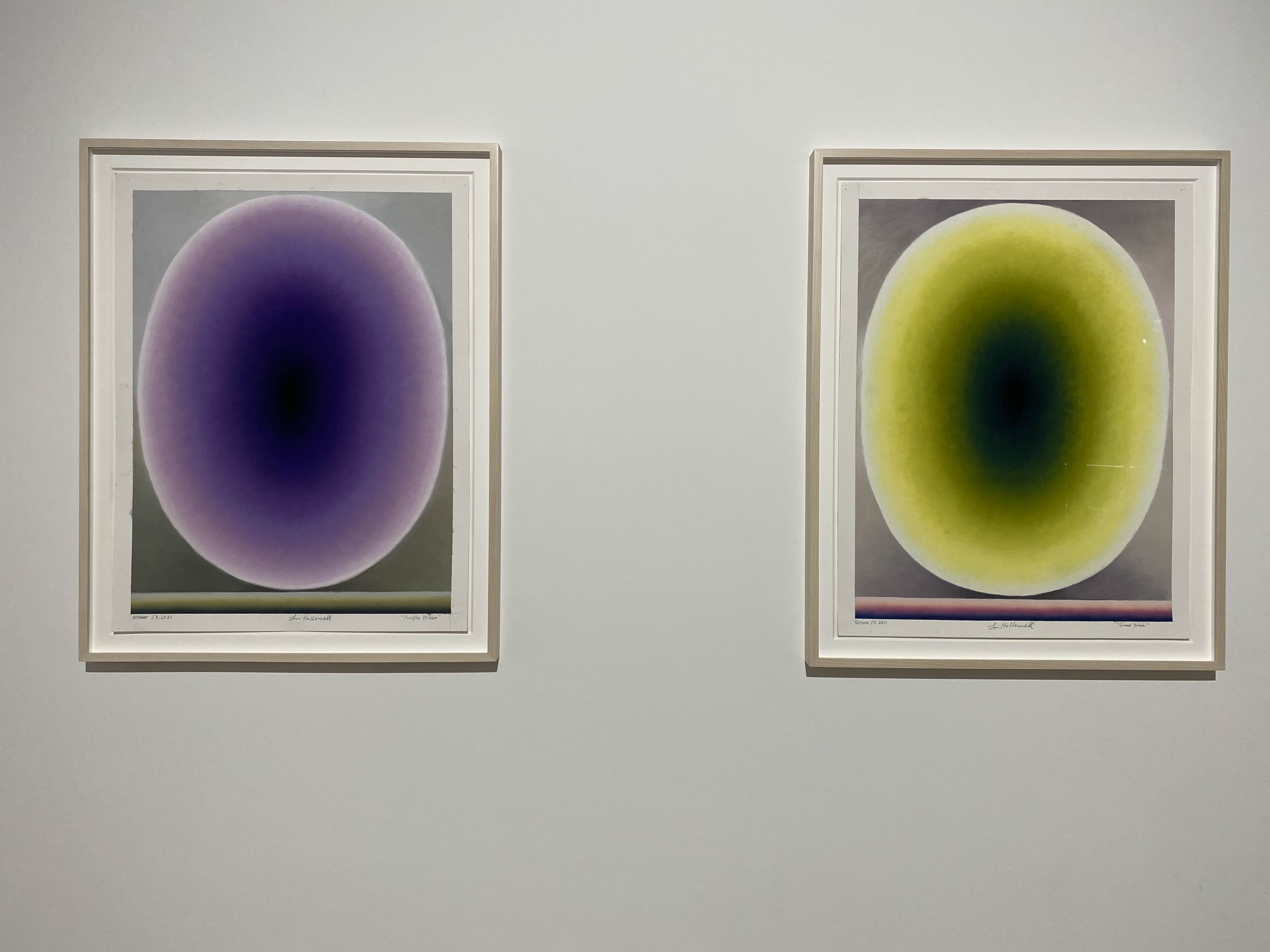 추상화된 두뇌의 형상들은 원하는 색이 나타날 때까지 반투명한 유화 물감을 여러 층으로 덧입히는 방식으로 표현되는데, 이는 긴 시간이 소요되는 노동 집약적 행위를 통해 이루어집니다. 홀로웰은 팔과 손목의 움직임에 대한 고도의 물리적, 기술적 탐구를 통해 타원 내 매끄러운 색 변화를 만들어냈습니다. 이러한 물리적 과정의 흔적을 담고 있는 타원은 작가의 실제 신장을 반영합니다. 자신의 신체를 최대한 크게 뻗어 보는 물리적 행위가 브레인(Brain)시리즈의 제작 과정에서 필수적인 요소가 되는 것입니다.