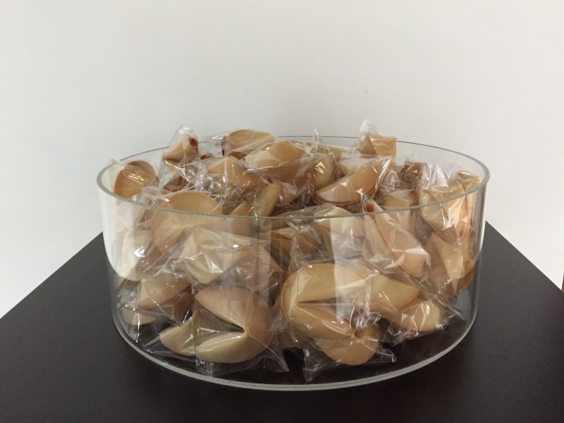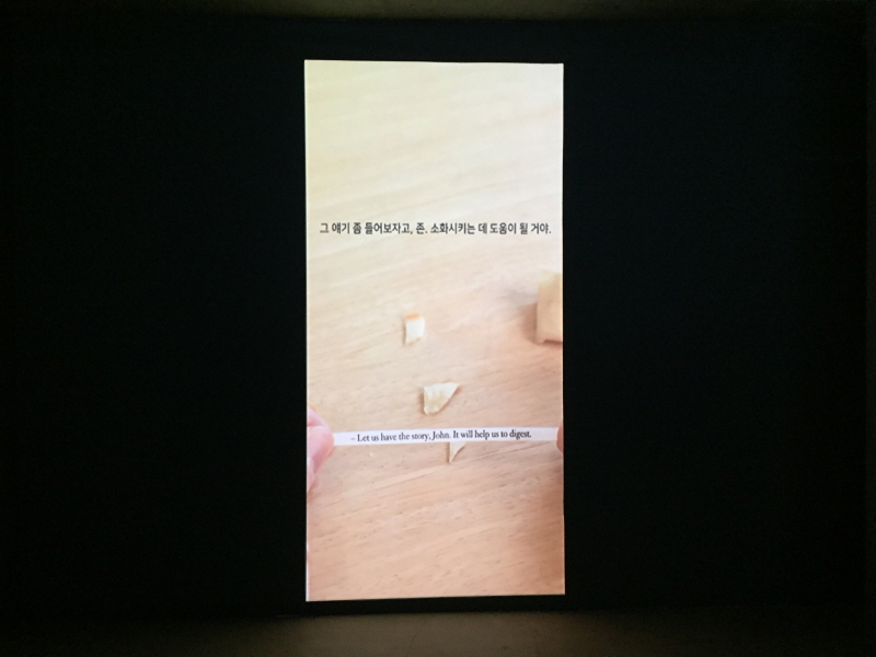 영상 설치 작품 <We never can say what is in us.>는 제임스 조이스 James Joyce의 소설 ‘젊은 예술가의 초상 A Portrait of the artist as a young man’에서 발췌한 구문들을 작가가 임의로 재배열, 재조합하여 넣어 만든 포춘쿠키를 깨트려 보여주는 작업이다. 작가는 이러한 퍼포먼스를 통해 조이스의 소설 내용처럼 예술가의 막막한 미래에 대한 질문과 답을 끝없이 구한다.