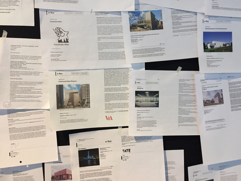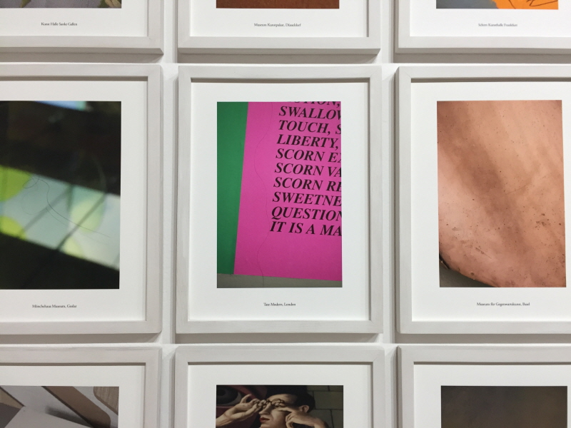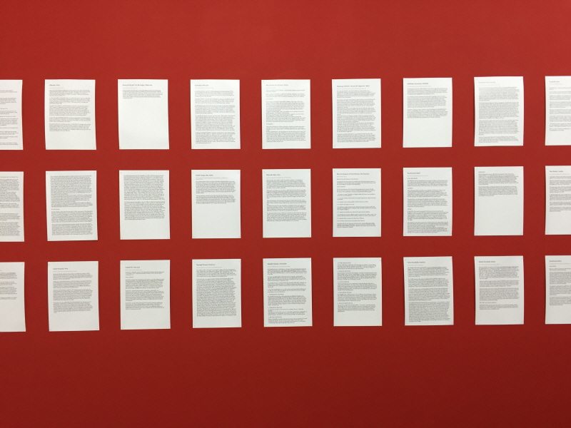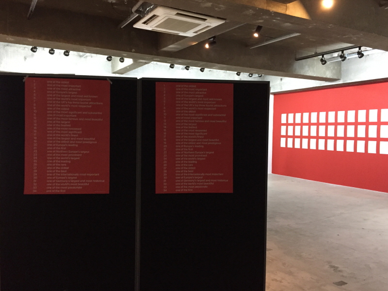 텍스트 아카이브 <One of the most->는 위 사진 연작을 진행하며 아이디어를 얻은 작품이다. 여러 미술관 홈페이지에서 읽을 수 있는 미술관 소개글을 보면 전형적이고 보수적인, 최고지향의 수사학적 문구들을 발견할 수 있다. 작가는 각각의 미술관들이 자신들을 유럽에서, 혹은 세계에서 가장 우수한 미술관이라고 홍보하는 글들을 모아 한 번에 보여준다. 그 결과 문구들 간의 불일치, 혹은 더 이상 새로운 수사가 불가능함으로 인해 나타나는 표현의 획일성에서 오는 진부함 등이 웃기고도 슬픈 현실로 드러나게 된다.