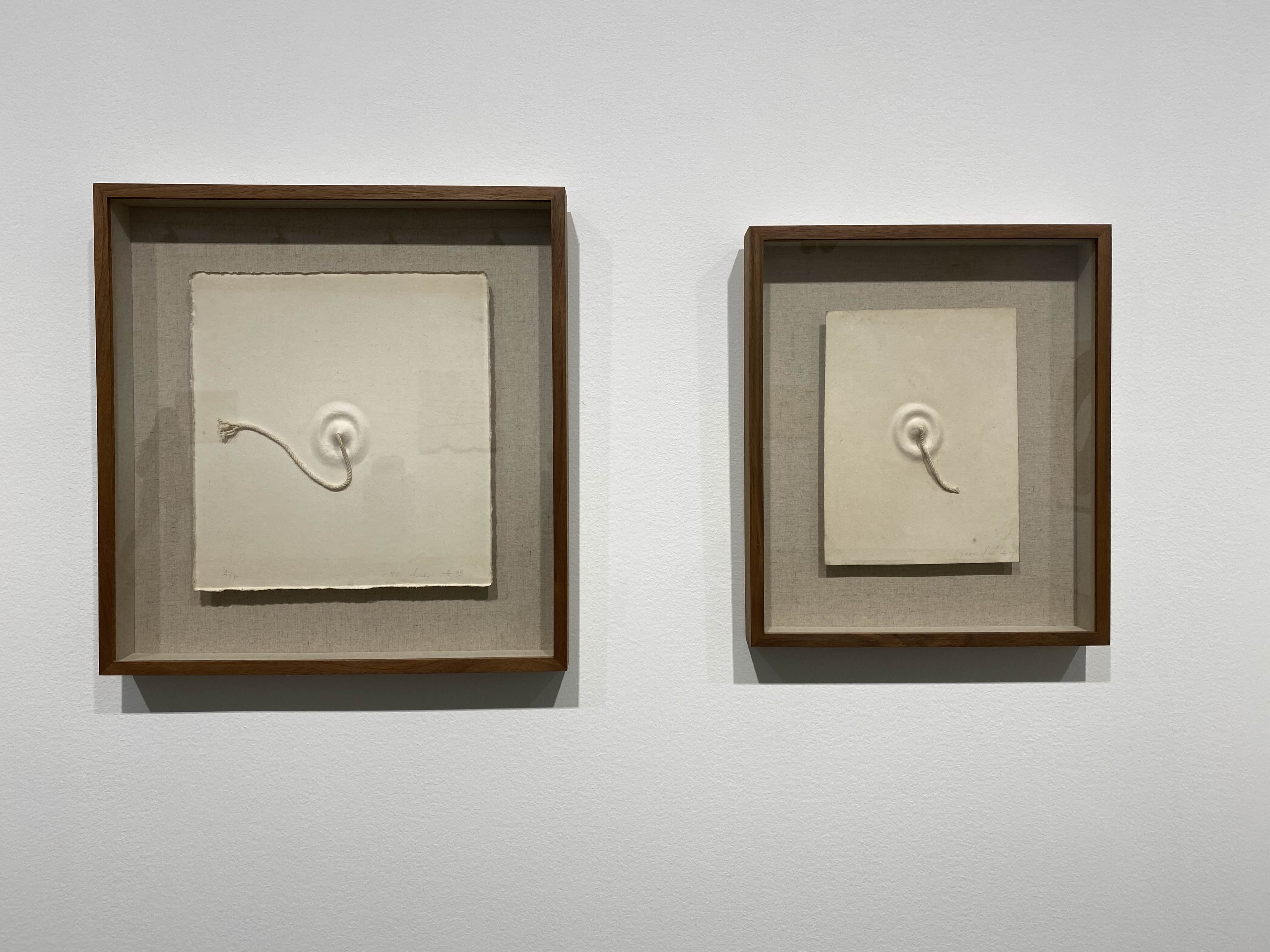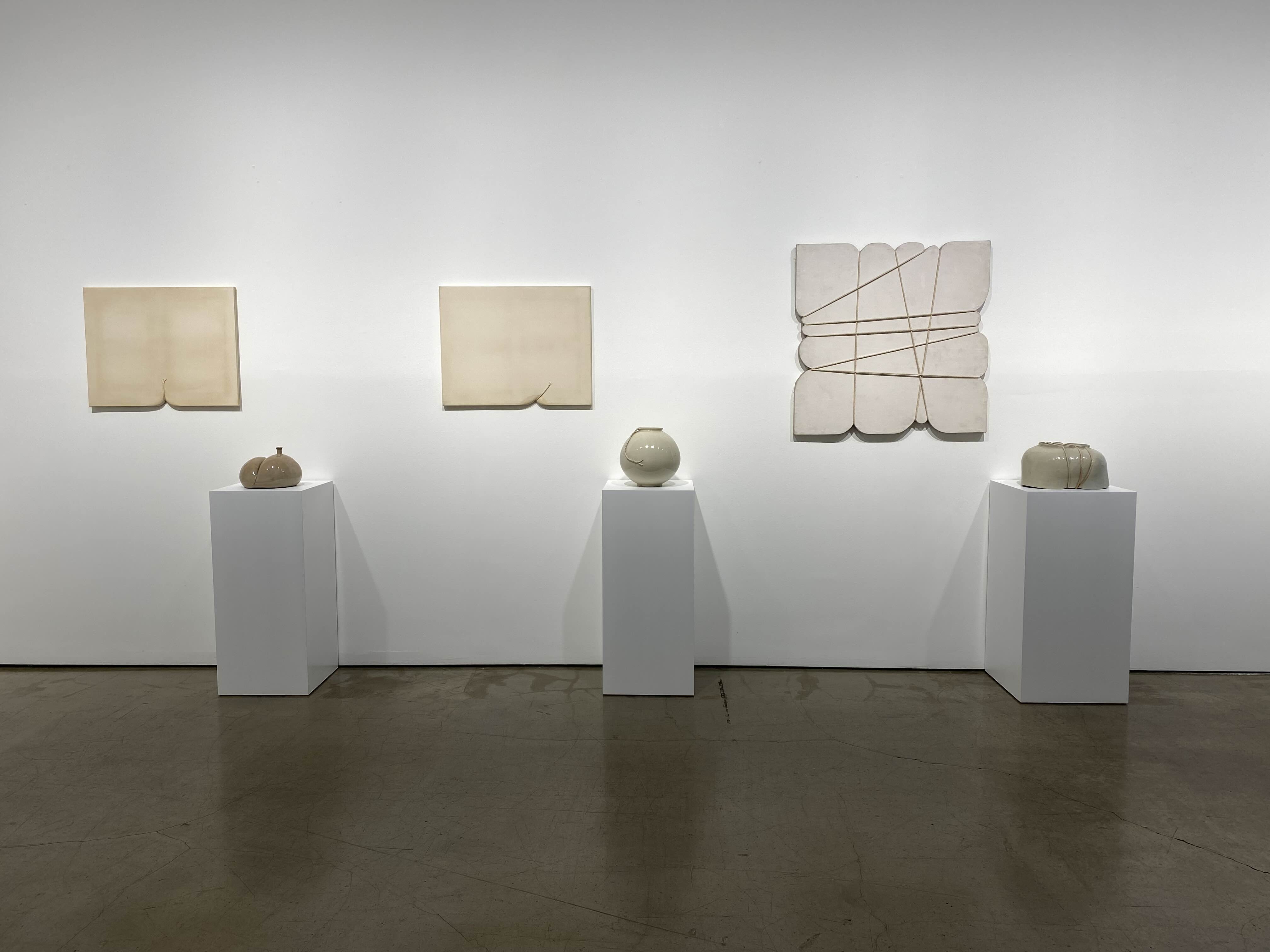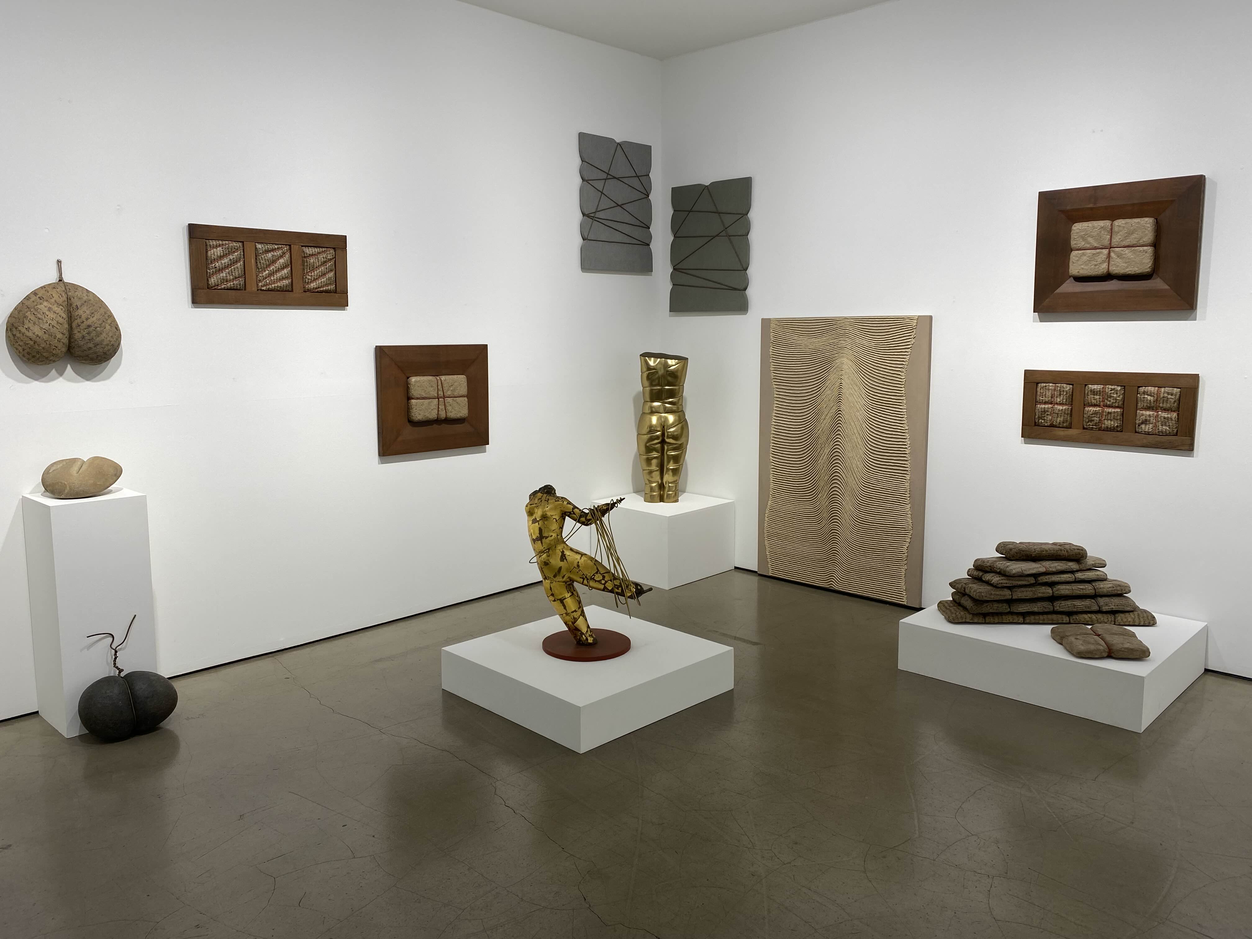 1층 전시장은 묶음 연작의 핵심 재료로써 ‘역설의 시각화’를 담당하는 노끈을 활용한 <종이 판화>, <매어진 백자>, <매어진 캔버스>, <노끈 캔버스> 시리즈의 대표작들로 구성된다. 2층 전시장에서는 고서와 돌, 도자기를 오가는 ‘묶음’ 시리즈의 끝없는 변주를 확인한다. 관람객은 수많은 작품이 집적된 작가의 작업실을 닮은 모습으로 연출된 공간에서 형식과 맥락이 서로 이어지되 끊임없이 변화하는 작품의 흥미로운 양상을 조망할 수 있다. 노끈에 매인 흔적을 선명하게 드러내는 ‘묶기’ 작업과 노끈으로 캔버스를 단순히 둘러 매는 <매어진 캔버스>는 이내 노끈이 아닌 머리카락 등 다른 재료에 매인 캔버스 작업으로 이어진다. 지하 전시장은 ‘비조각’의 출발점이 되는 작품 <고드랫돌>(1957/1960년대)과 ‘묶기’ 어법이 적용된 대형 스케일의 작업 <오지> 등이 전시된다. 이 공간의 관전 포인트는 재료의 본래의 성질과 상관없이 물렁물렁해 보이는 작업들을 마주하는 우리의 눈과 뇌 사이의 거리다.